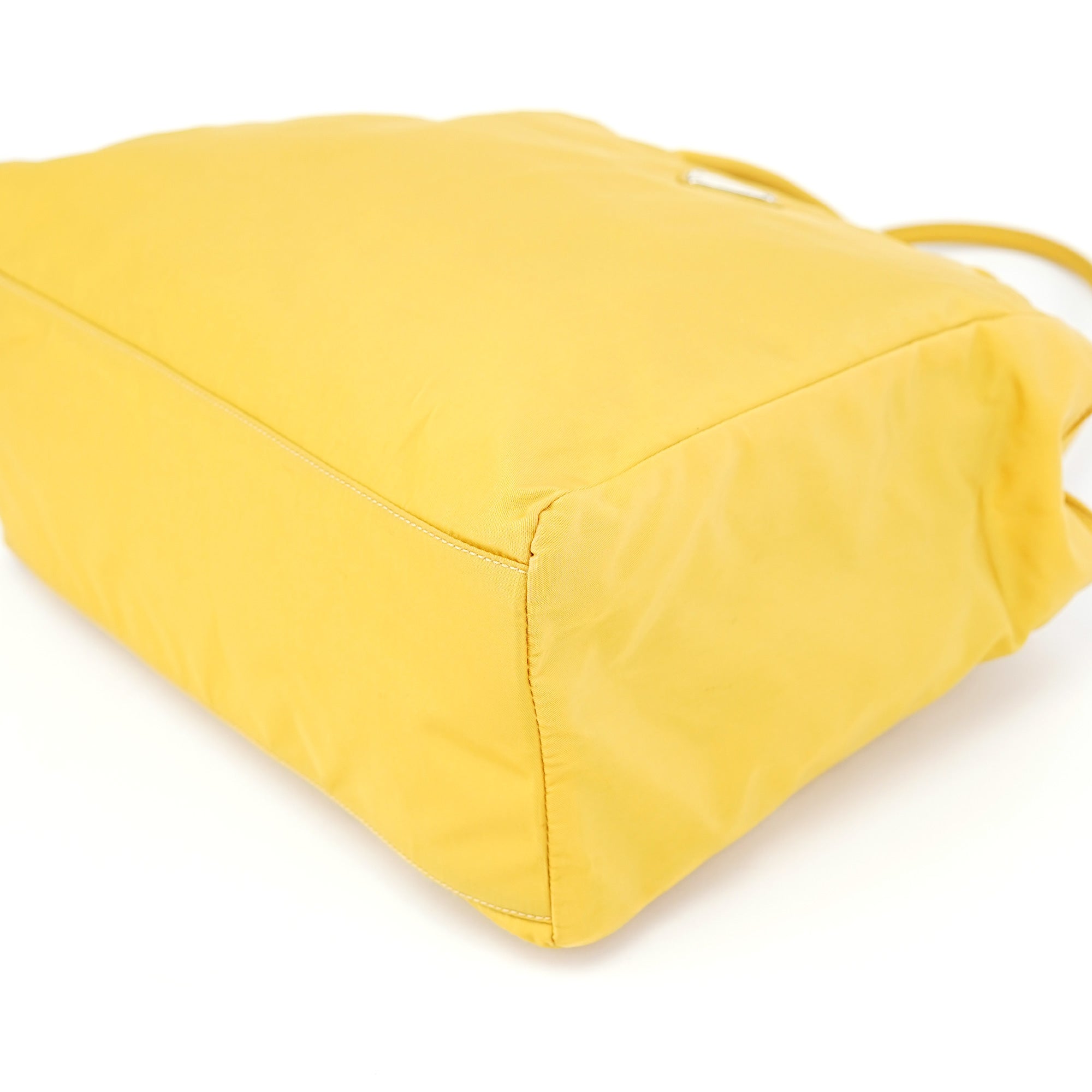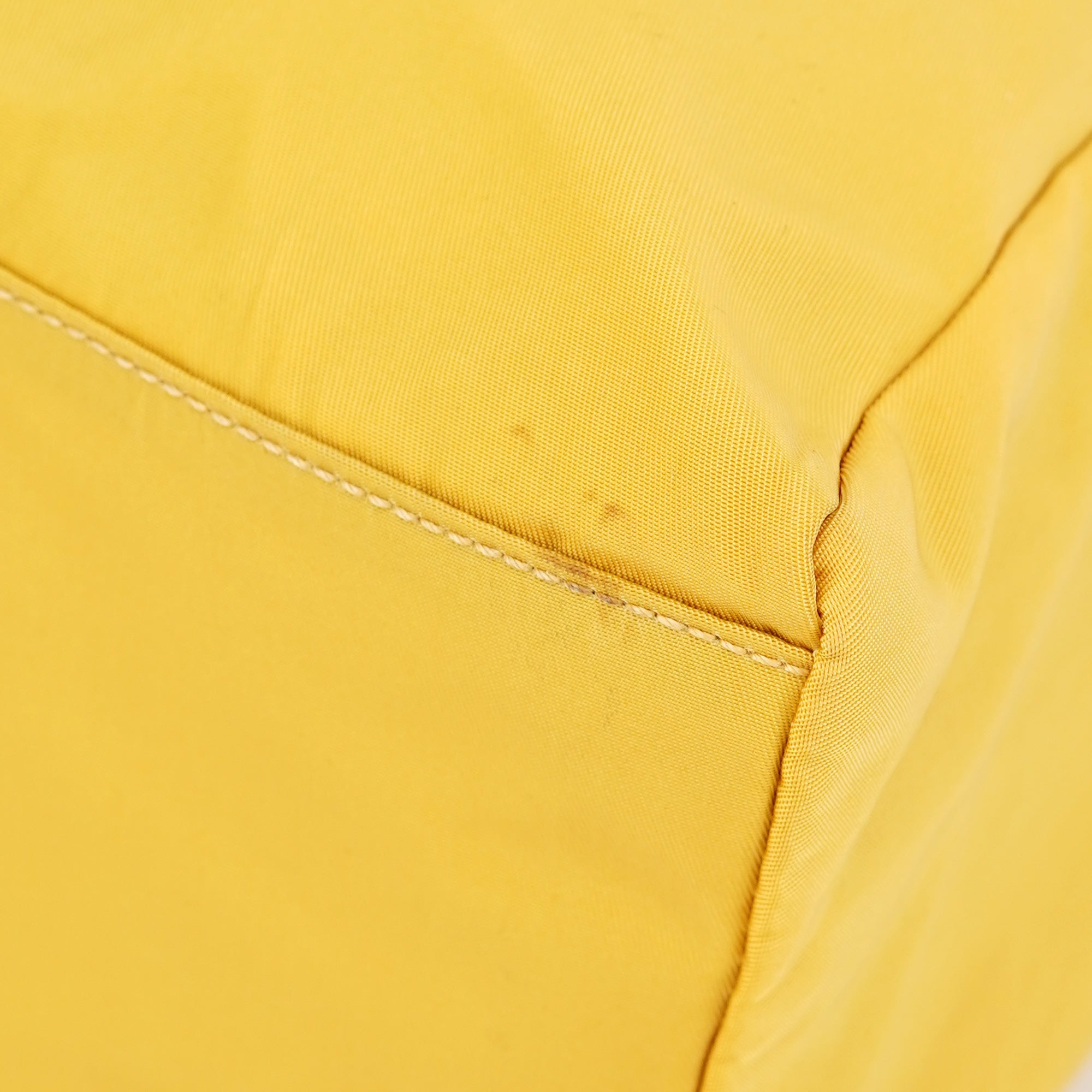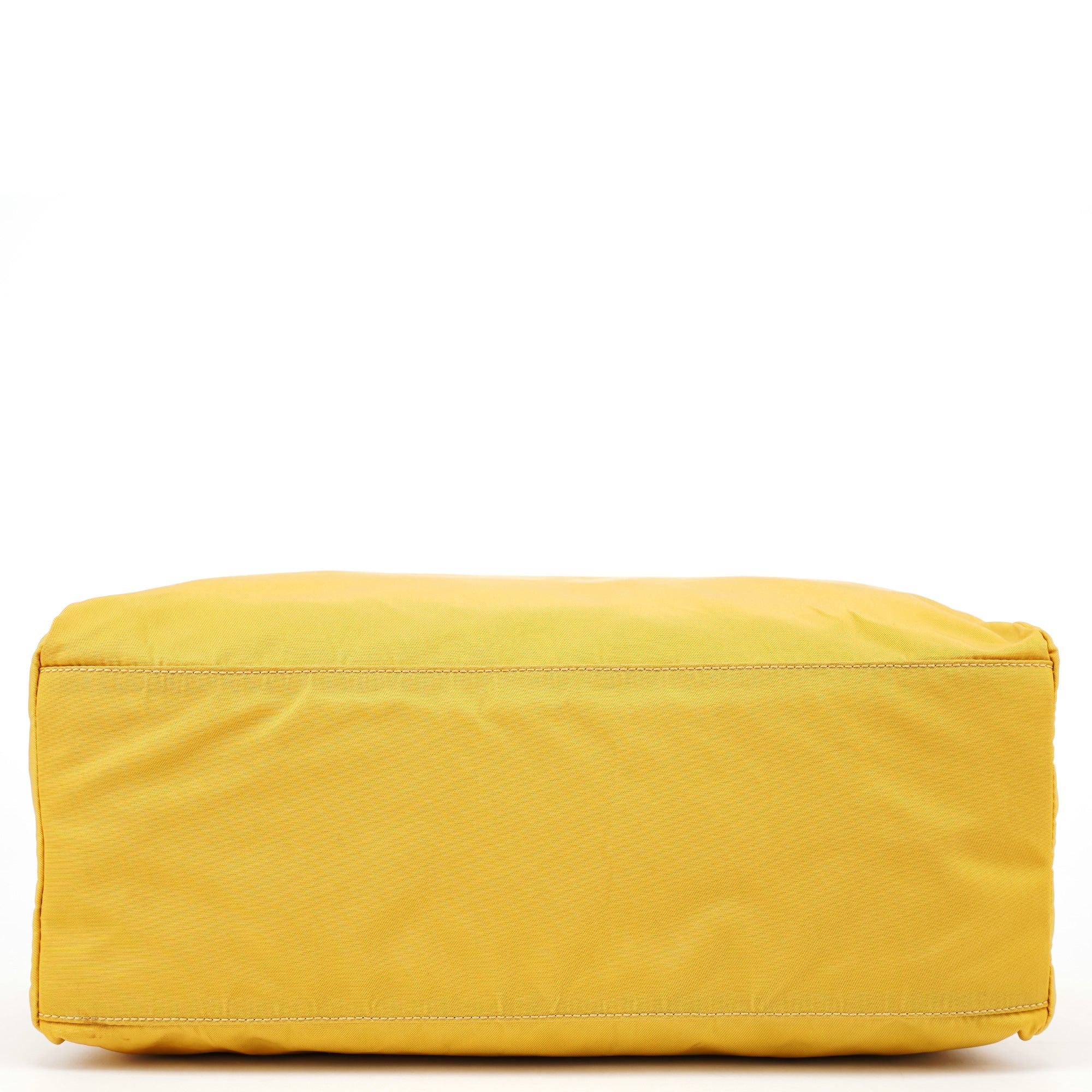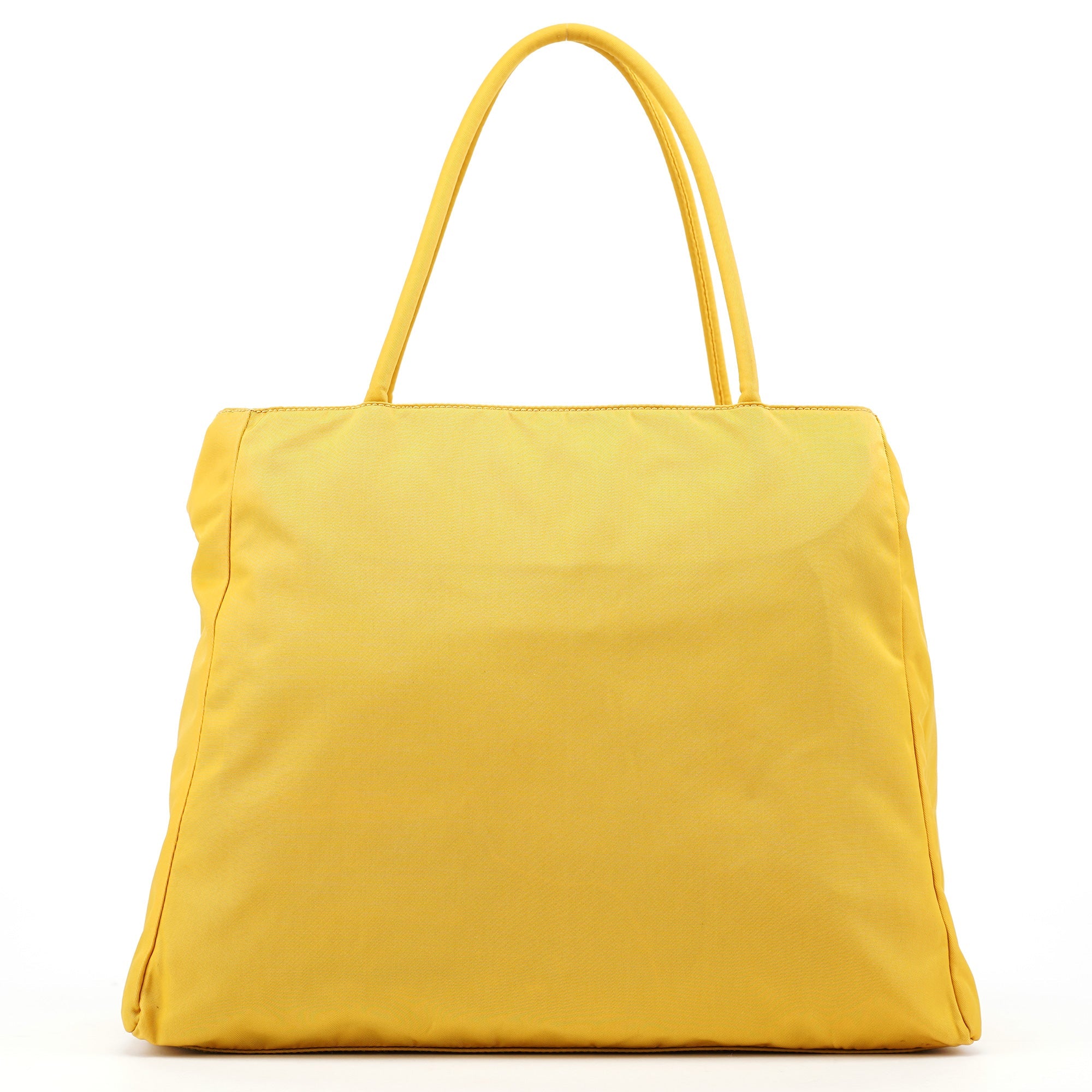 Designed in the late 1990s by Miuccia Prada, this Prada Tessuto City tote is crafted from yellow nylon and finished with a tonal enamel triangle logo. The soft trapezoid silhouette features dual top handles and a three interior compartments, one with zip closure that opens to a lined interior with a single zip pocket.