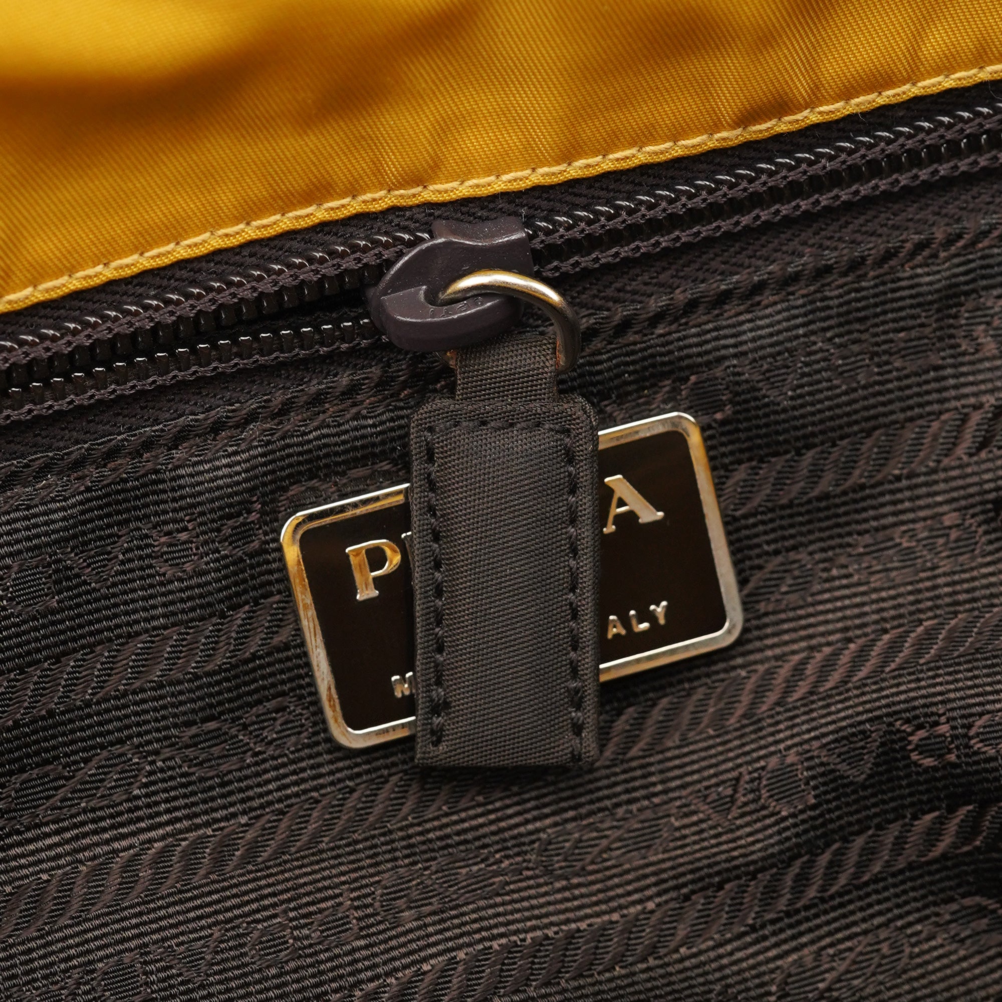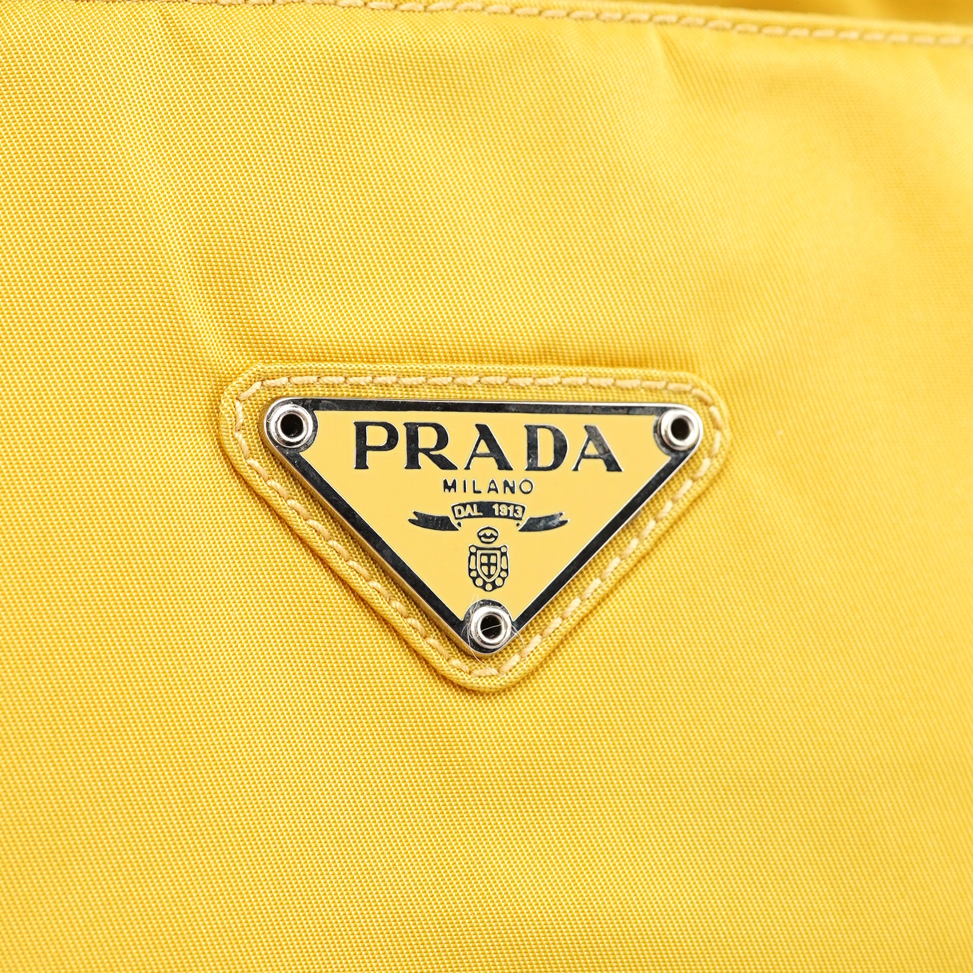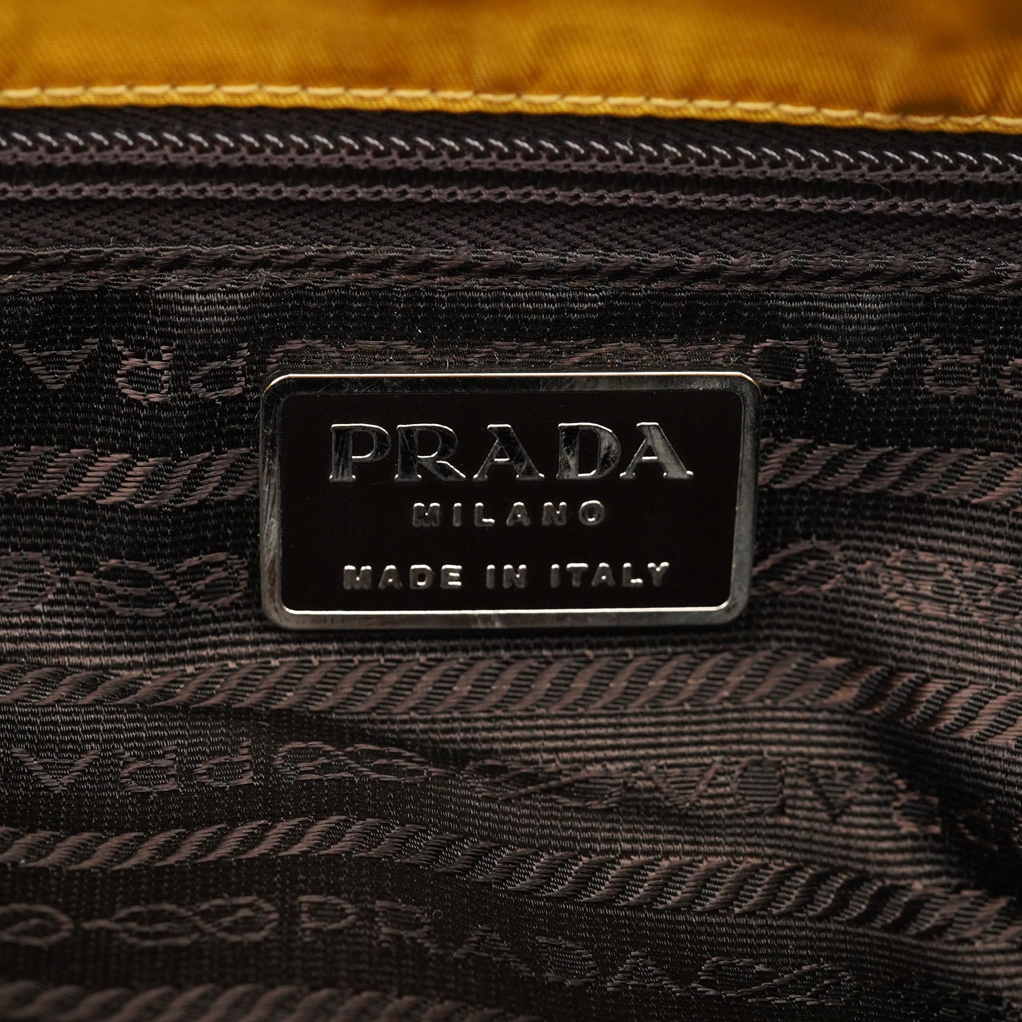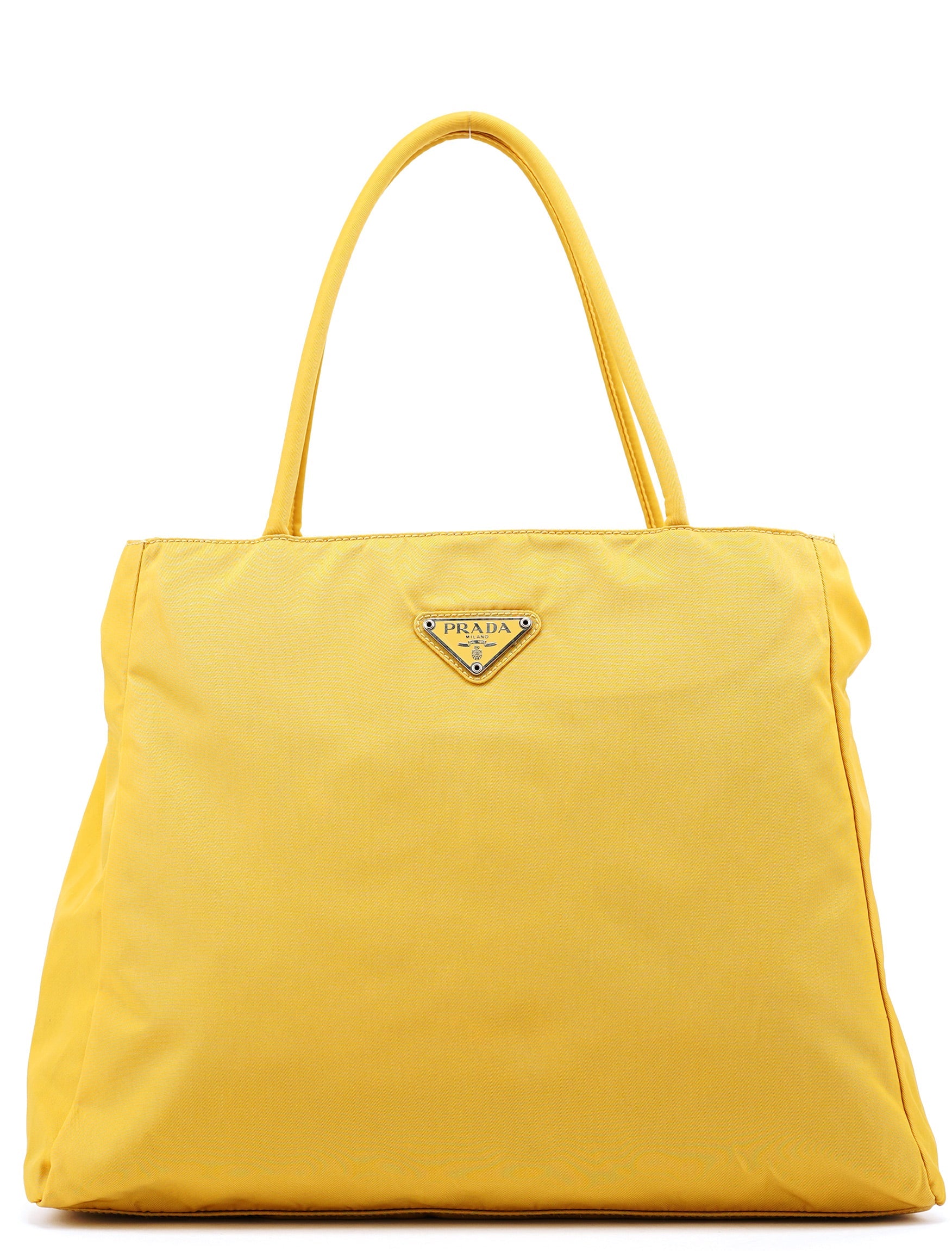 Designed in the late 1990s by Miuccia Prada, this Prada Tessuto City tote is crafted from yellow nylon and finished with a tonal enamel triangle logo. The soft trapezoid silhouette features dual top handles and a three interior compartments, one with zip closure that opens to a lined interior with a single zip pocket.