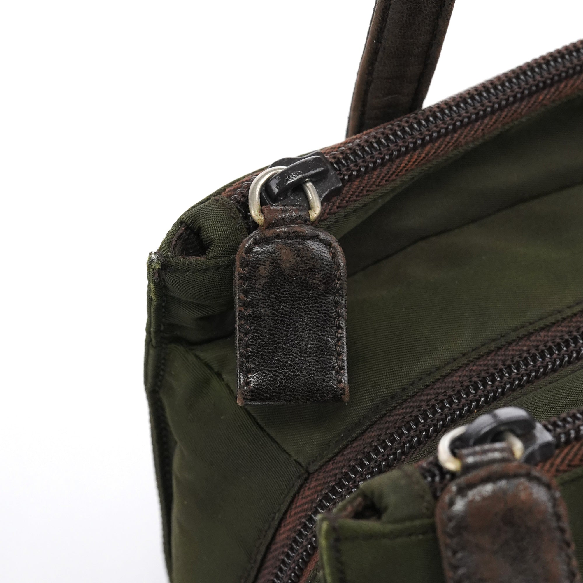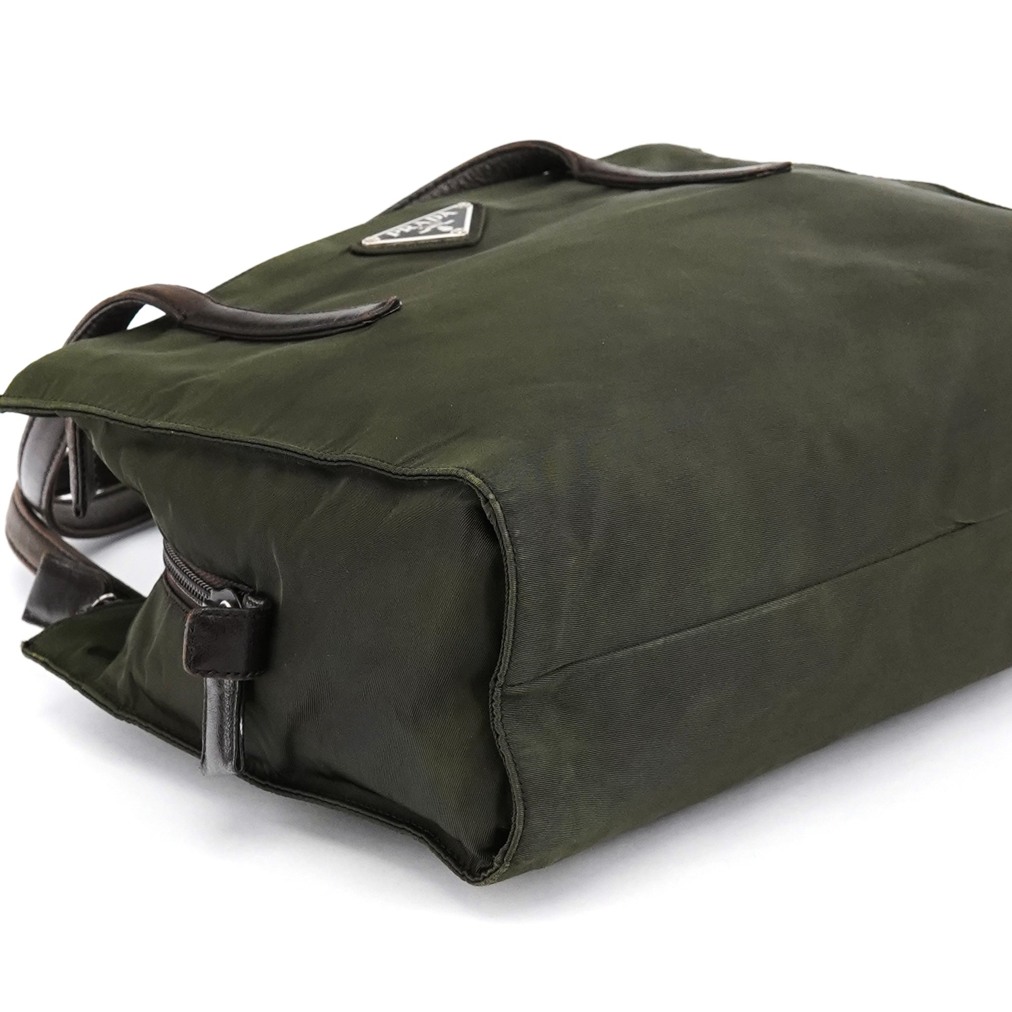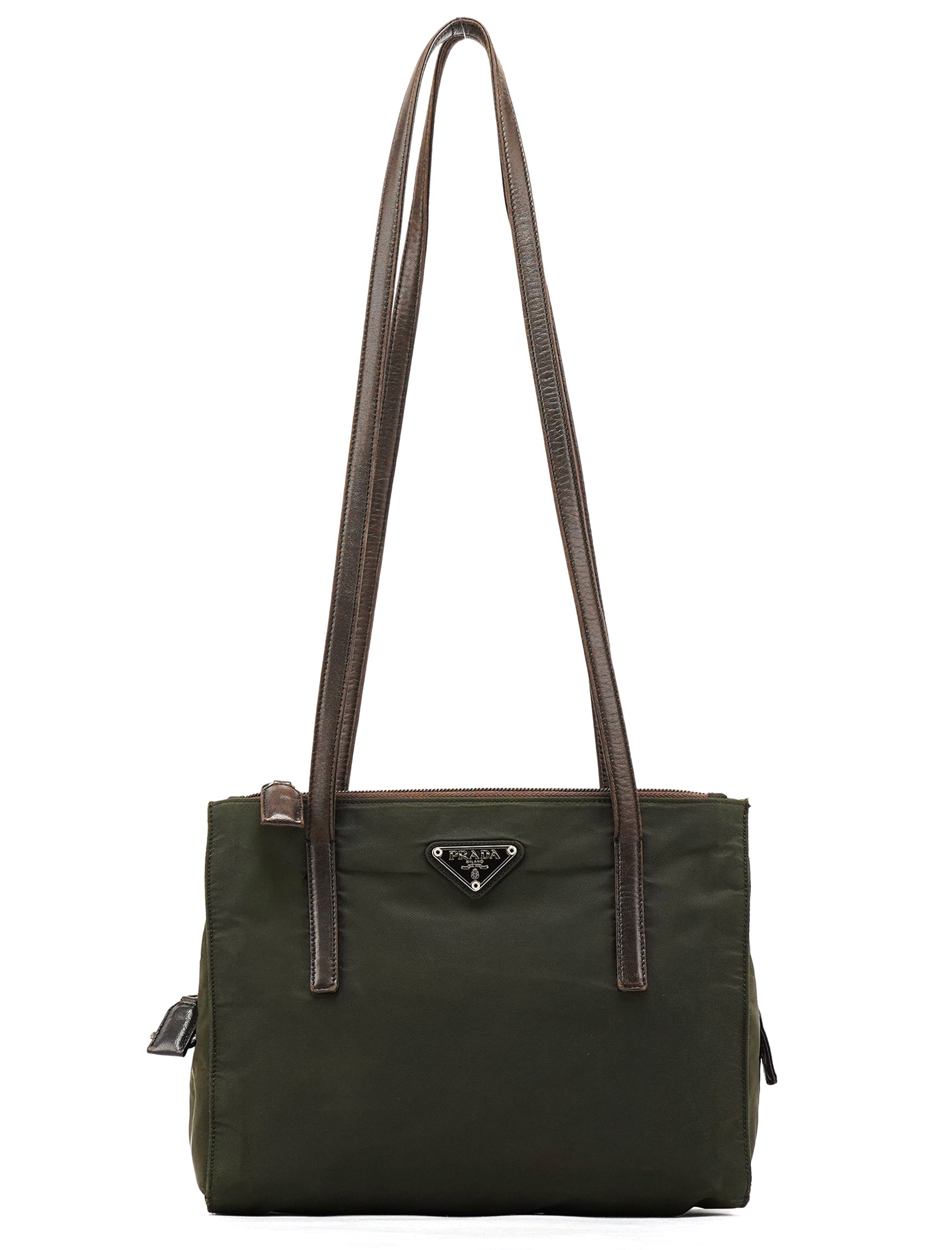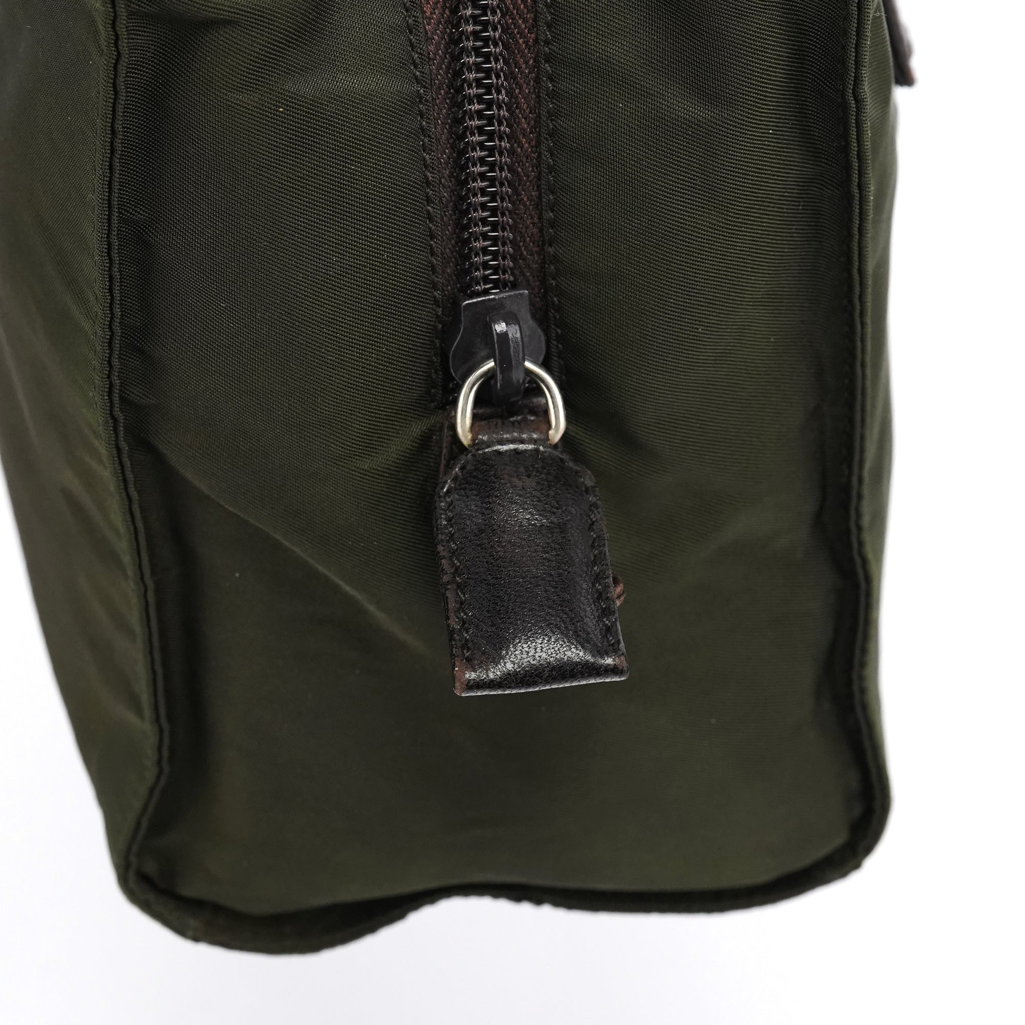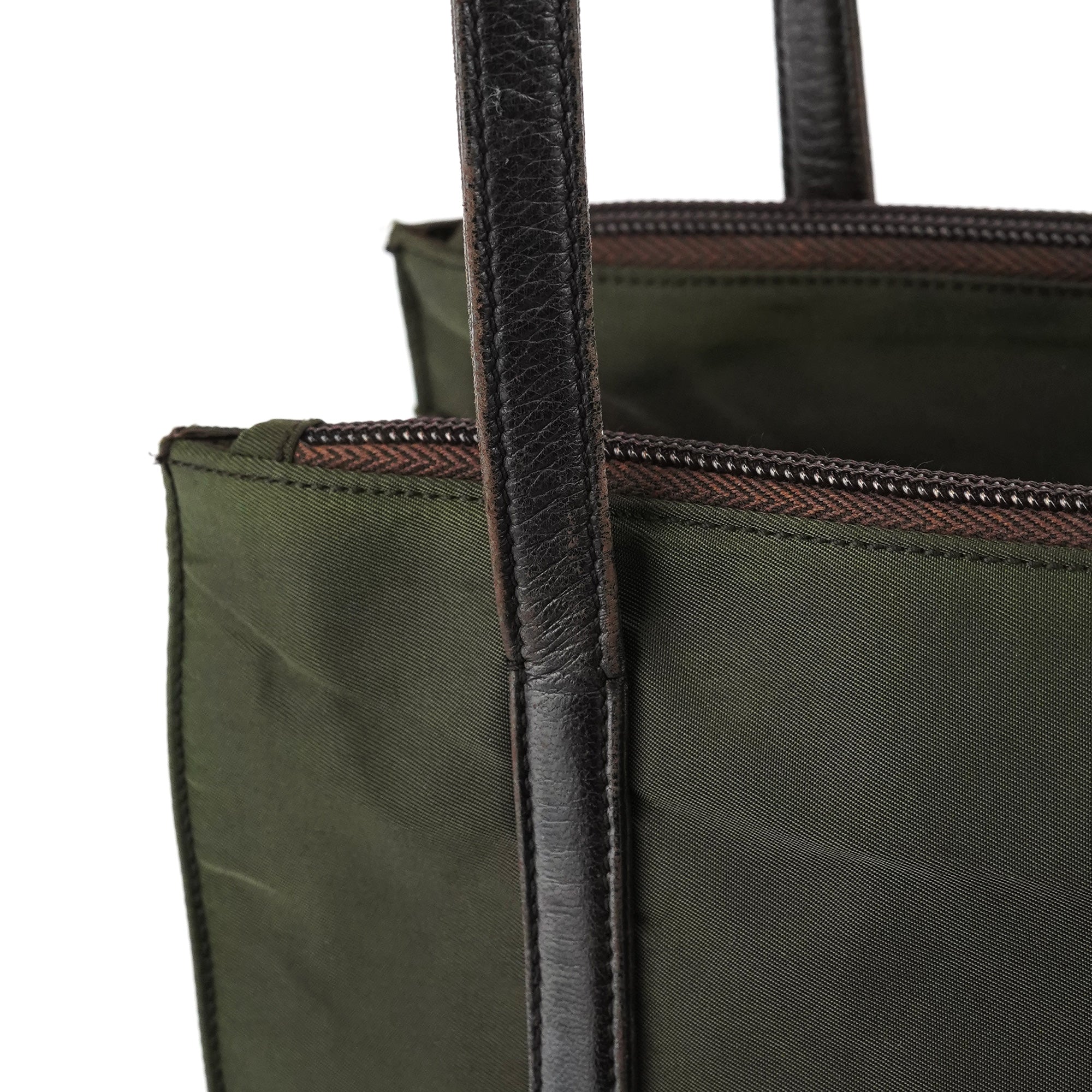 Designed in the mid-1990s by Miuccia Prada, this Prada Tessuto Nappa tote bag is crafted from olive nylon with brown leather trim, finished with a top zip closure, long shoulder straps, and a logo-lined interior with a zip pocket.