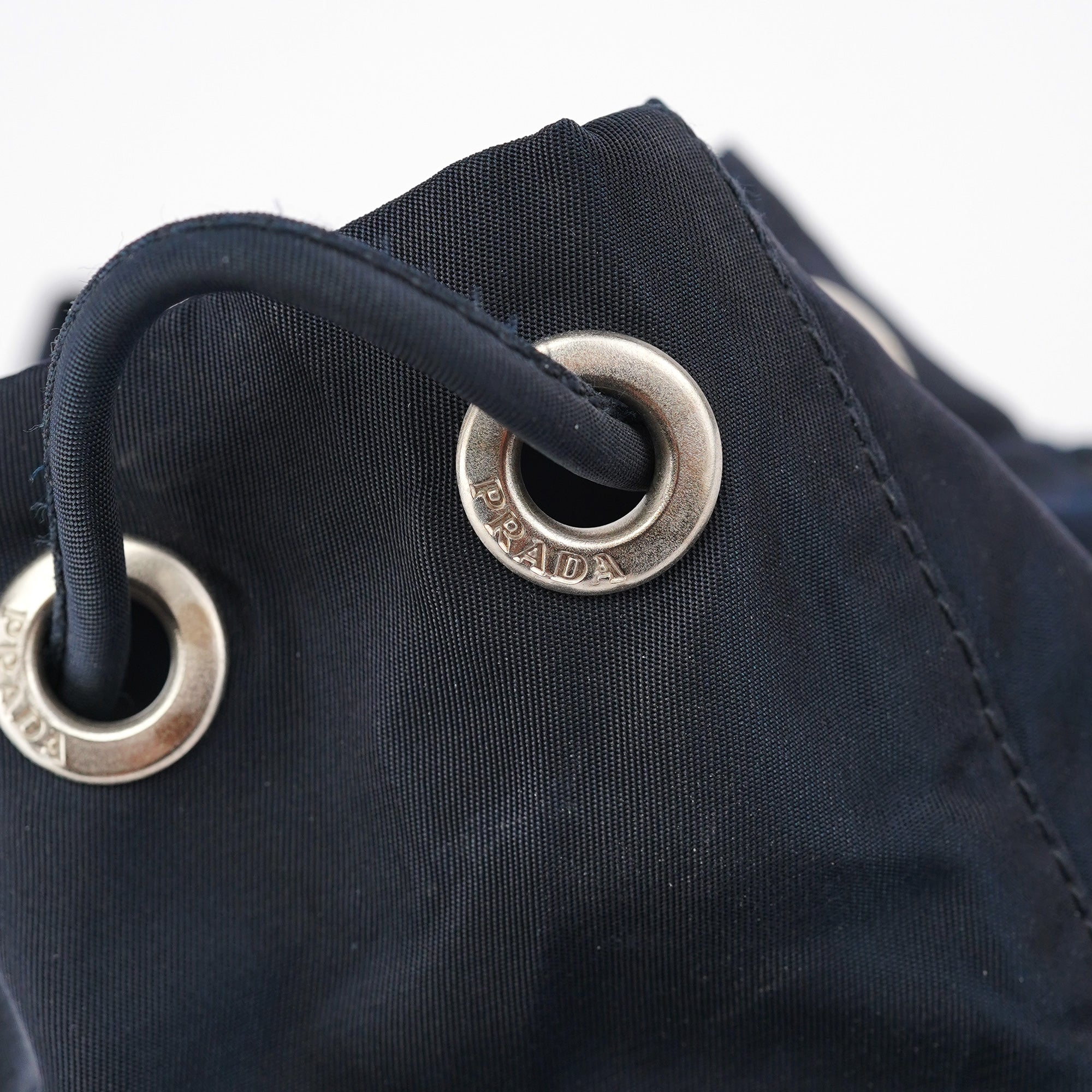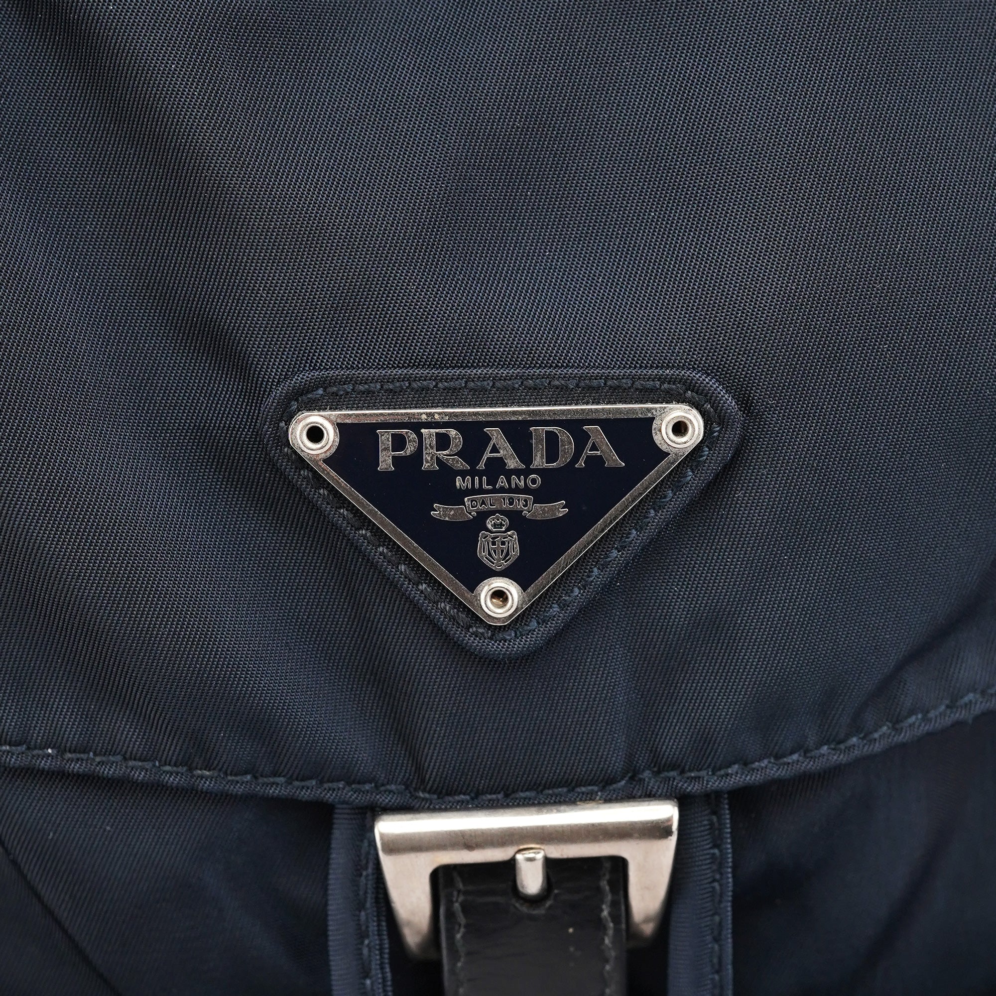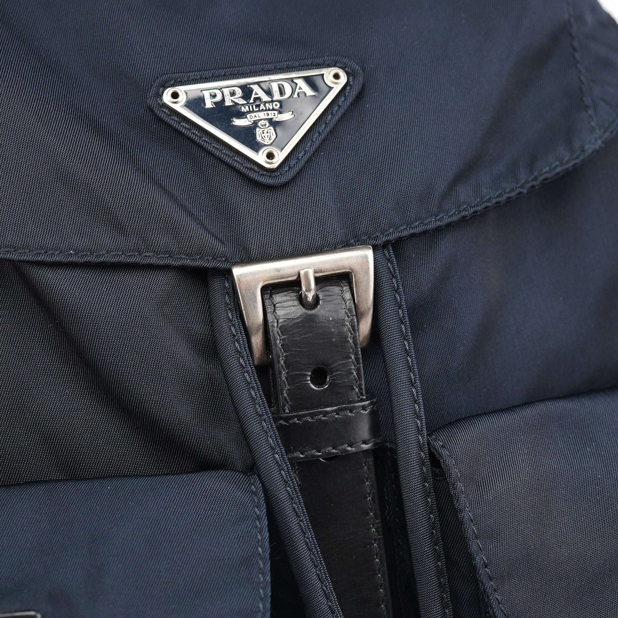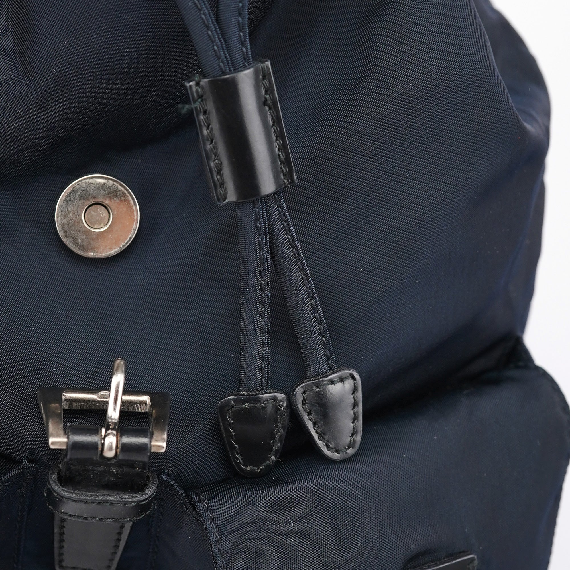 Designed in the late 1990s by Miuccia Prada, this Prada backpack is crafted from navy Tessuto Vela nylon with black leather trim and silver-tone hardware. It features a flap top with buckle closure, dual front pockets, a drawstring interior, and adjustable leather shoulder straps. The interior is lined with logo jacquard and includes one zip pocket.