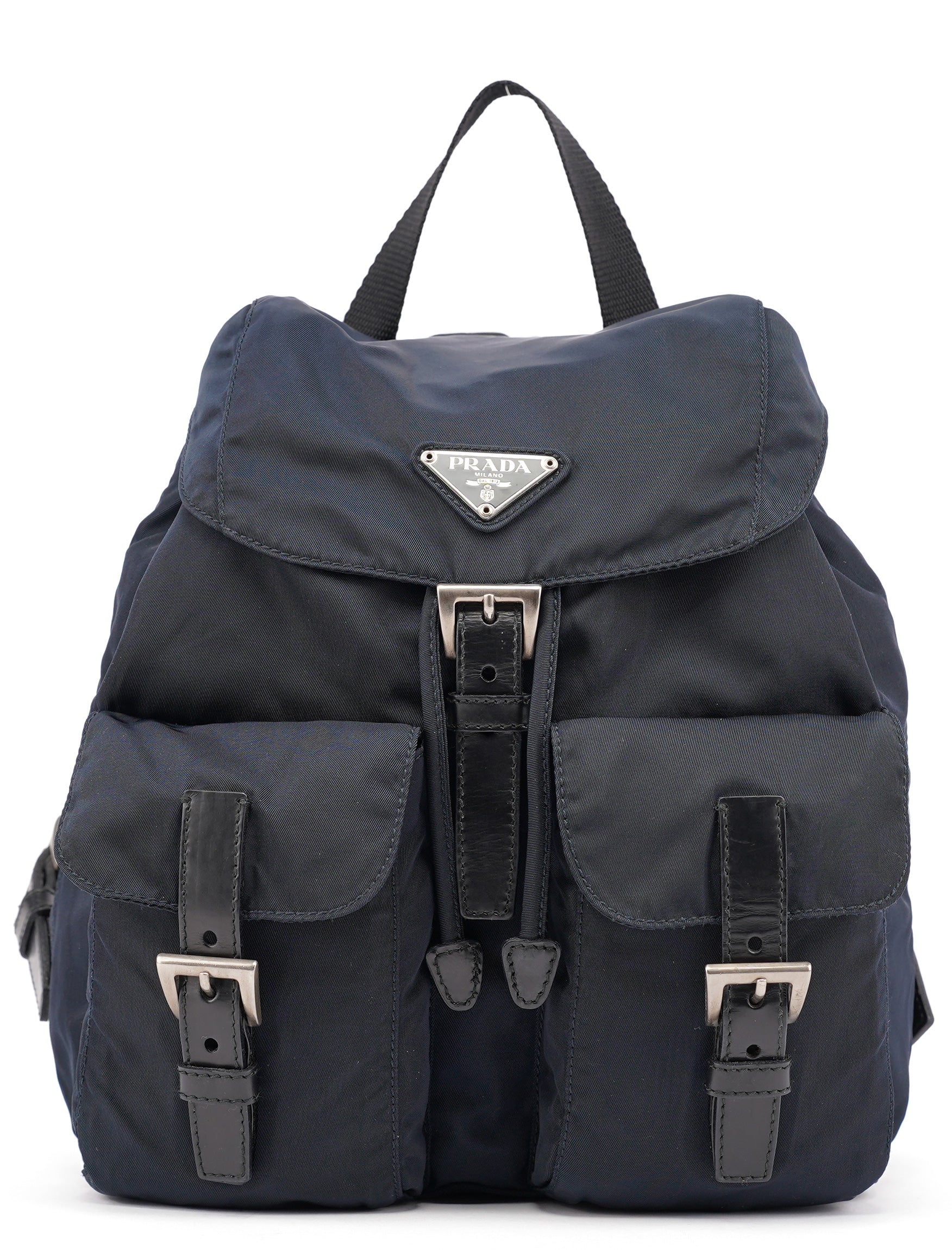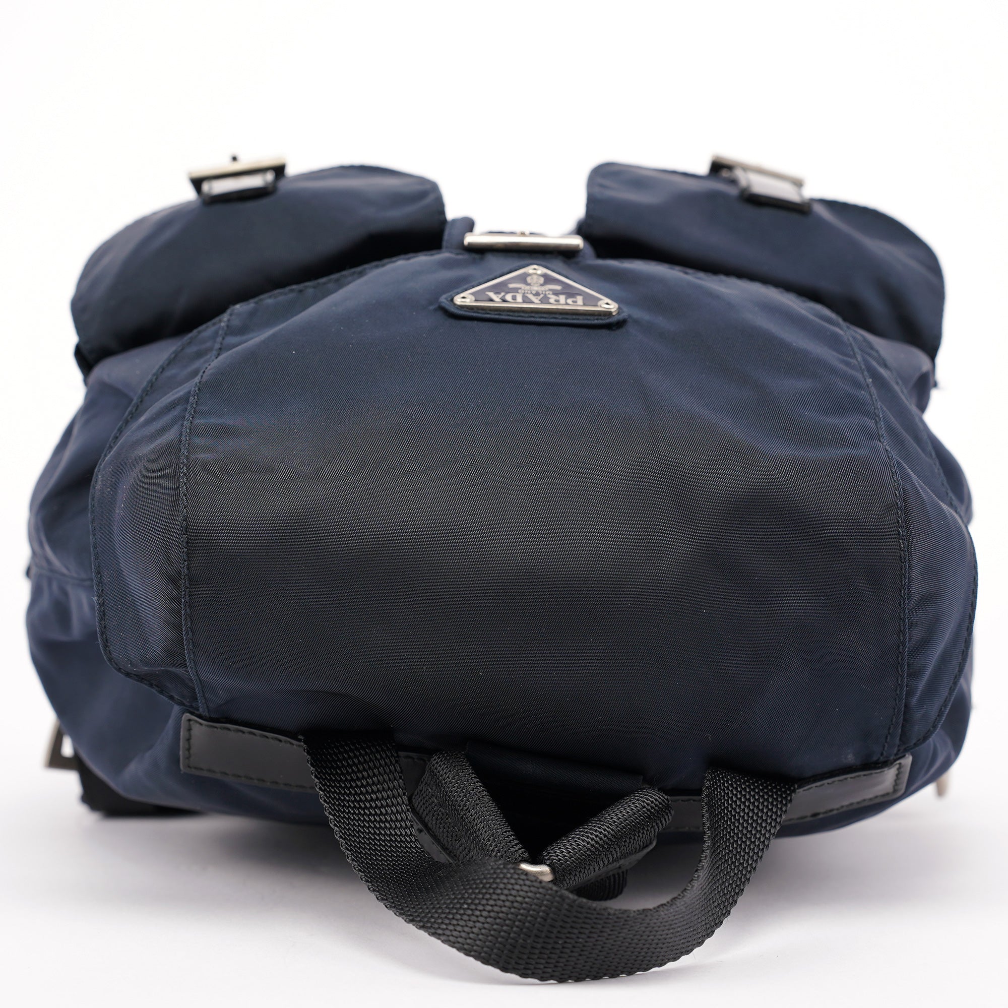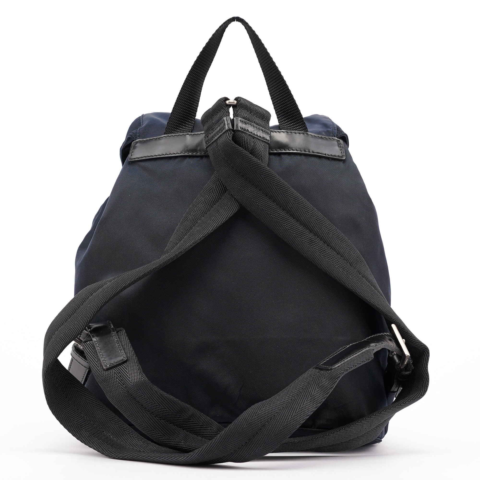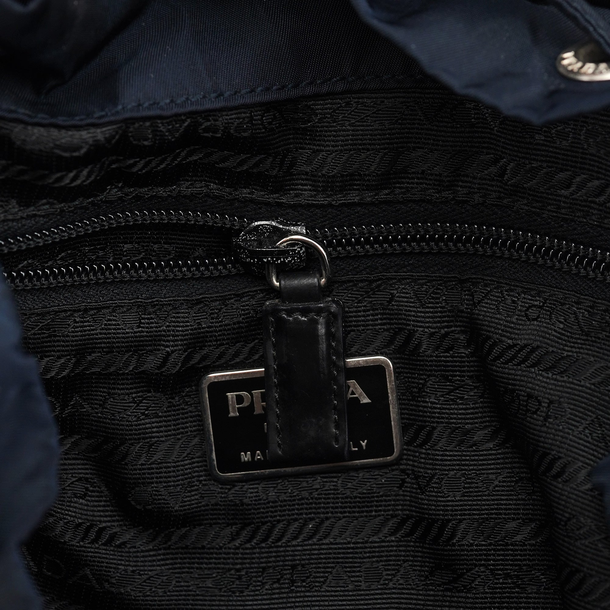 Designed in the late 1990s by Miuccia Prada, this Prada backpack is crafted from navy Tessuto Vela nylon with black leather trim and silver-tone hardware. It features a flap top with buckle closure, dual front pockets, a drawstring interior, and adjustable leather shoulder straps. The interior is lined with logo jacquard and includes one zip pocket.