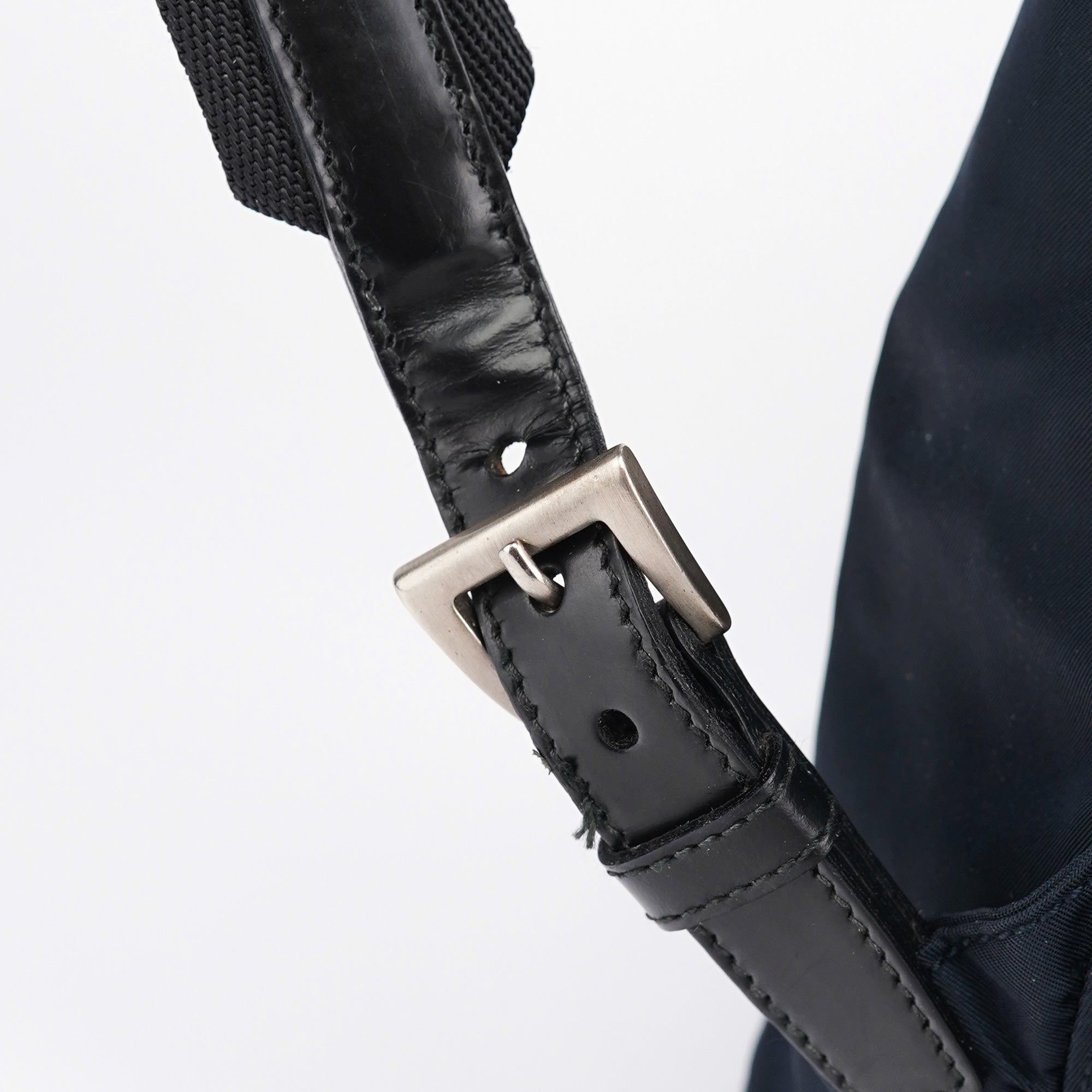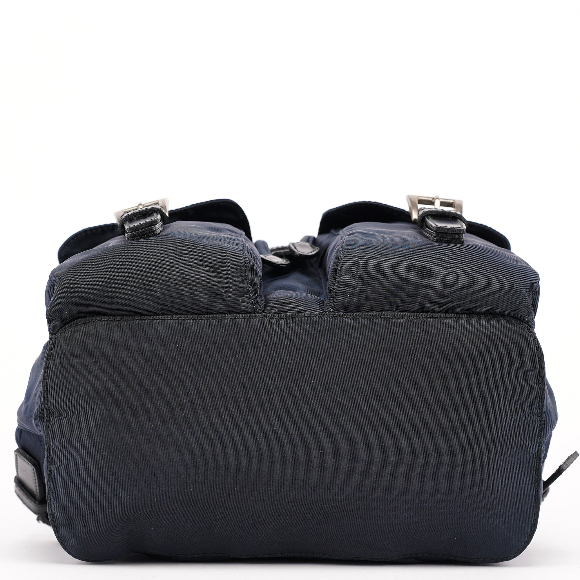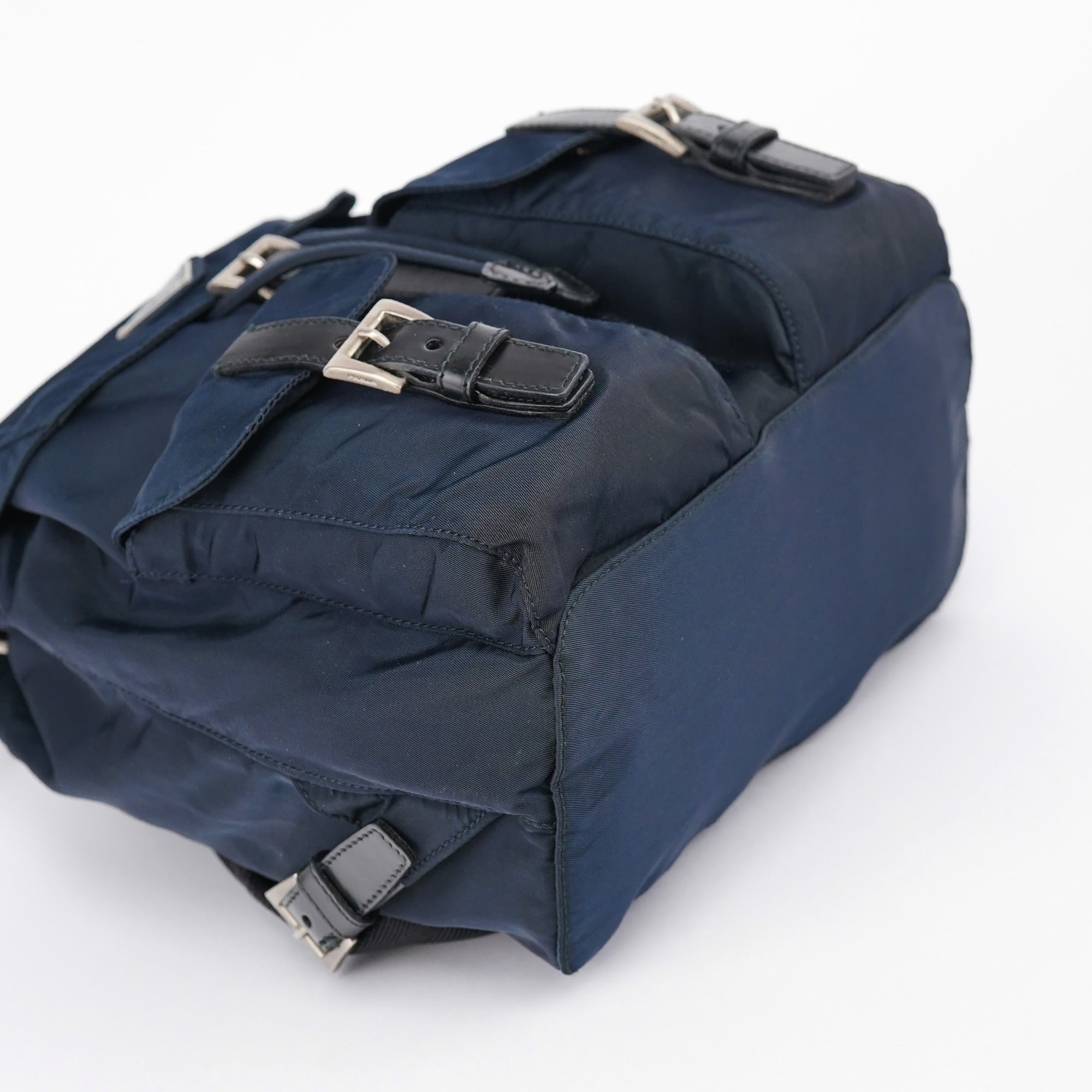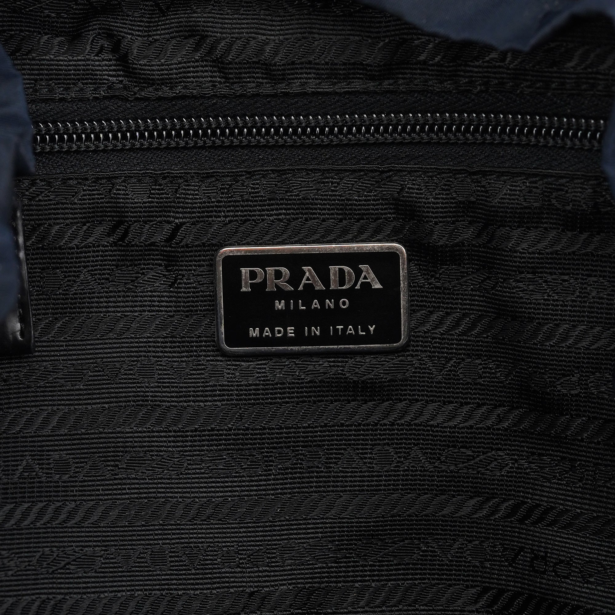 Designed in the late 1990s by Miuccia Prada, this Prada backpack is crafted from navy Tessuto Vela nylon with black leather trim and silver-tone hardware. It features a flap top with buckle closure, dual front pockets, a drawstring interior, and adjustable leather shoulder straps. The interior is lined with logo jacquard and includes one zip pocket.