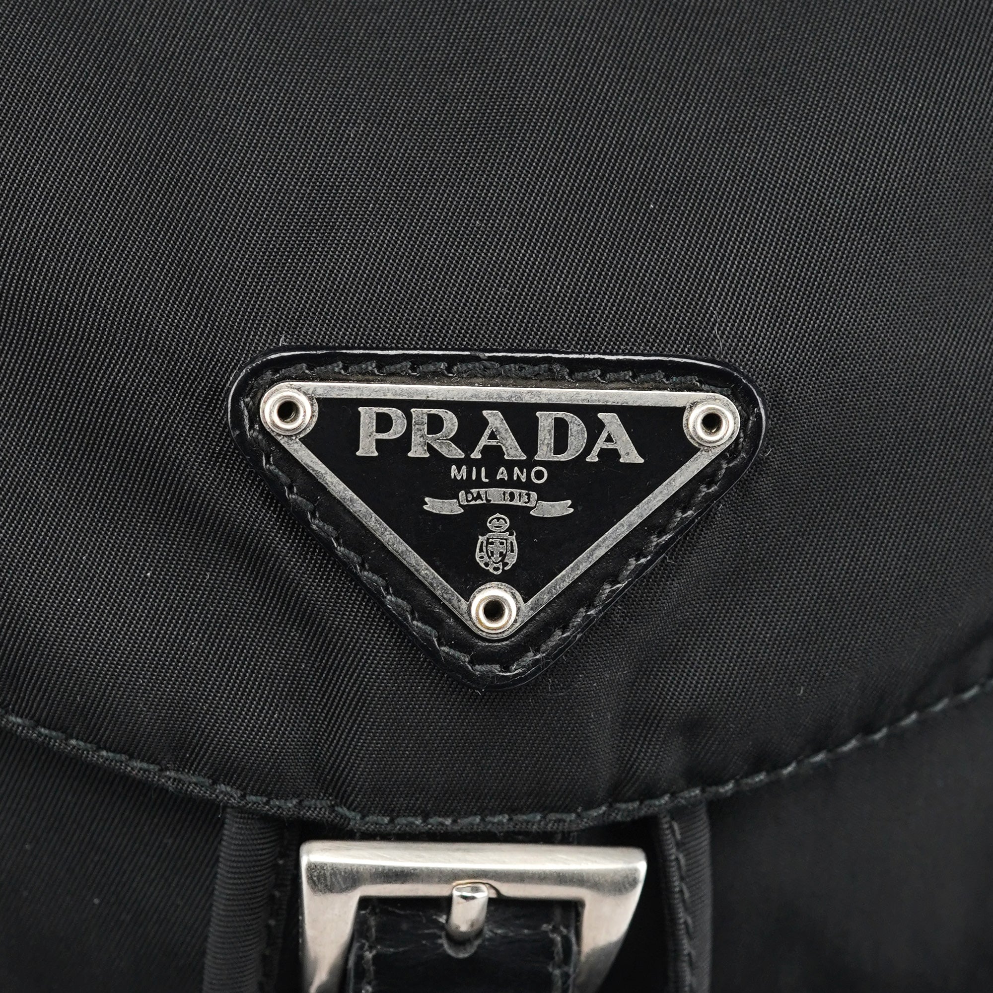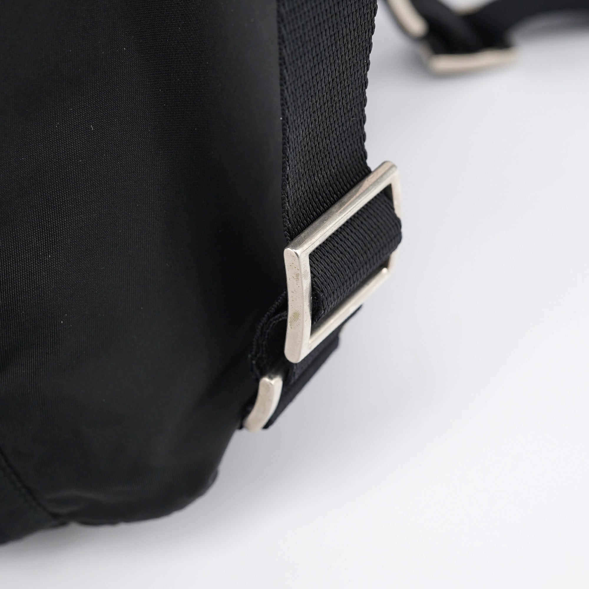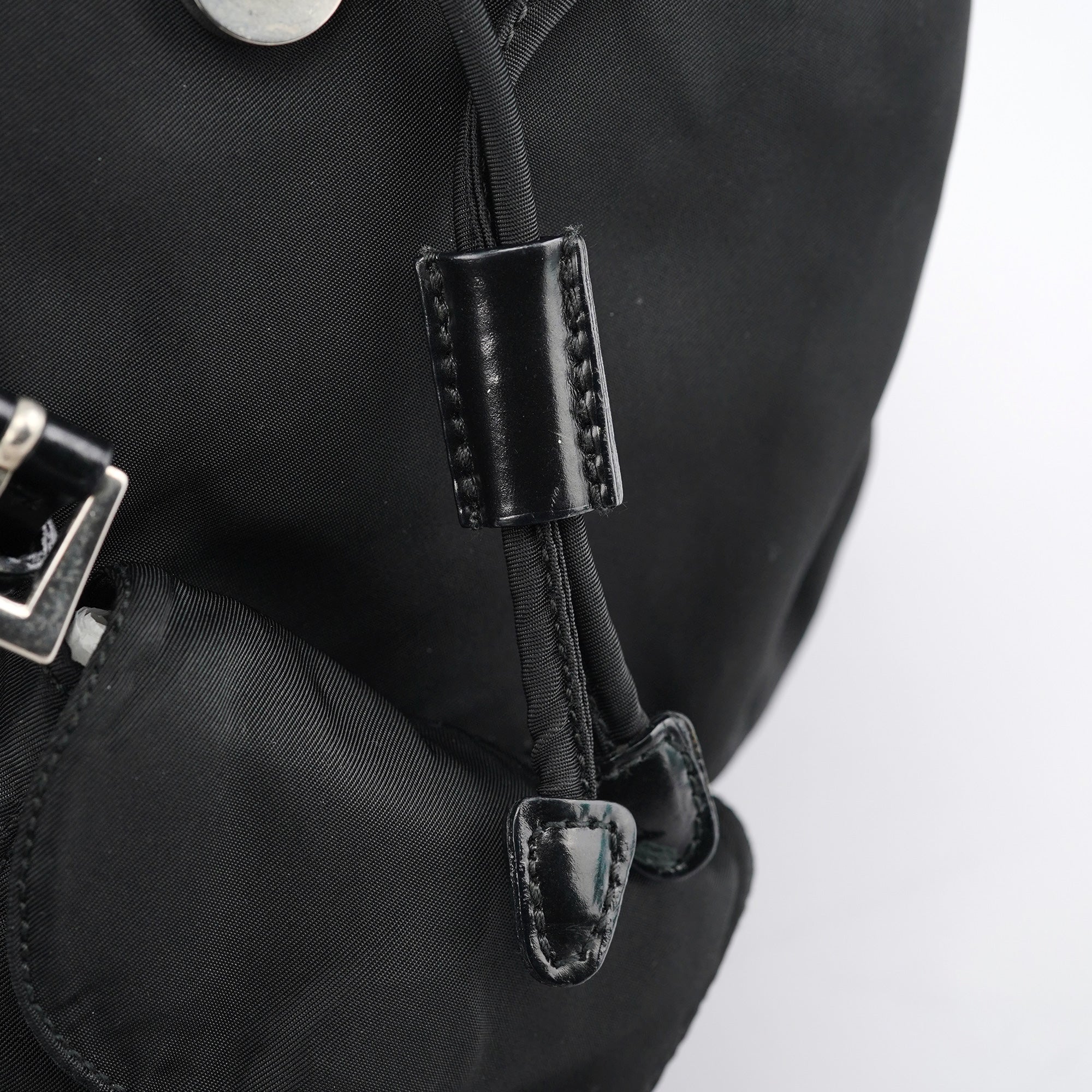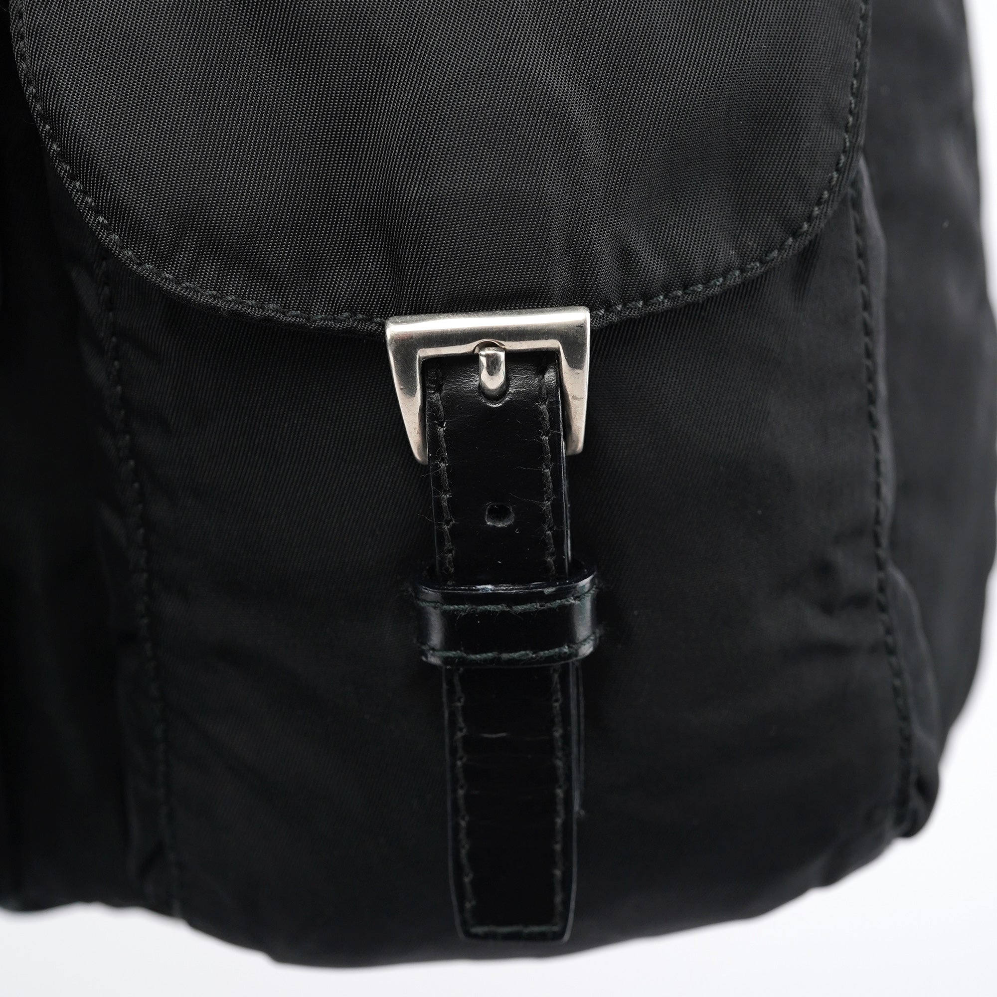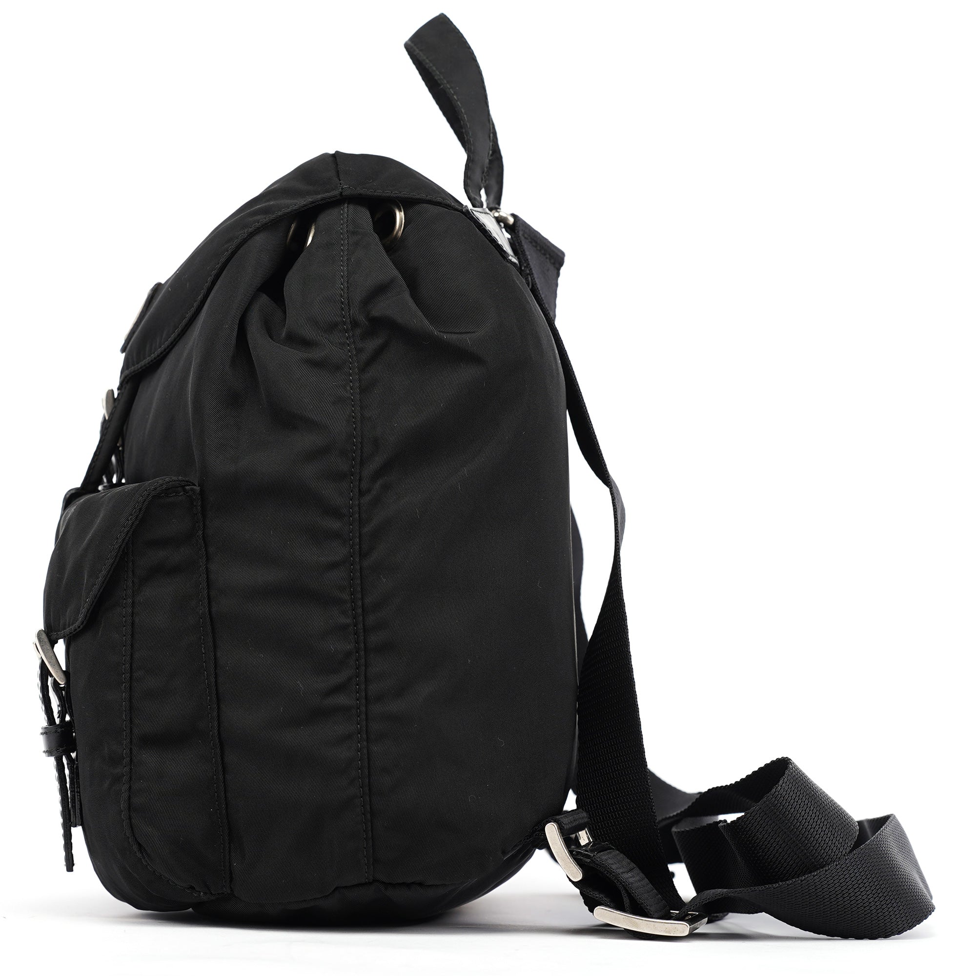 Designed in the late 1990's by Miuccia Prada, this vintage Prada Tessuto Vela backpack features black nylon construction with a drawstring top and flap closure secured by an adjustable strap and buckle. The iconic triangular Prada logo plate adorns the front flap, while two exterior front pockets with buckle closures offer additional storage. Adjustable shoulder straps and a top handle provide versatile carrying options.
