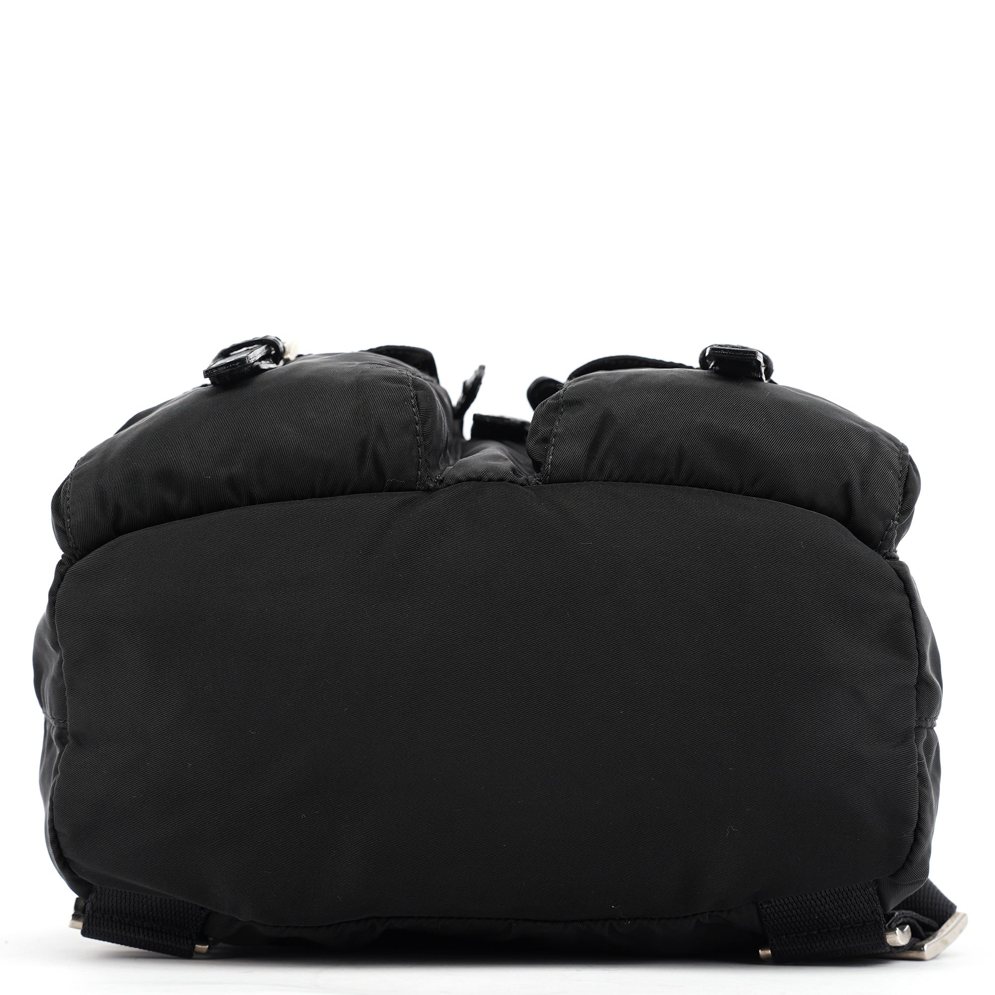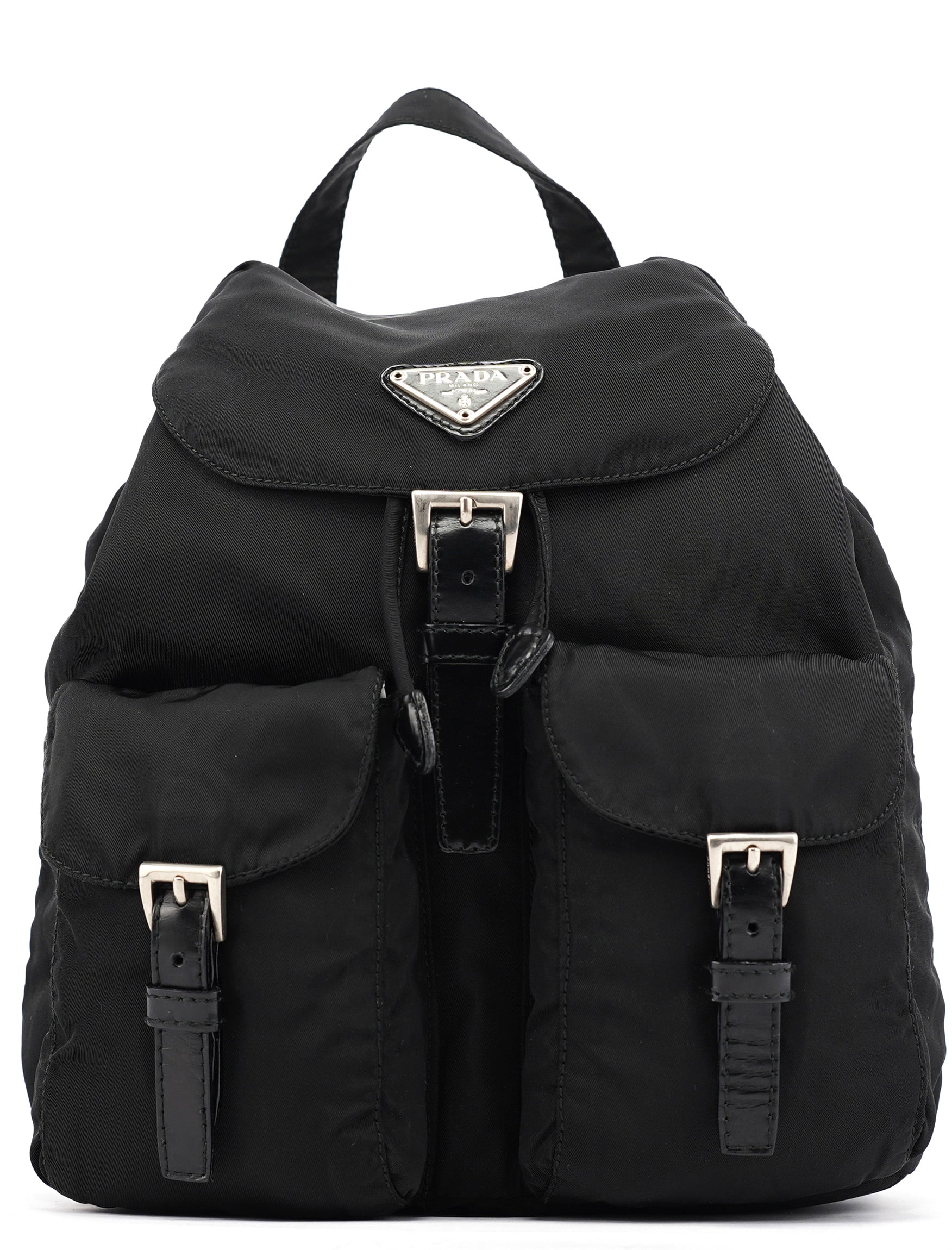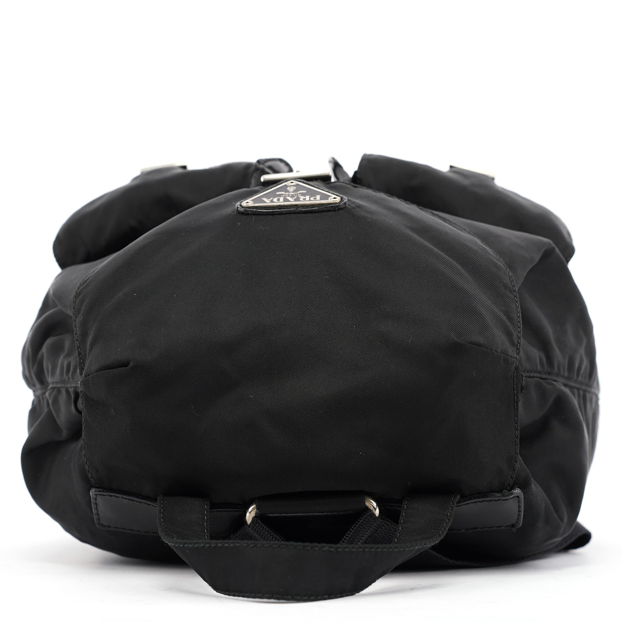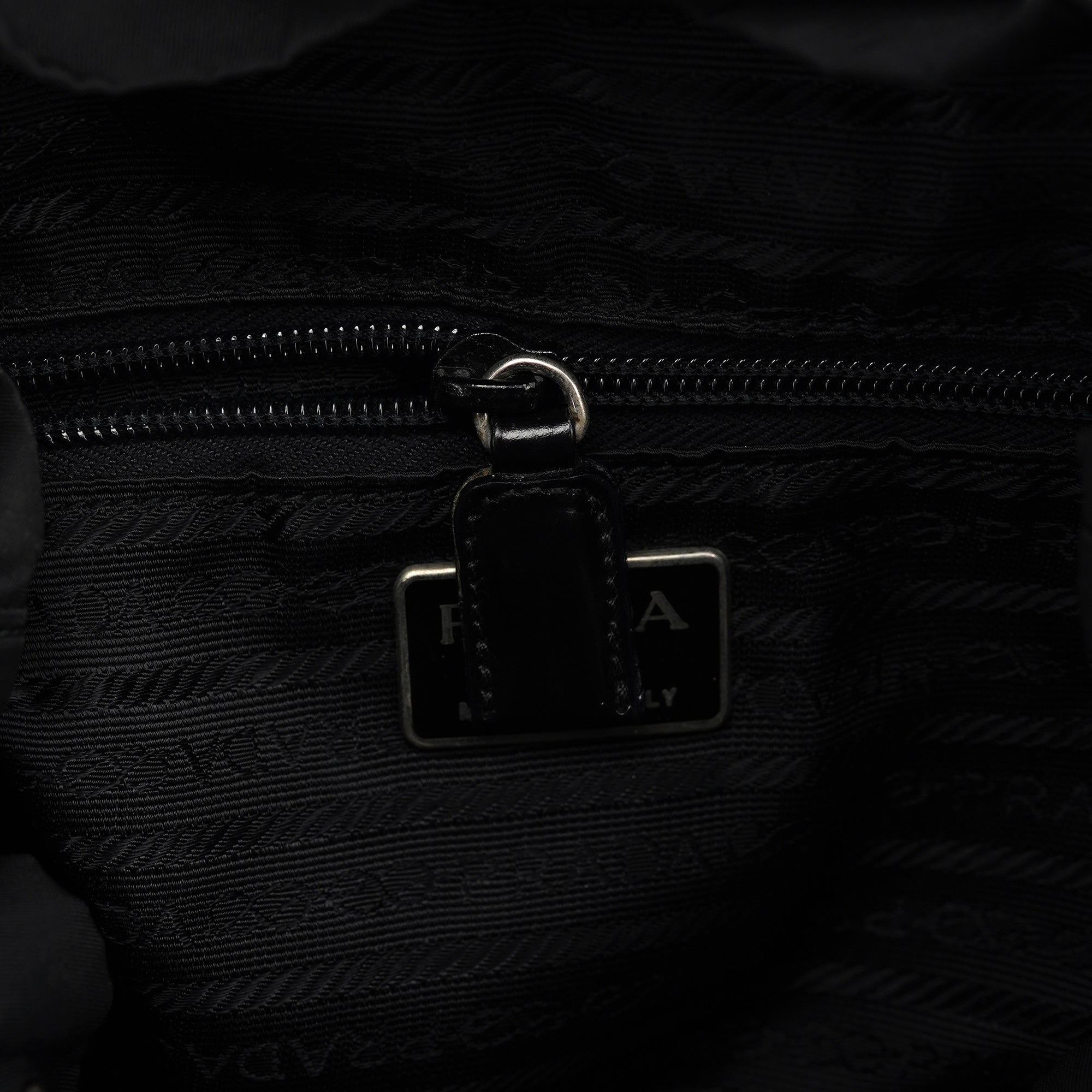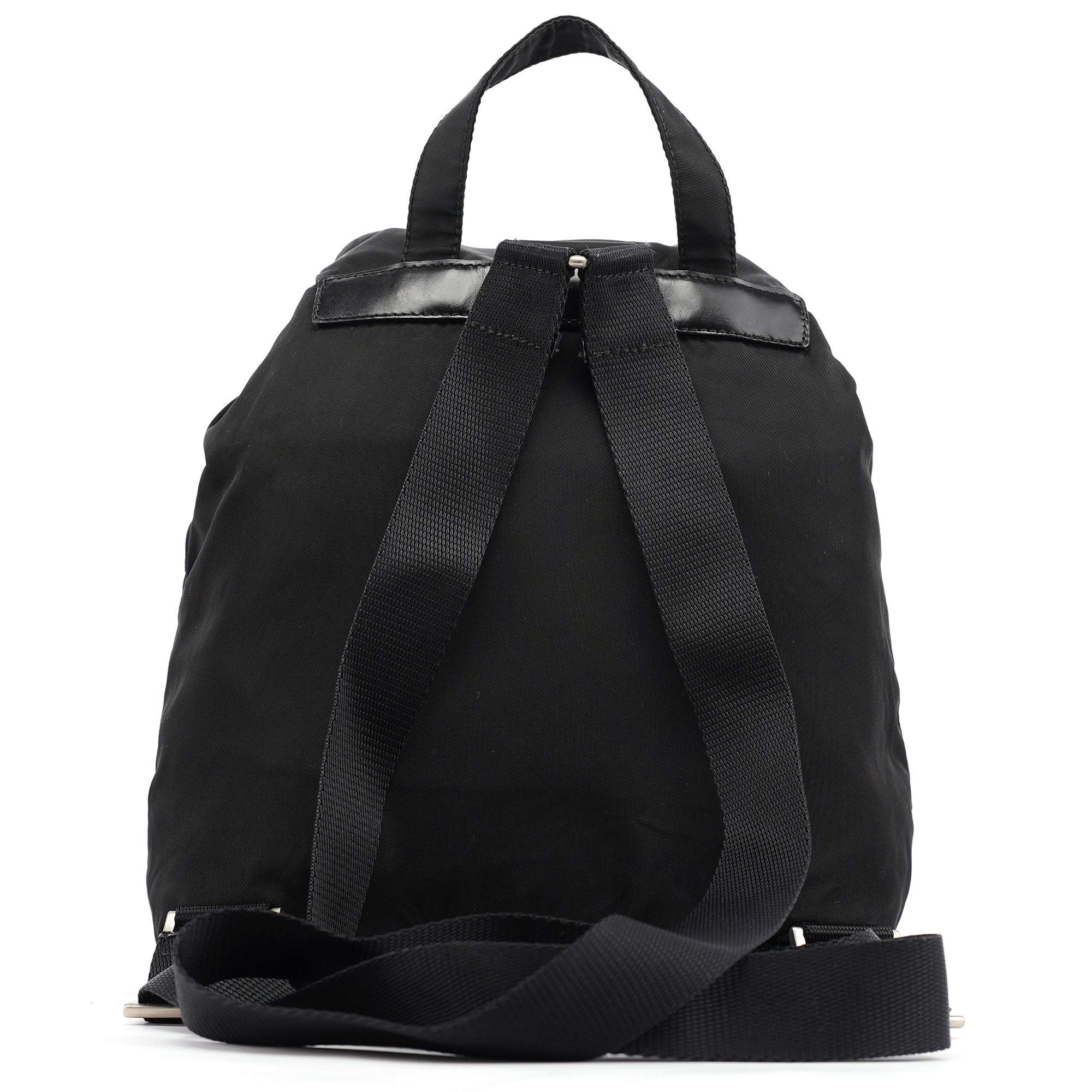 Designed in the late 1990's by Miuccia Prada, this vintage Prada Tessuto Vela backpack features black nylon construction with a drawstring top and flap closure secured by an adjustable strap and buckle. The iconic triangular Prada logo plate adorns the front flap, while two exterior front pockets with buckle closures offer additional storage. Adjustable shoulder straps and a top handle provide versatile carrying options.