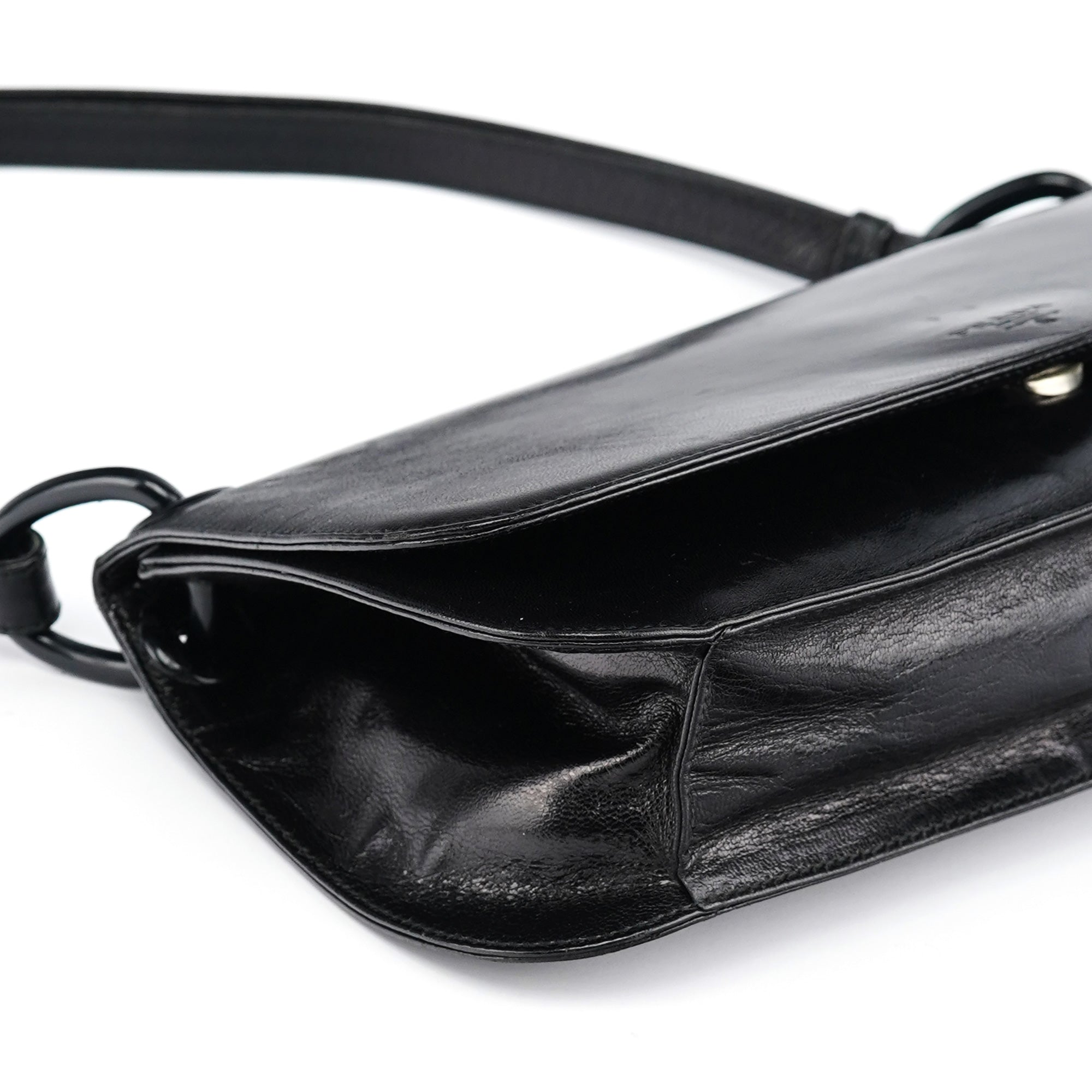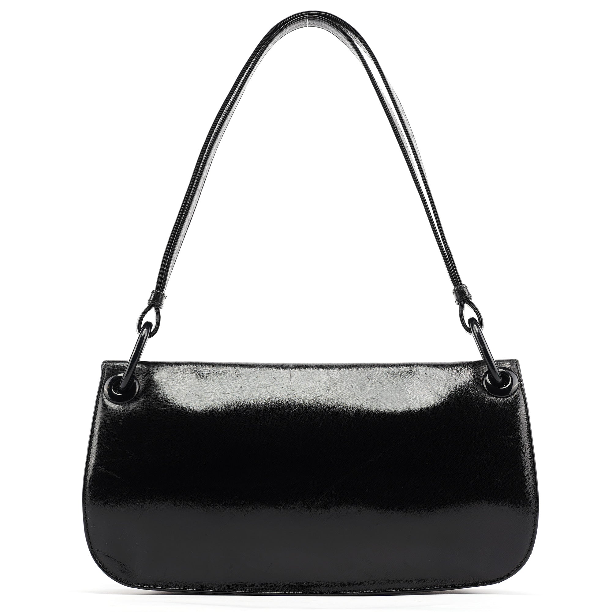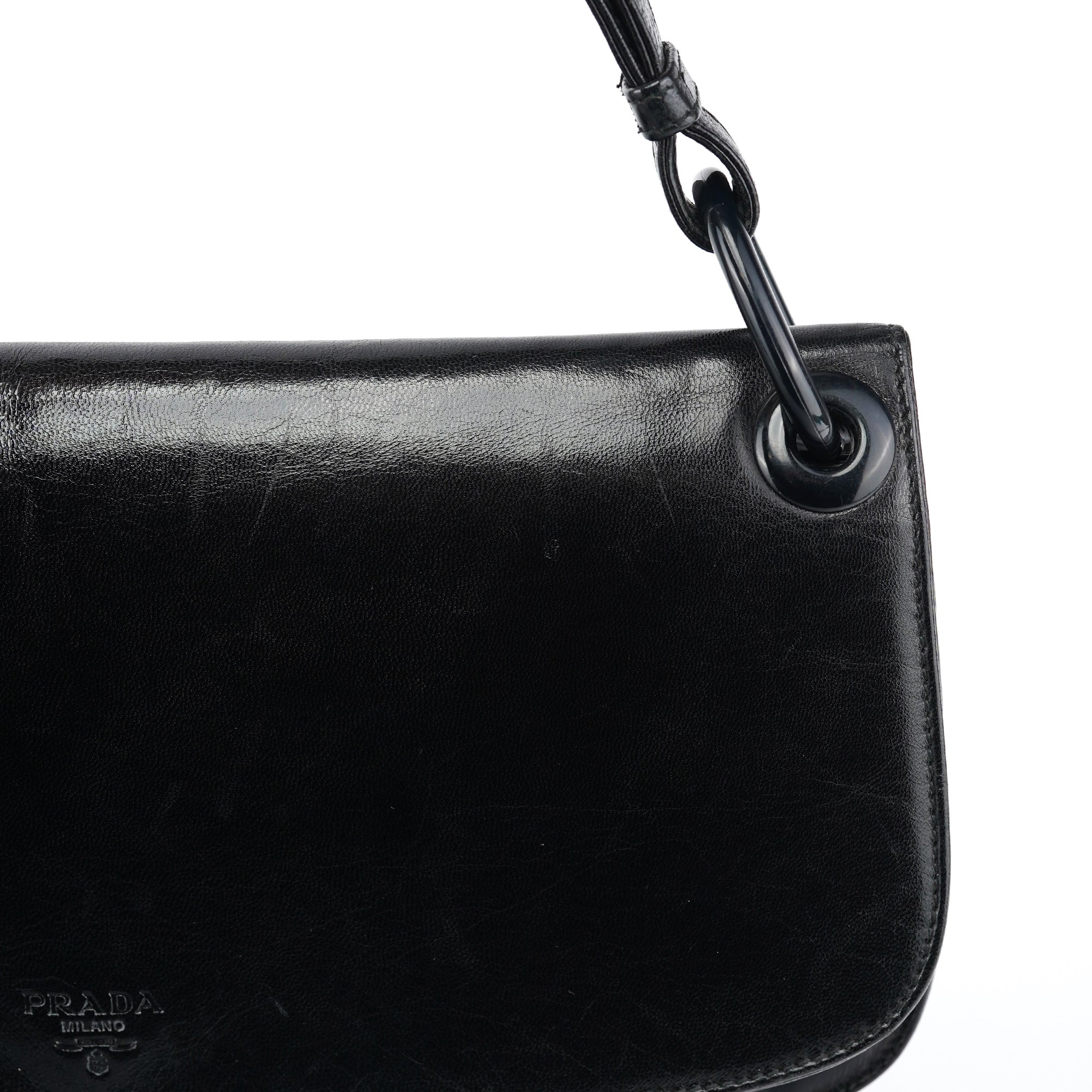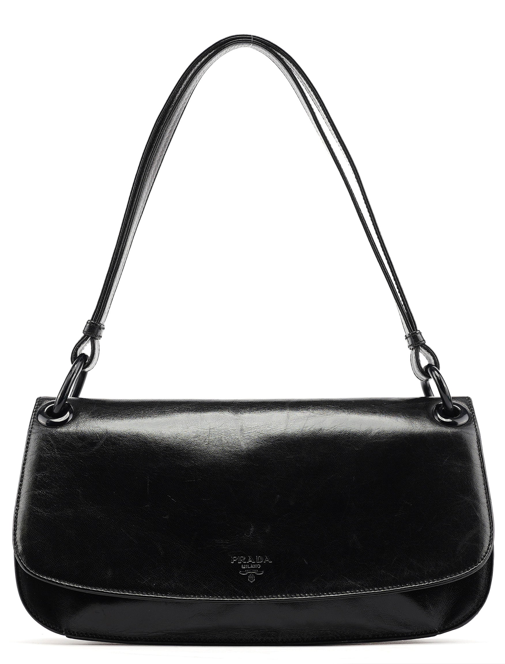 Designed in the mid 1990's by Miuccia Prada, this vintage Prada Madras Swing shoulder bag features black calfskin leather in a minimalist flap silhouette with the Prada Milano logo embossed on the front. The strap connects via ring hardware, and the bag closes with a flap and snap closure. The interior is lined in logo jacquard fabric with a zip pocket.