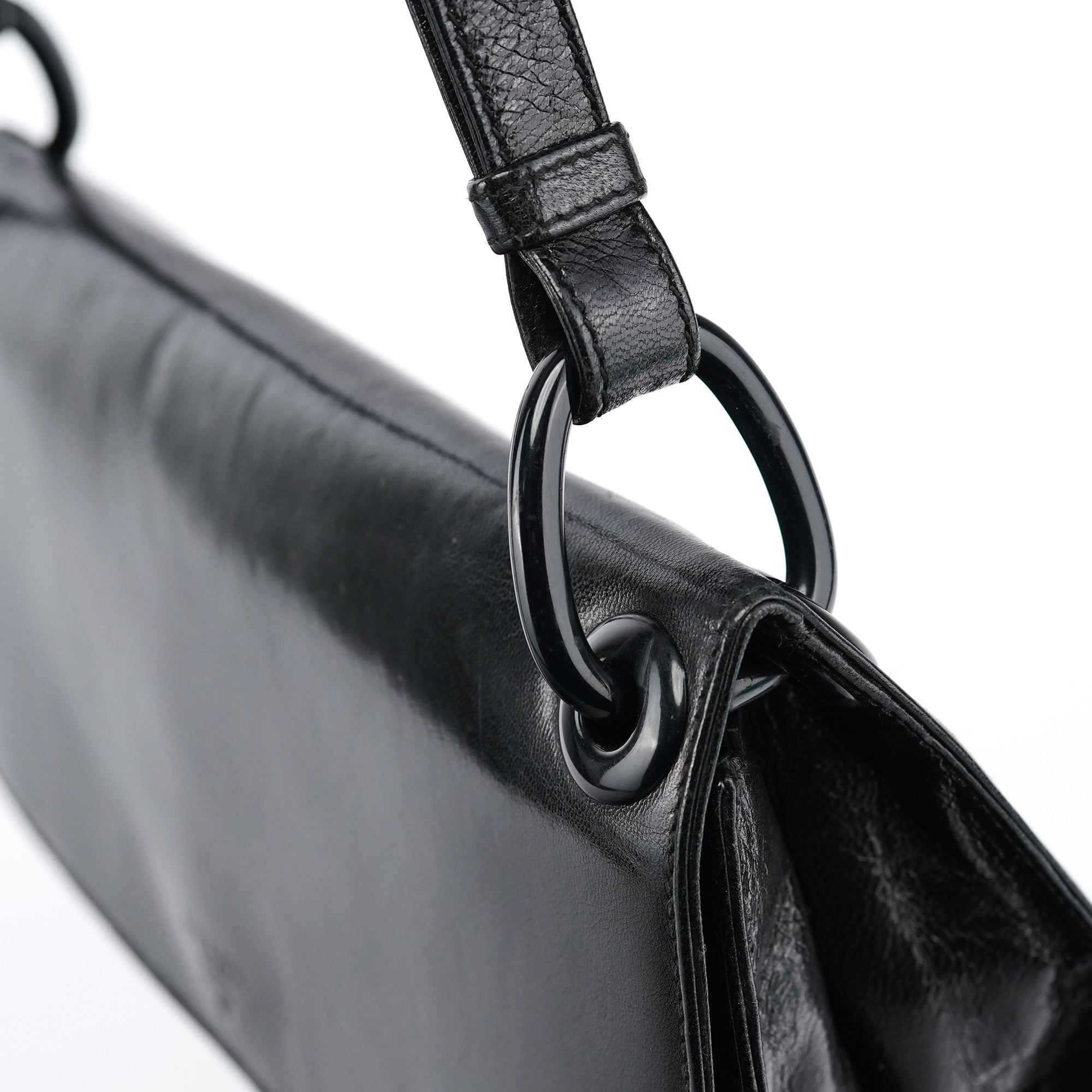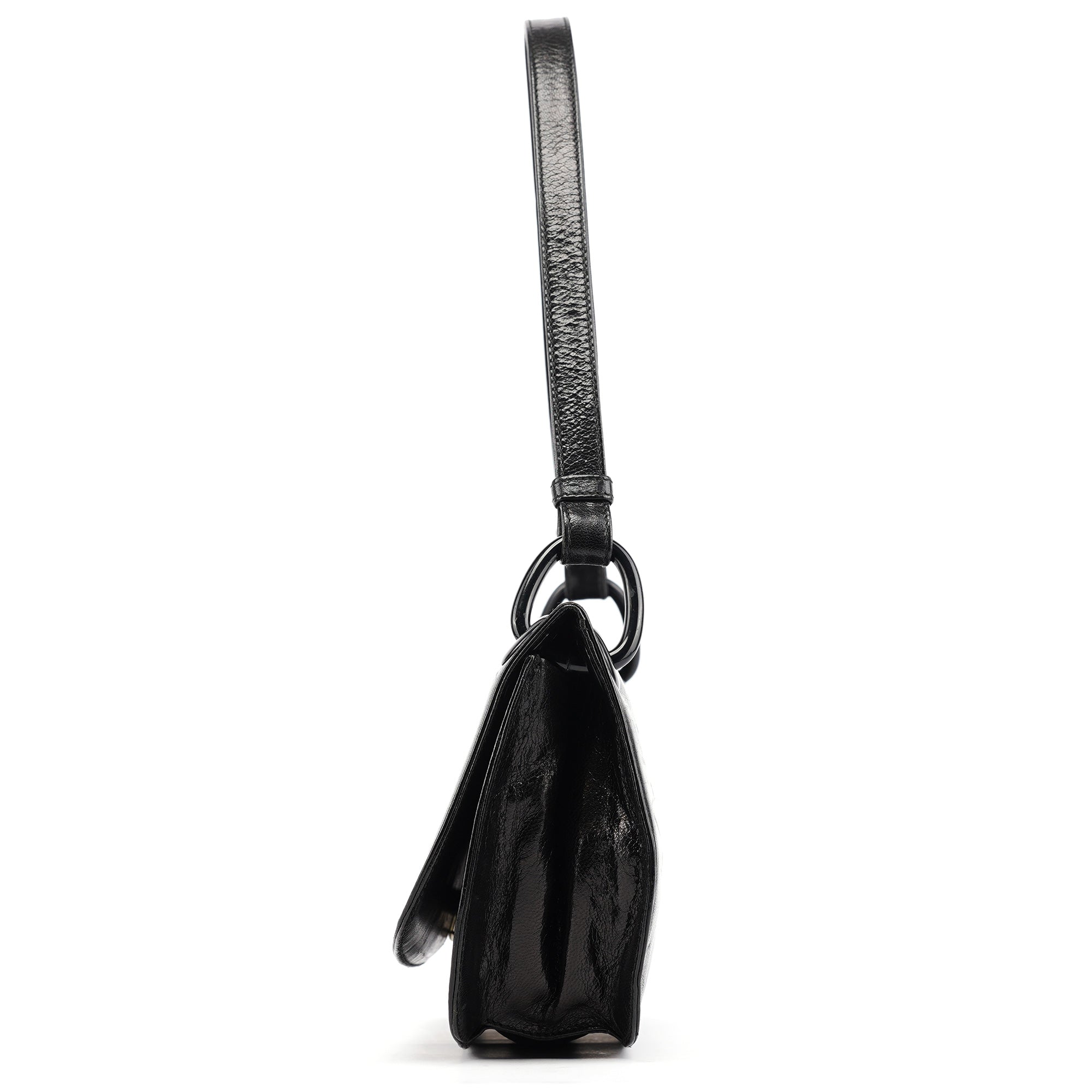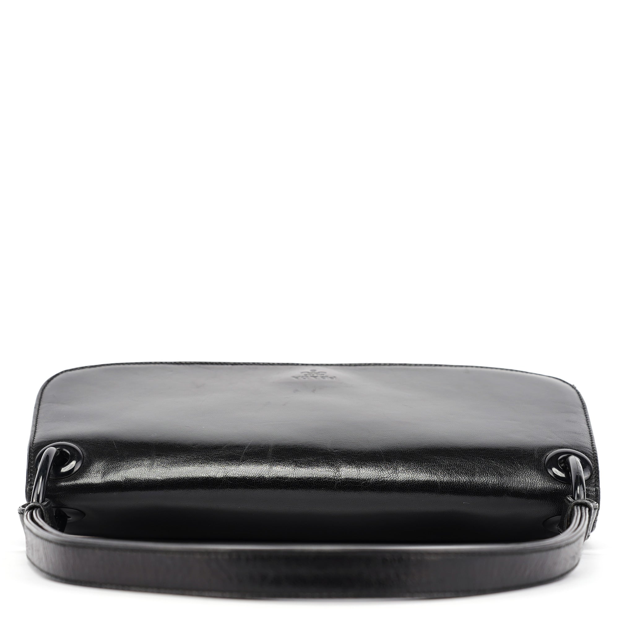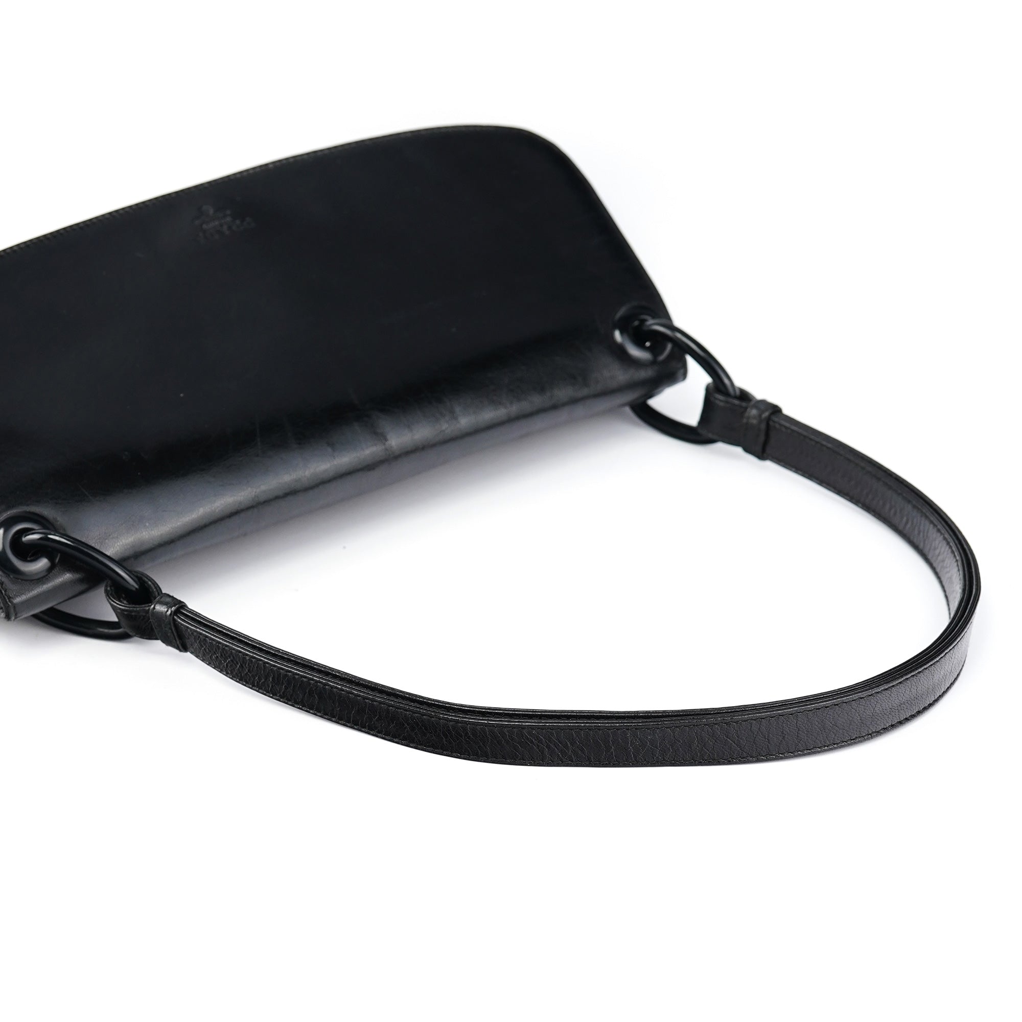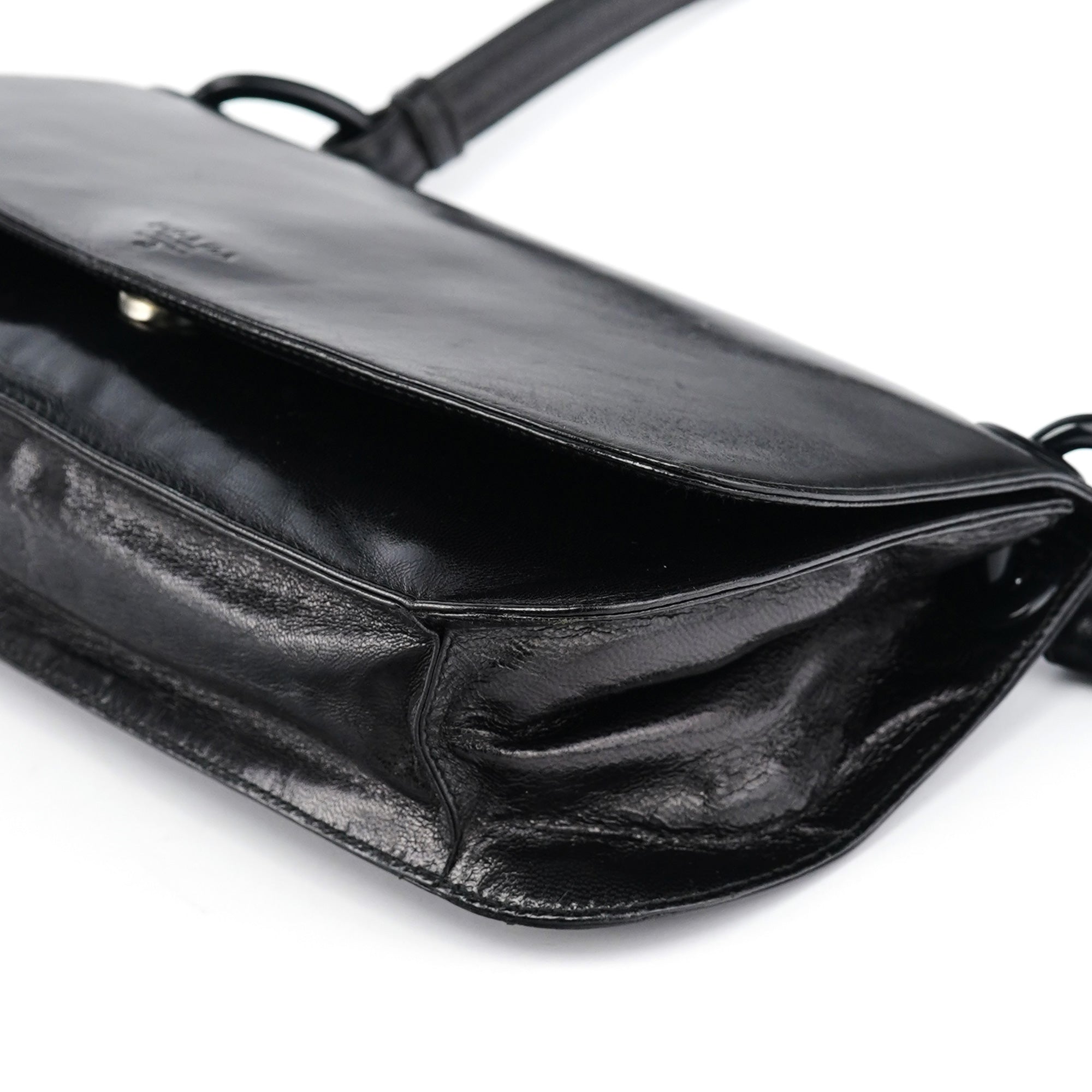 Designed in the mid 1990's by Miuccia Prada, this vintage Prada Madras Swing shoulder bag features black calfskin leather in a minimalist flap silhouette with the Prada Milano logo embossed on the front. The strap connects via ring hardware, and the bag closes with a flap and snap closure. The interior is lined in logo jacquard fabric with a zip pocket.