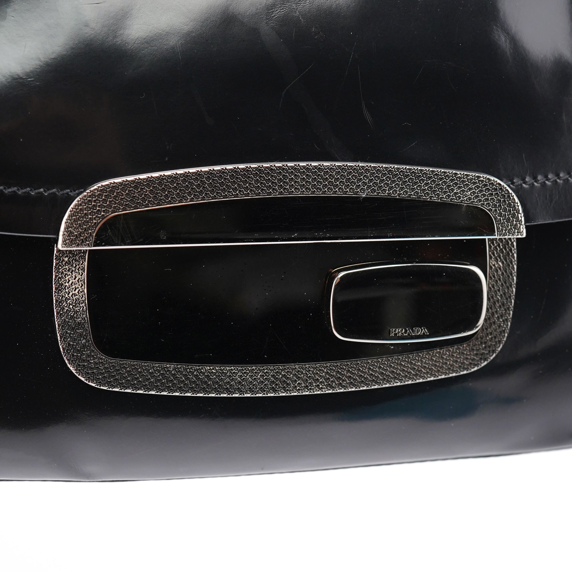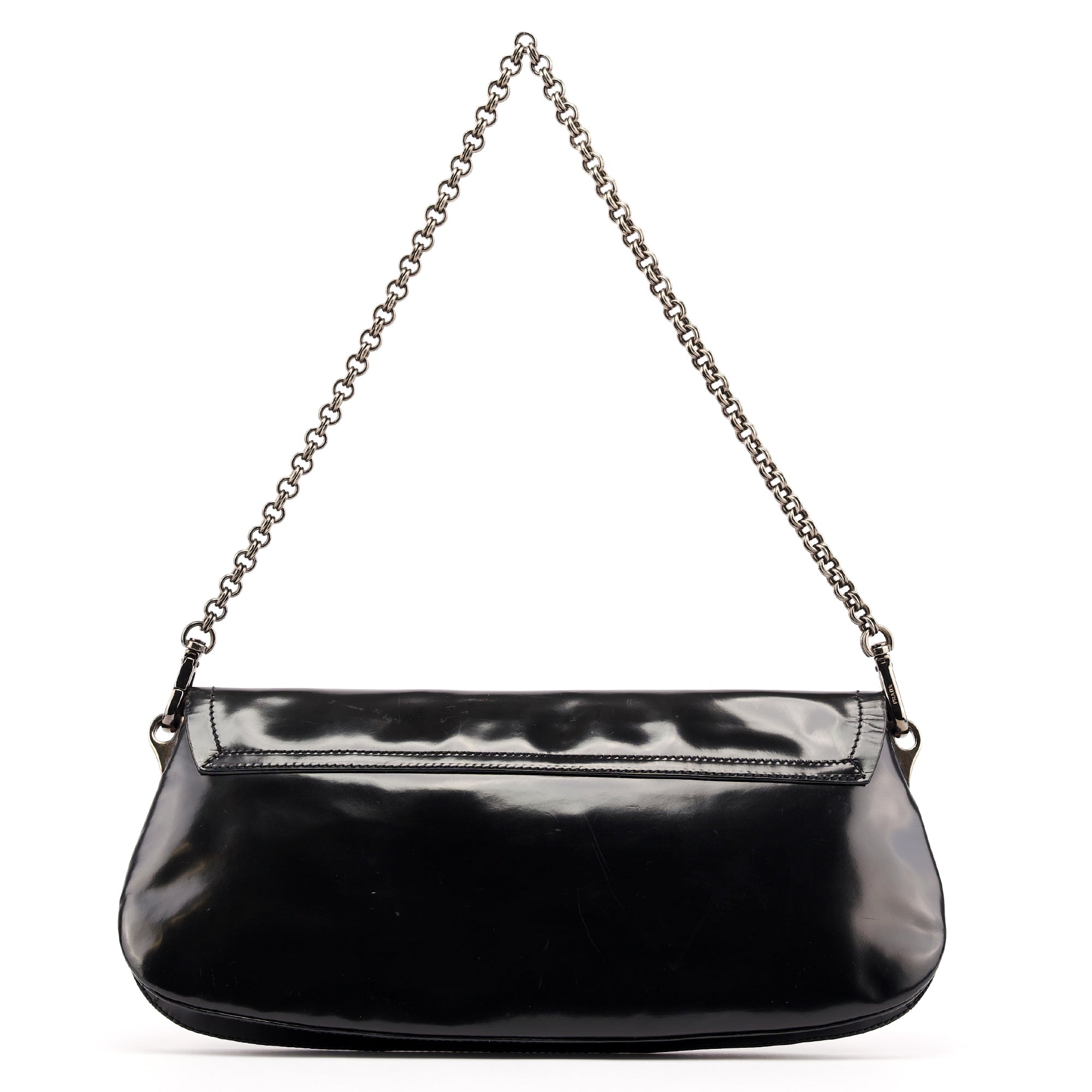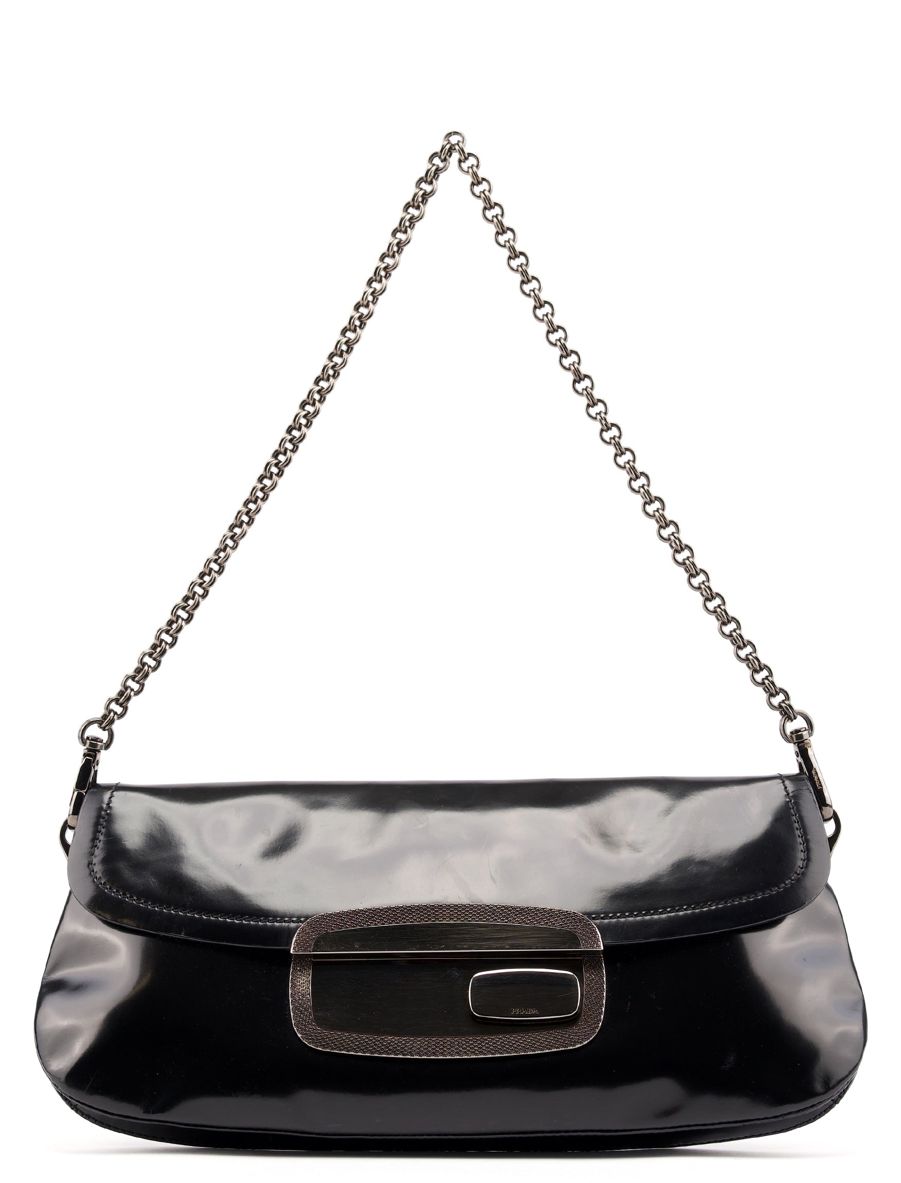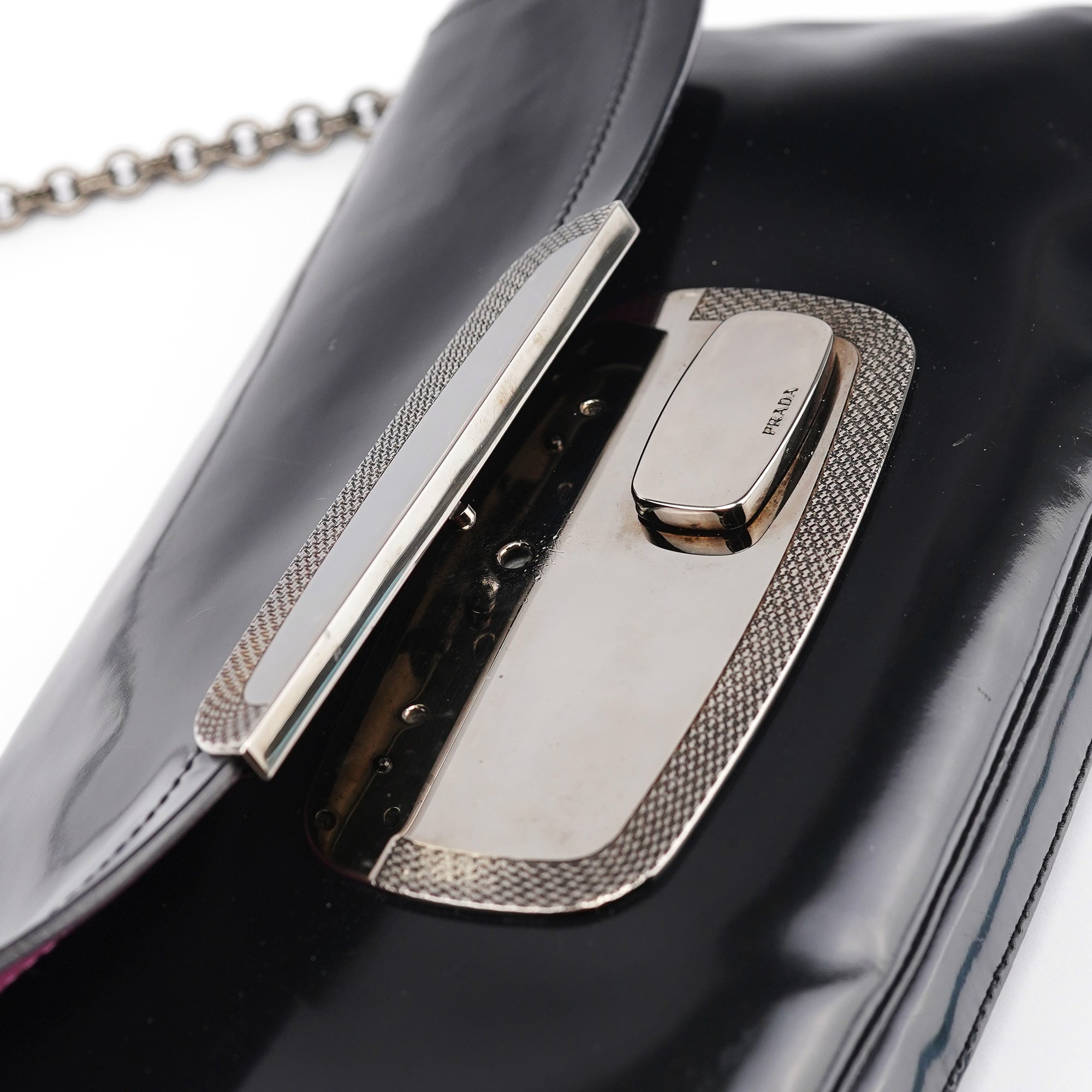 Designed in the early 2000s, this Prada shoulder bag is crafted in black Spazzolato leather with a high-shine finish and polished silver-tone chain strap. The structured silhouette is accented by a signature metal buckle detail on the flap and opens to a satin-lined interior with a zippered pocket.