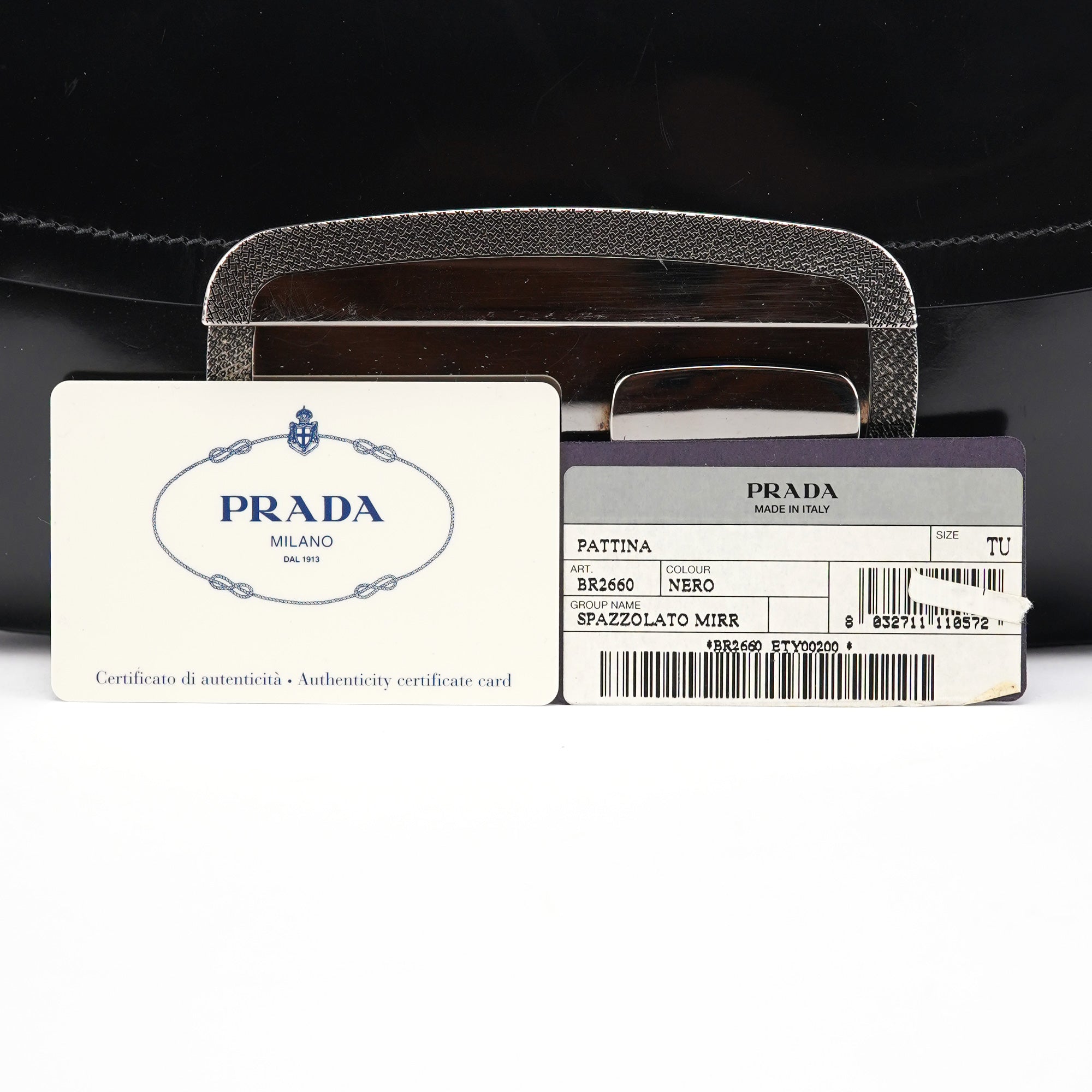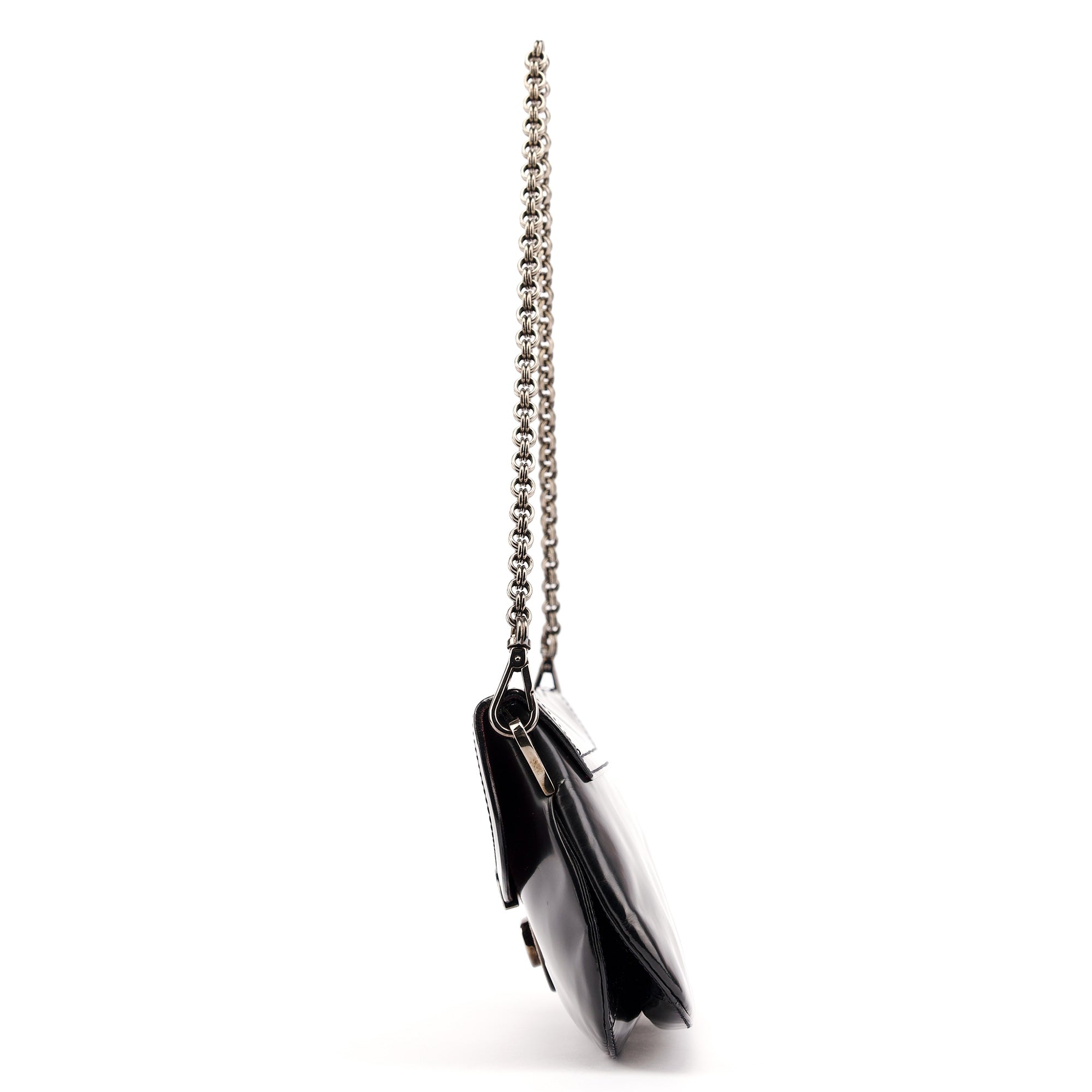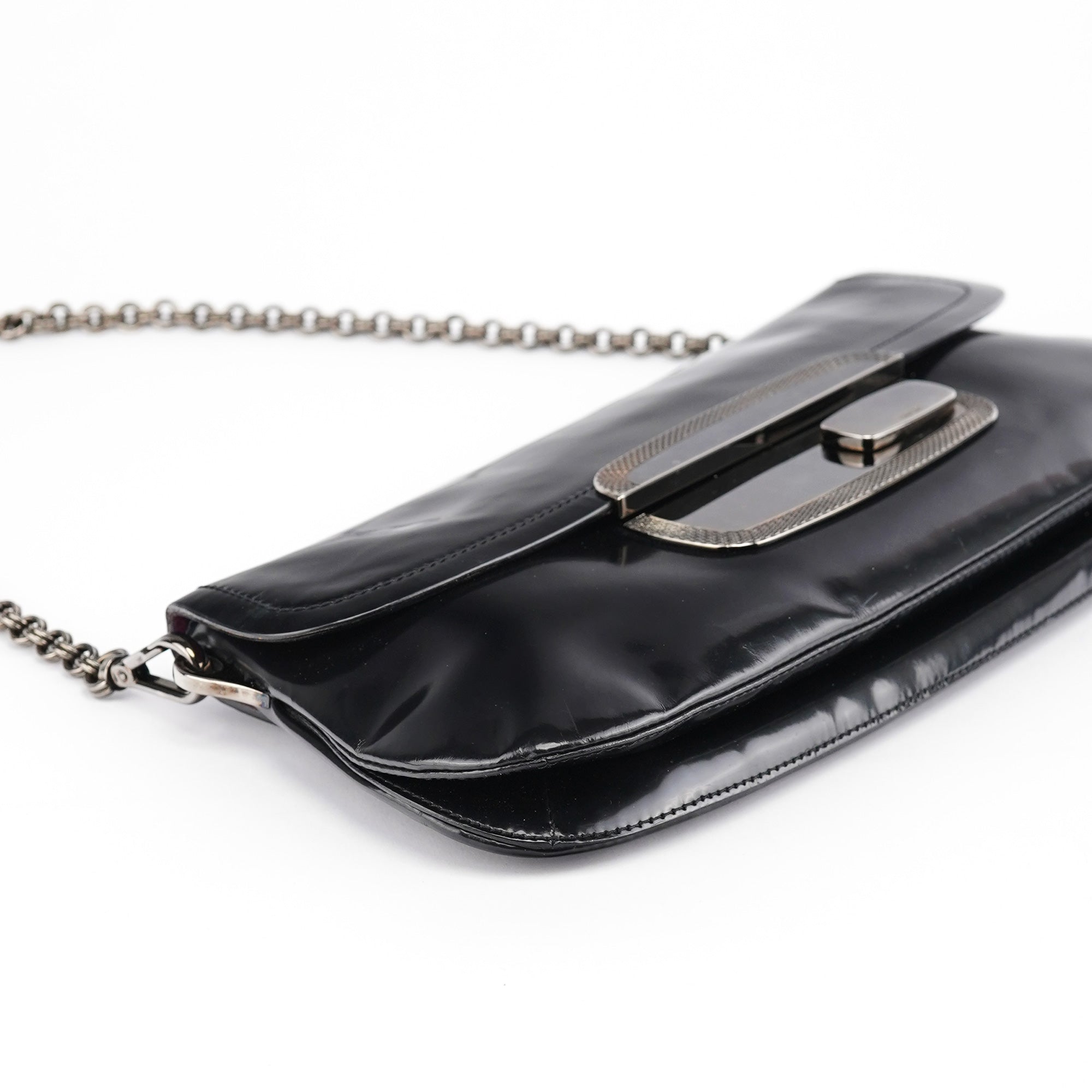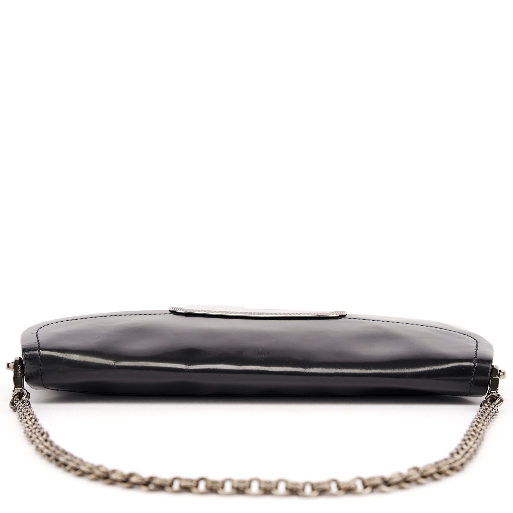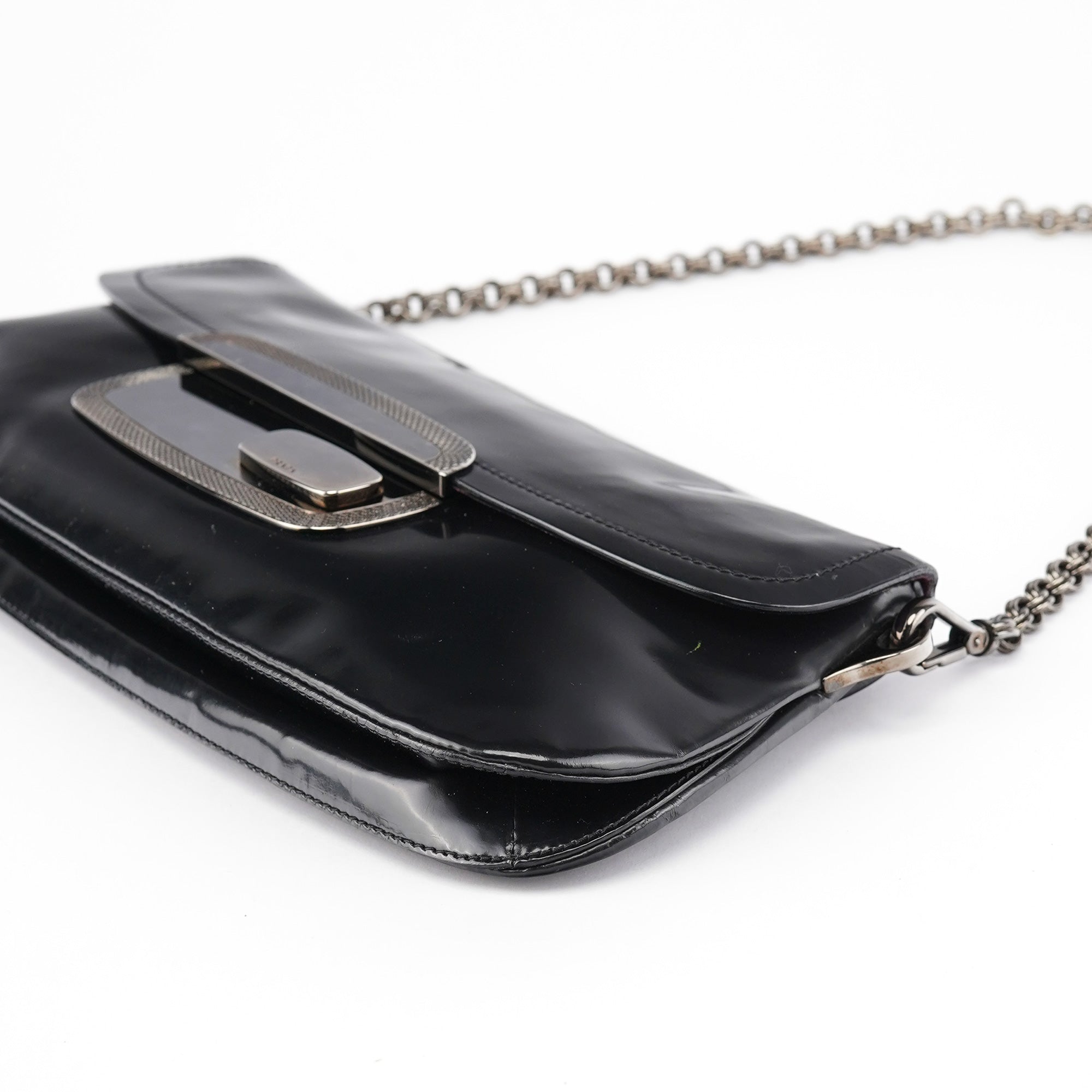 Designed in the early 2000s, this Prada shoulder bag is crafted in black Spazzolato leather with a high-shine finish and polished silver-tone chain strap. The structured silhouette is accented by a signature metal buckle detail on the flap and opens to a satin-lined interior with a zippered pocket.