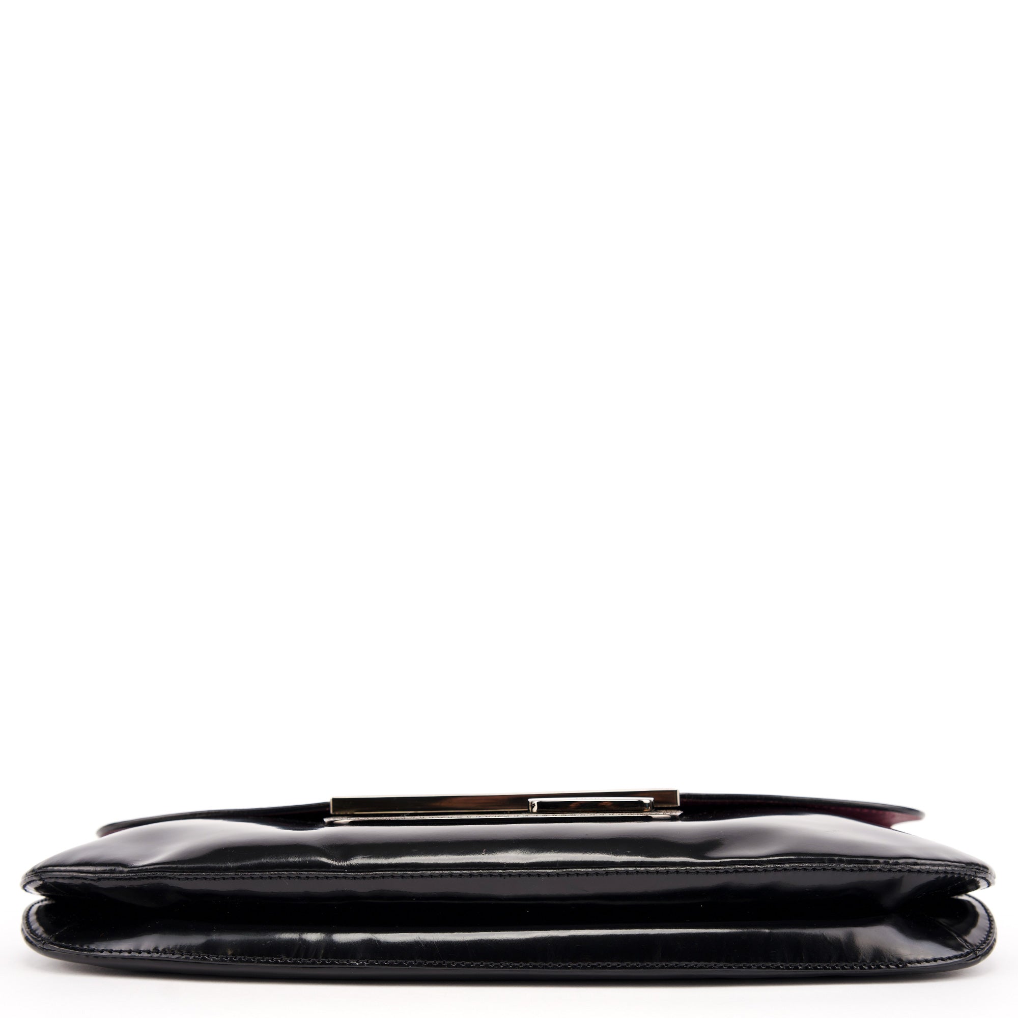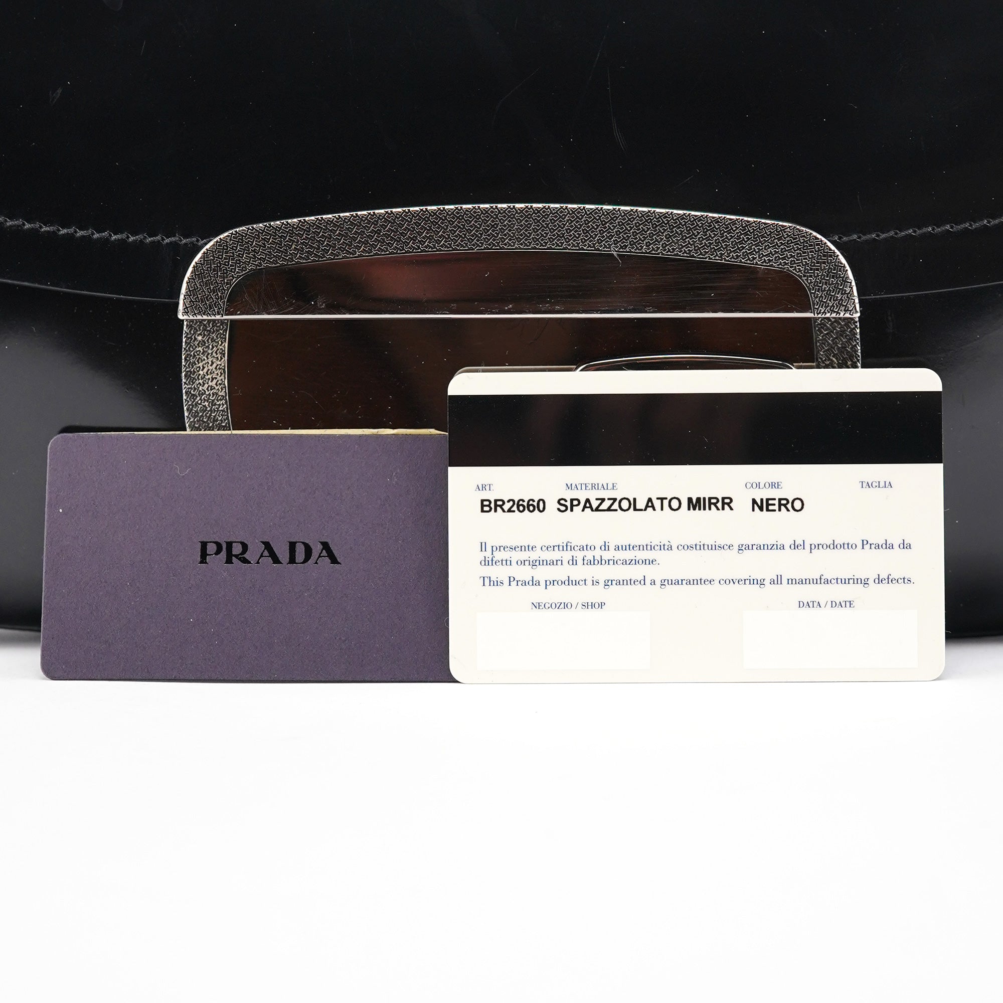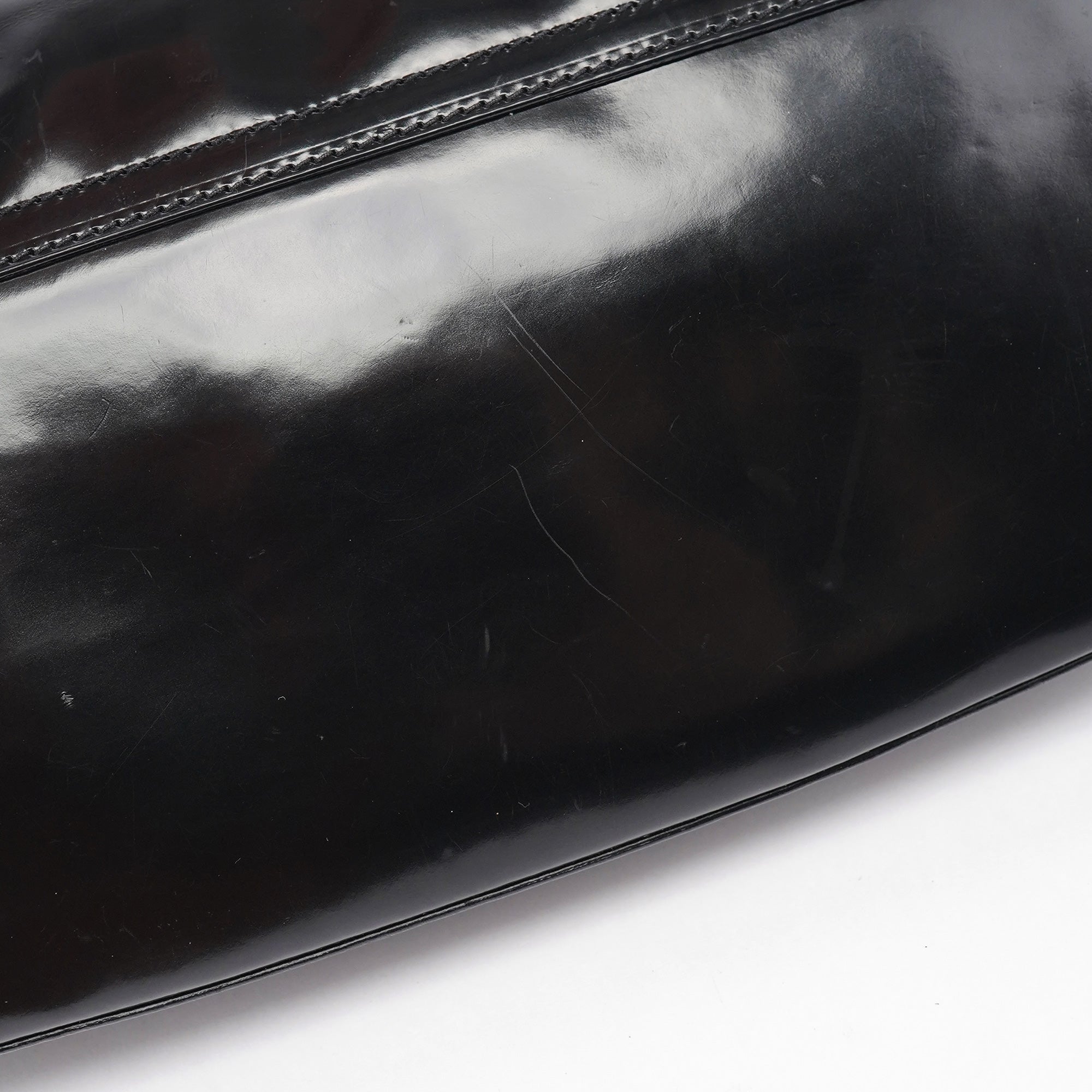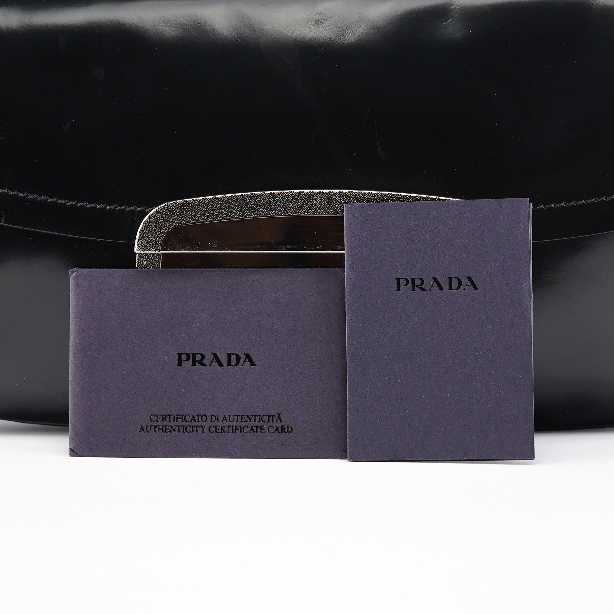 Designed in the early 2000s, this Prada shoulder bag is crafted in black Spazzolato leather with a high-shine finish and polished silver-tone chain strap. The structured silhouette is accented by a signature metal buckle detail on the flap and opens to a satin-lined interior with a zippered pocket.