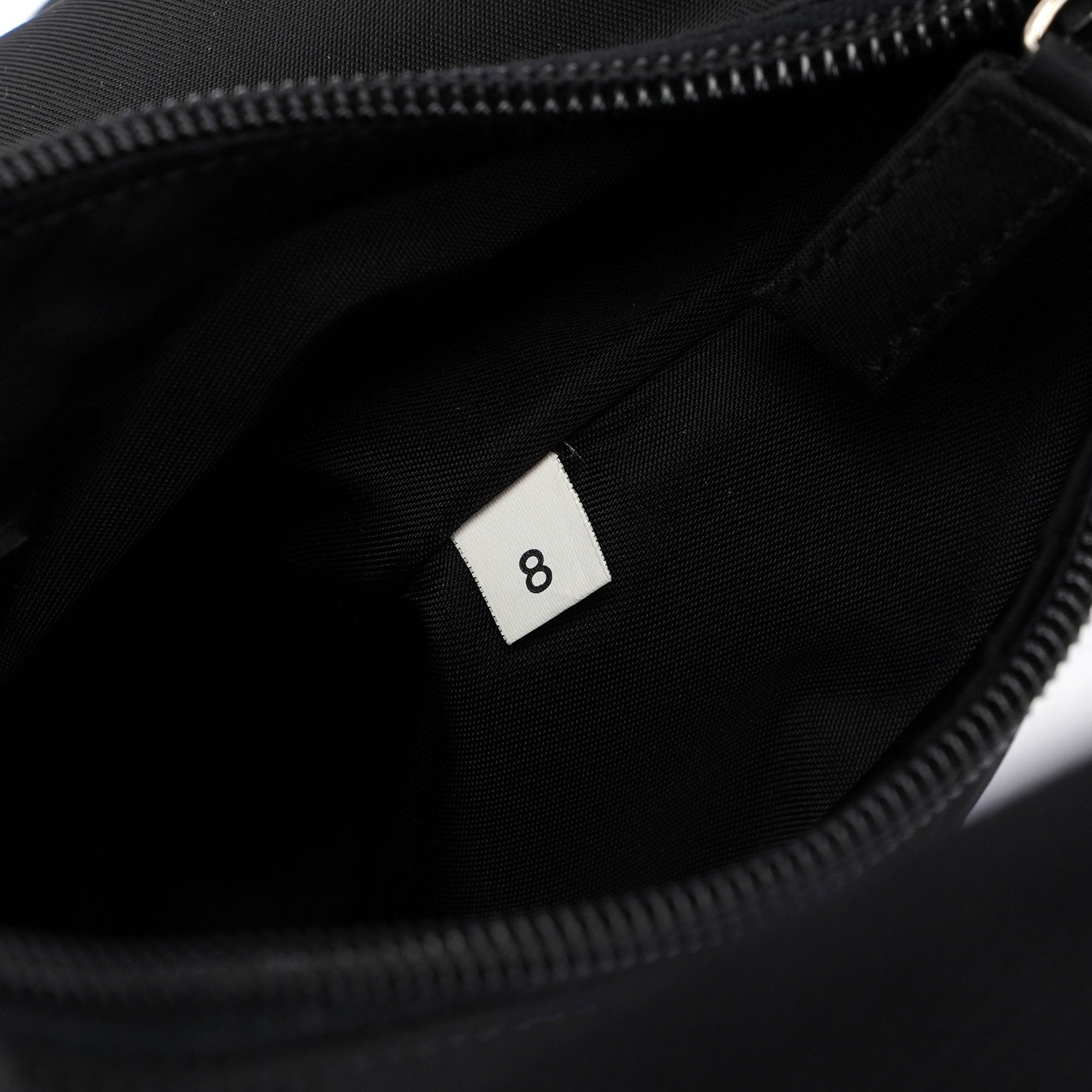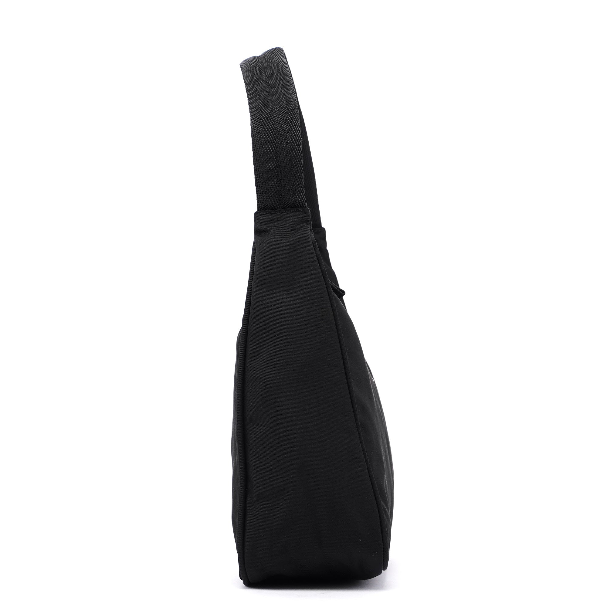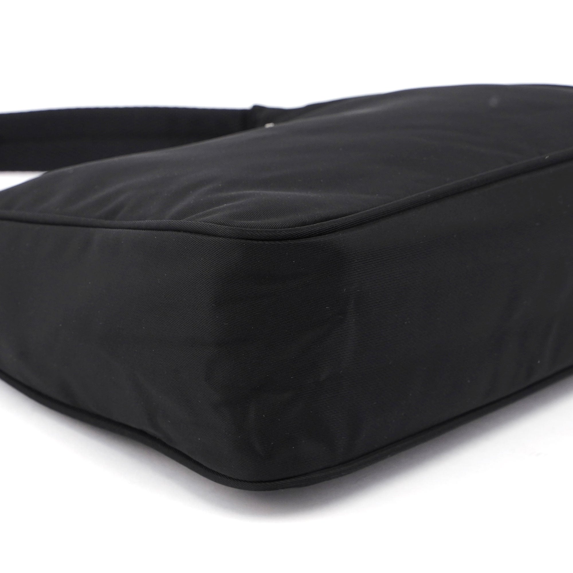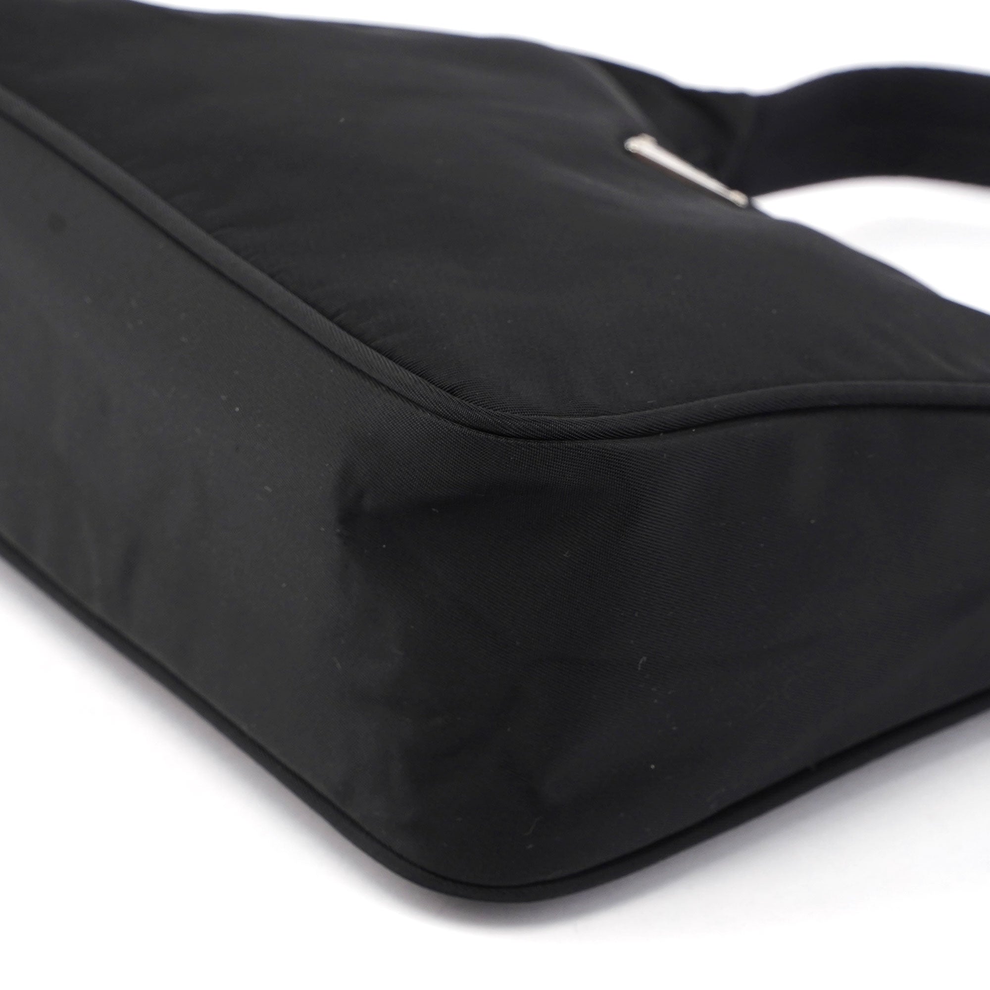 Introducing the original Prada Tessuto mini hobo bag, designed by Miuccia Prada in the late 1990s and recently re-issued. Handcrafted in timeless black nylon, it features a padded handle for comfort and a zipper closure for security. The interior, lined in nylon, offers practicality, while the iconic Prada triangle logo plaque on the front adds a touch of sophistication.