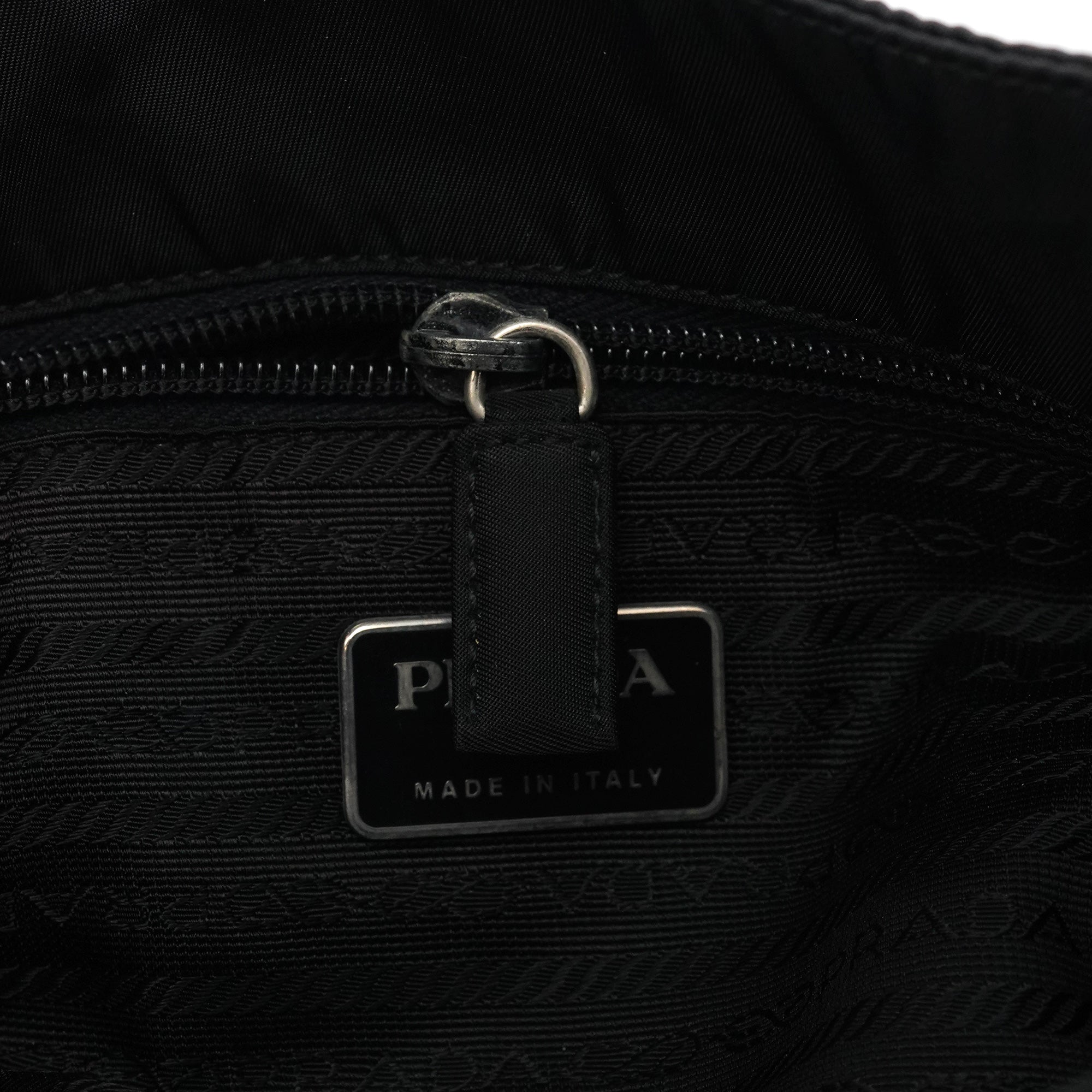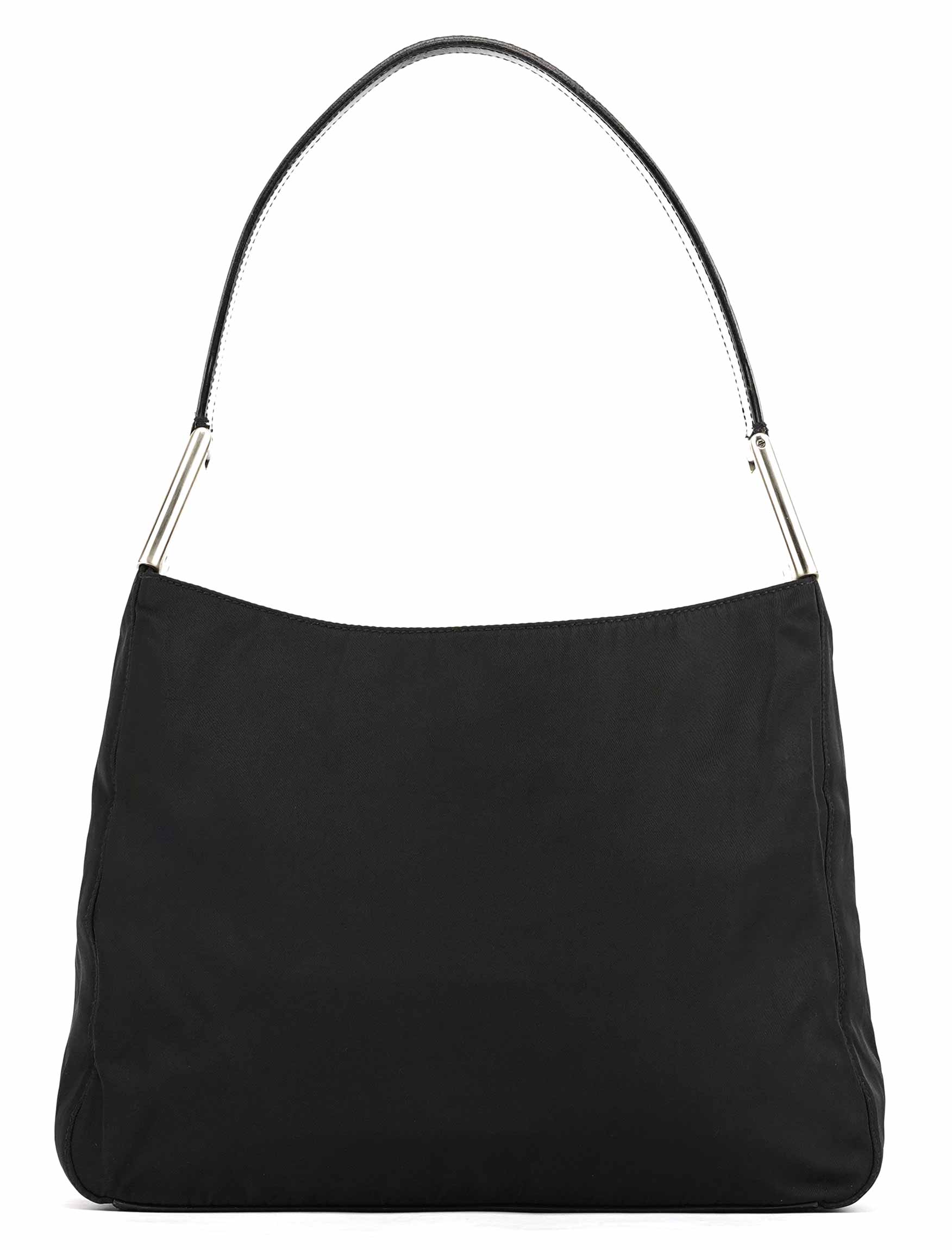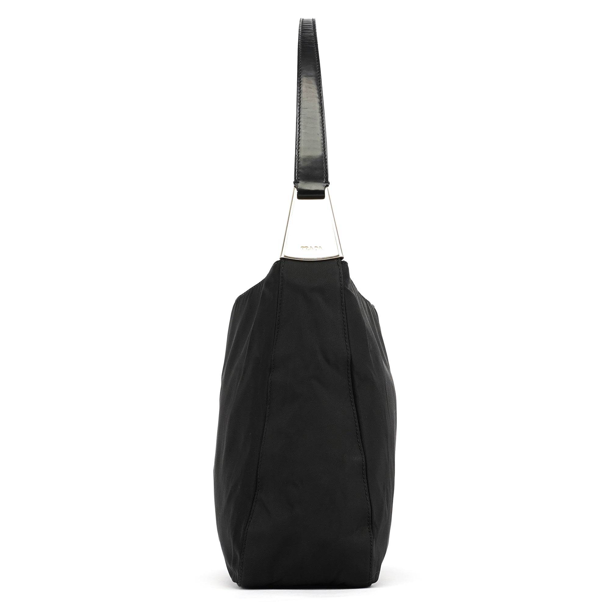 Designed in the late 1990s by Miuccia Prada, this Prada Tessuto Spazzolato hobo is crafted from black nylon with smooth leather trim and brushed silver-tone hardware. The softly structured silhouette features three interior compartments, with a central zip section, and is finished with a jacquard satin lining and signature Prada plaque.