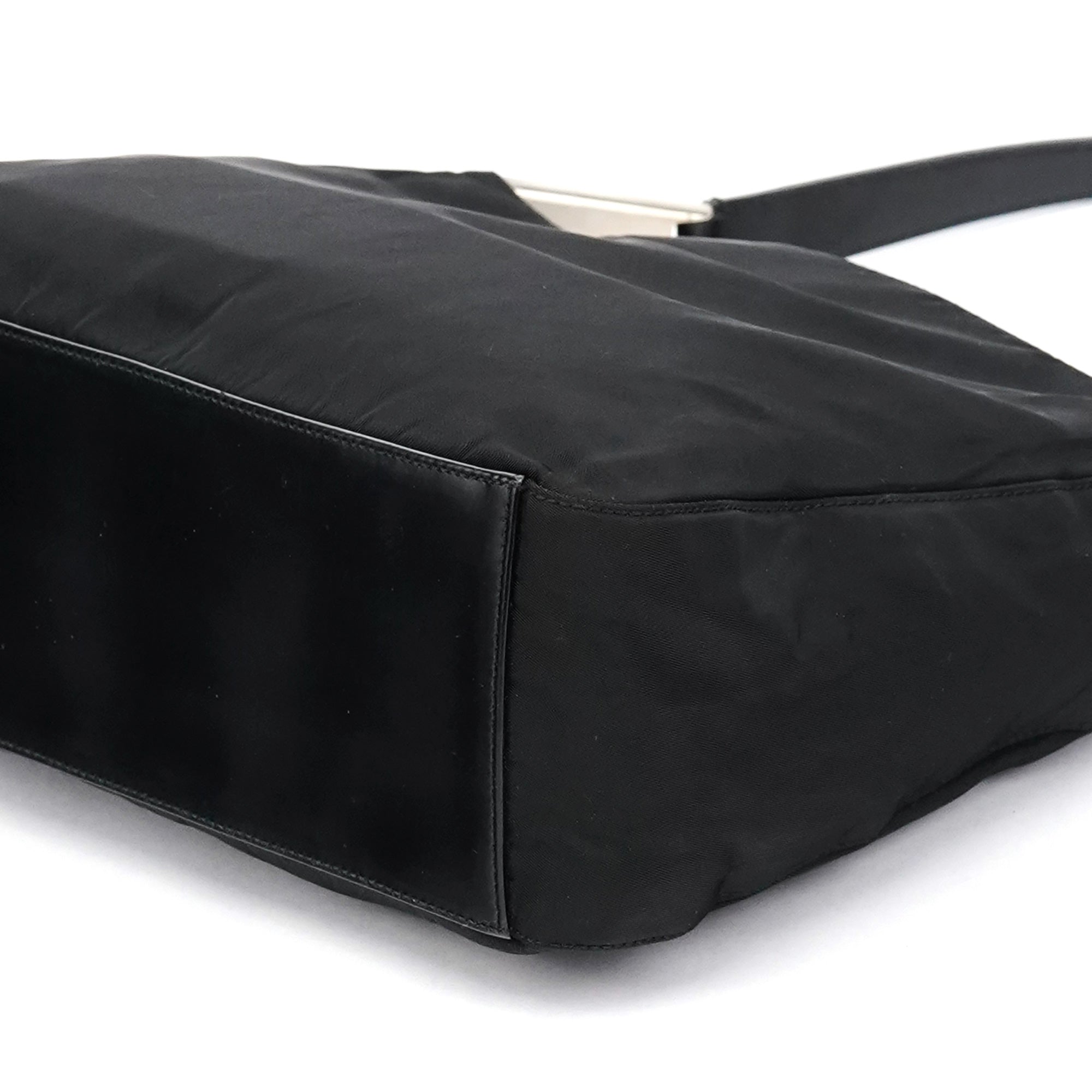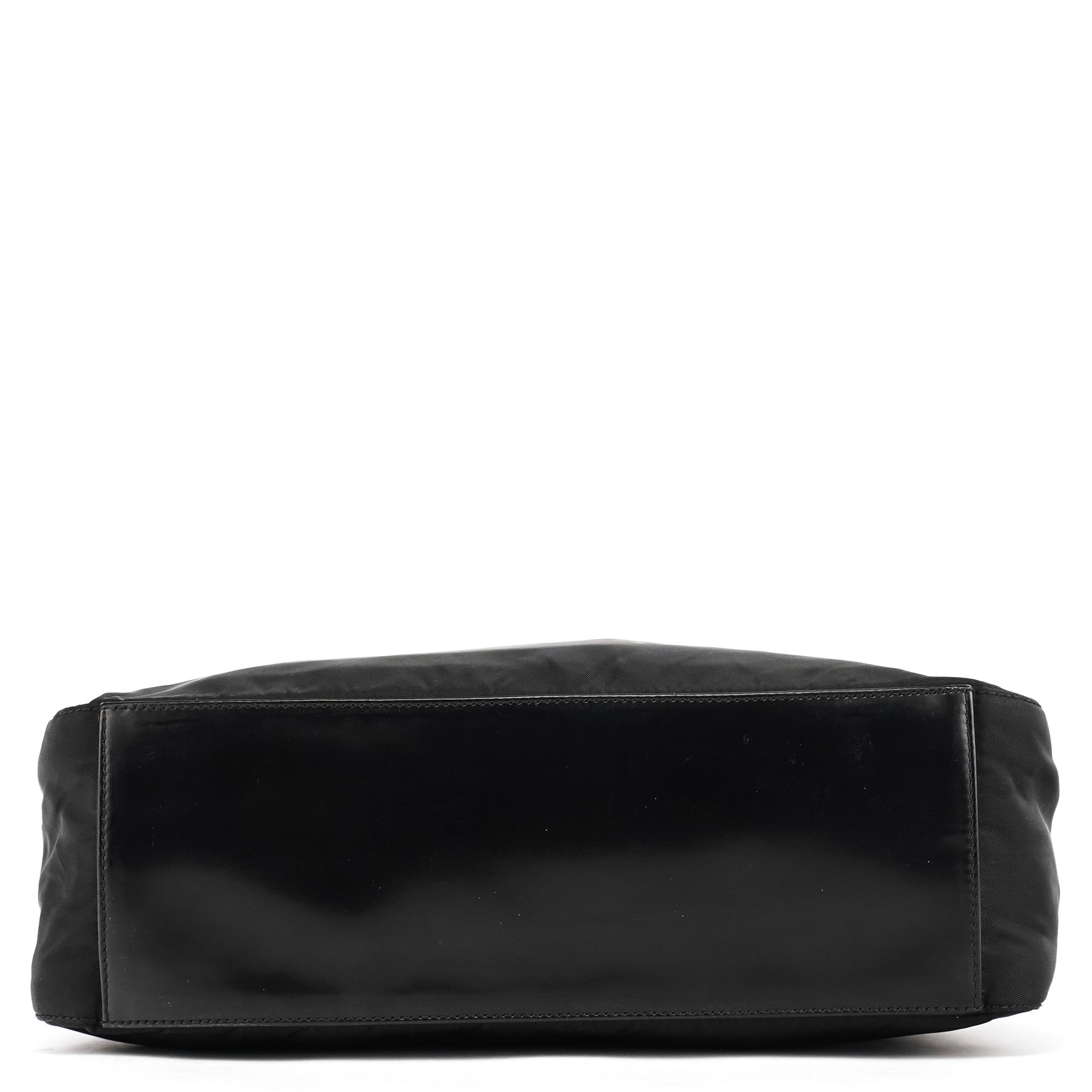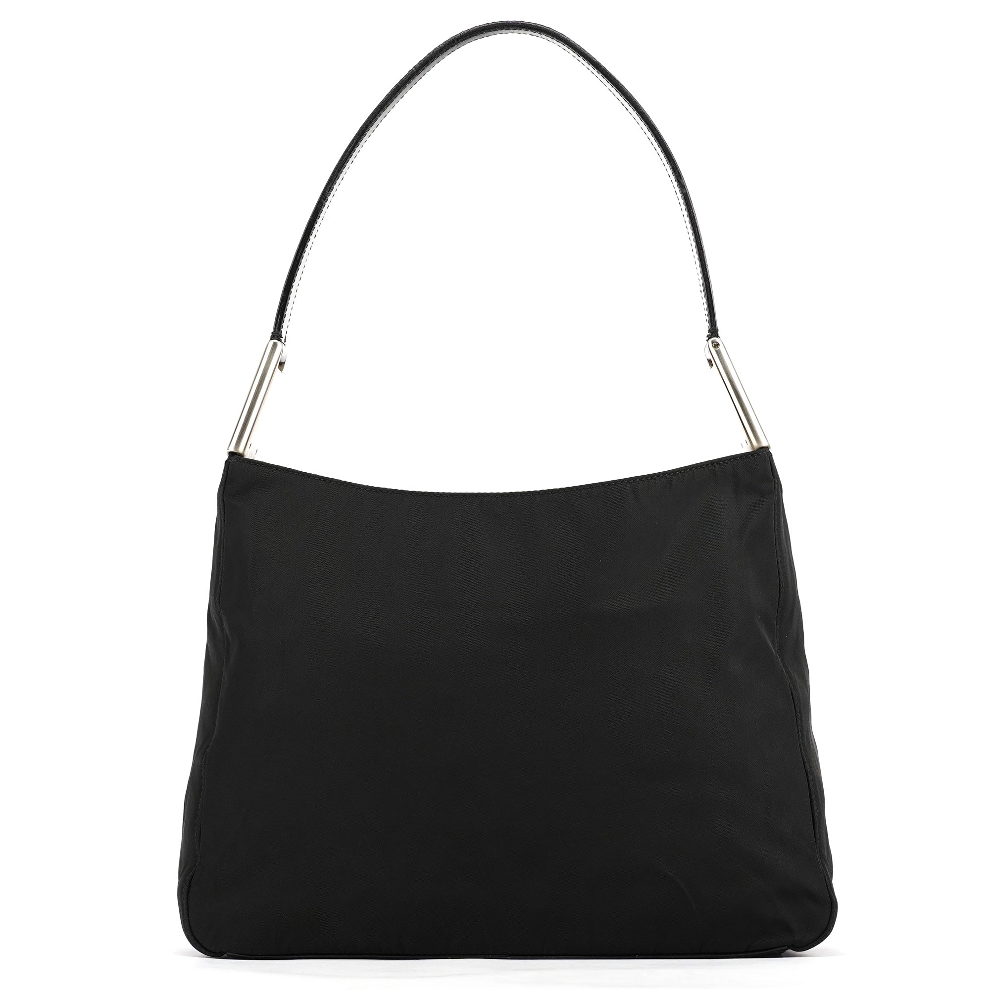 Designed in the late 1990s by Miuccia Prada, this Prada Tessuto Spazzolato hobo is crafted from black nylon with smooth leather trim and brushed silver-tone hardware. The softly structured silhouette features three interior compartments, with a central zip section, and is finished with a jacquard satin lining and signature Prada plaque.
