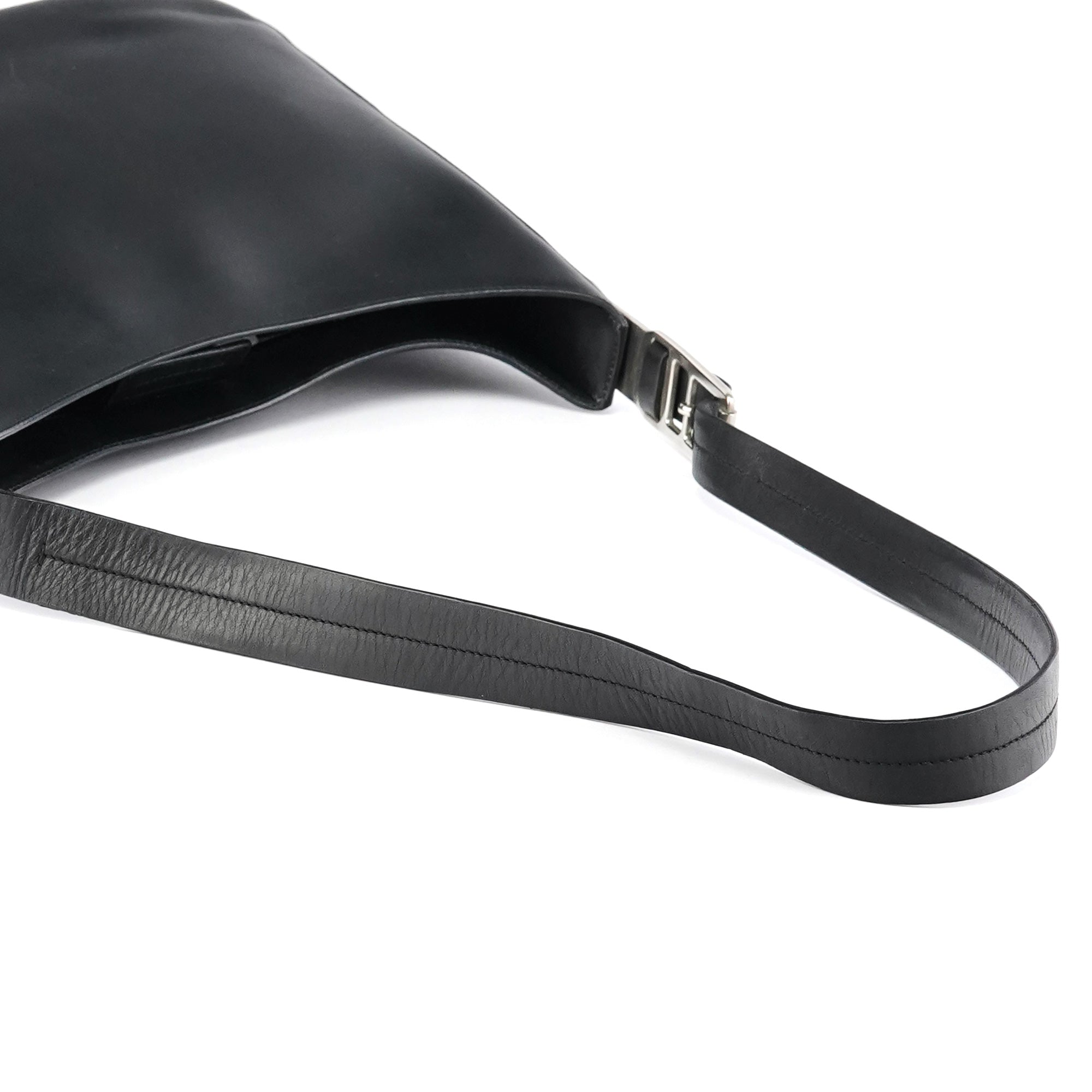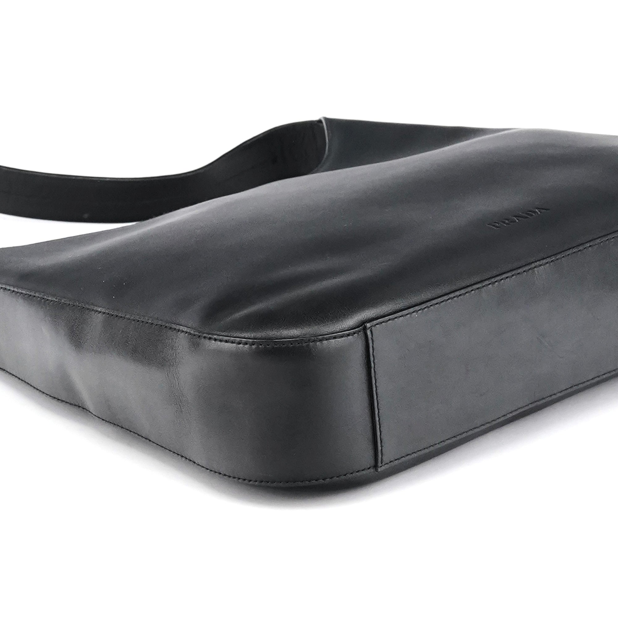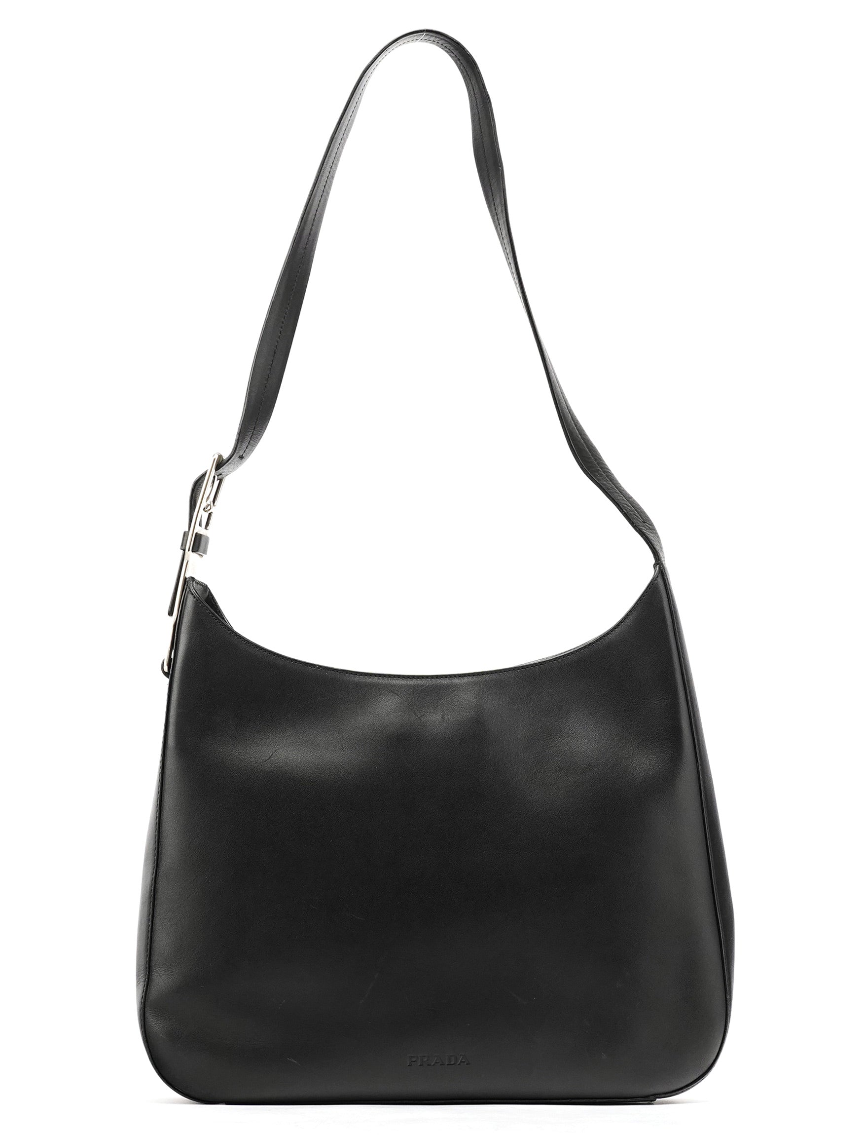 Designed in 1998 by Miuccia Prada, this Vitello Metal shoulder bag is crafted in smooth black leather and defined by its curved minimalist silhouette. The design features a wide leather strap anchored by sculptural silver-tone hardware, with a velcro-top closure and a logo-jacquard lined interior with interior zipper pocket.