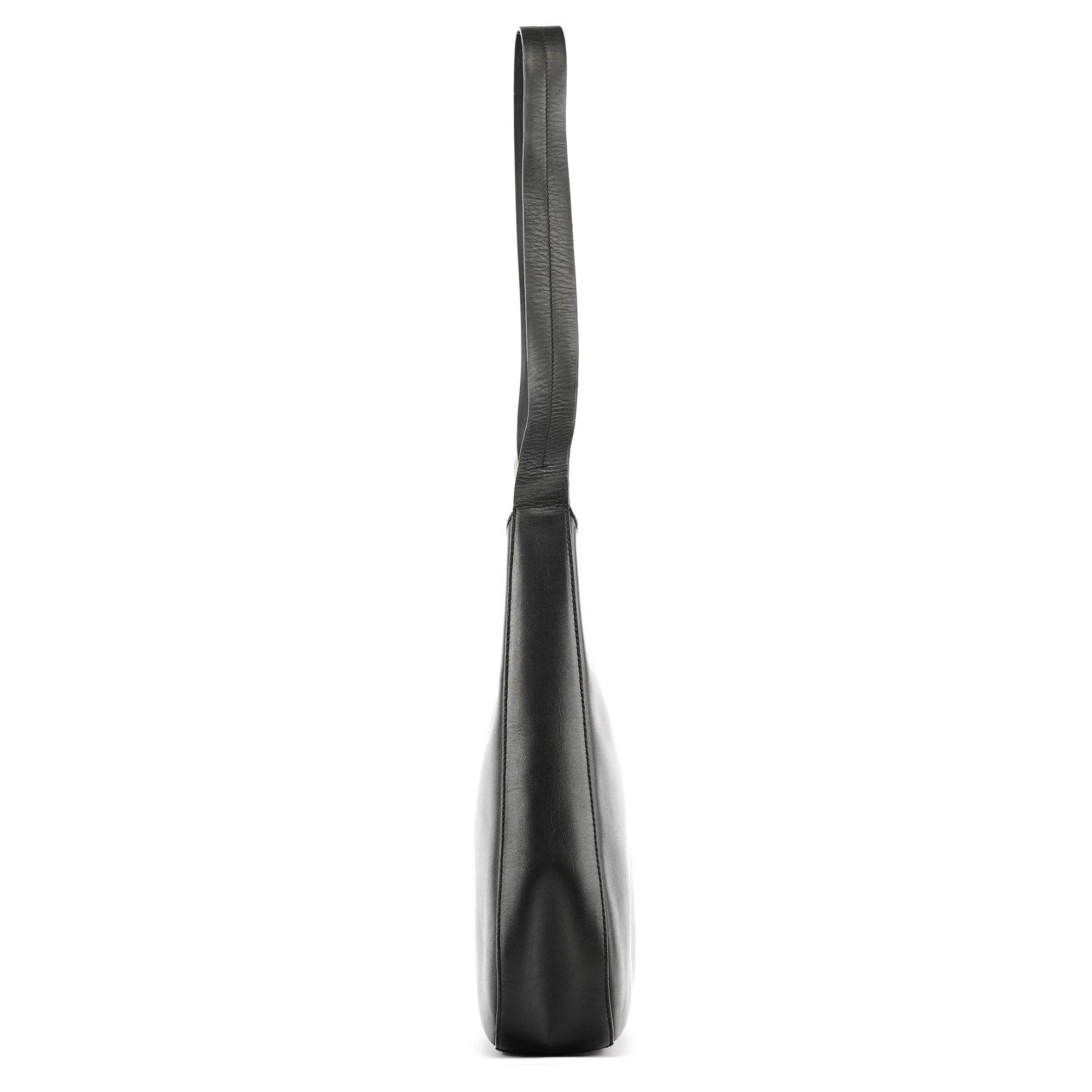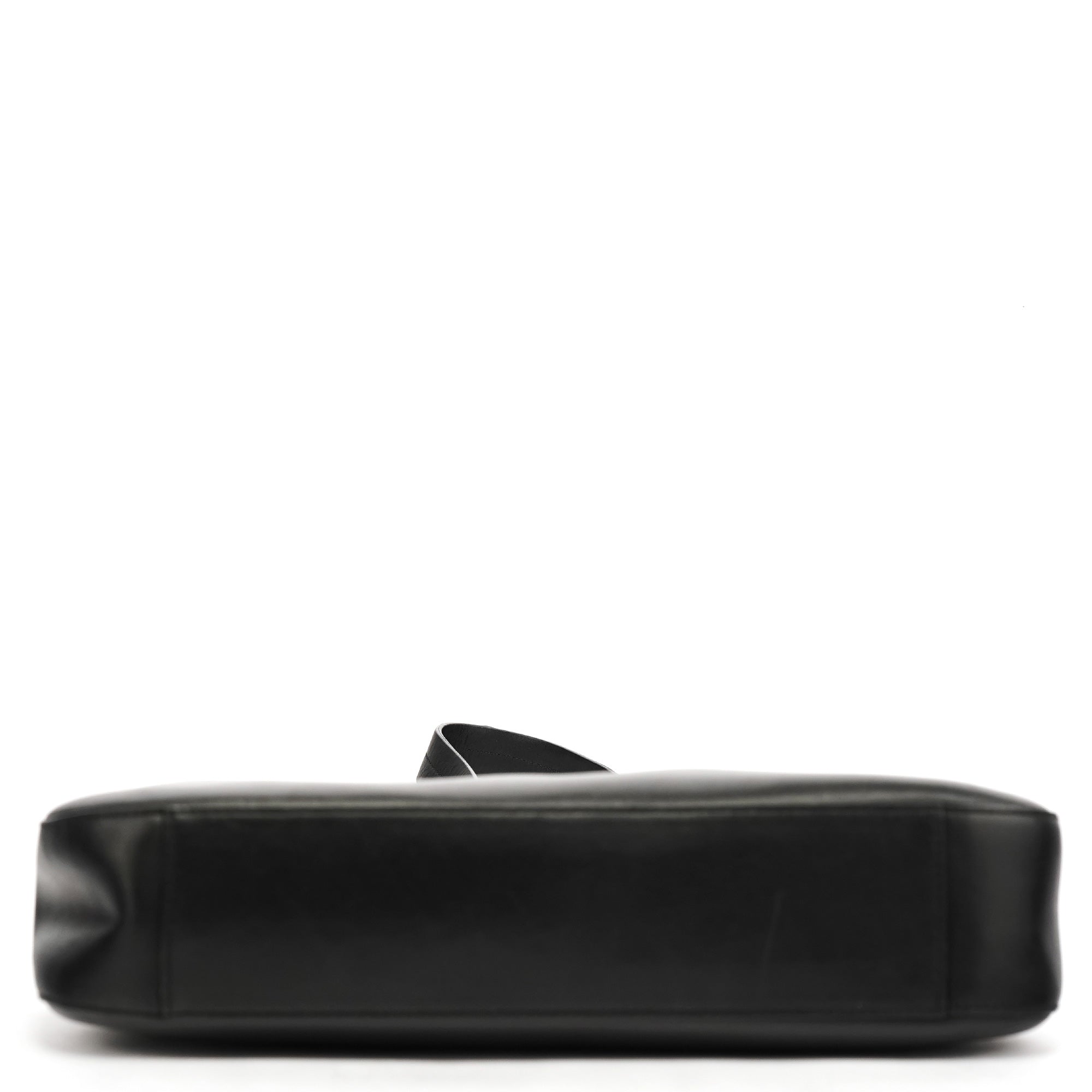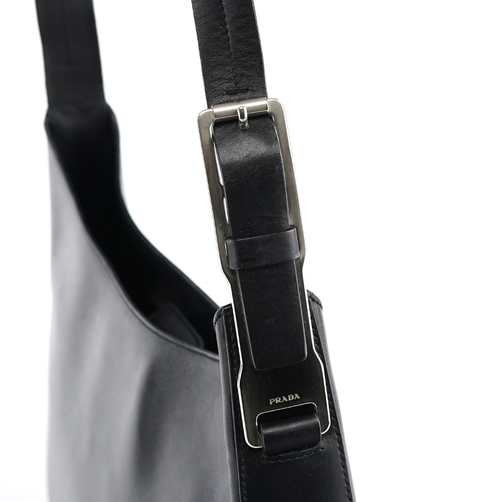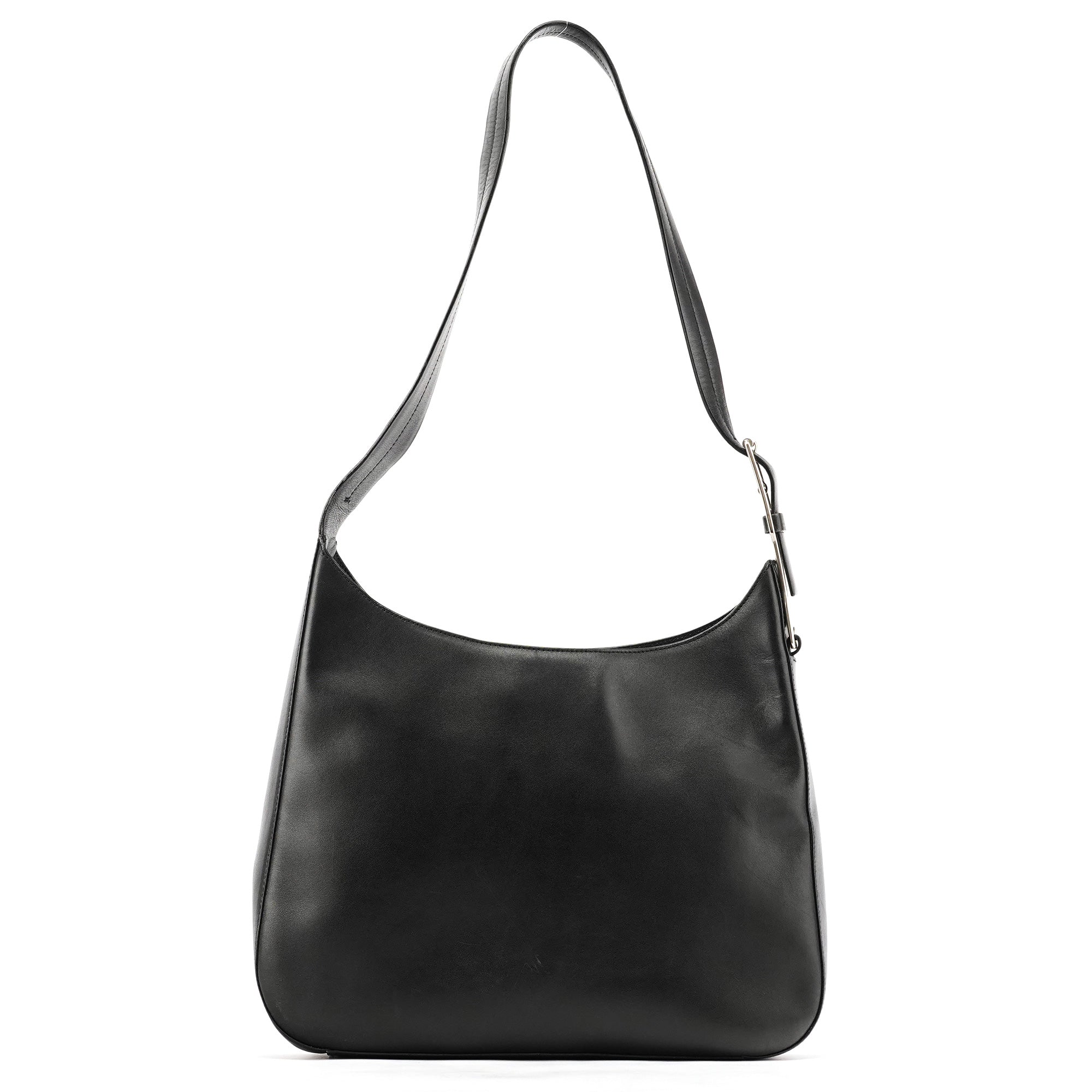 Designed in 1998 by Miuccia Prada, this Vitello Metal shoulder bag is crafted in smooth black leather and defined by its curved minimalist silhouette. The design features a wide leather strap anchored by sculptural silver-tone hardware, with a velcro-top closure and a logo-jacquard lined interior with interior zipper pocket.