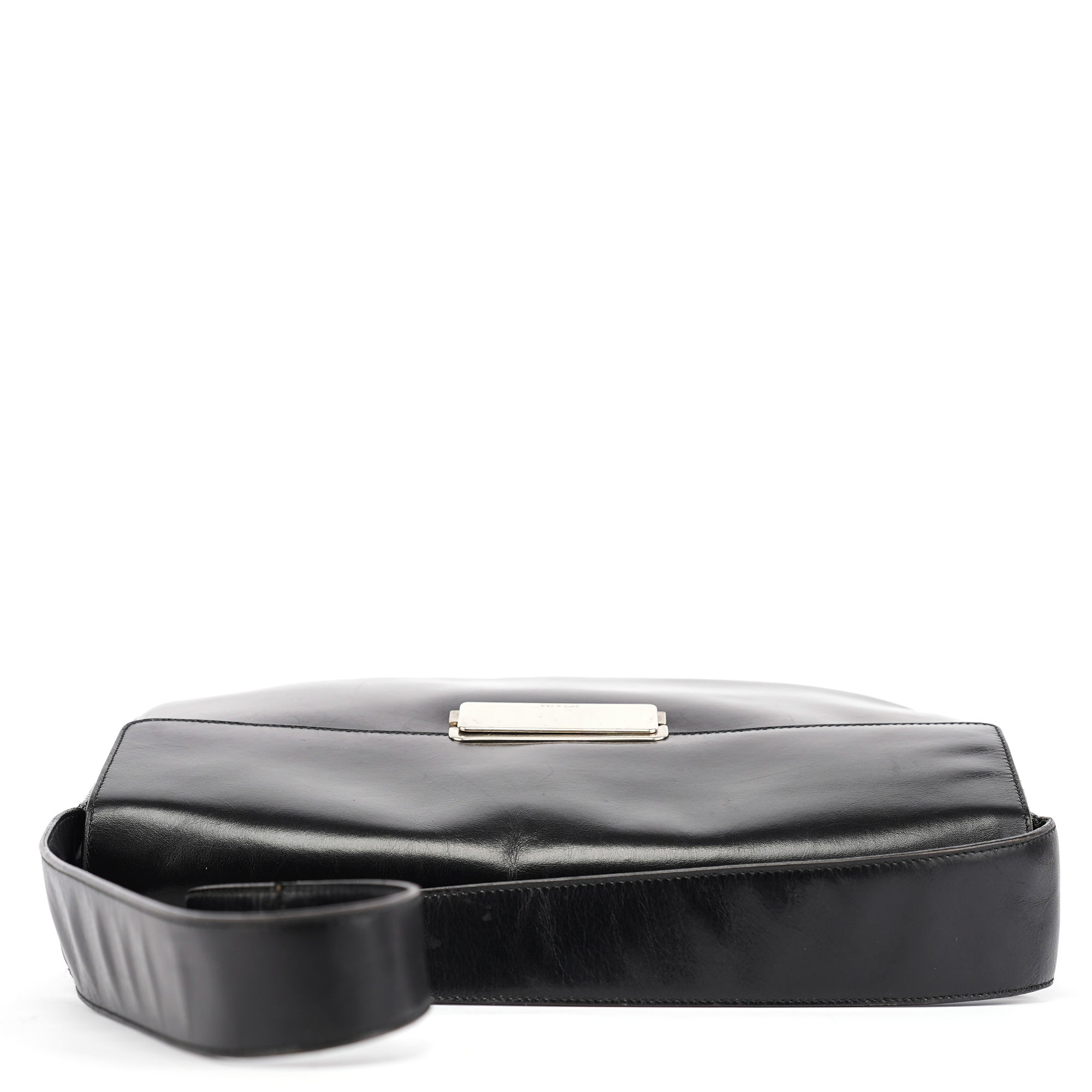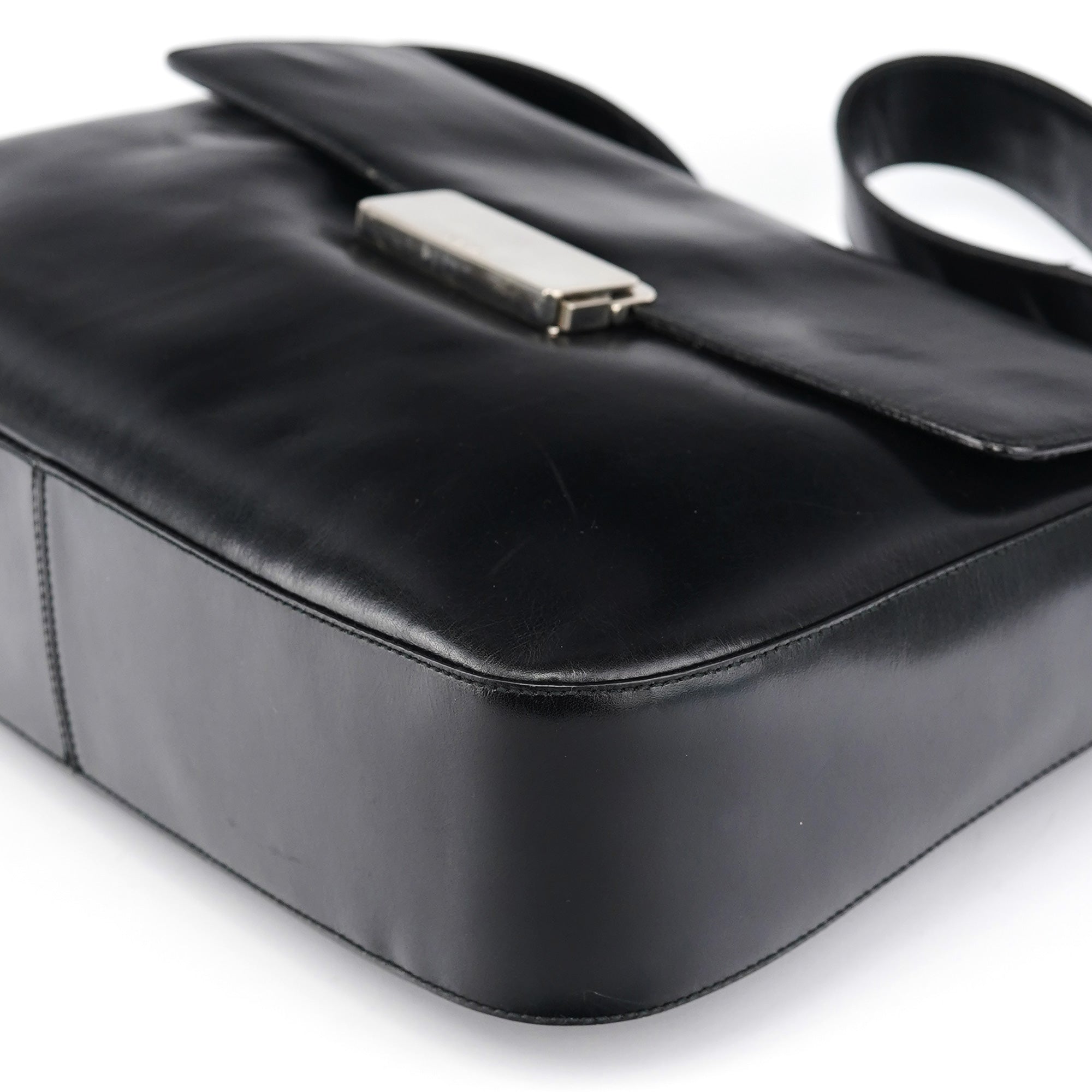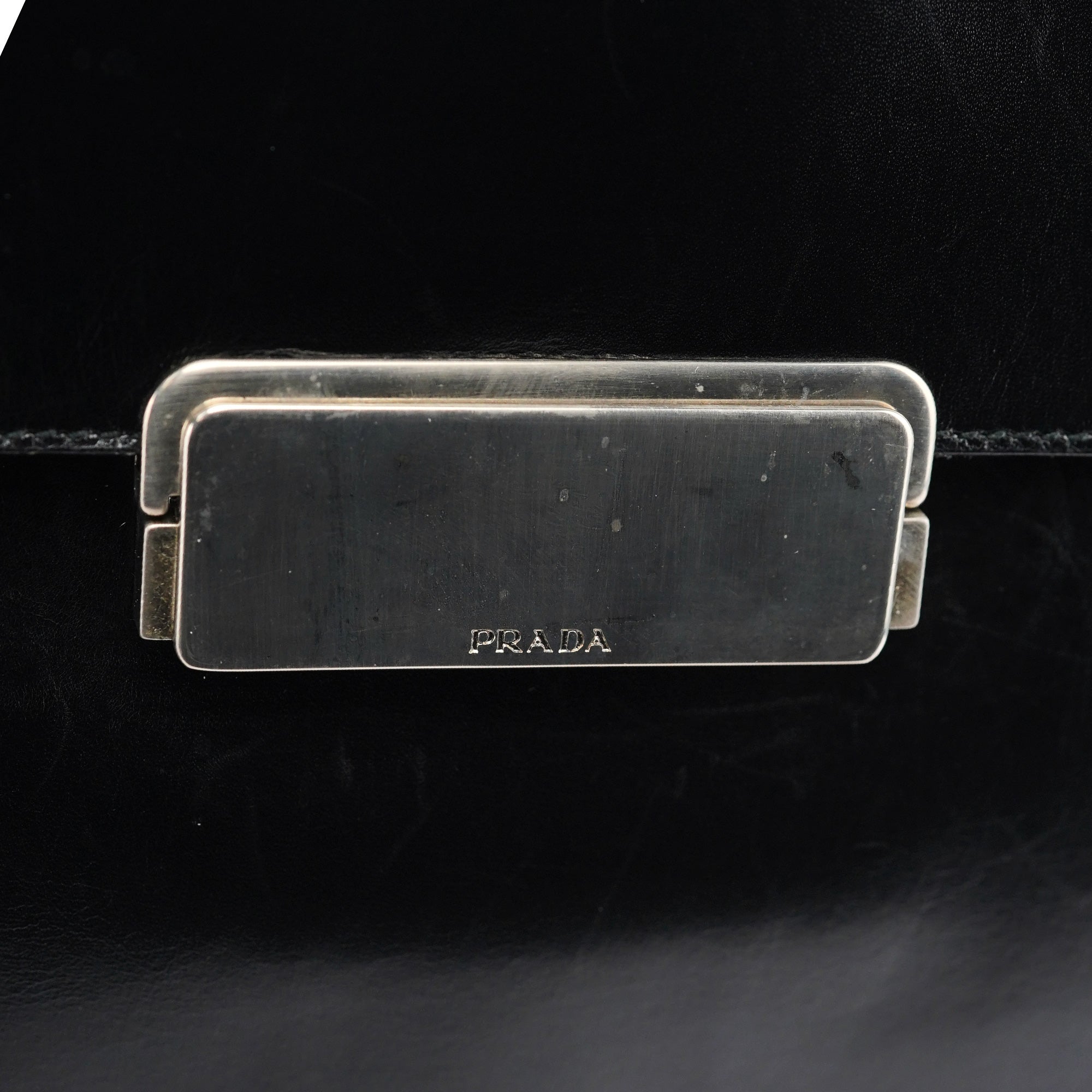 Designed in the late 1990's by Miuccia Prada, this vintage Prada Vitello shoulder bag features brown calfskin leather construction with a sleek, structured silhouette. A rectangular metal plate with buckle detail secures the front flap, while a single shoulder strap offers comfortable wear. The interior is lined with fabric and includes an interior zipper pocket.