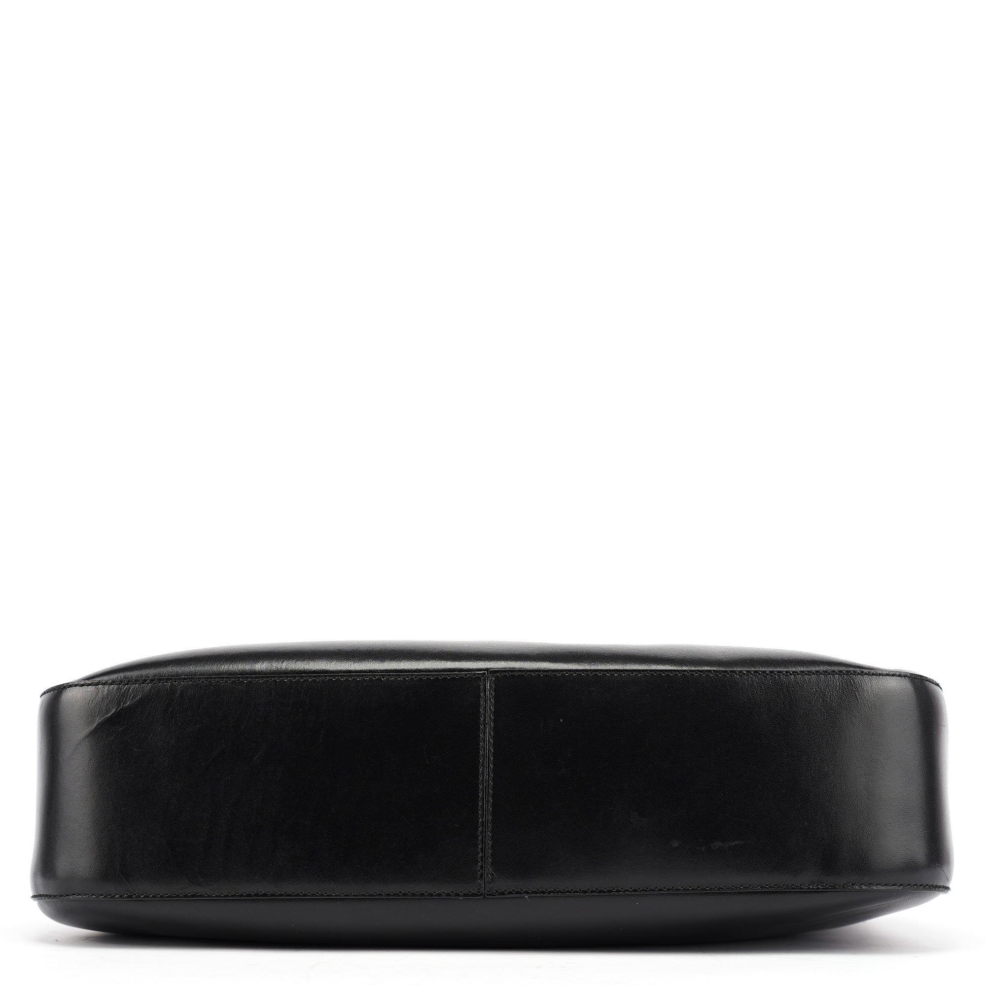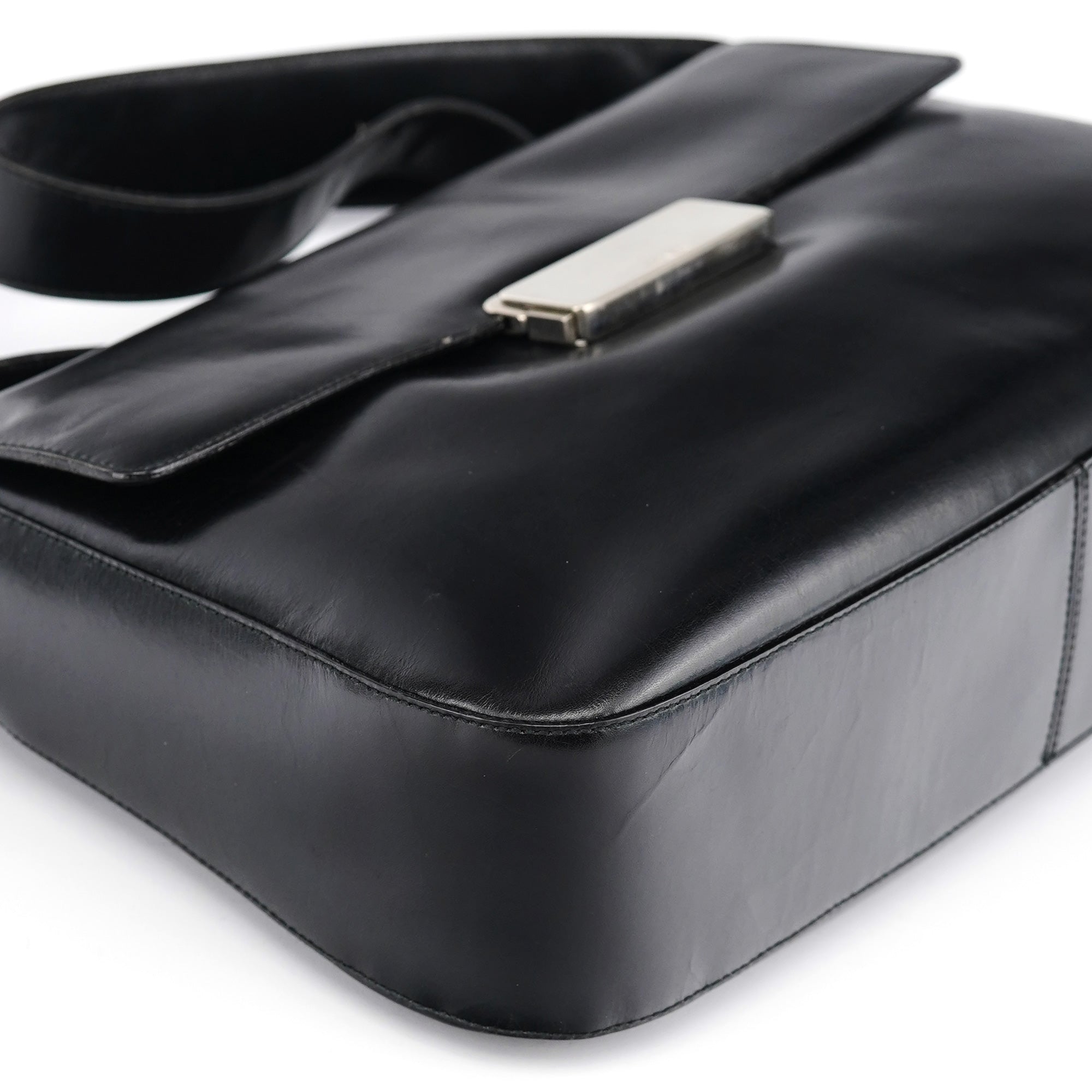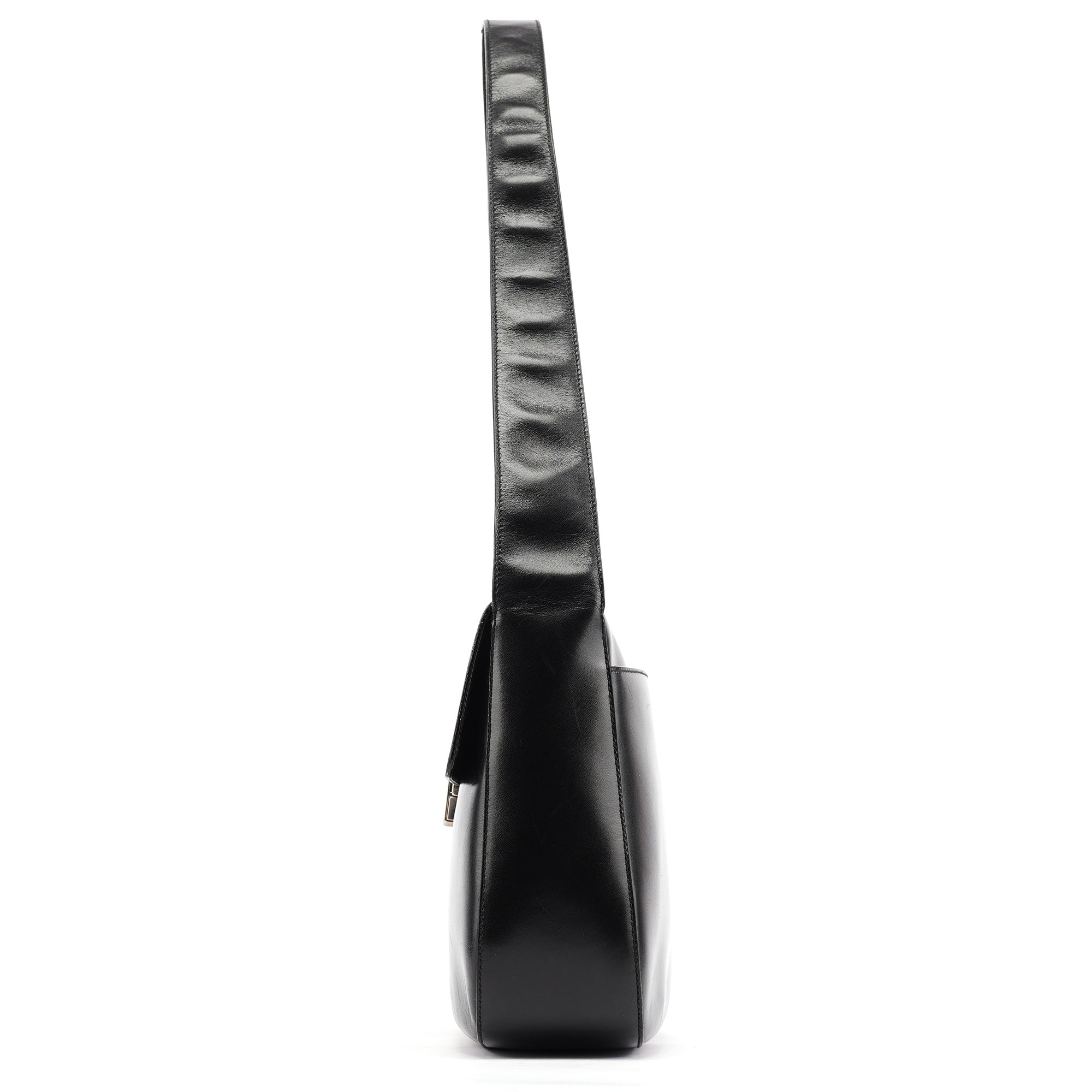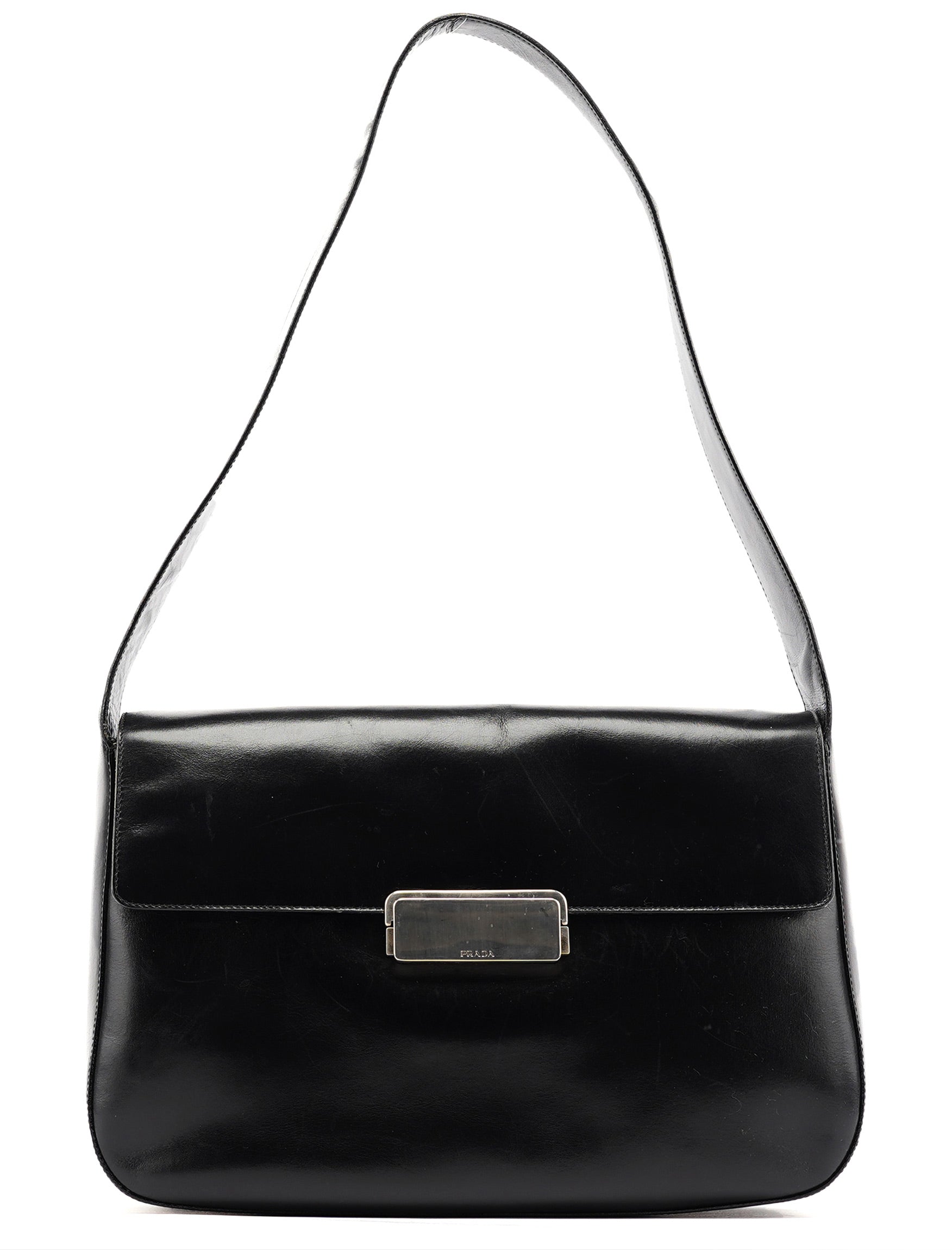 Designed in the late 1990's by Miuccia Prada, this vintage Prada Vitello shoulder bag features brown calfskin leather construction with a sleek, structured silhouette. A rectangular metal plate with buckle detail secures the front flap, while a single shoulder strap offers comfortable wear. The interior is lined with fabric and includes an interior zipper pocket.