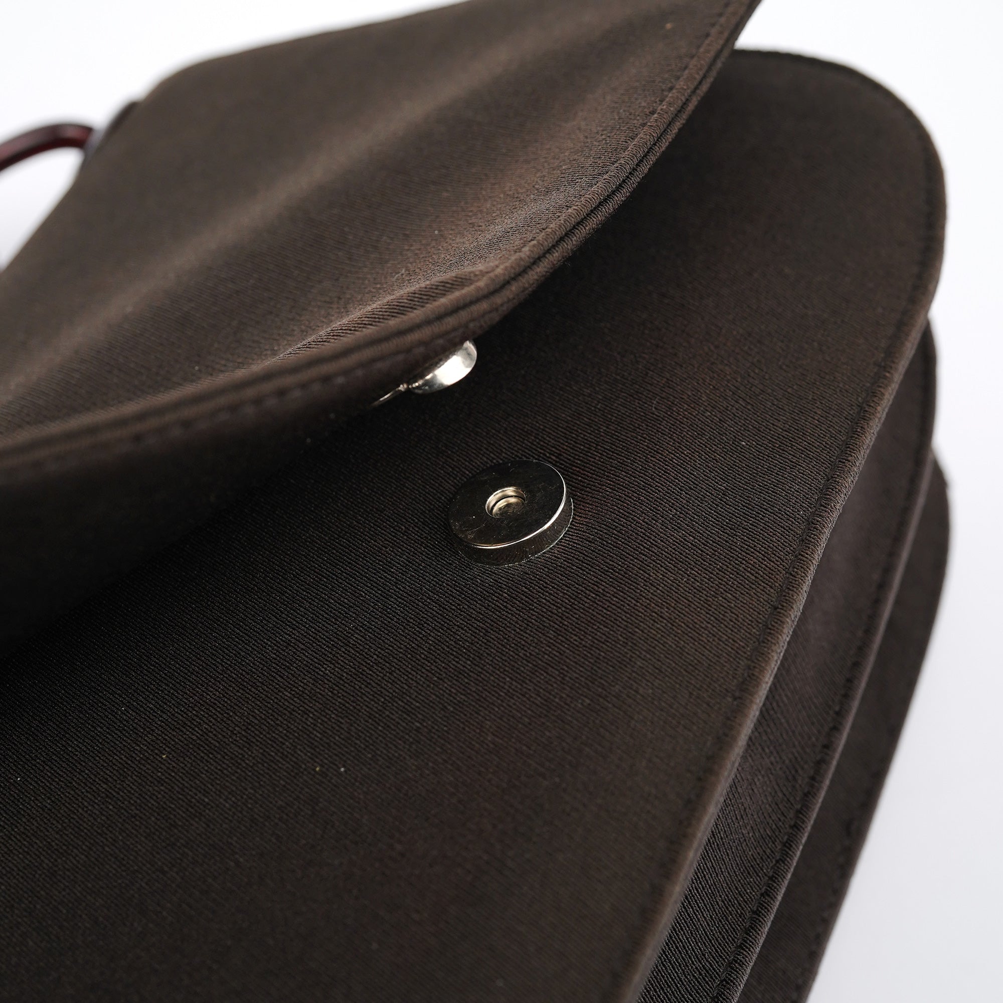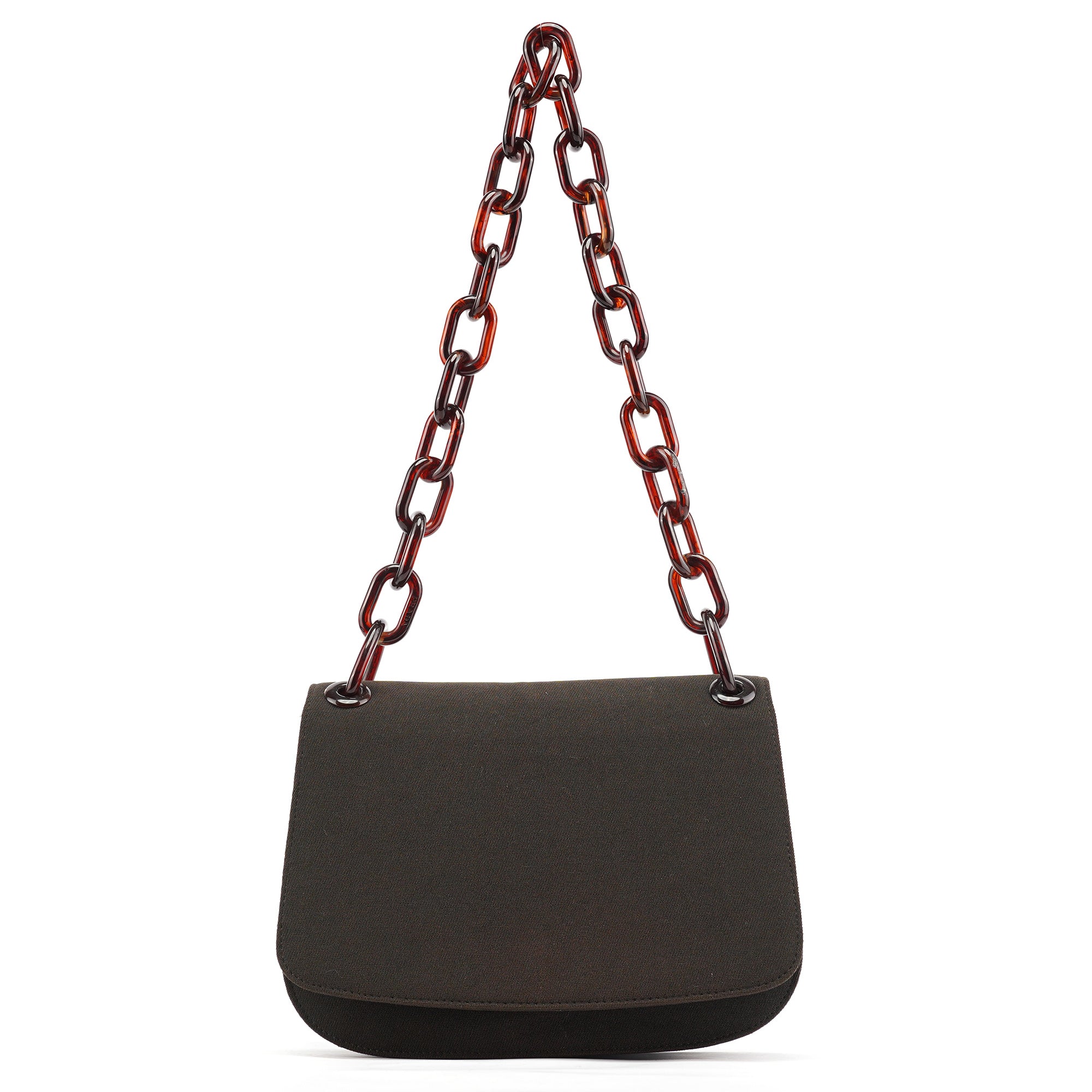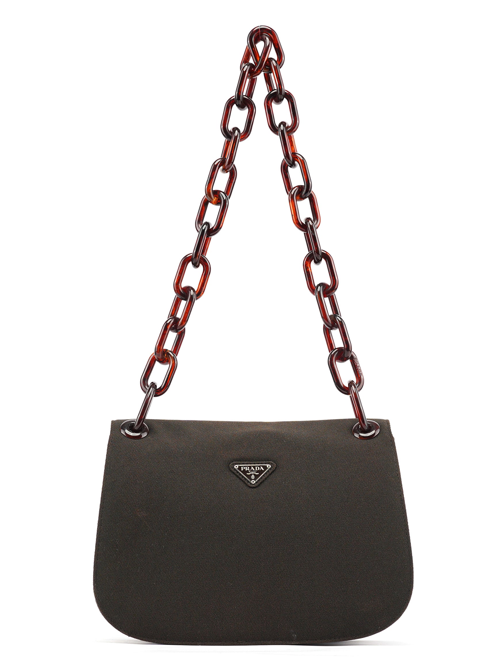 Designed in 1996 by Miuccia Prada, this vintage Prada Tessuto Swing shoulder bag features the brand's signature brown nylon tessuto fabric with contrasting tortoiseshell-effect resin chain straps. The compact silhouette showcases the iconic triangular Prada logo plaque in silver-tone metal, with a streamlined design and Prada-monogrammed interior lining.