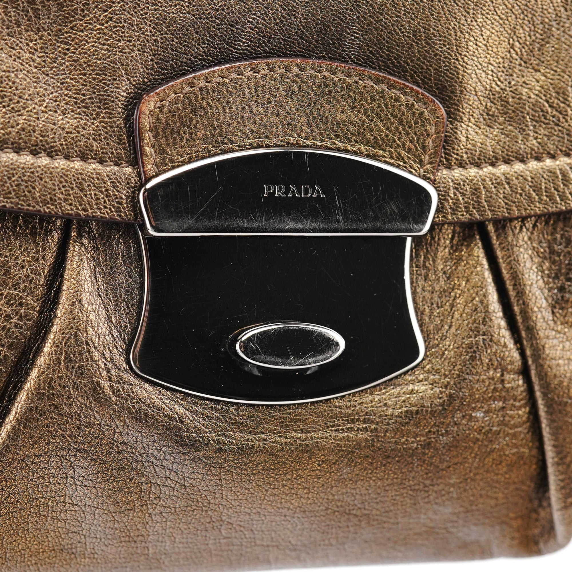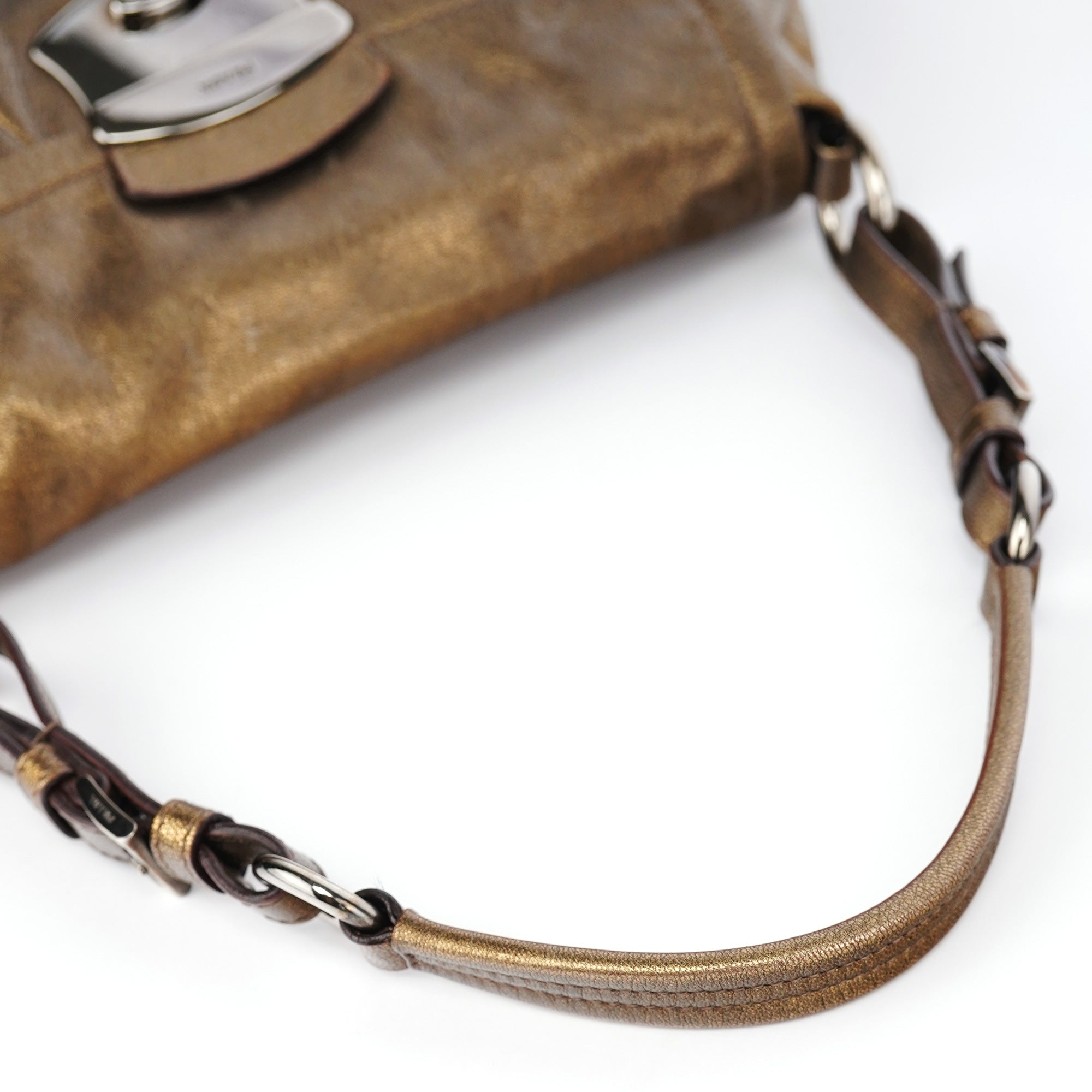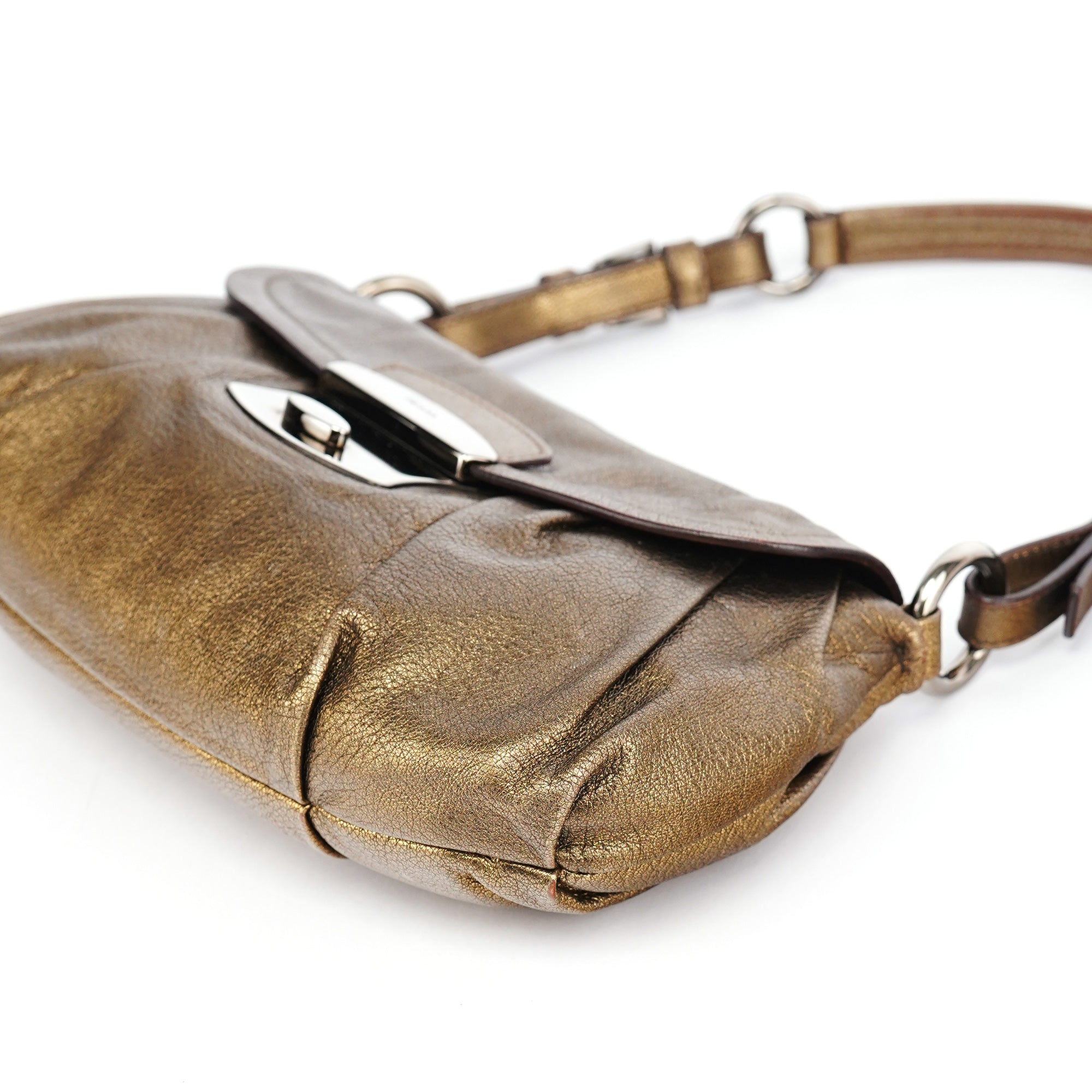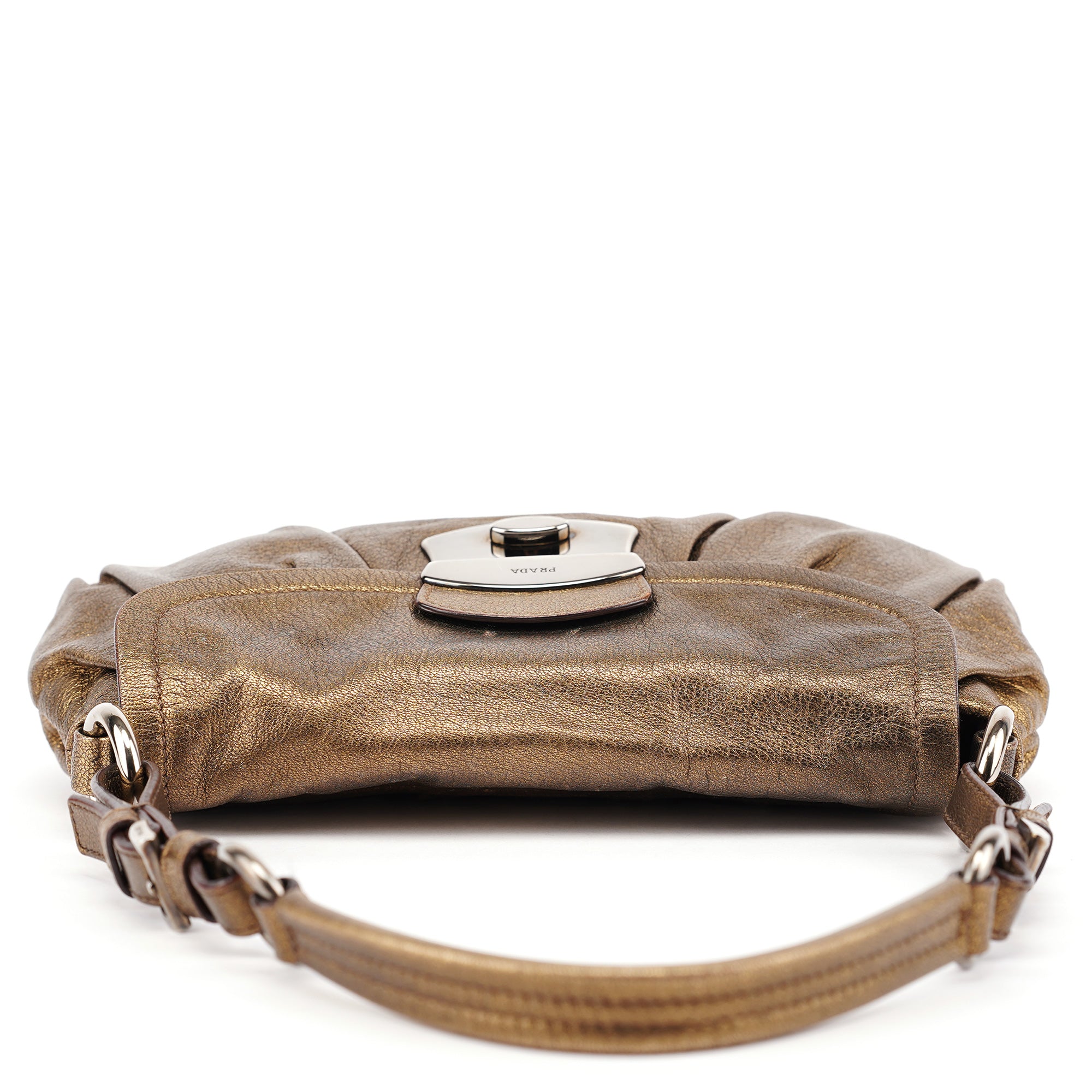 Designed in the early 2000s by Miuccia Prada, this Prada shoulder bag is crafted in soft metallic gold leather with a structured silhouette and wide flap closure. It features a silver-tone push-lock clasp engraved with the Prada logo and an adjustable shoulder strap with buckle detailing. The interior is lined in pink fabric and includes a zip pocket.