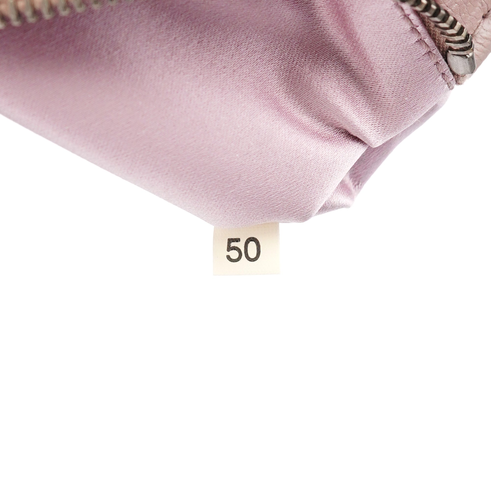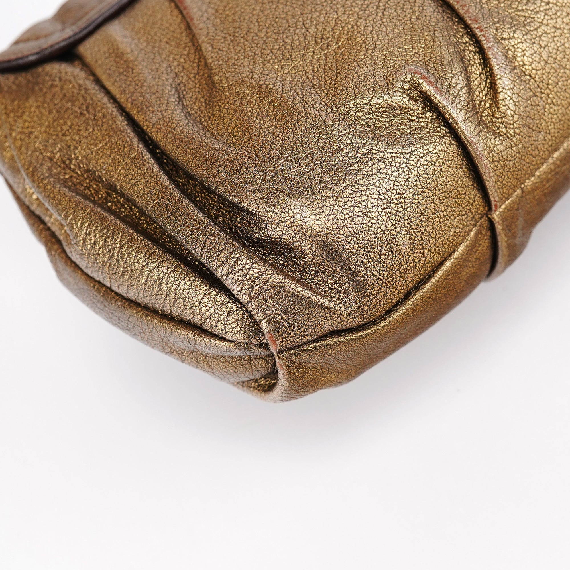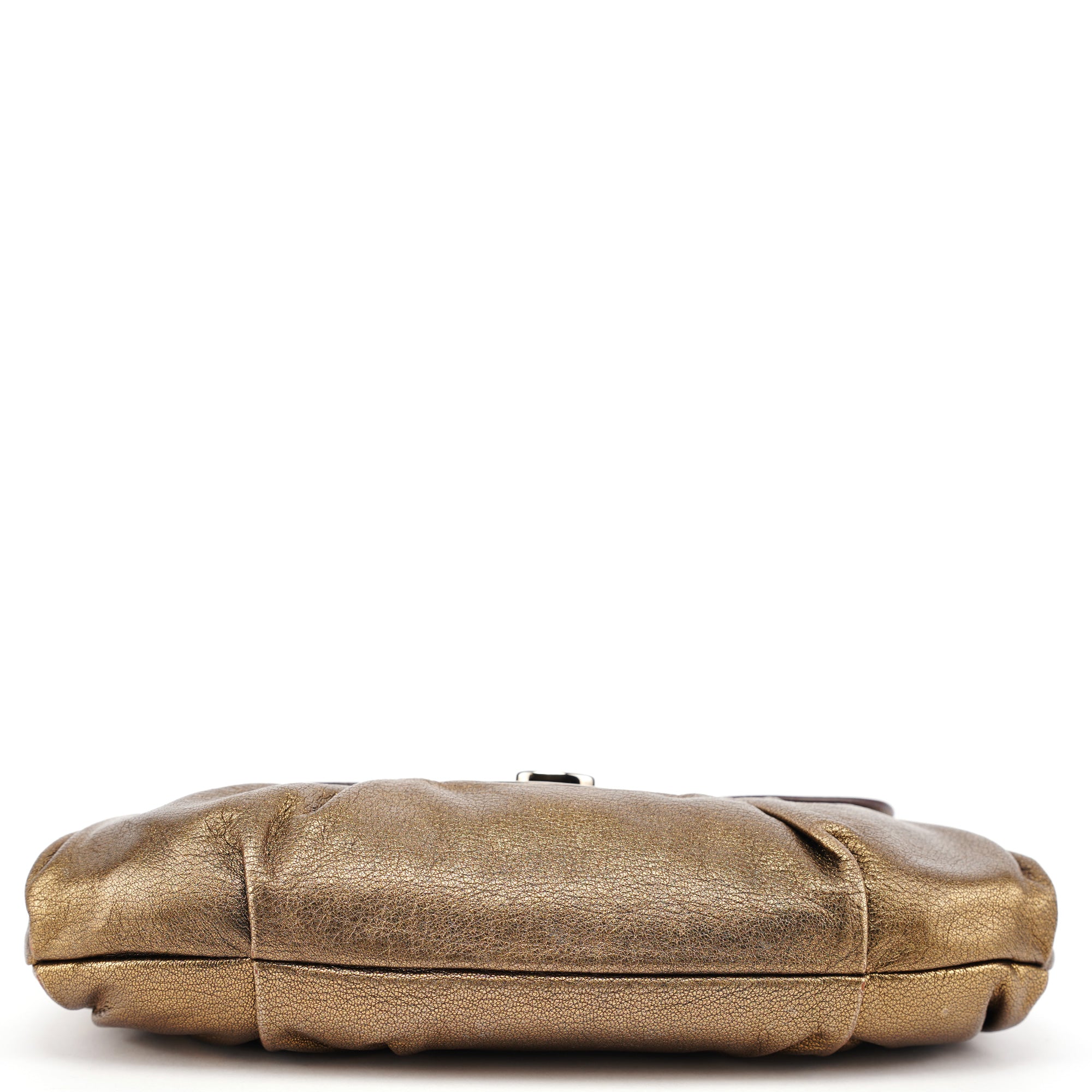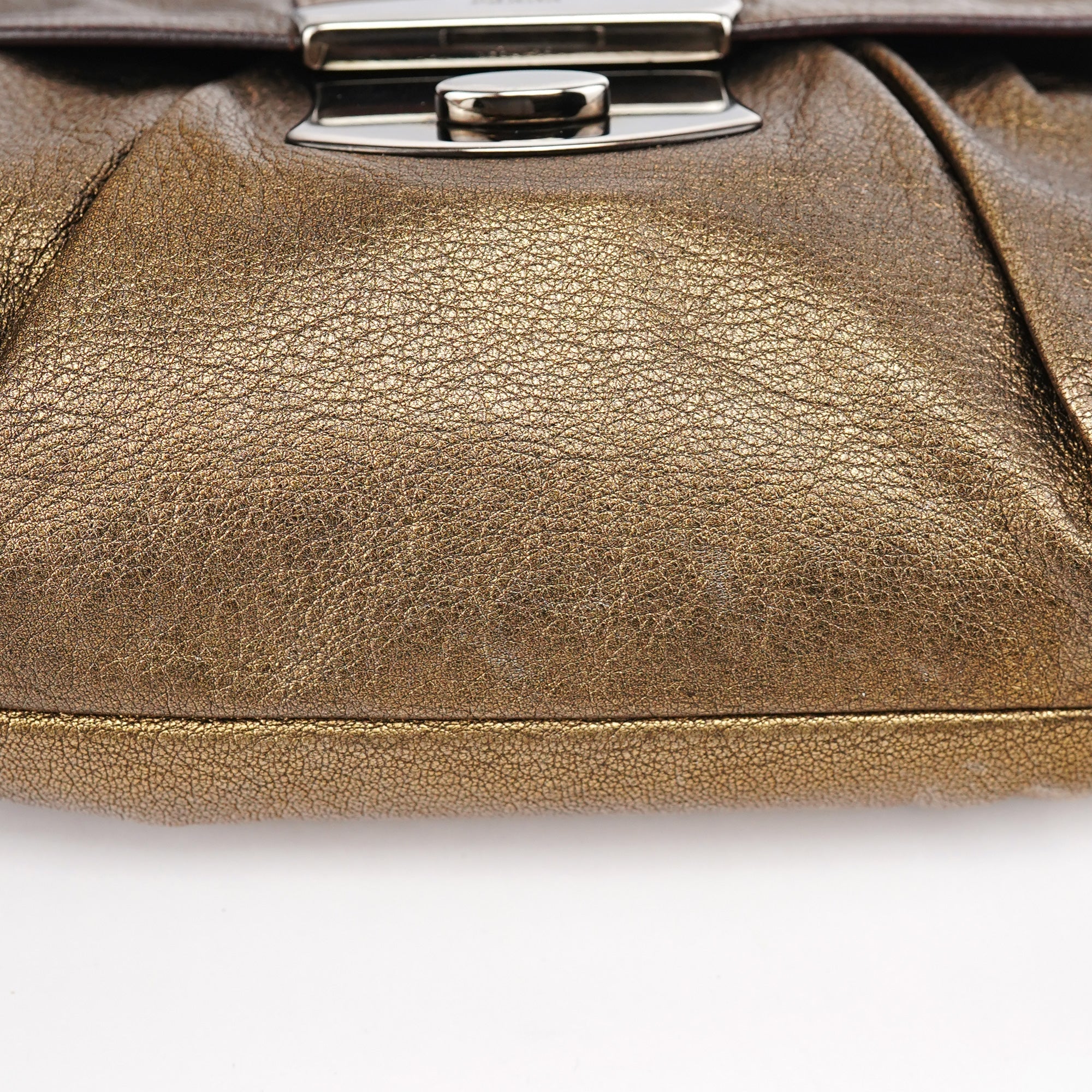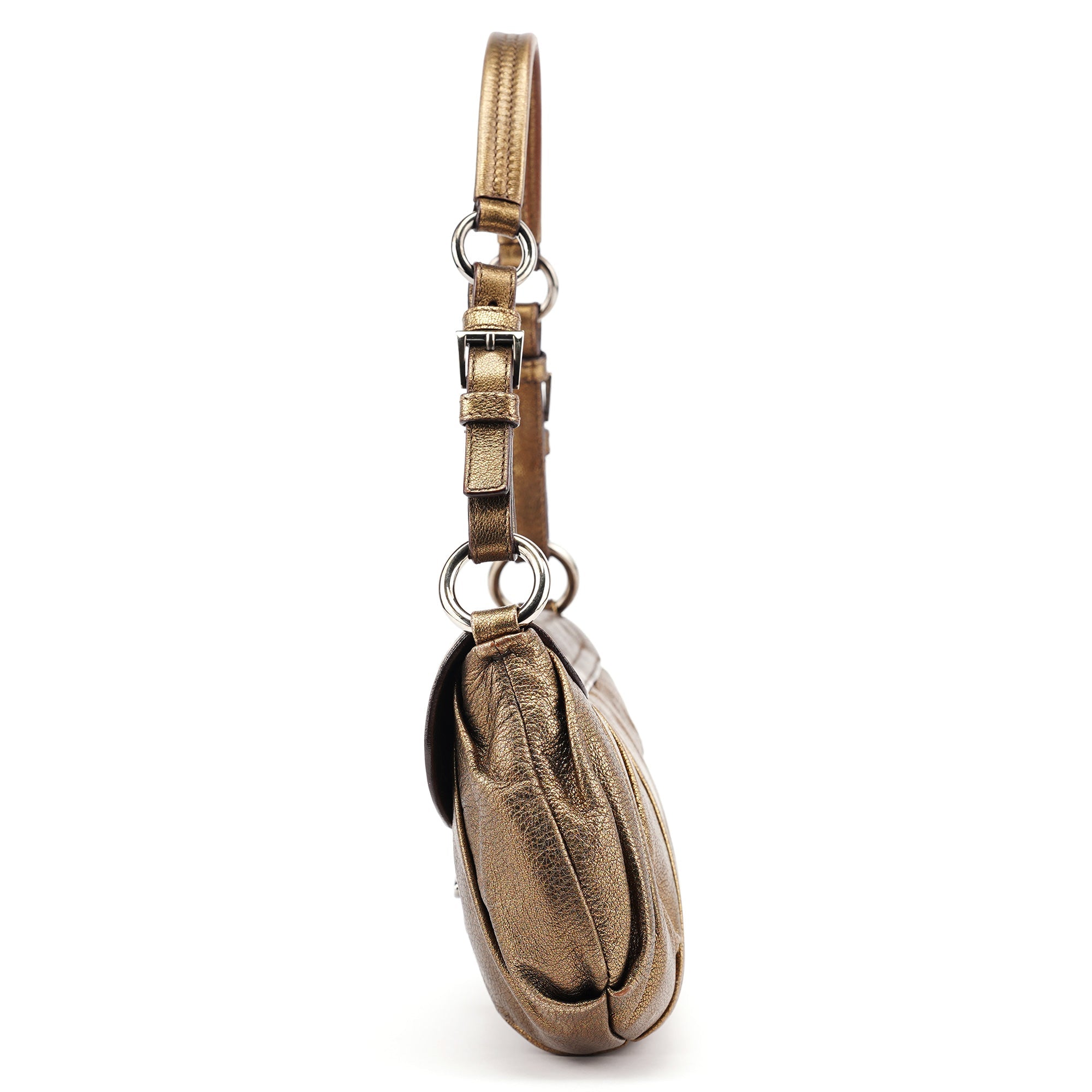 Designed in the early 2000s by Miuccia Prada, this Prada shoulder bag is crafted in soft metallic gold leather with a structured silhouette and wide flap closure. It features a silver-tone push-lock clasp engraved with the Prada logo and an adjustable shoulder strap with buckle detailing. The interior is lined in pink fabric and includes a zip pocket.