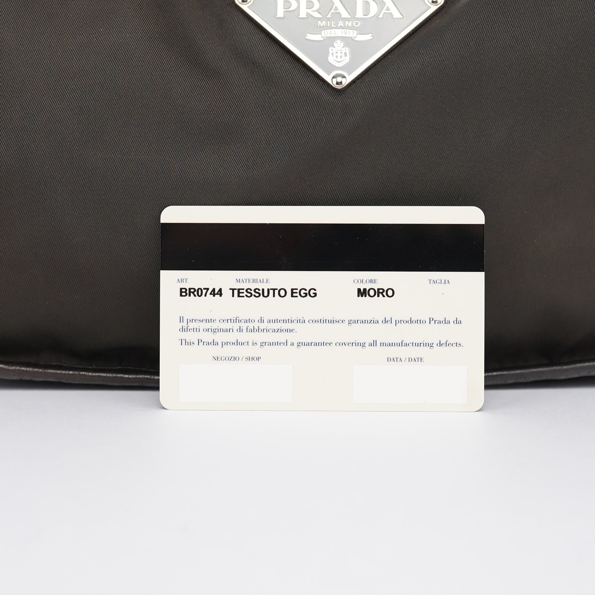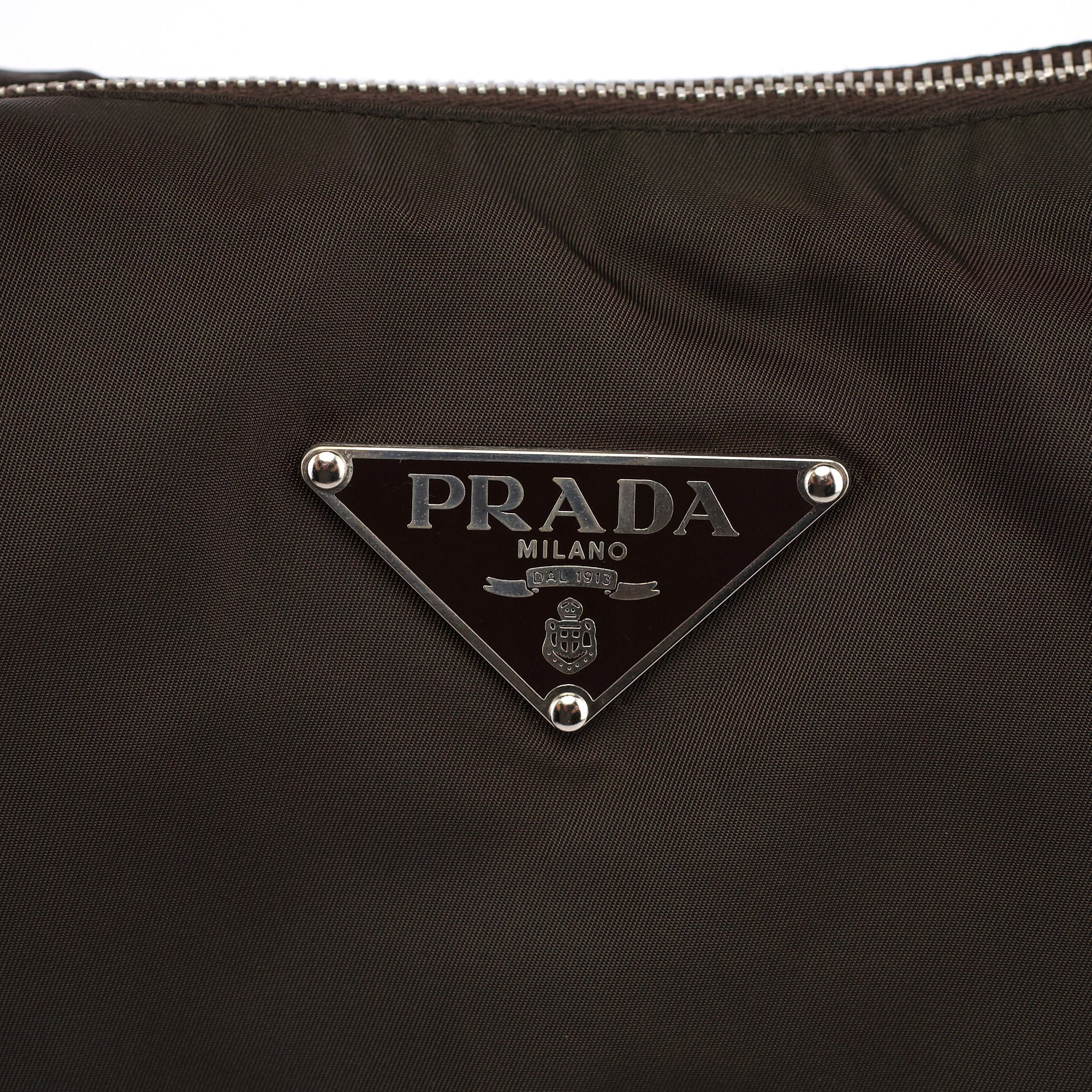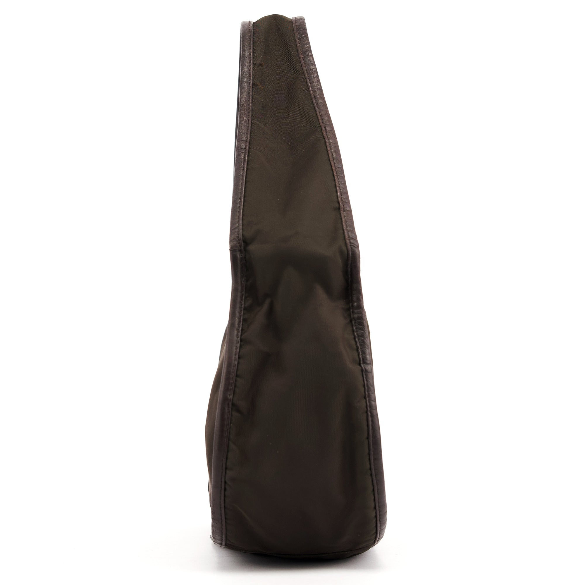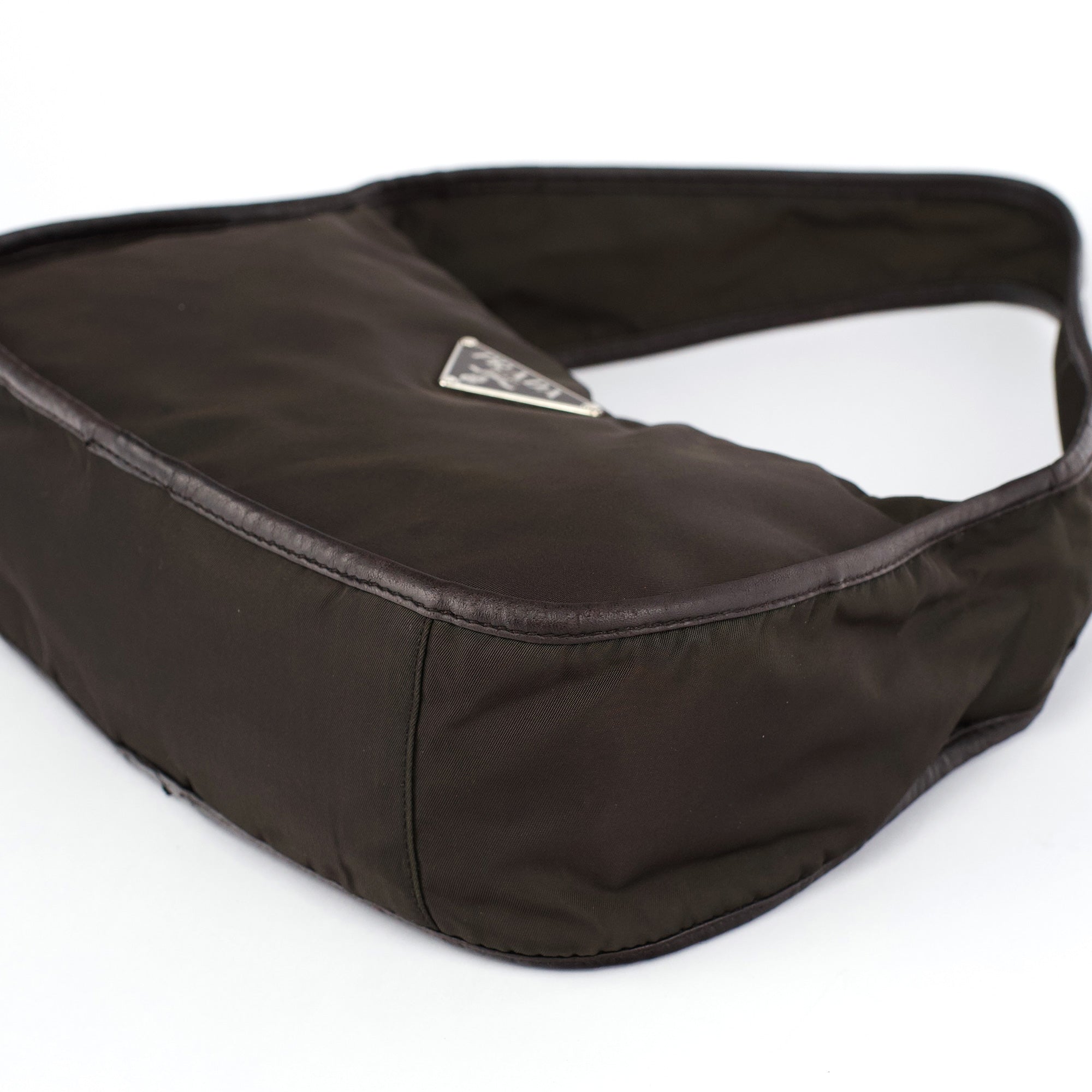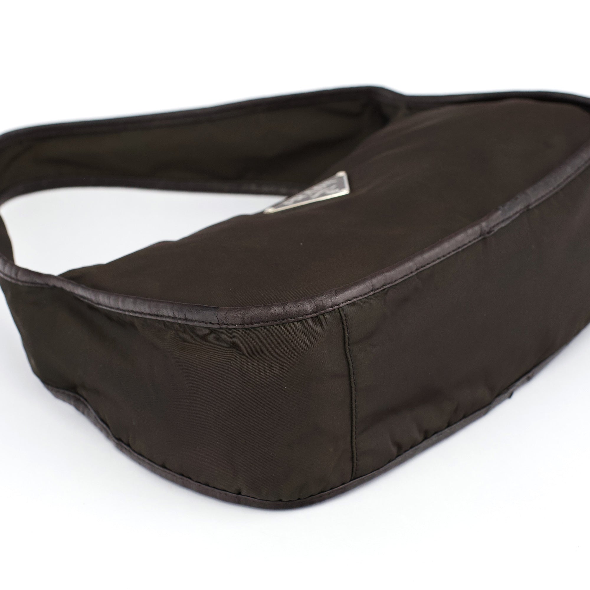 Designed in the early 2000s by Miuccia Prada, this Prada Tessuto Egg shoulder bag is crafted from military green Tessuto nylon with a classic hobo silhouette. It features a soft curved shape with a top zip closure, tonal stitching, and the iconic enamel triangle logo plaque at the front. The slim shoulder strap is made of matching nylon, and the interior is lined in signature logo jacquard with a zip pocket.