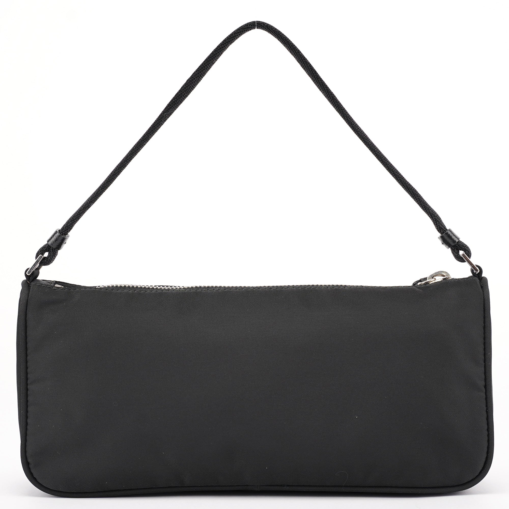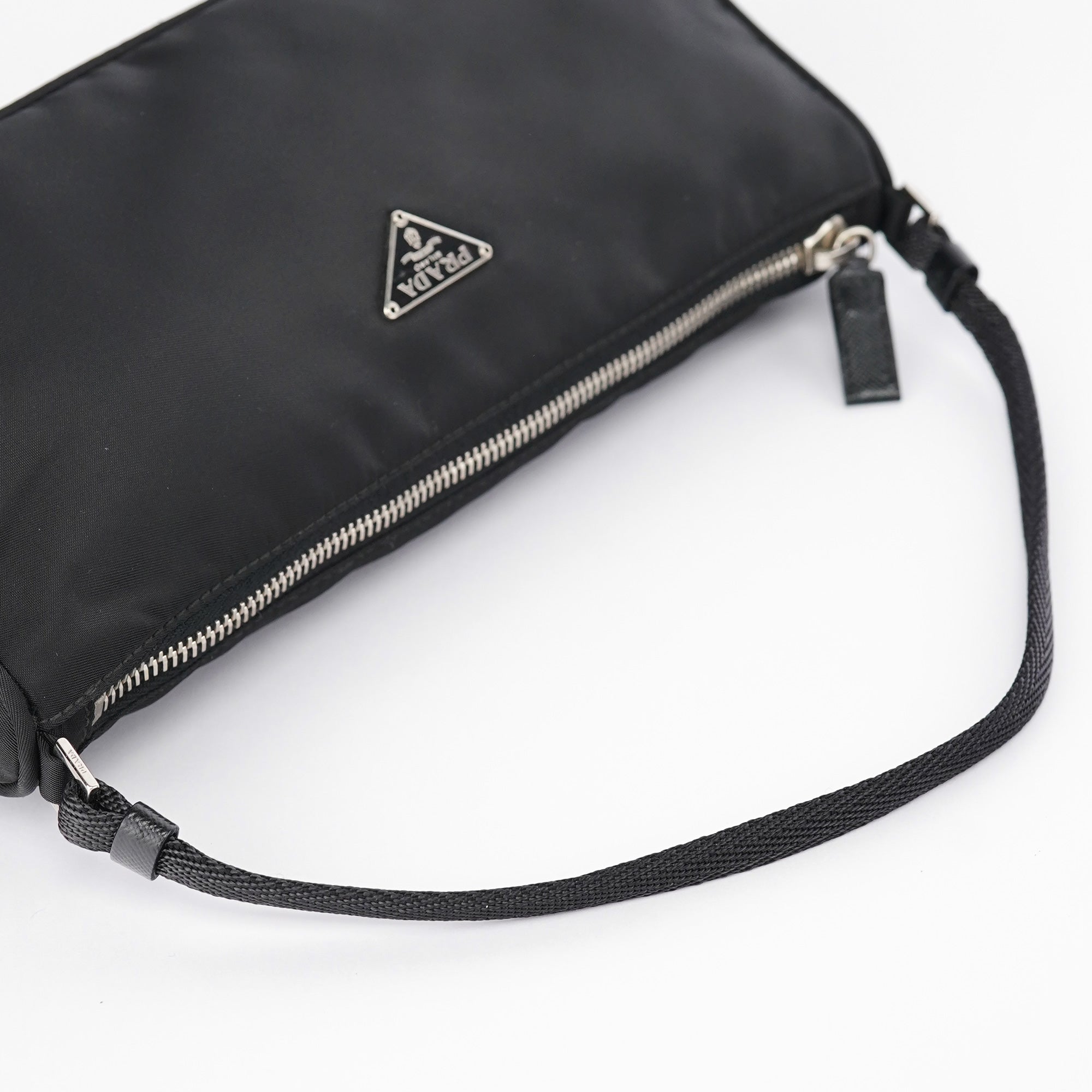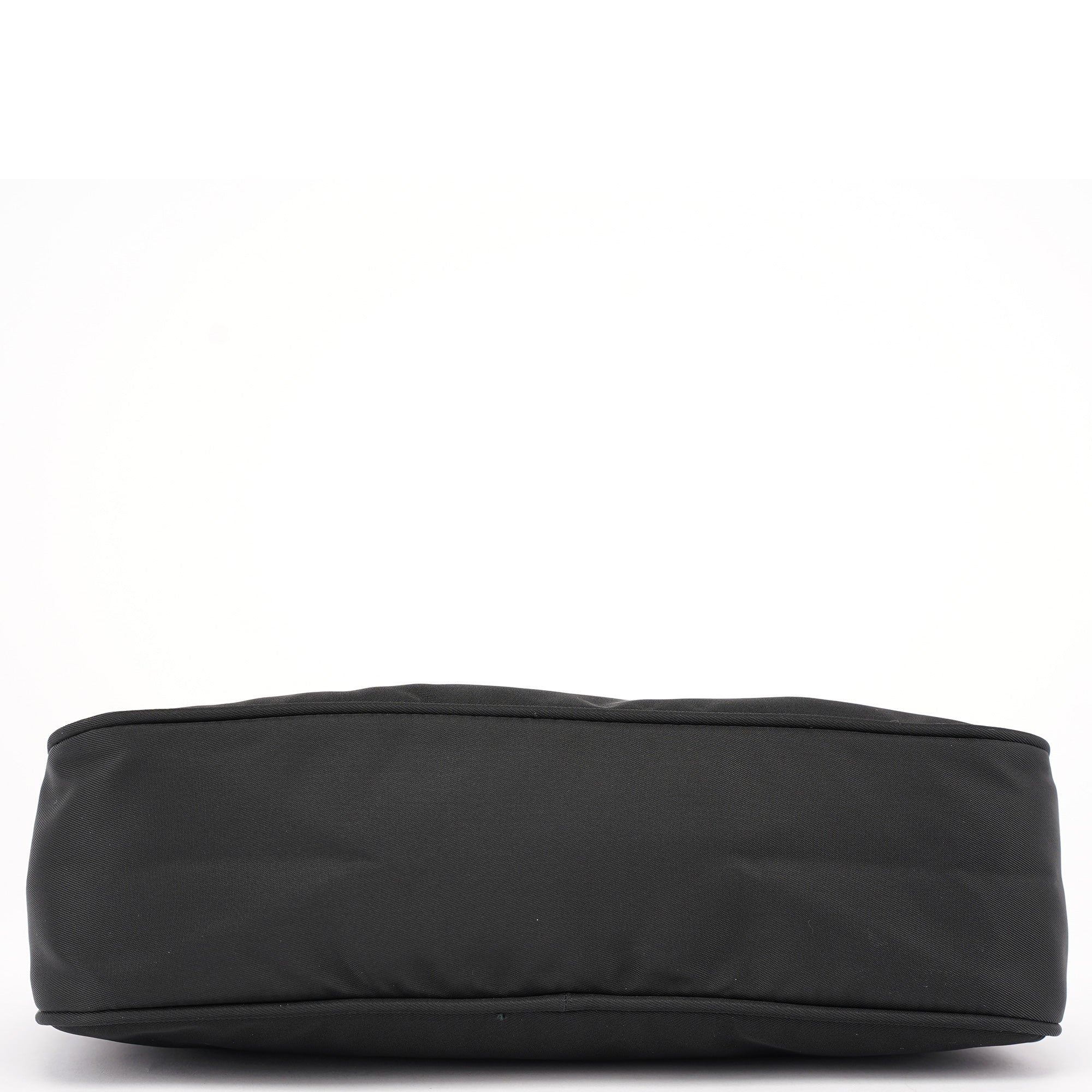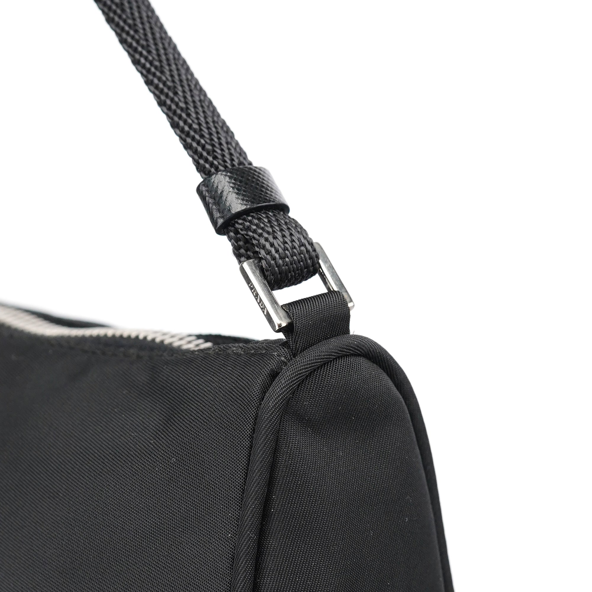 Designed in the late 1990s, this Prada Tessuto Mini Hobo bag is crafted from black nylon with a sleek rectangular silhouette and silver-tone triangular logo plaque. It features a single top strap, zip closure, and fabric-lined interior with one slip pocket. A minimalist archival style with timeless appeal.