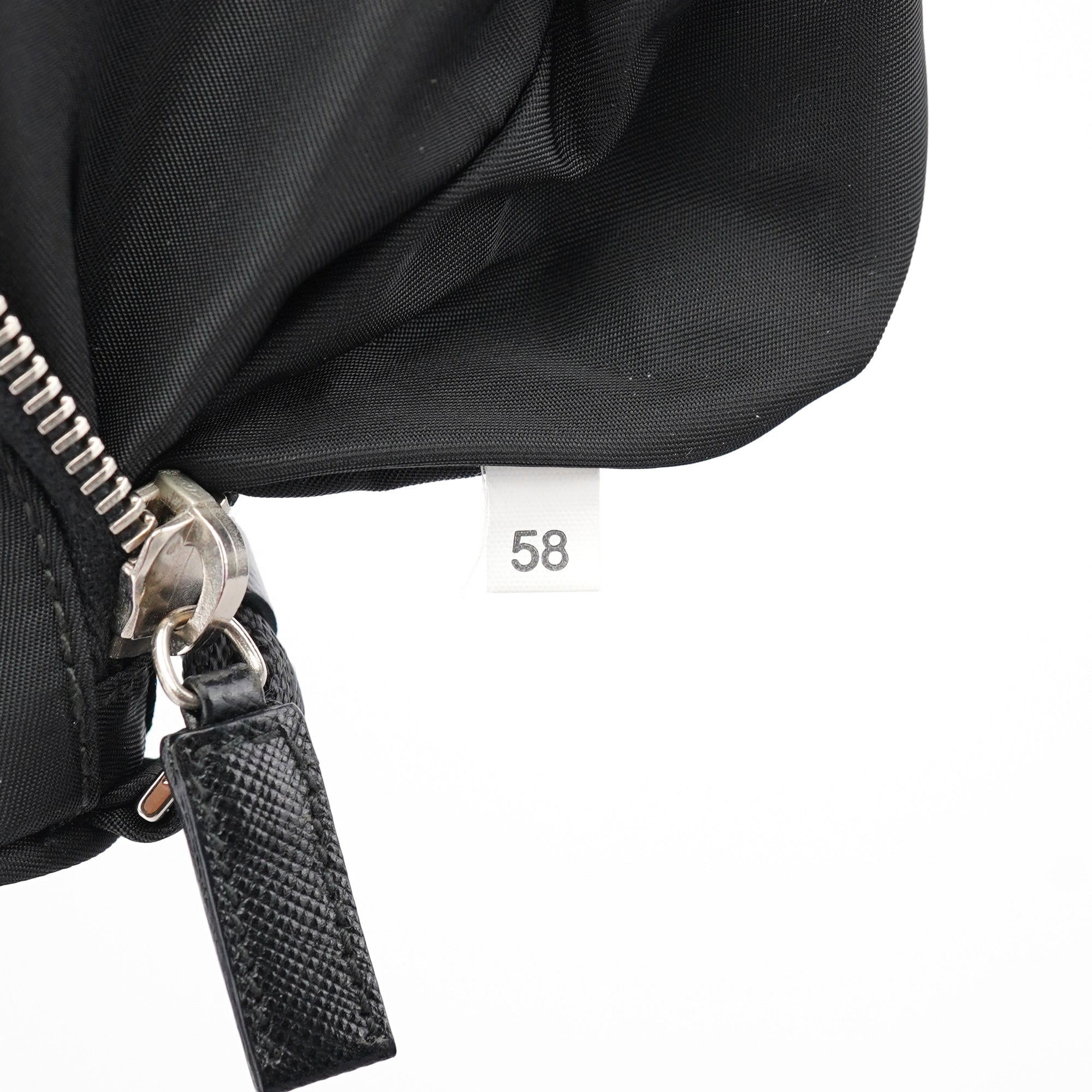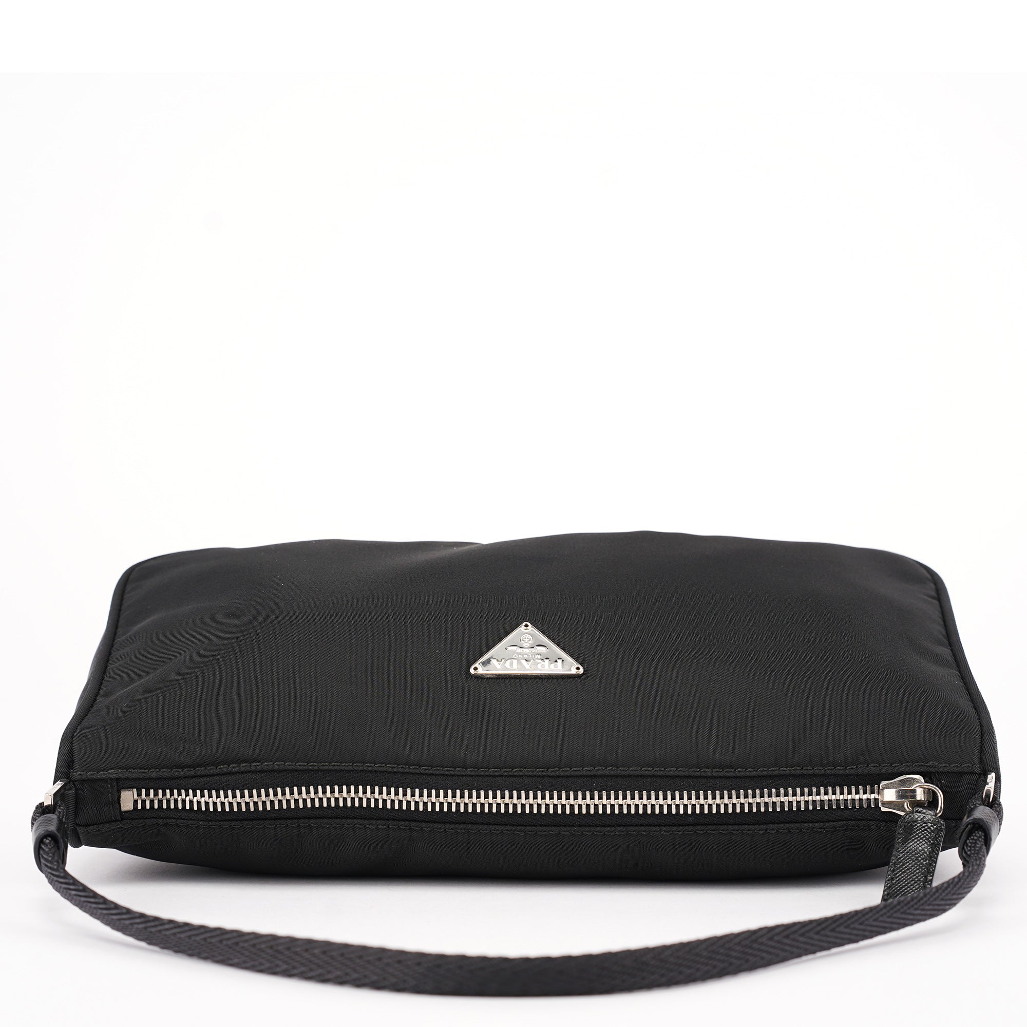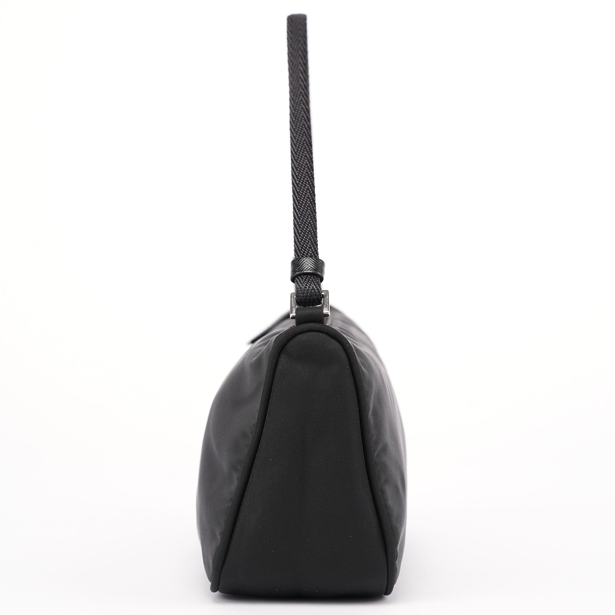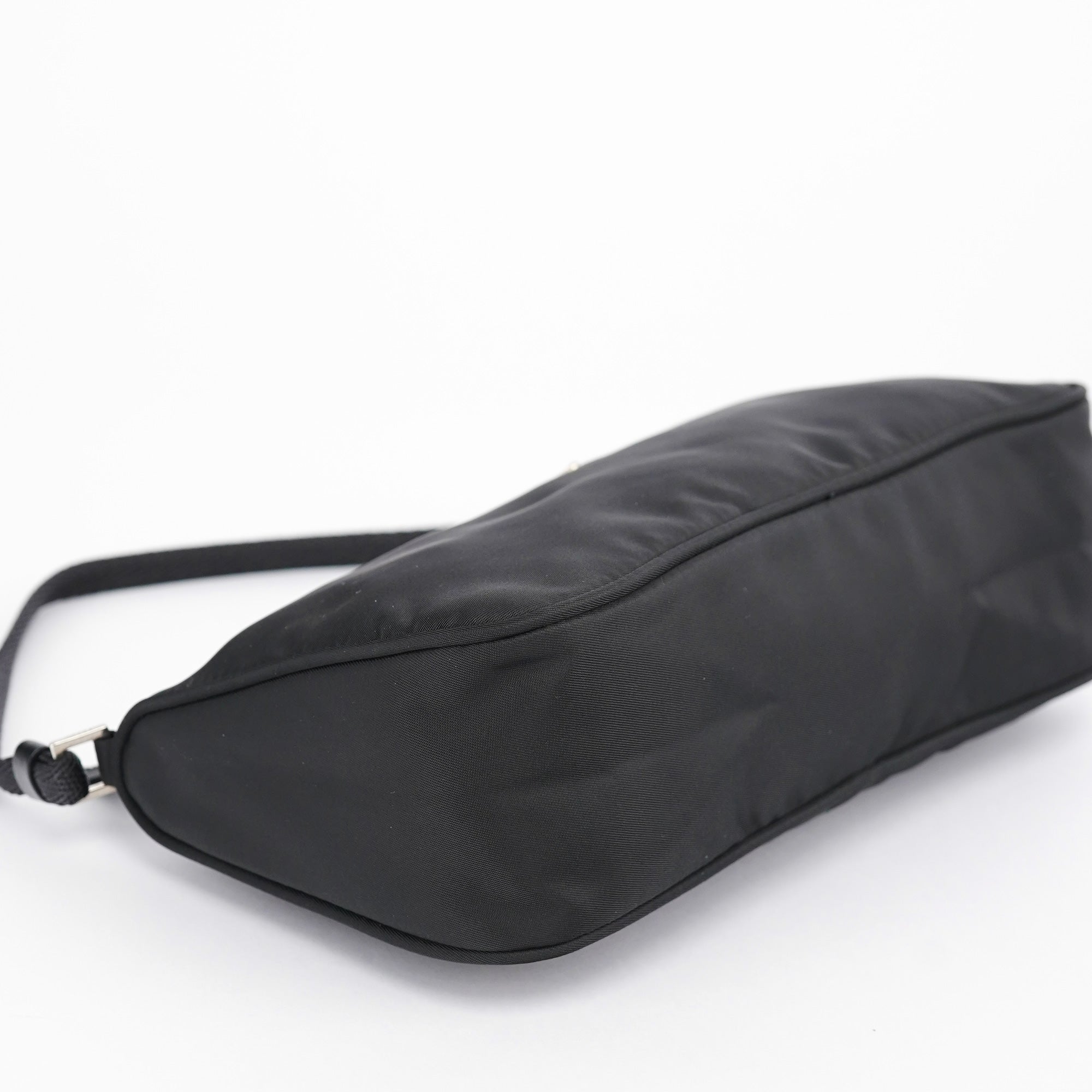 Designed in the late 1990s, this Prada Tessuto Mini Hobo bag is crafted from black nylon with a sleek rectangular silhouette and silver-tone triangular logo plaque. It features a single top strap, zip closure, and fabric-lined interior with one slip pocket. A minimalist archival style with timeless appeal.