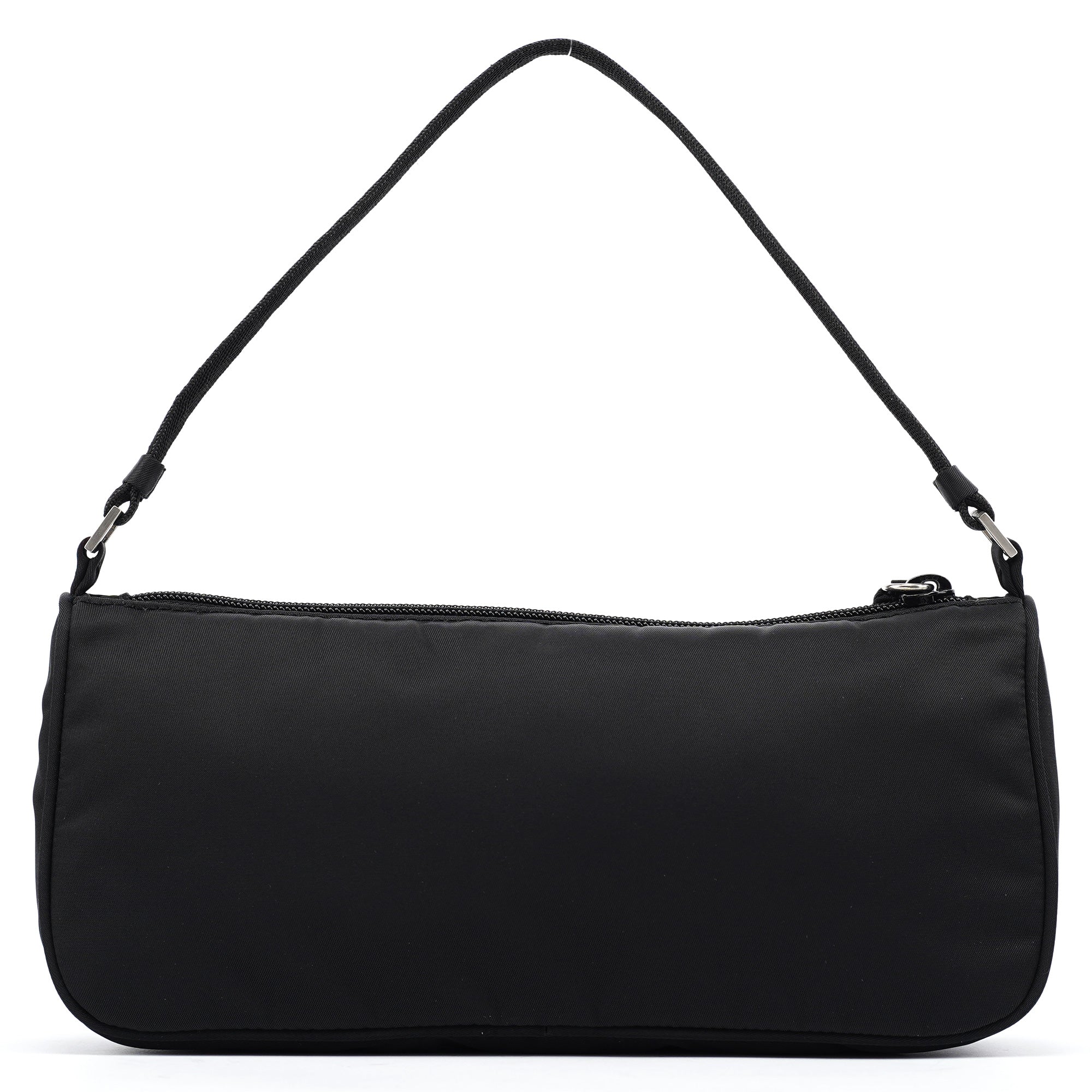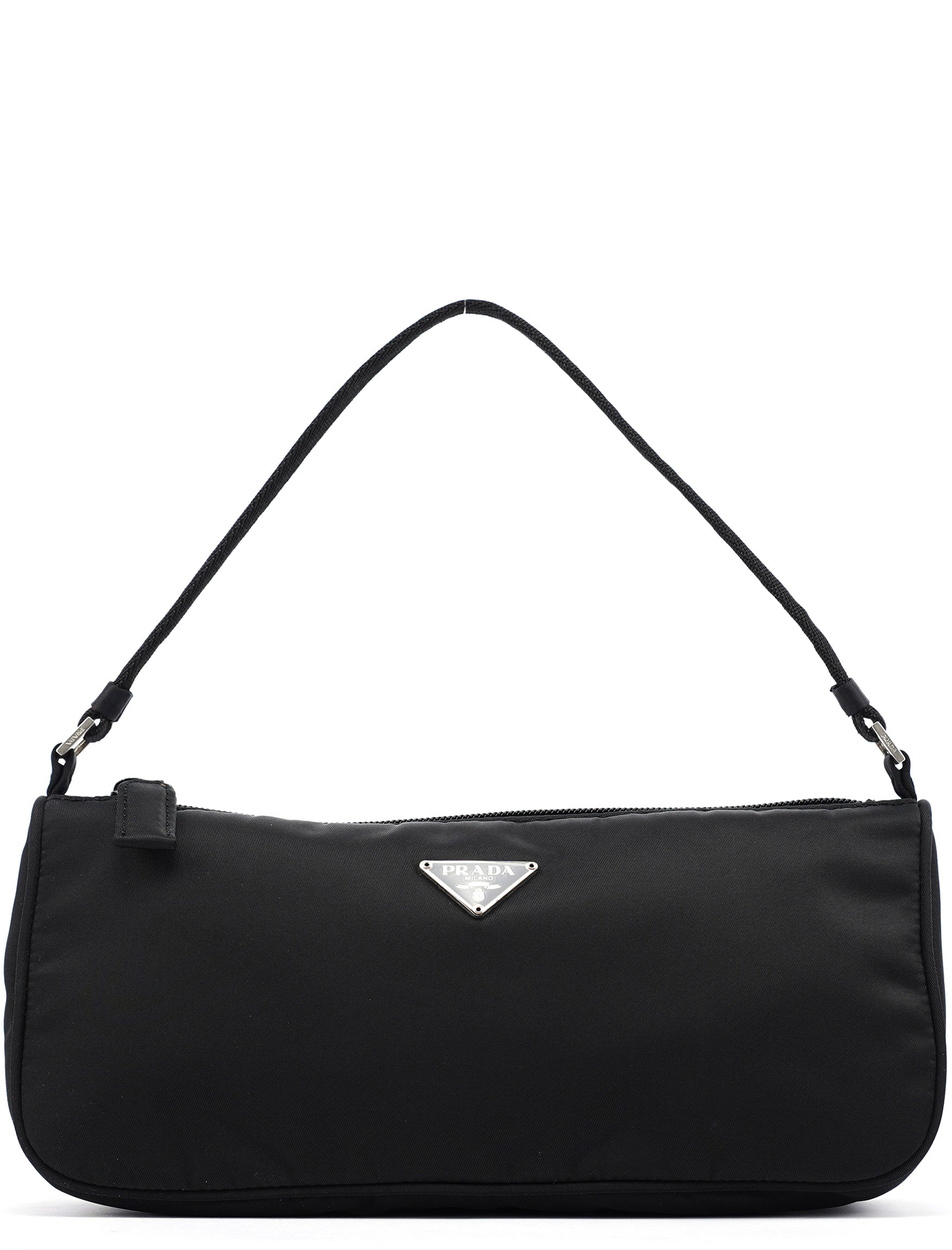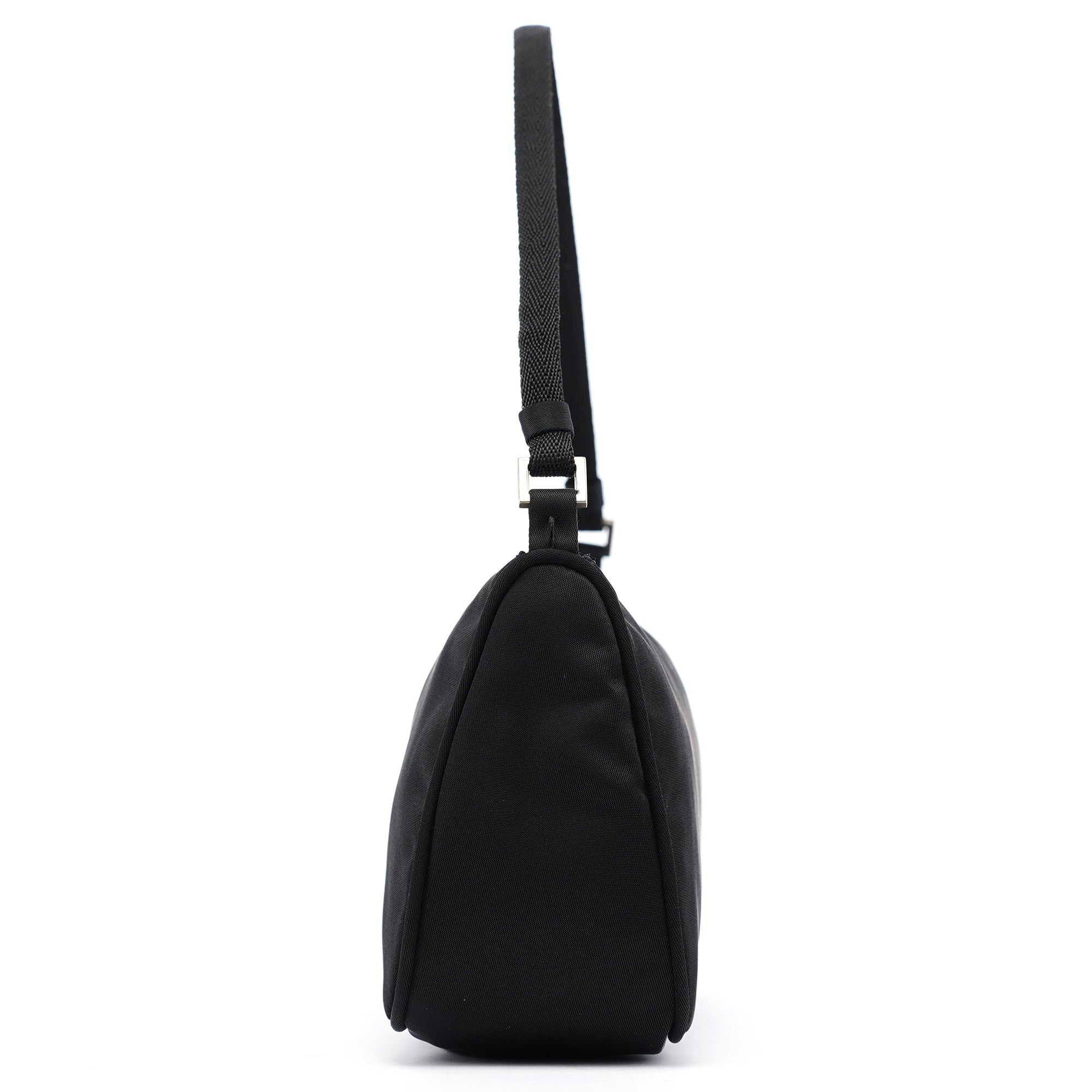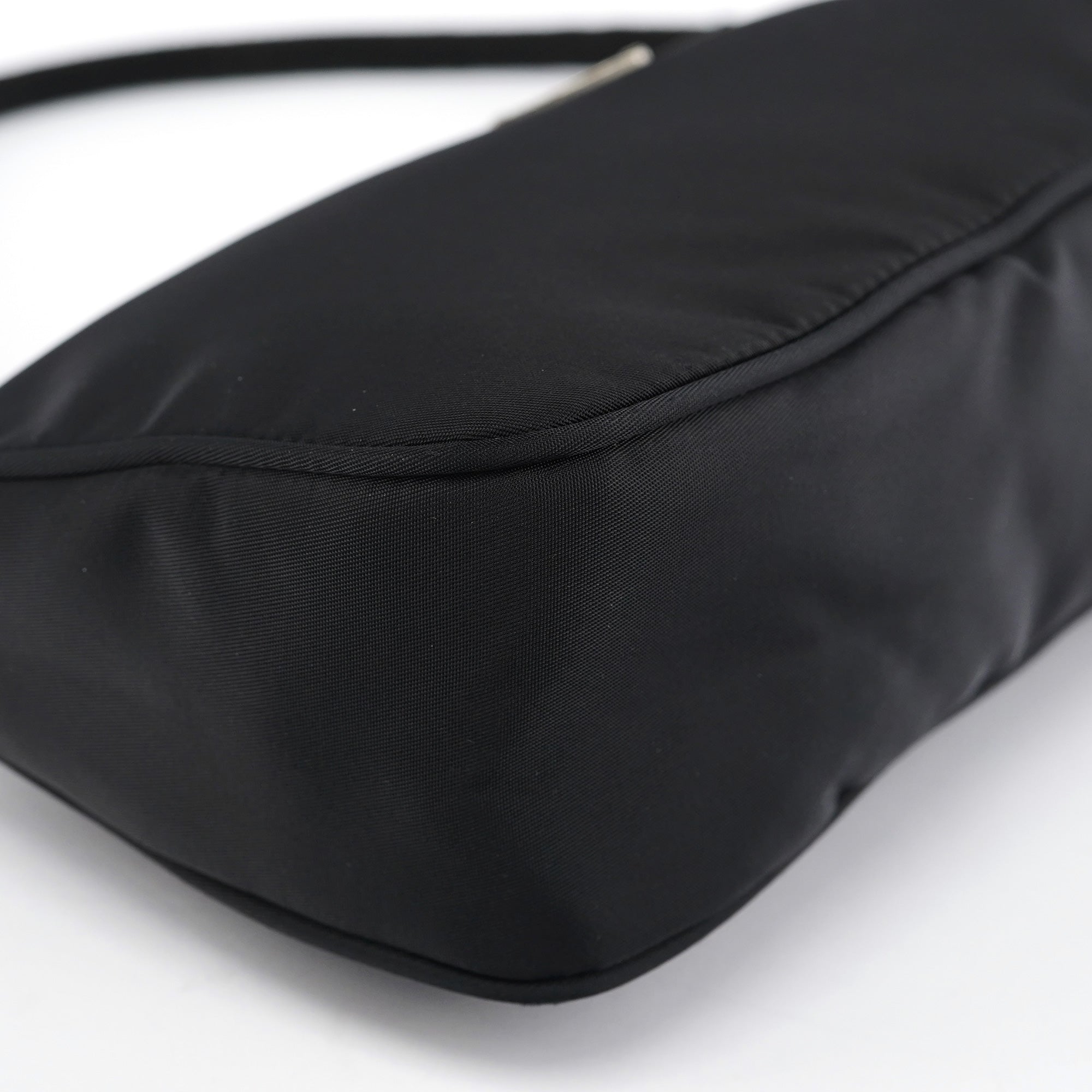 Designed in 2002 by Miuccia Prada, this vintage Prada Tessuto mini hobo bag was crafted from black nylon with leather trim. The compact silhouette features a single shoulder strap with adjustable length, an enamel triangle logo plaque, top zip closure, and a nylon-lined interior. The lightweight Tessuto fabric and streamlined shape reflect Prada's signature blend of practicality and sophistication.
