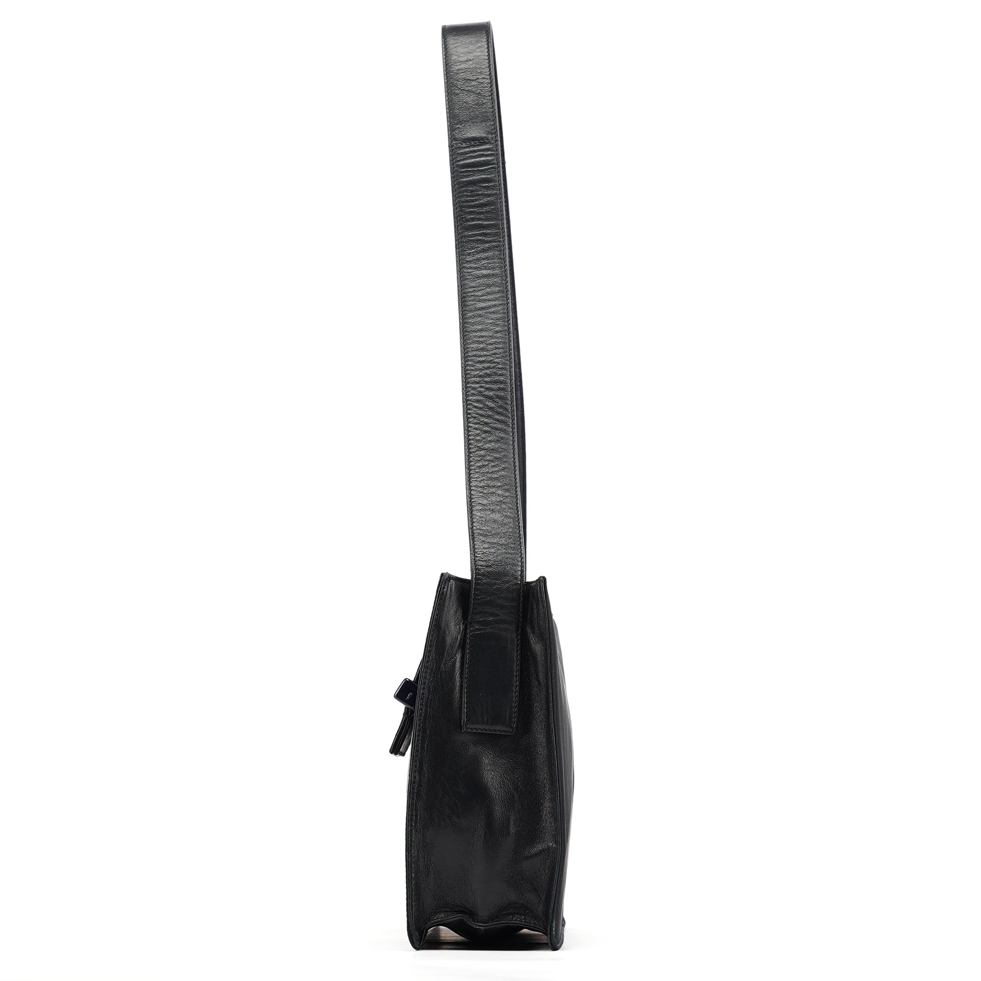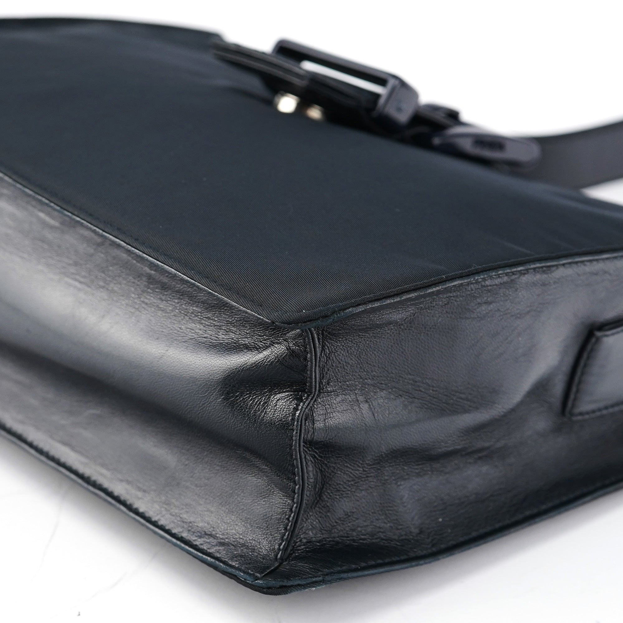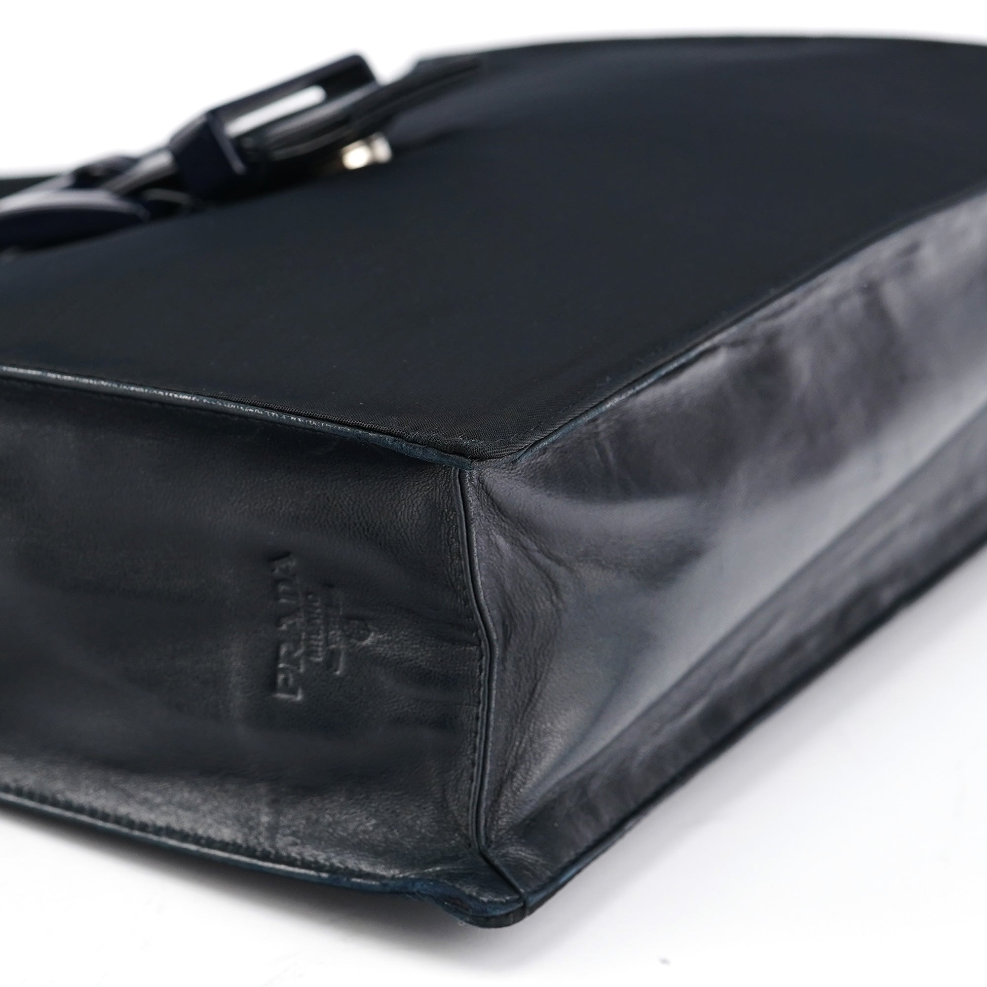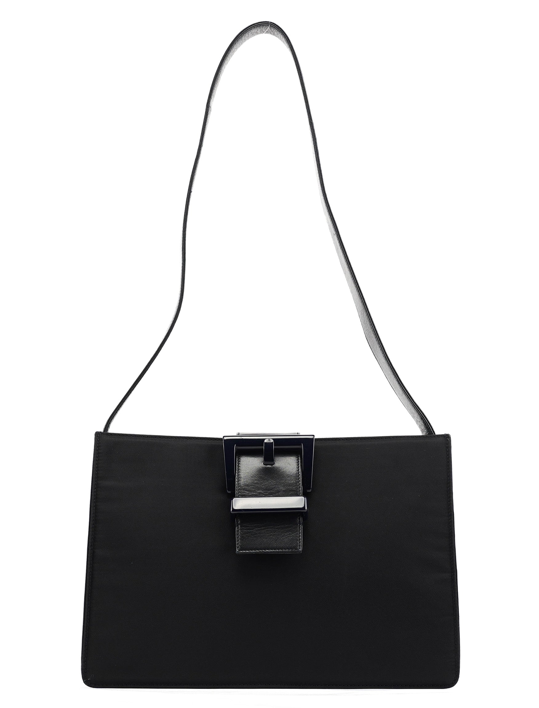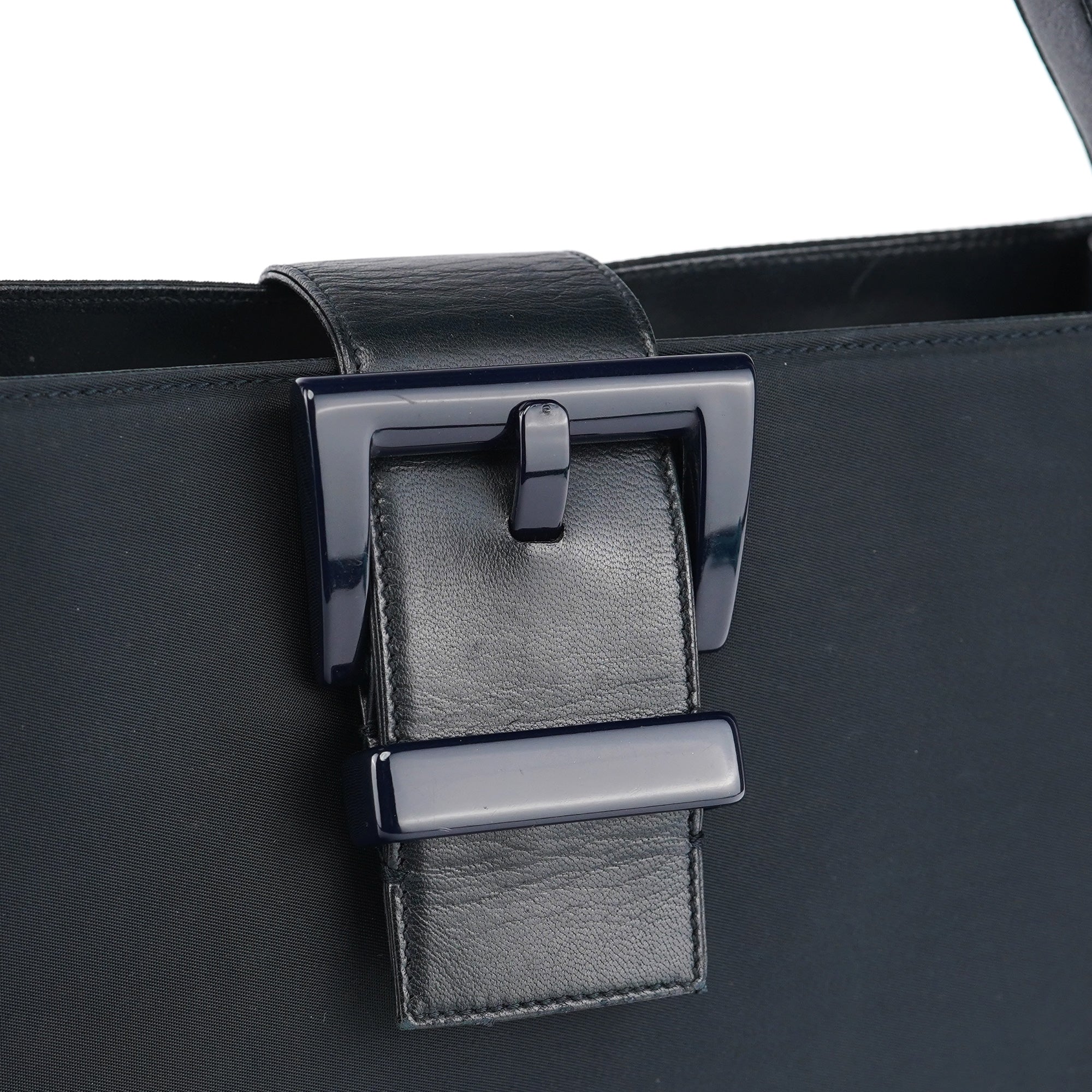 Designed in the late 1990's by Miuccia Prada, this vintage Prada Tessuto Nappa shoulder bag features navy nylon with tonal nappa leather trim and a plastic buckle detail on the front. The interior is lined in navy jacquard satin with a zip pocket. Finished with the Prada logo embossed on the side.