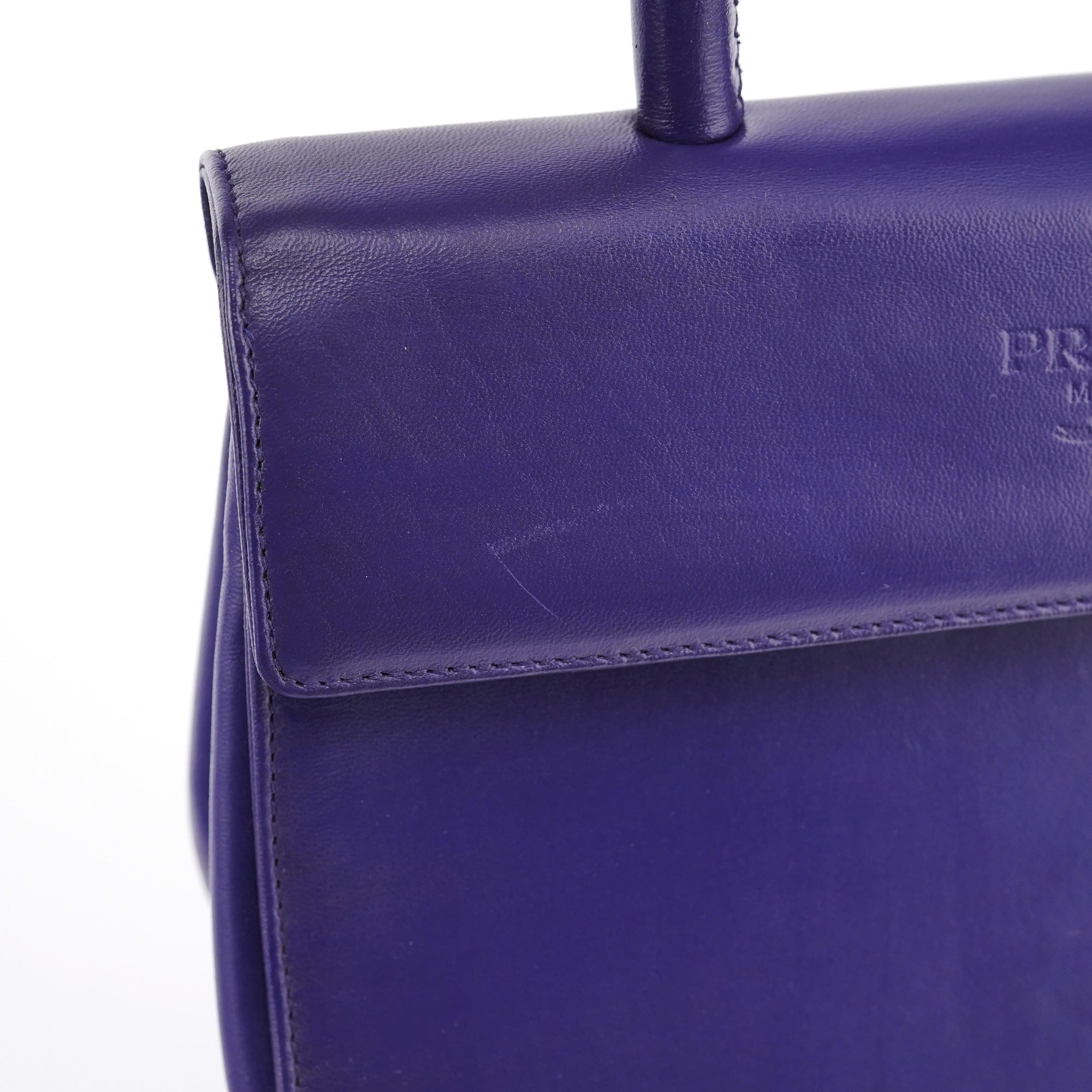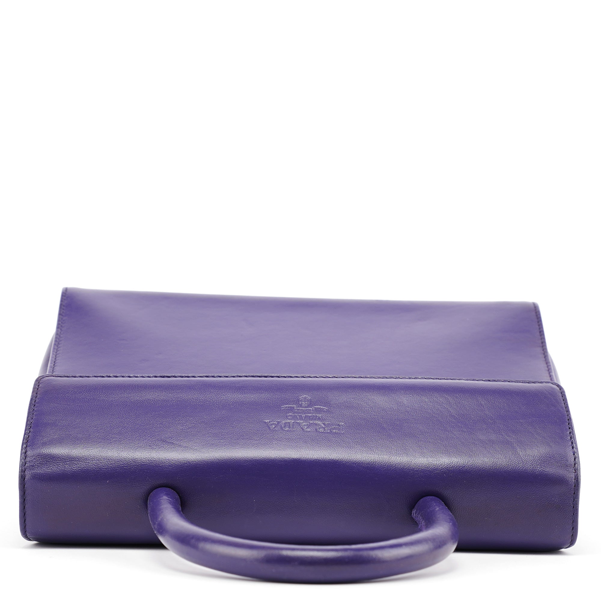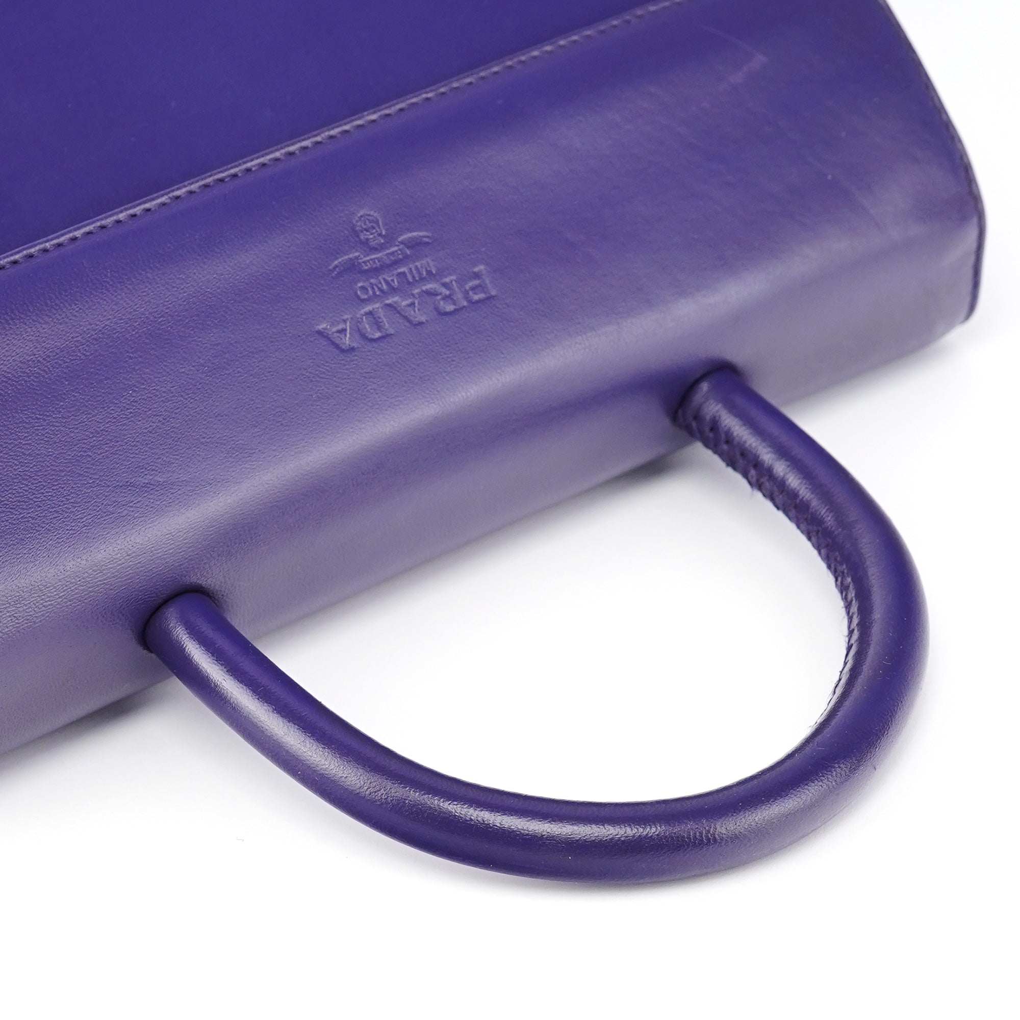 Designed in the mid-1990s by Miuccia Prada, this vintage Prada handbag features smooth purple calfskin leather in a minimalist structured silhouette. The compact design showcases dual rigid top handles, a fold-over flap closure, and the embossed Prada logo on the front flap. The architectural shape exemplifies Prada's refined aesthetic that revolutionized luxury accessories in the 1990s.