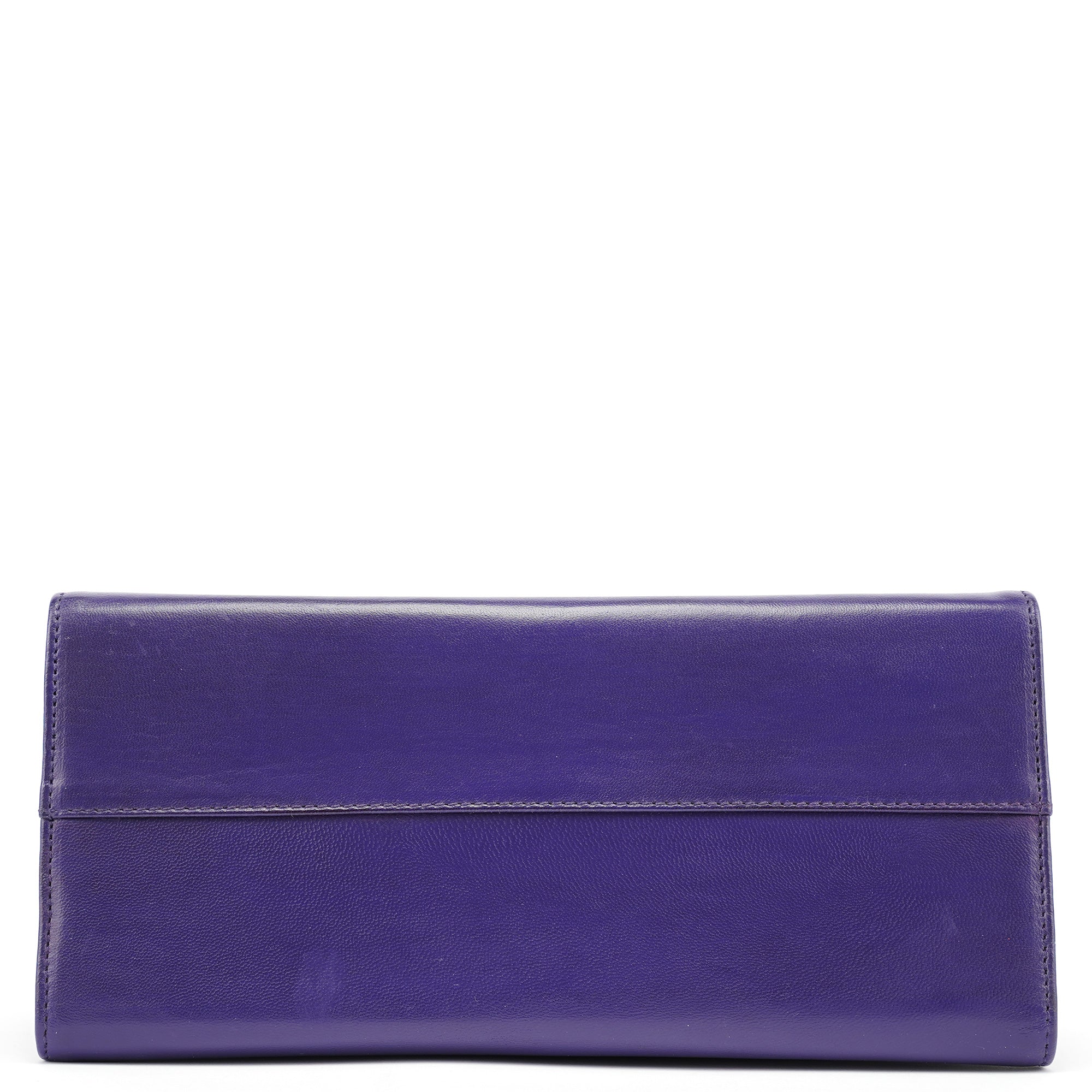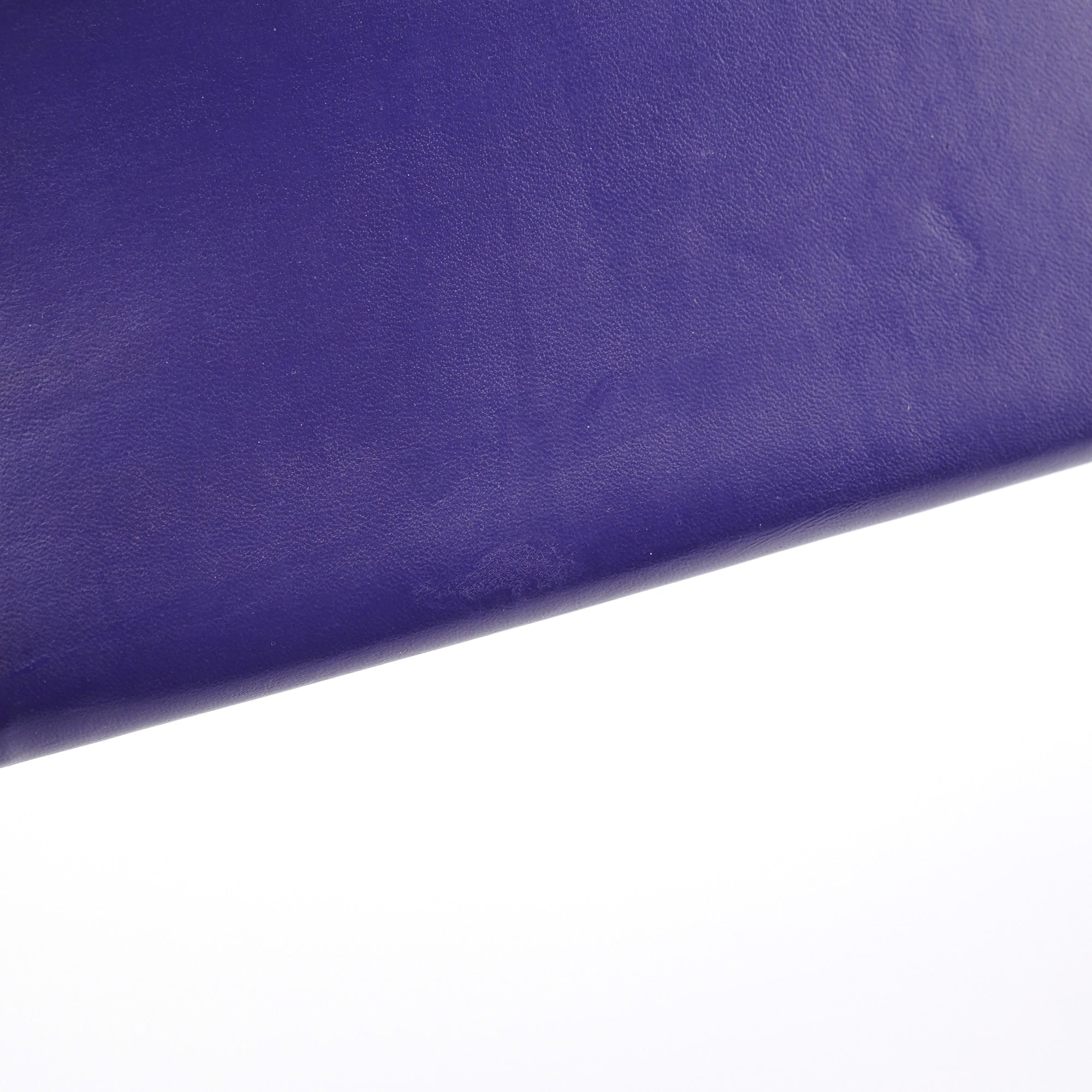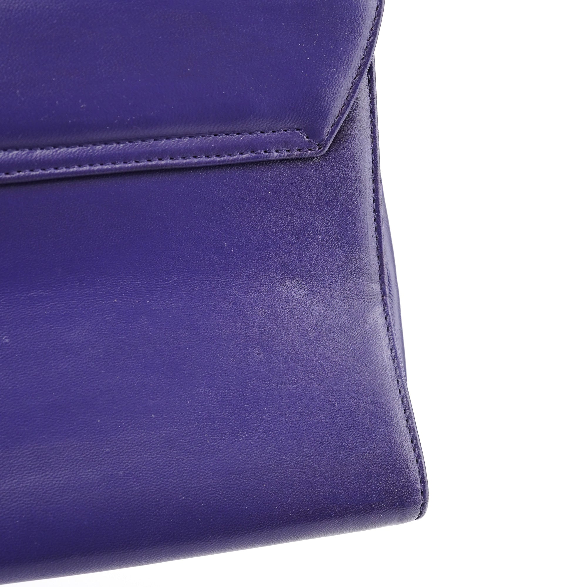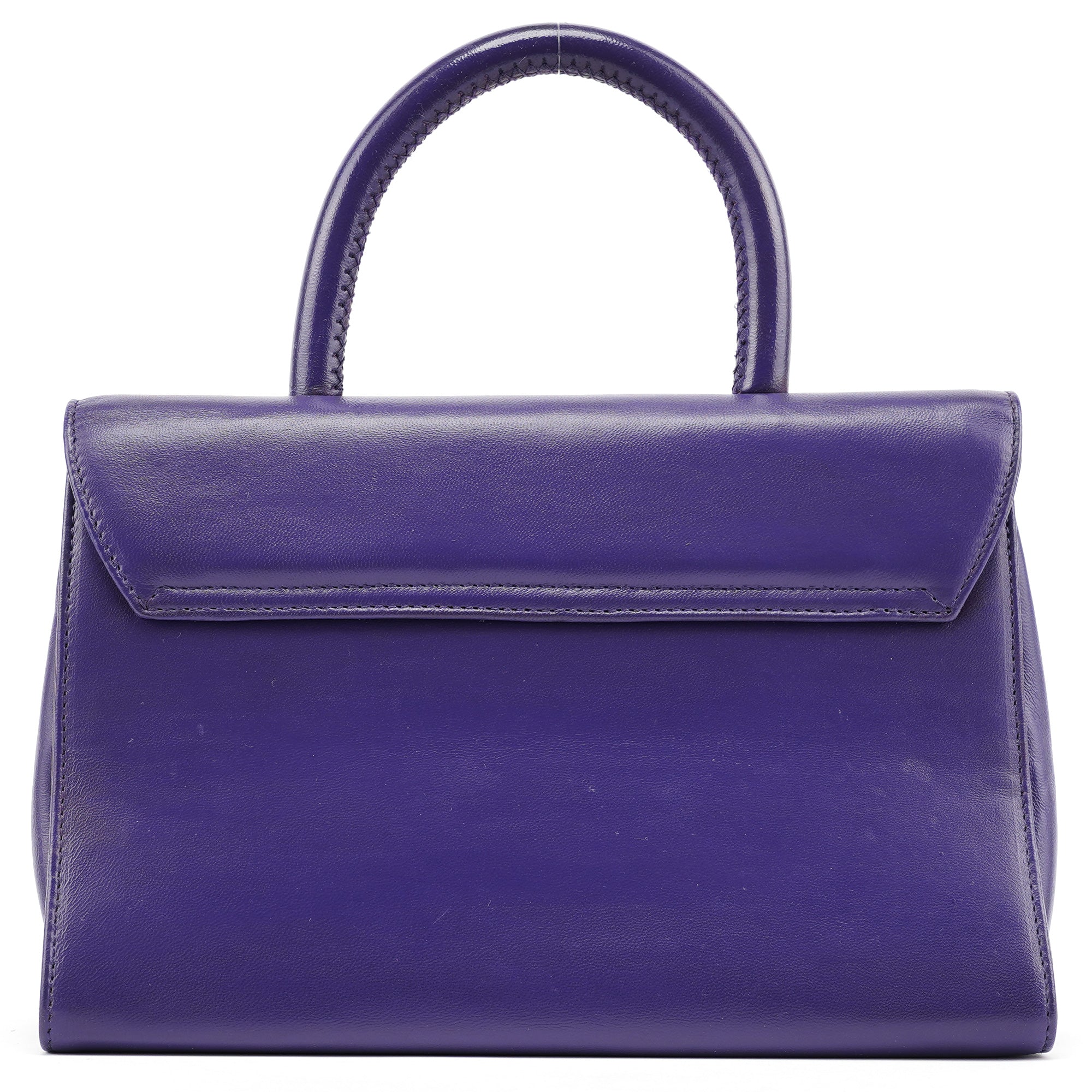 Designed in the mid-1990s by Miuccia Prada, this vintage Prada handbag features smooth purple calfskin leather in a minimalist structured silhouette. The compact design showcases dual rigid top handles, a fold-over flap closure, and the embossed Prada logo on the front flap. The architectural shape exemplifies Prada's refined aesthetic that revolutionized luxury accessories in the 1990s.