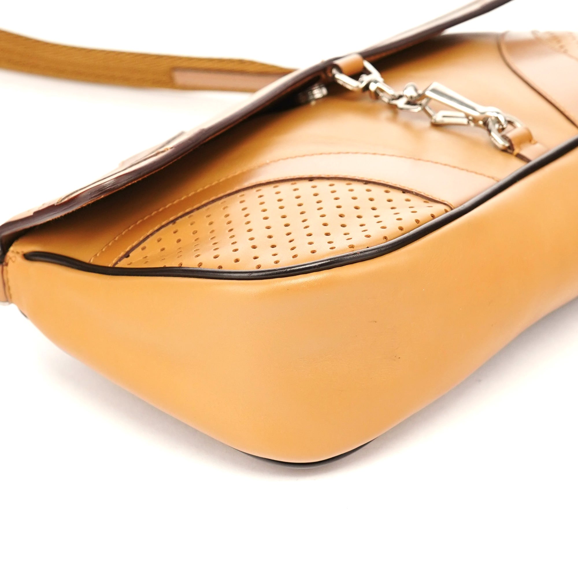Designed for the Spring 2000 collection under Miuccia Prada, this Prada hobo shoulder bag is crafted from smooth beige calfskin with perforated leather panels and silver-tone equestrian hardware. The curved silhouette is finished with contrast black piping and a woven shoulder strap. The interior is lined in jacquard nylon with a zip pocket for essentials.