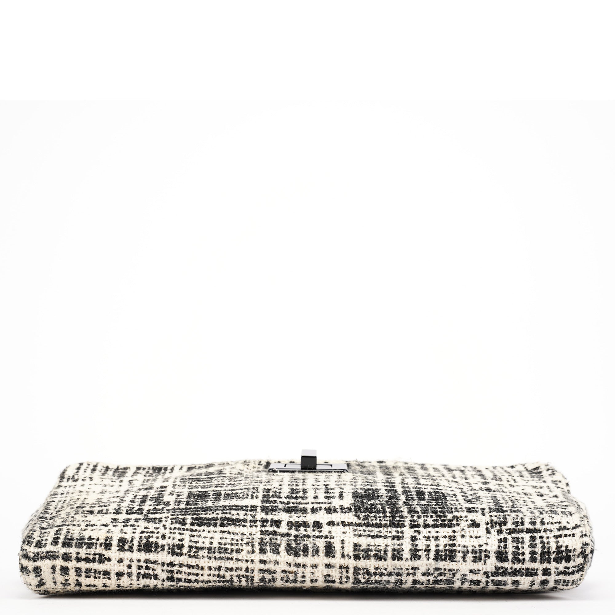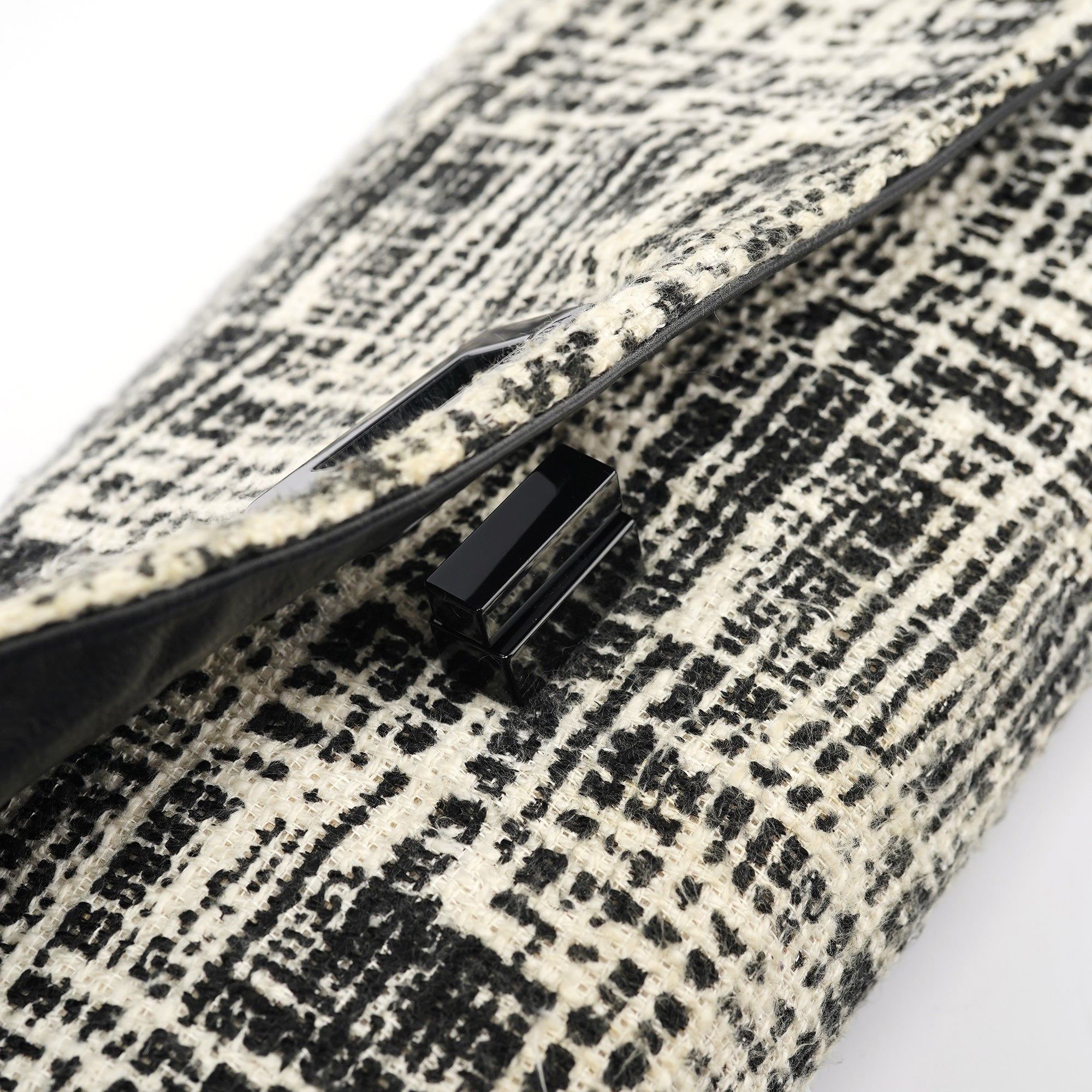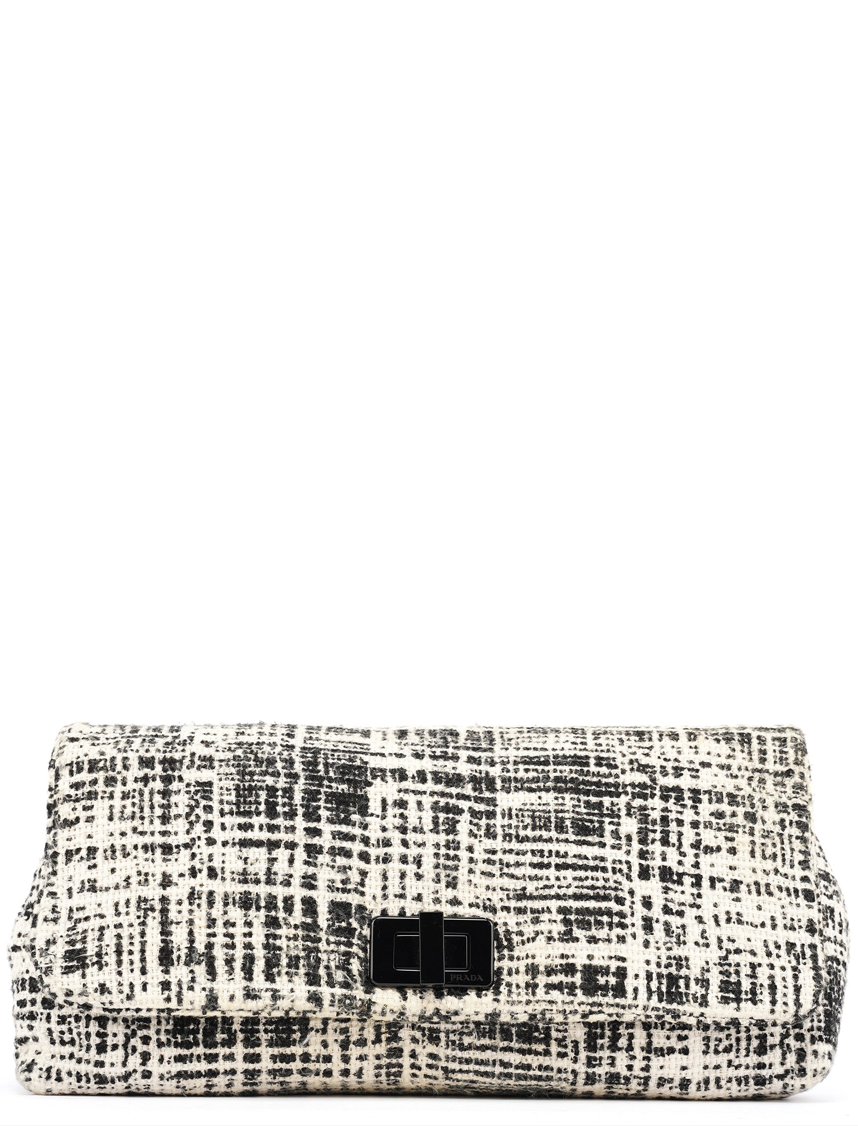 Designed in the 2010s by Miuccia Prada, this Prada clutch bag is crafted in a navy and white boucle tweed which was inspired by the iconic Spring 1996 collection. It features a fold-over flap and black enamel twist-lock closure. The textured exterior is accented by the house’s gold-tone enamel triangle logo on the side, while the compact interior is finished with tonal lining and a single slip pocket.