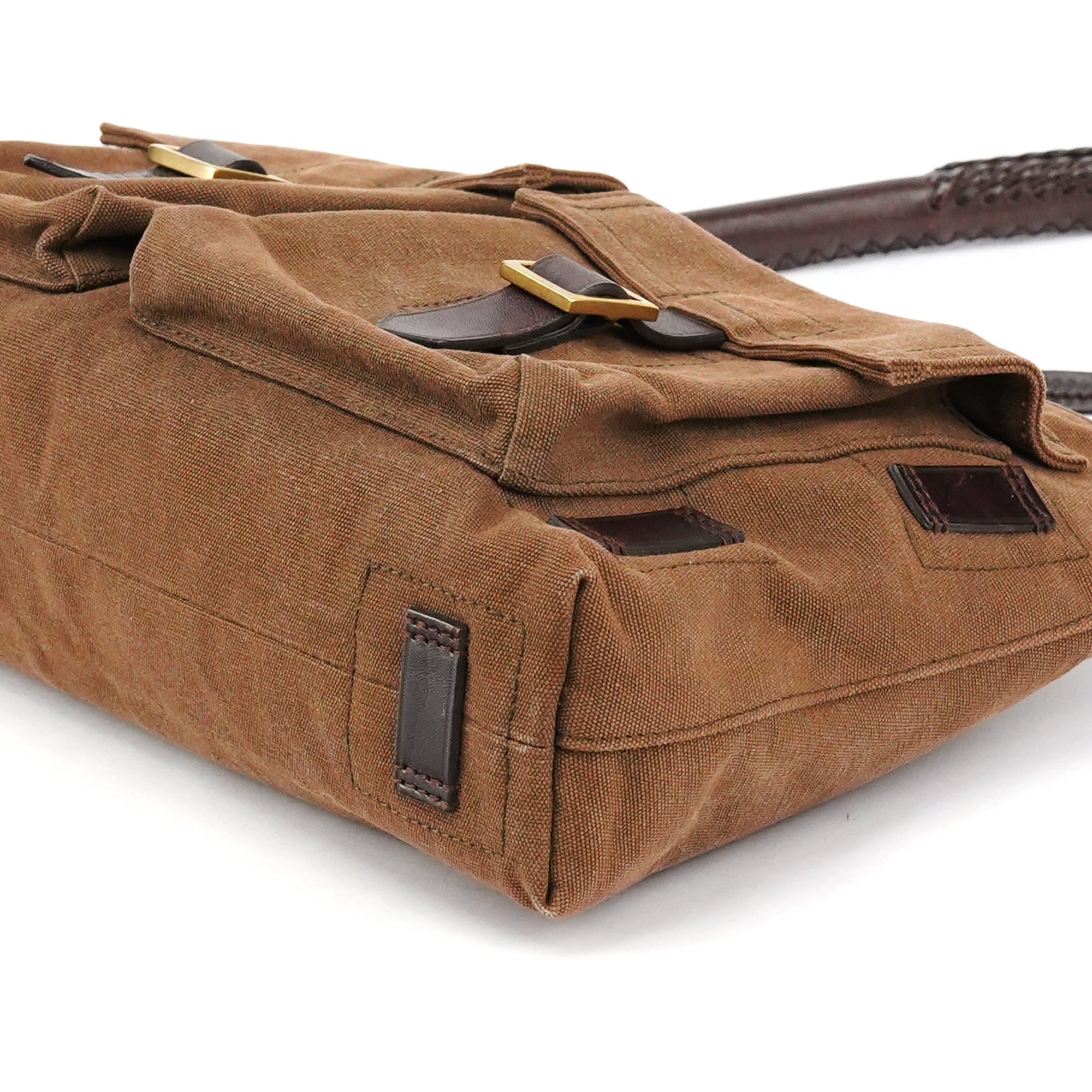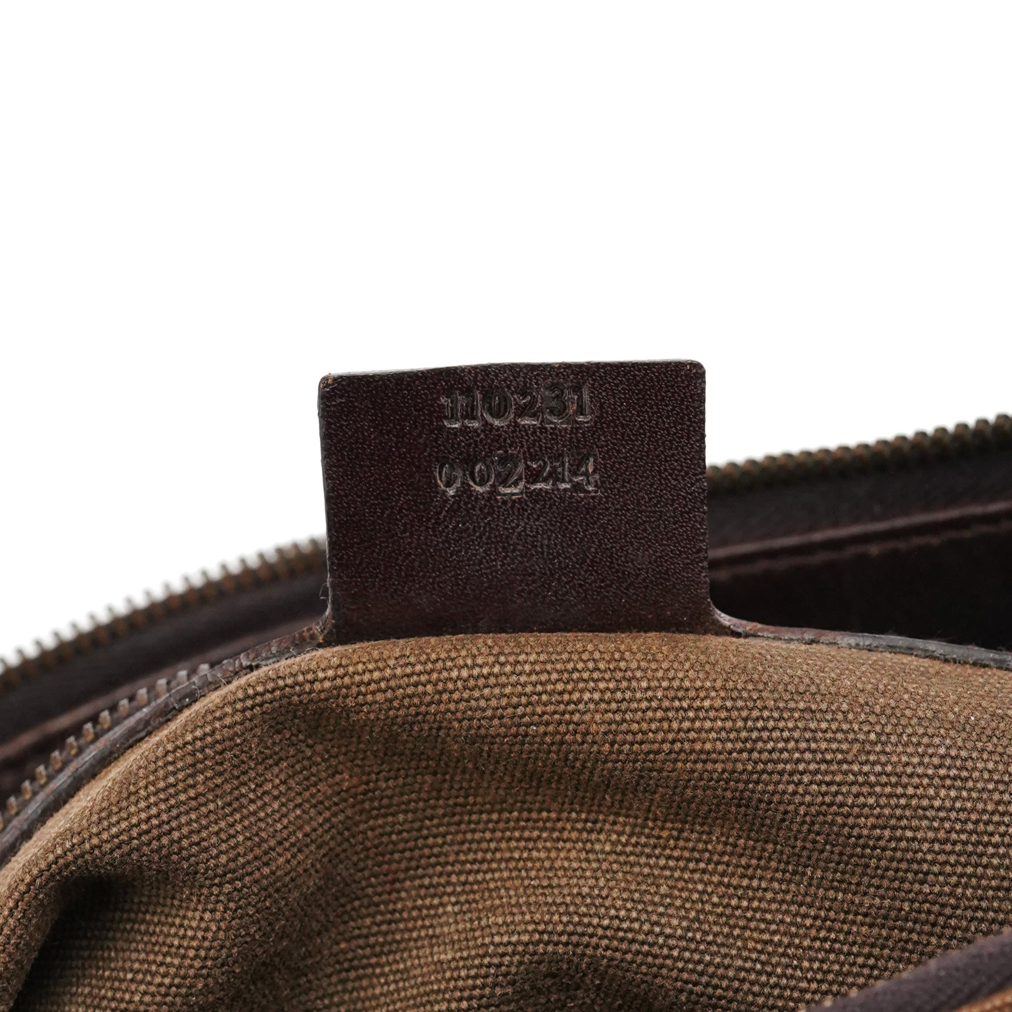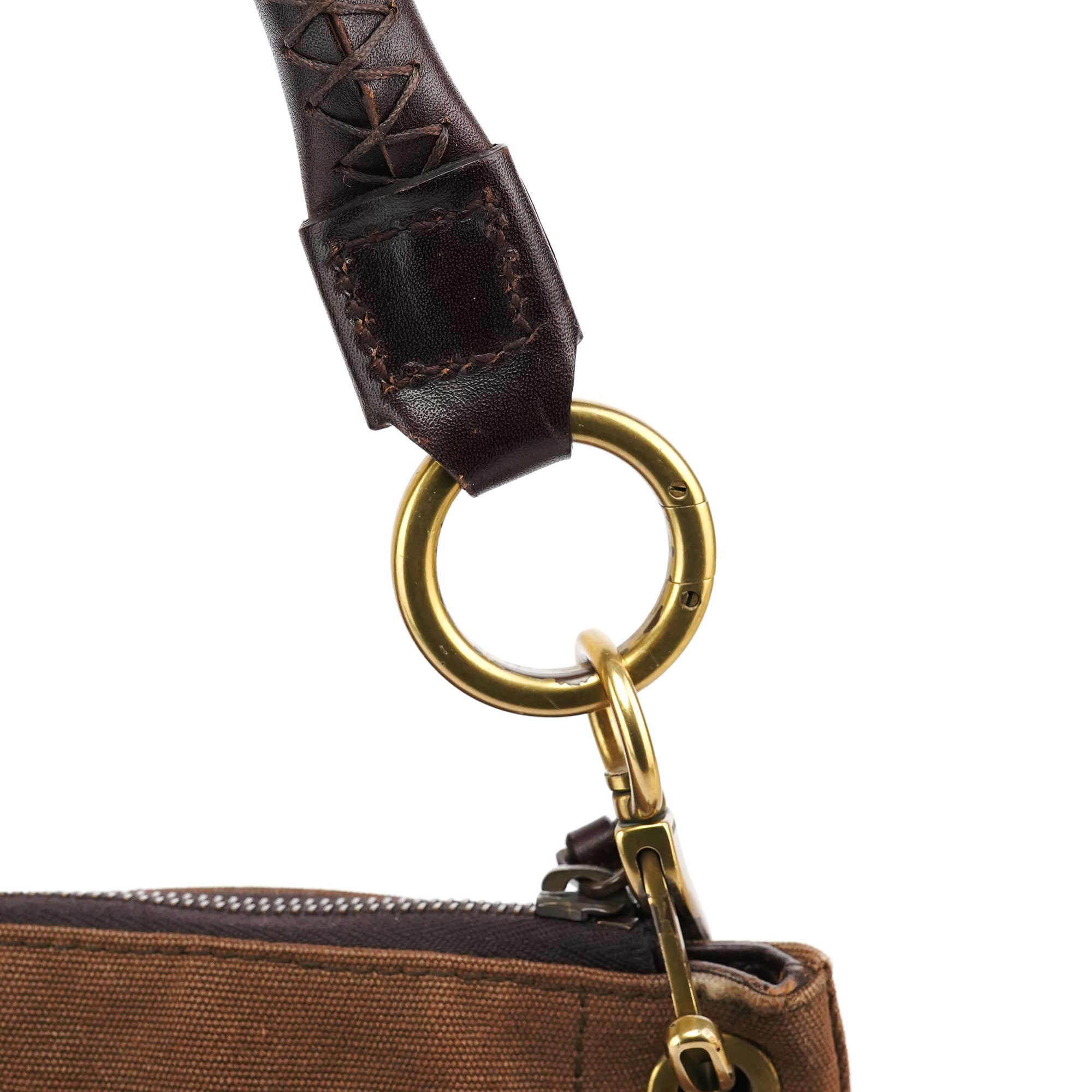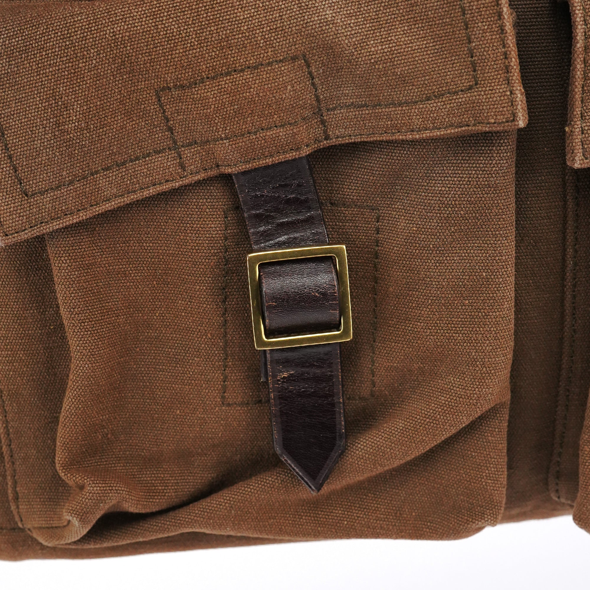 Designed in 2003 by Tom Ford, this Gucci menswear shoulder bag is crafted from brown canvas with dark leather trim, featuring dual front flap pockets with buckle closures, brass hardware, a braided leather shoulder strap, and a zip-top opening with a fabric-lined interior.