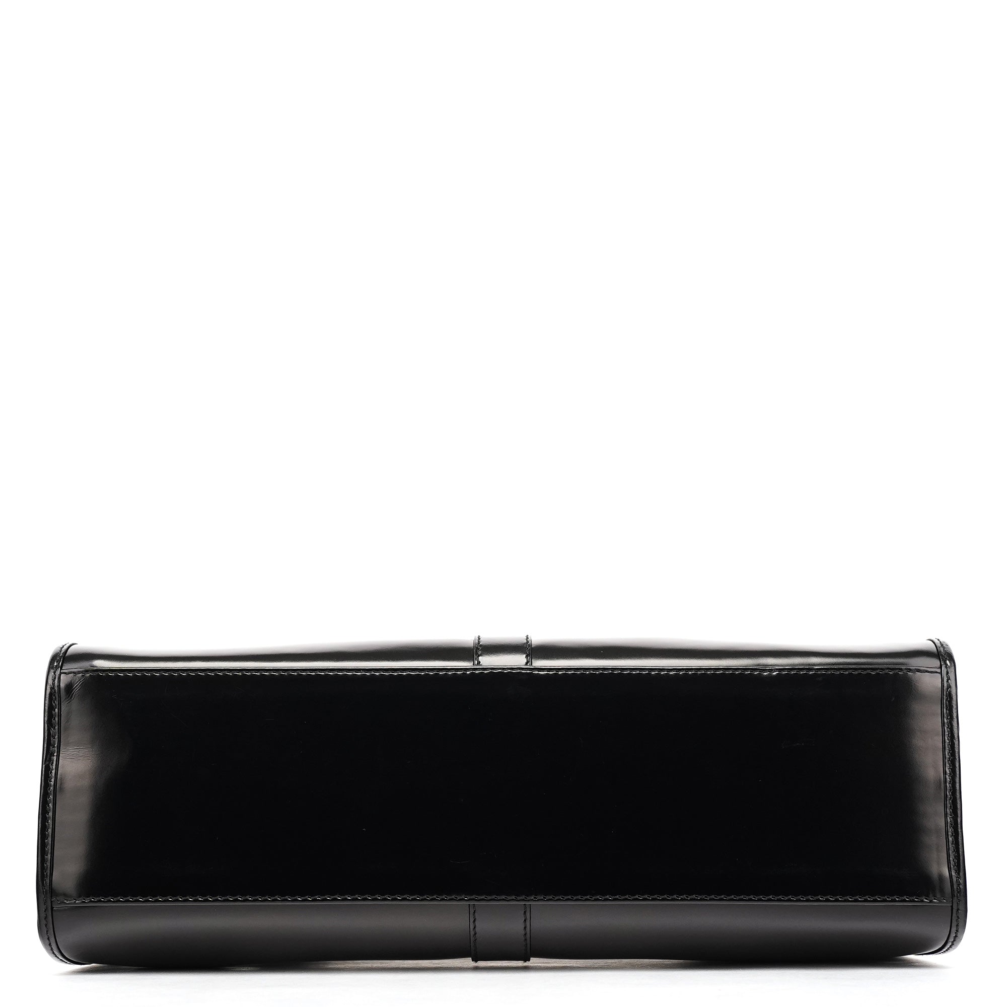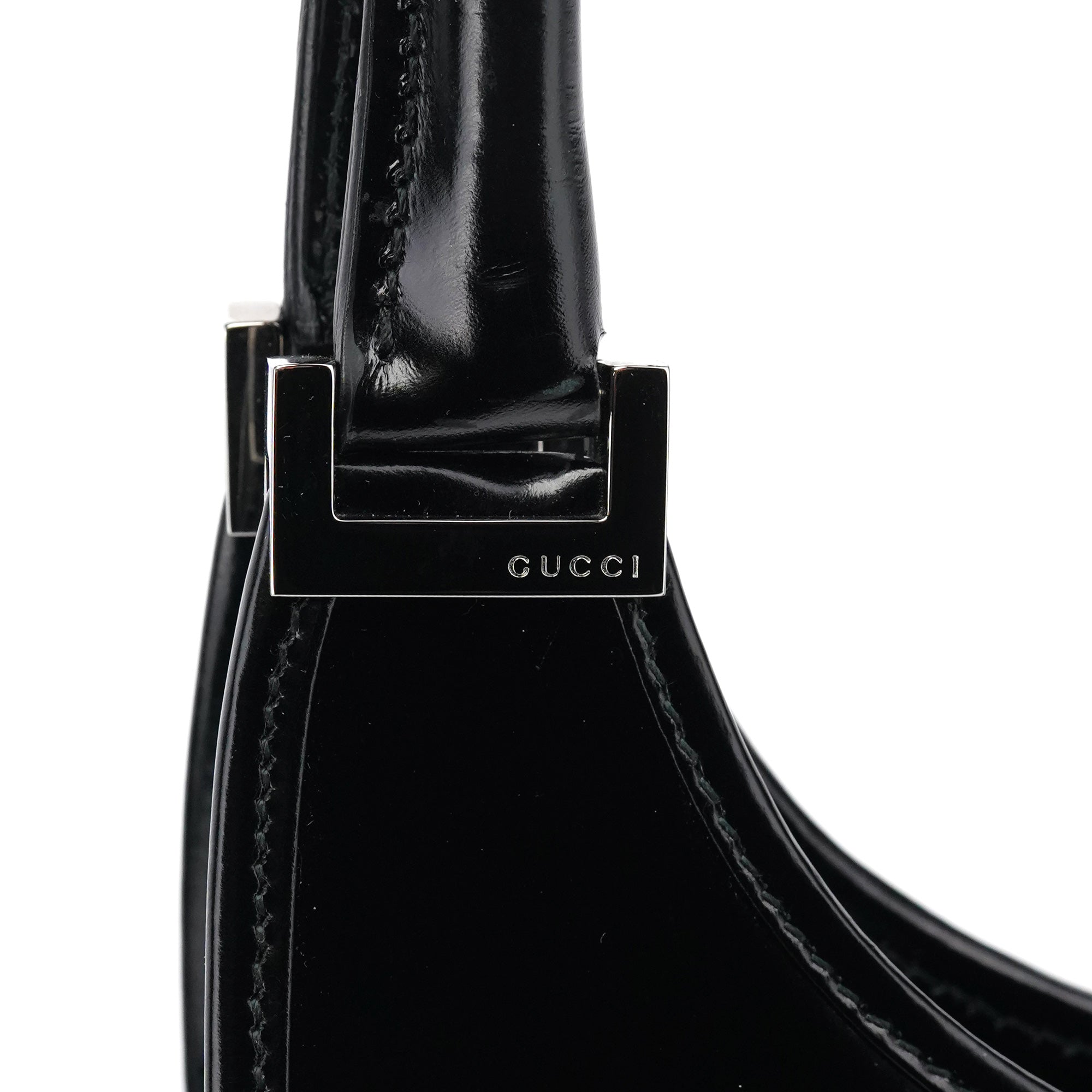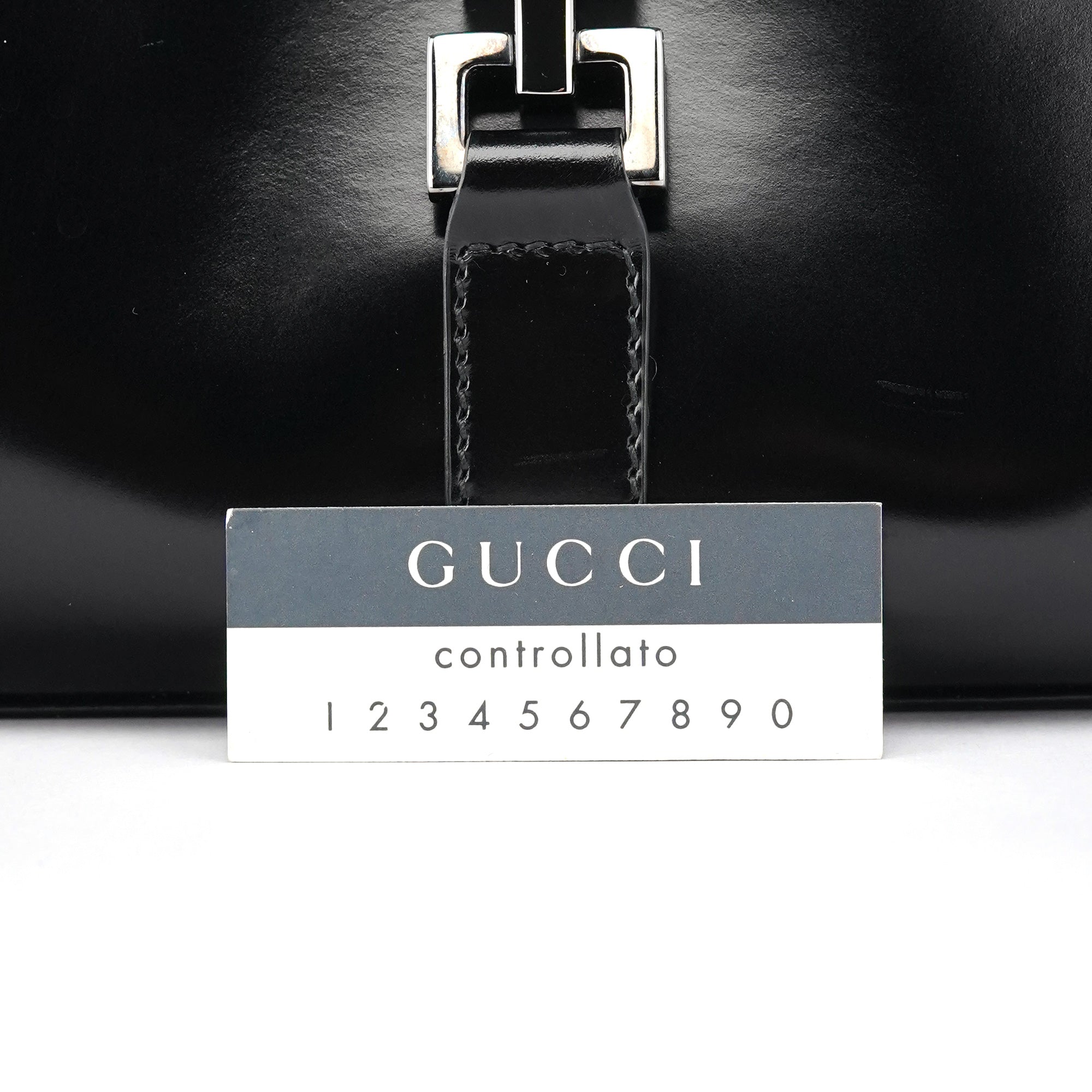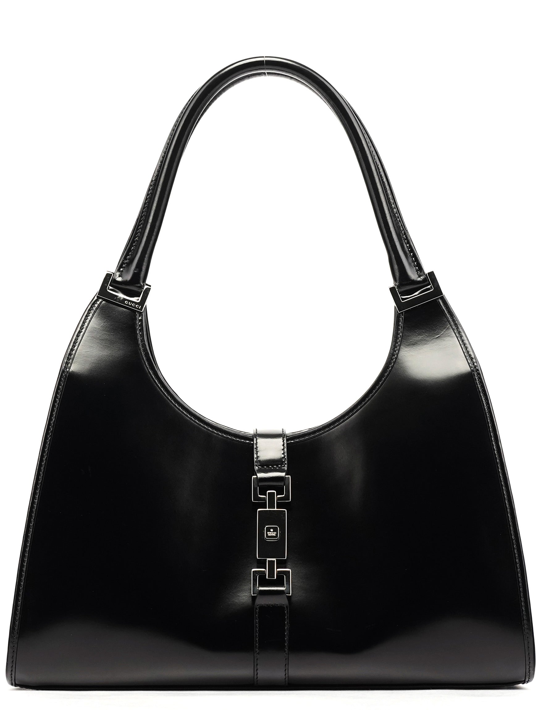 Designed in the late 1990s by Tom Ford, this Gucci Jackie shoulder bag is crafted from glossy black calfskin with a structured silhouette, finished with silver-tone hardware, the iconic piston clasp closure, and a black fabric-lined interior.