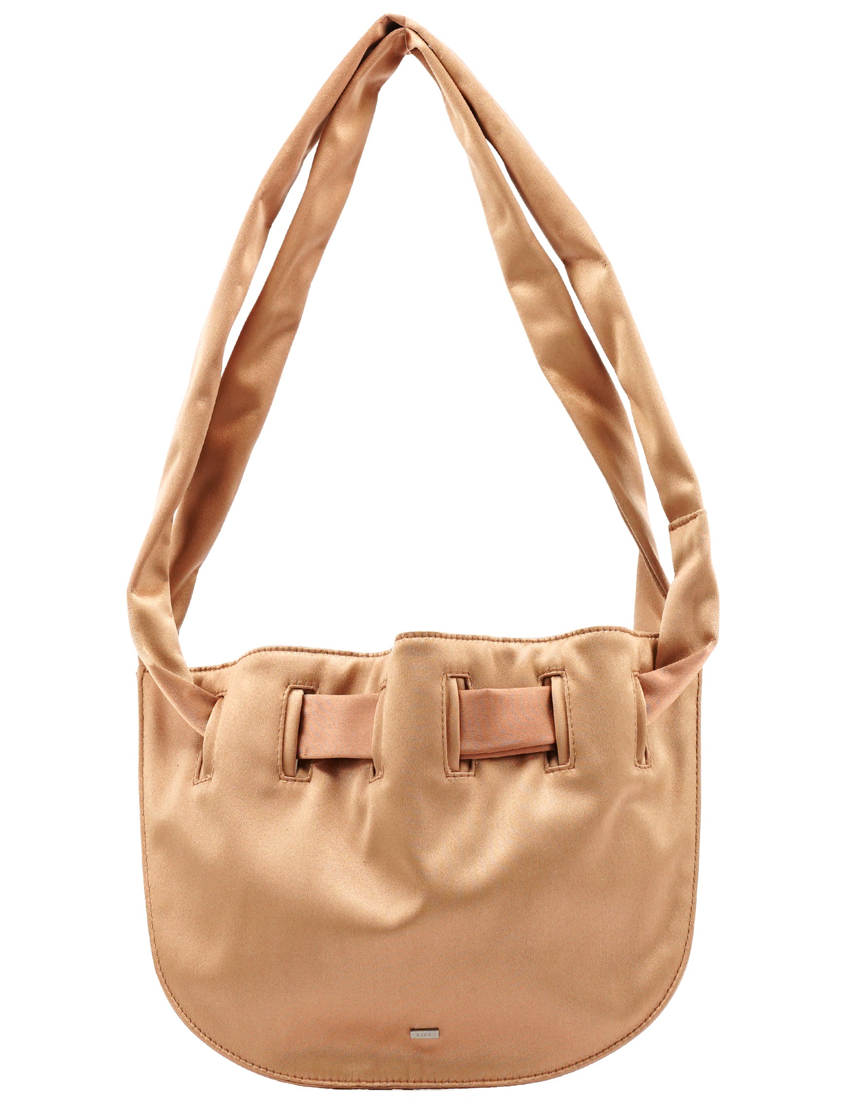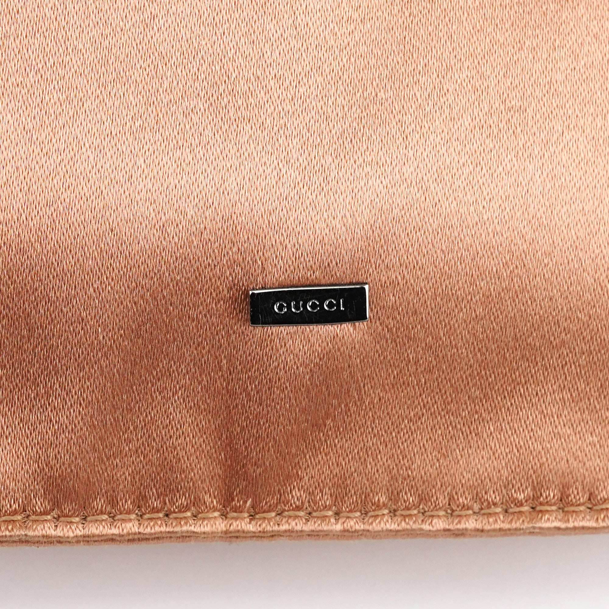 Designed in the late 1990s by Tom Ford, this Gucci shoulder bag is crafted from soft pink satin with a drawstring-style handle, opening to a smooth calfskin leather interior with slip pocket.