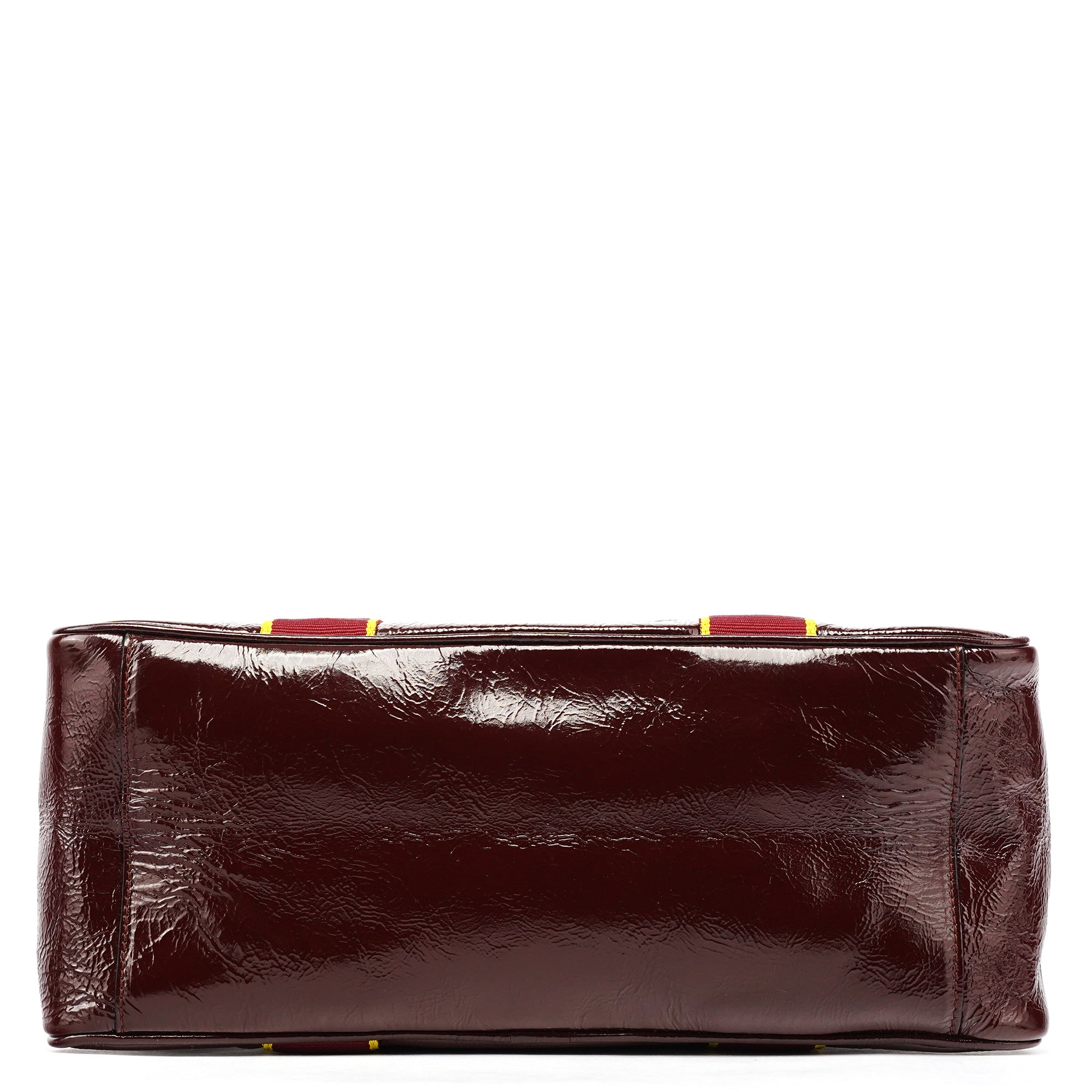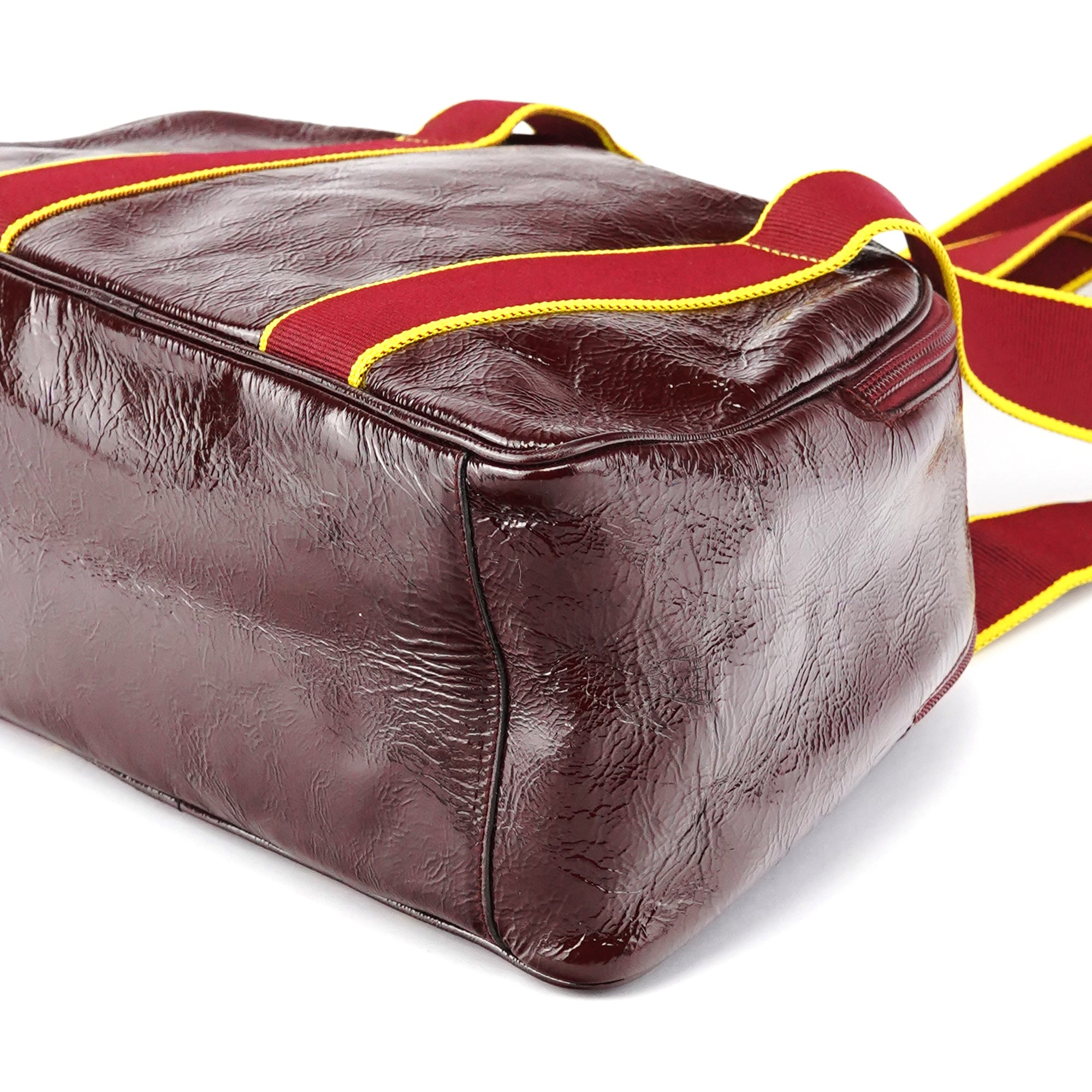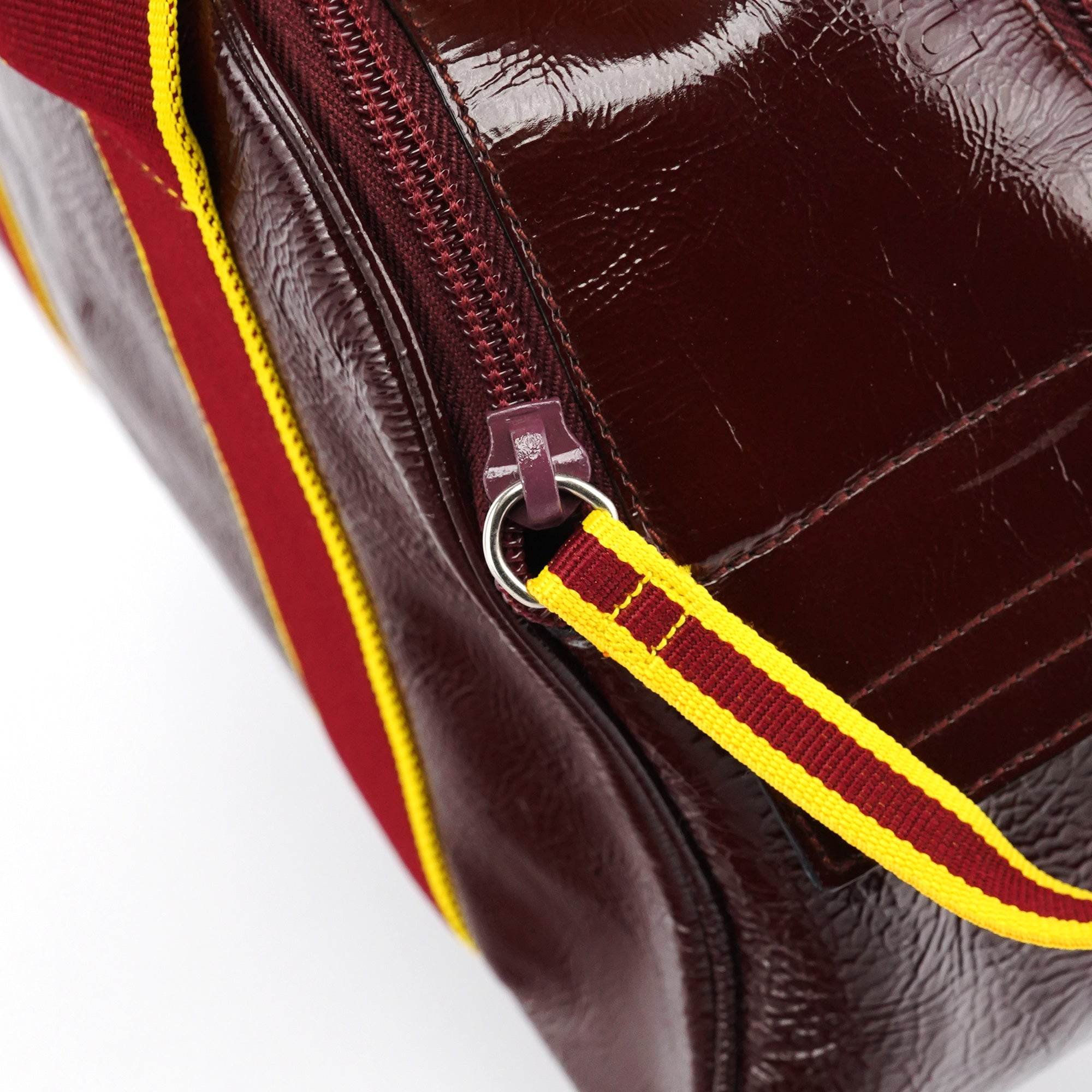 Designed for the Spring 2000 collection by Miuccia Prada, this Miu Miu bowling bag is crafted from burgundy patent leather, accented with striped textile handles and a double zip closure, opening to a black fabric-lined interior.