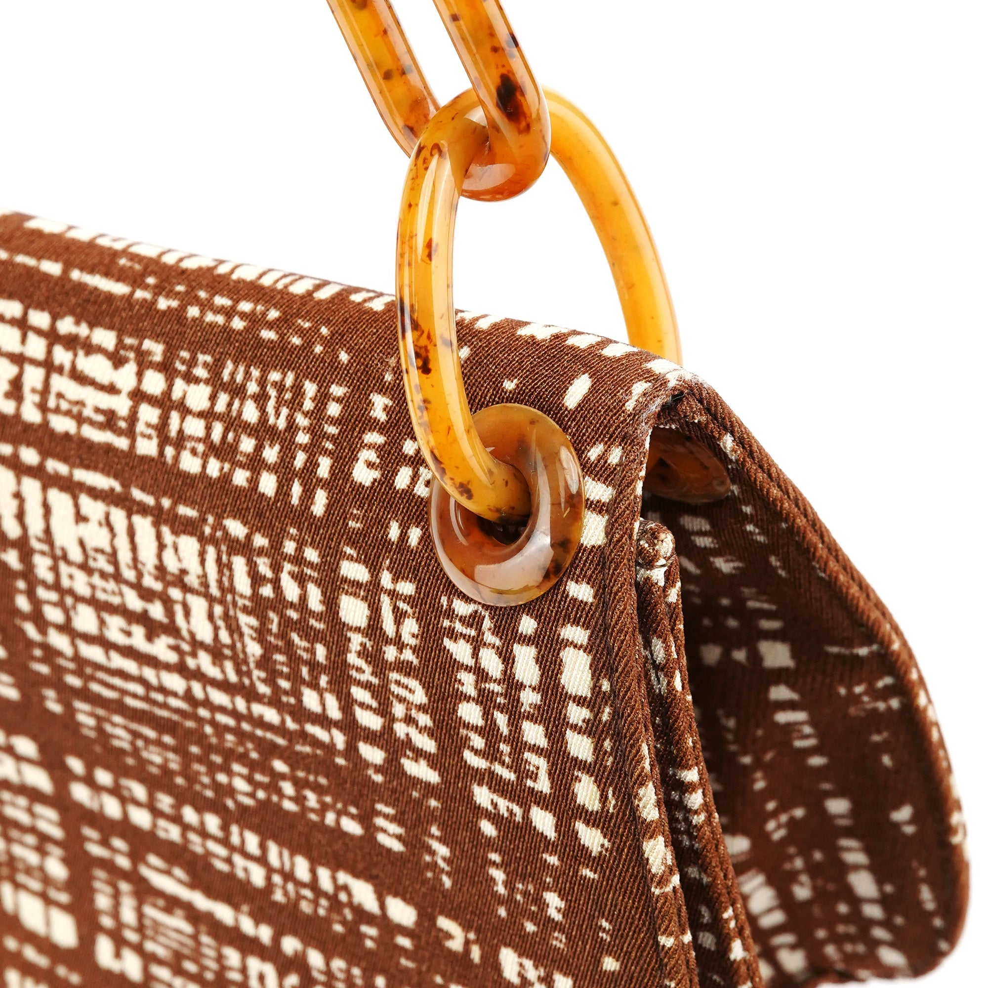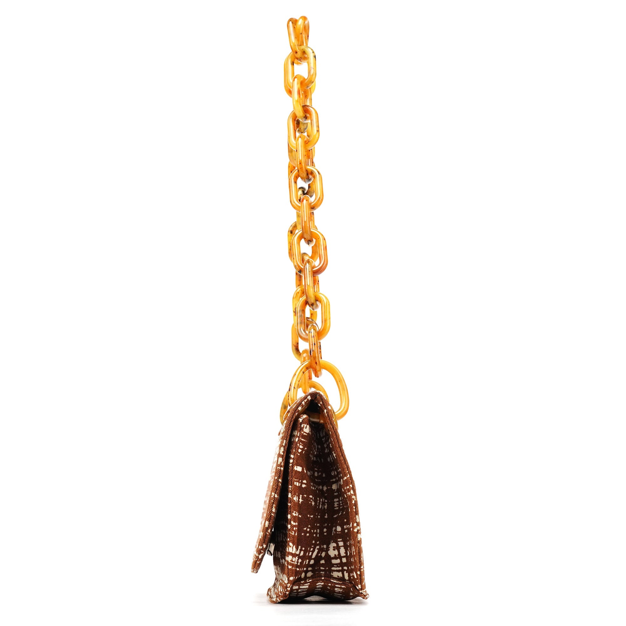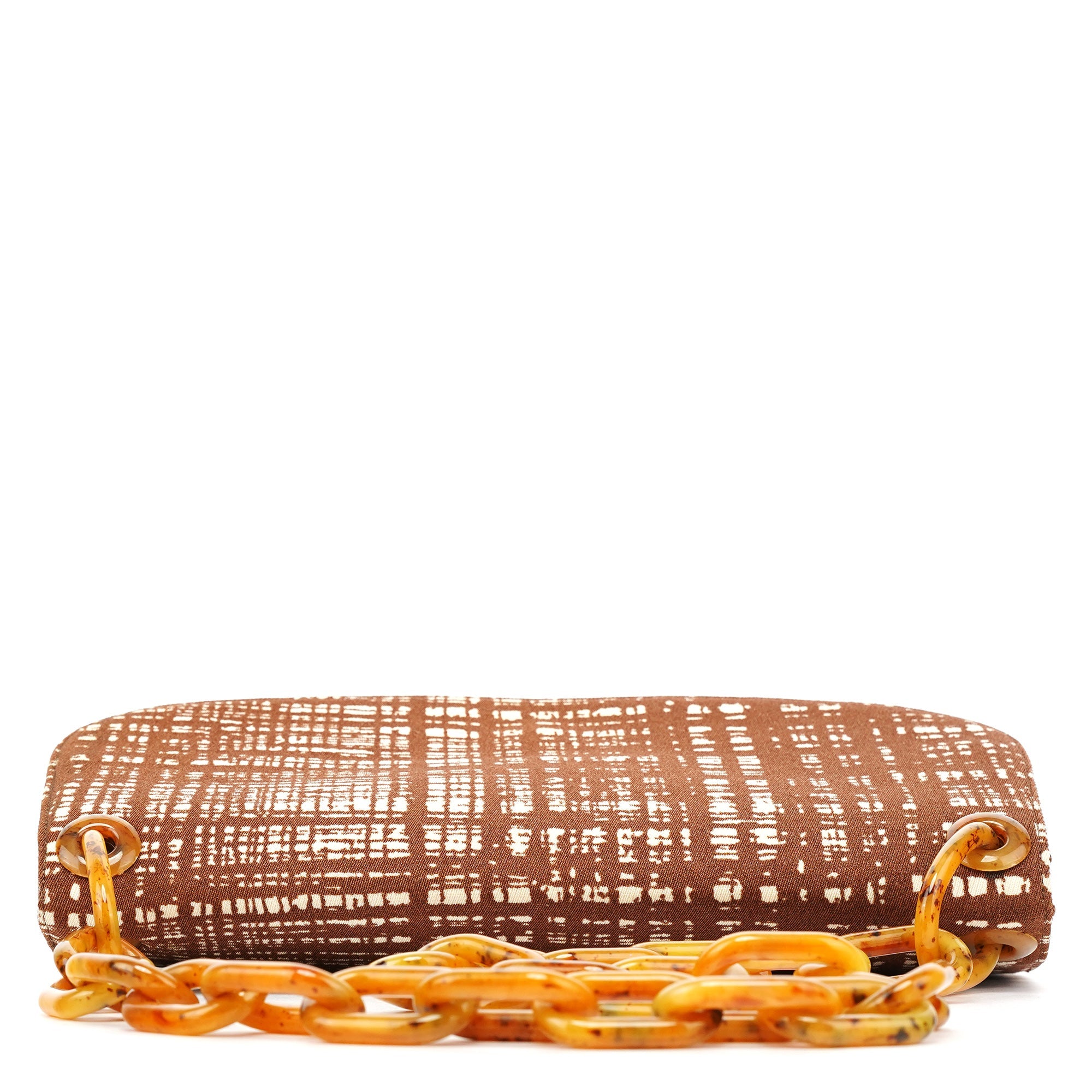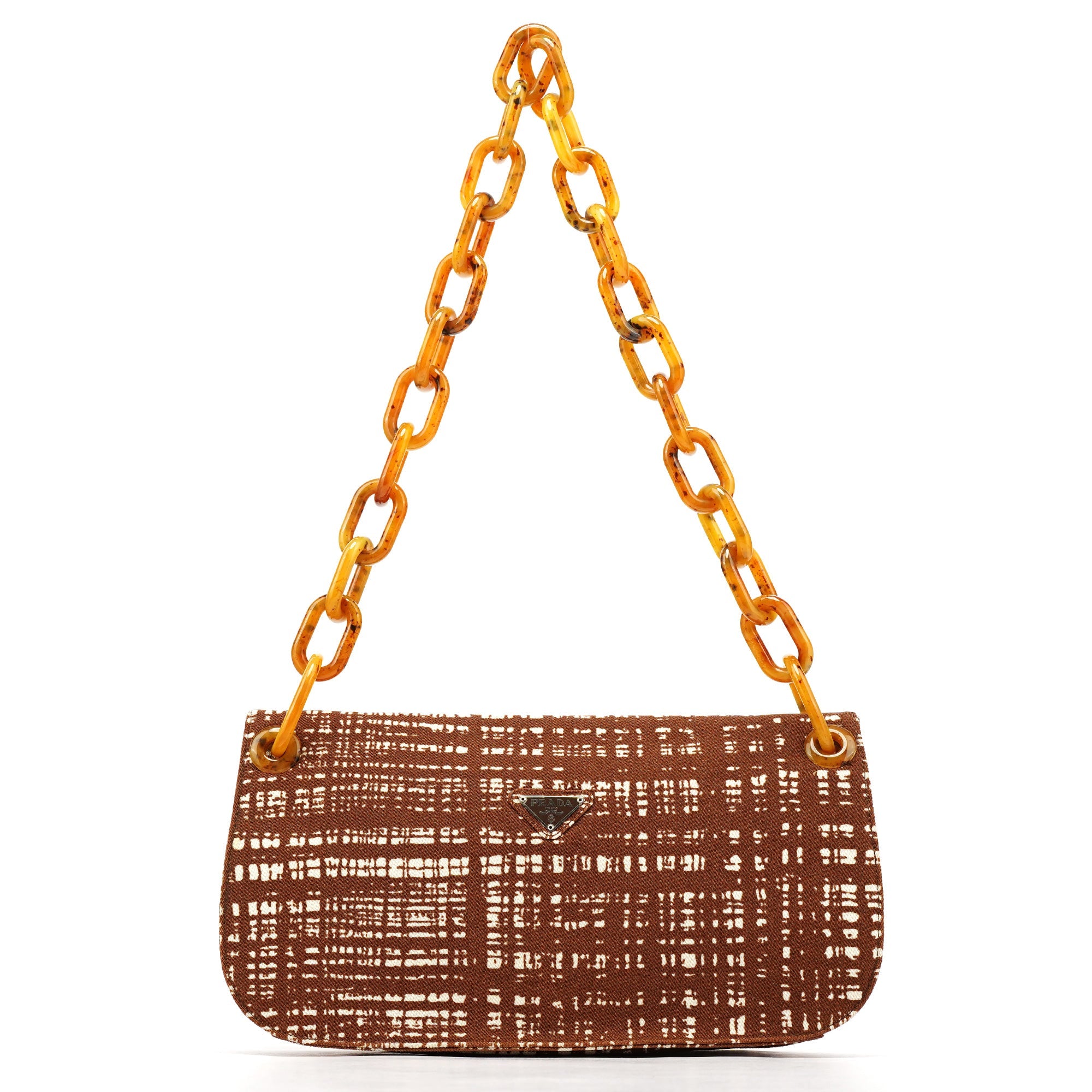 Designed in 1996 by Miuccia Prada, this incredibly rare Prada Tessuto Swing shoulder bag is crafted from brown tessuto with the iconic tweed print from the collection, finished with an amber resin chain strap, magnetic flap closure, and a satin-lined interior with zip pocket.