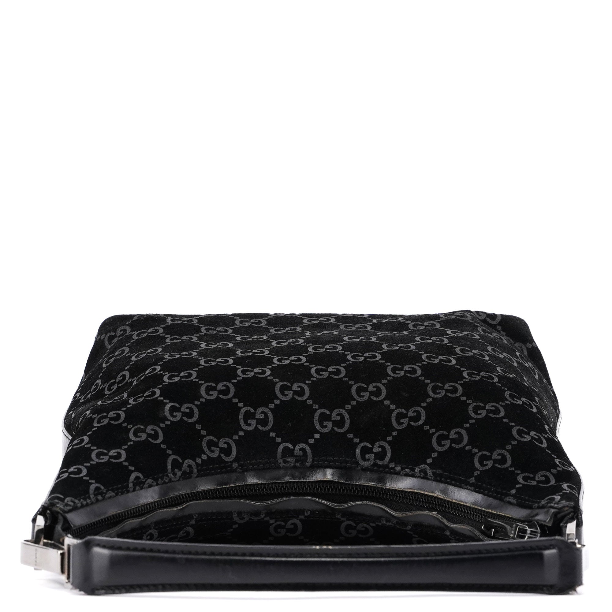 Unveil the elegance of the Gucci GG suede shoulder bag, designed by Tom Ford in 1997. This luxurious piece features silver-tone hardware with engraved Gucci logo, complemented by black calfskin leather trim. A zipper closure secures the satin-lined interior.