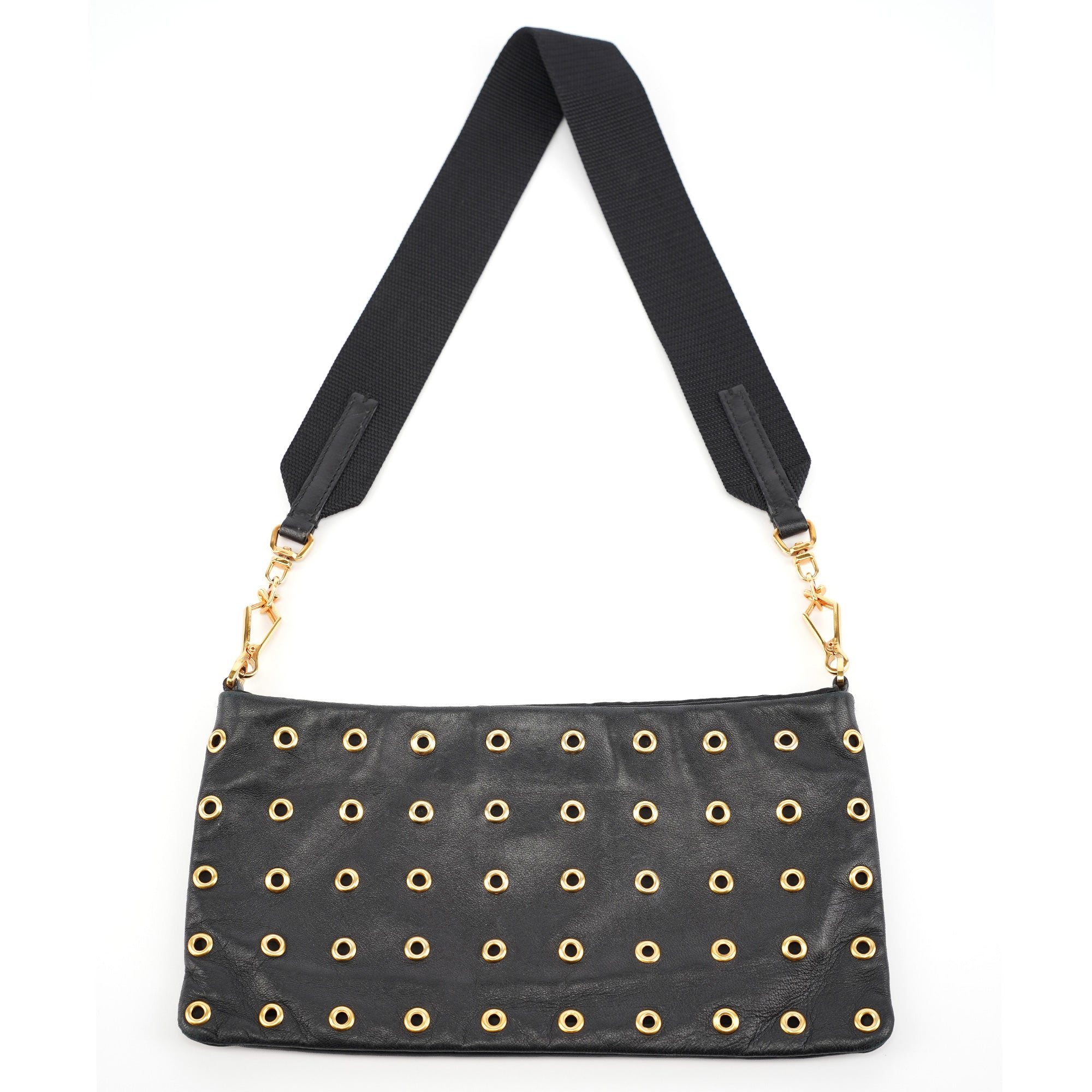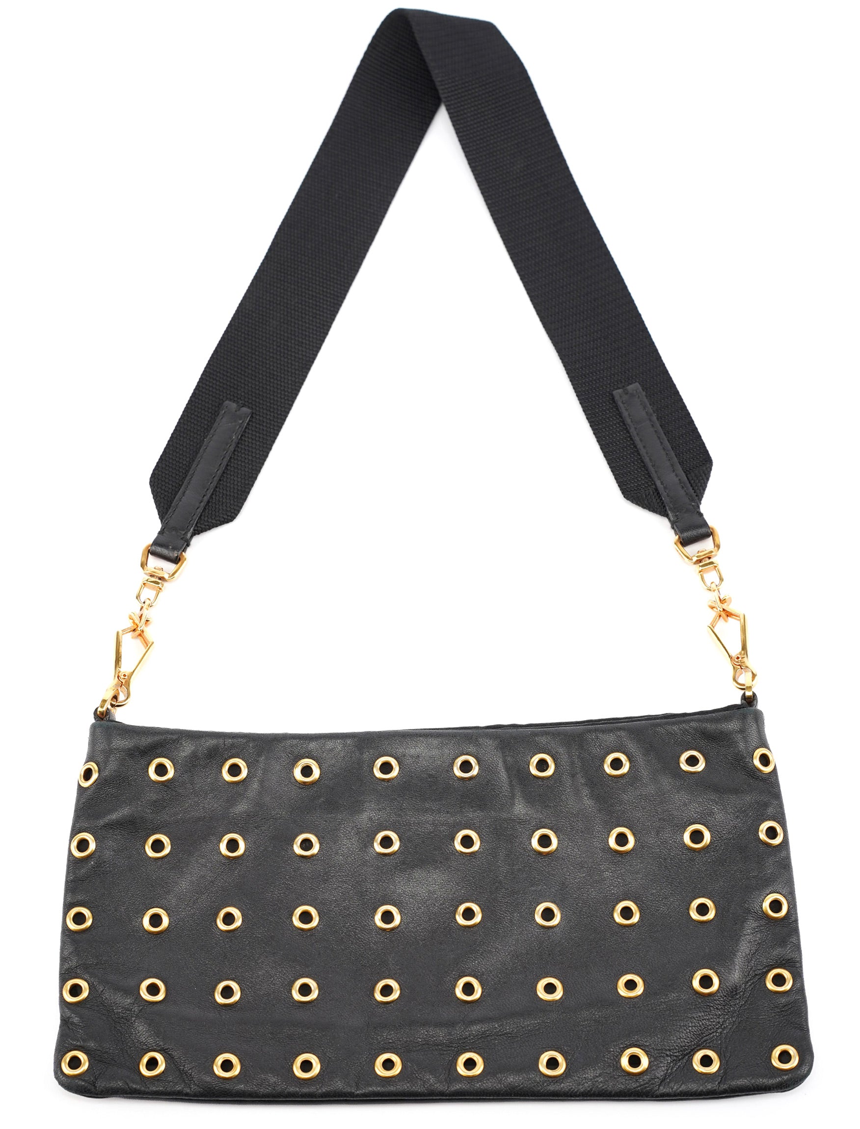 Designed in the early 2000s by Miuccia Prada, this shoulder bag is crafted in soft black vitello leather with allover gold-tone grommet detailing. It features a zip closure, satin-lined interior with a zip pocket, and an oversized canvas strap with gold-tone lobster clasps marked Prada. Finished with the Prada logo debossed on the front.