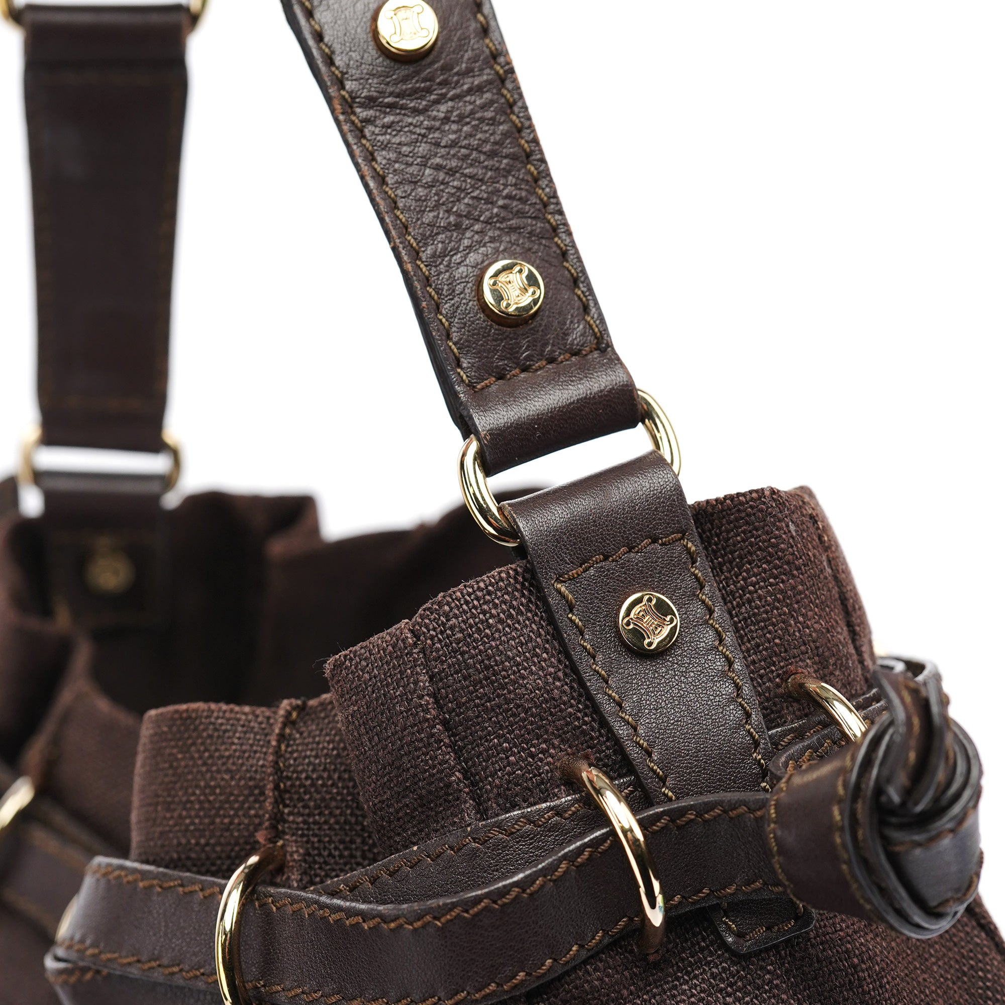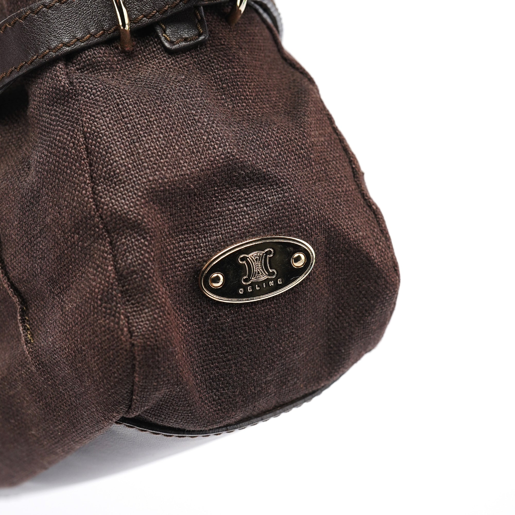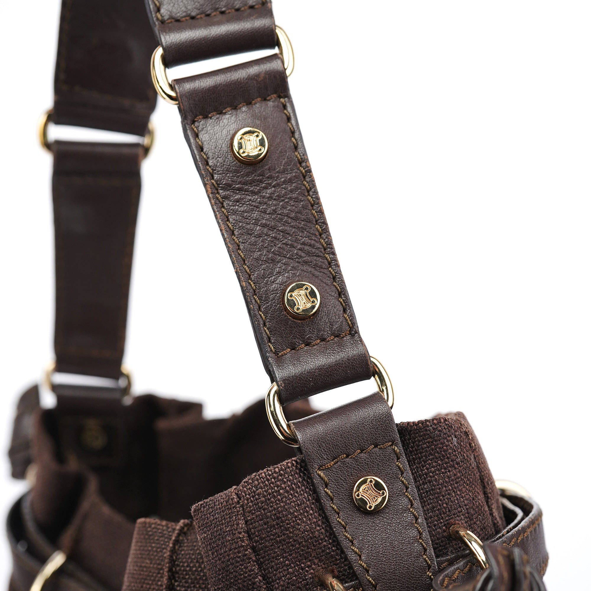 Designed in the early 2000s, this brown Celine shoulder bag is crafted from canvas with leather trim and features gold-tone Triomphe hardware. The structured silhouette is enhanced with pleated detailing, while the drawstring style closure opens to a satin-lined interior with a zip pocket.