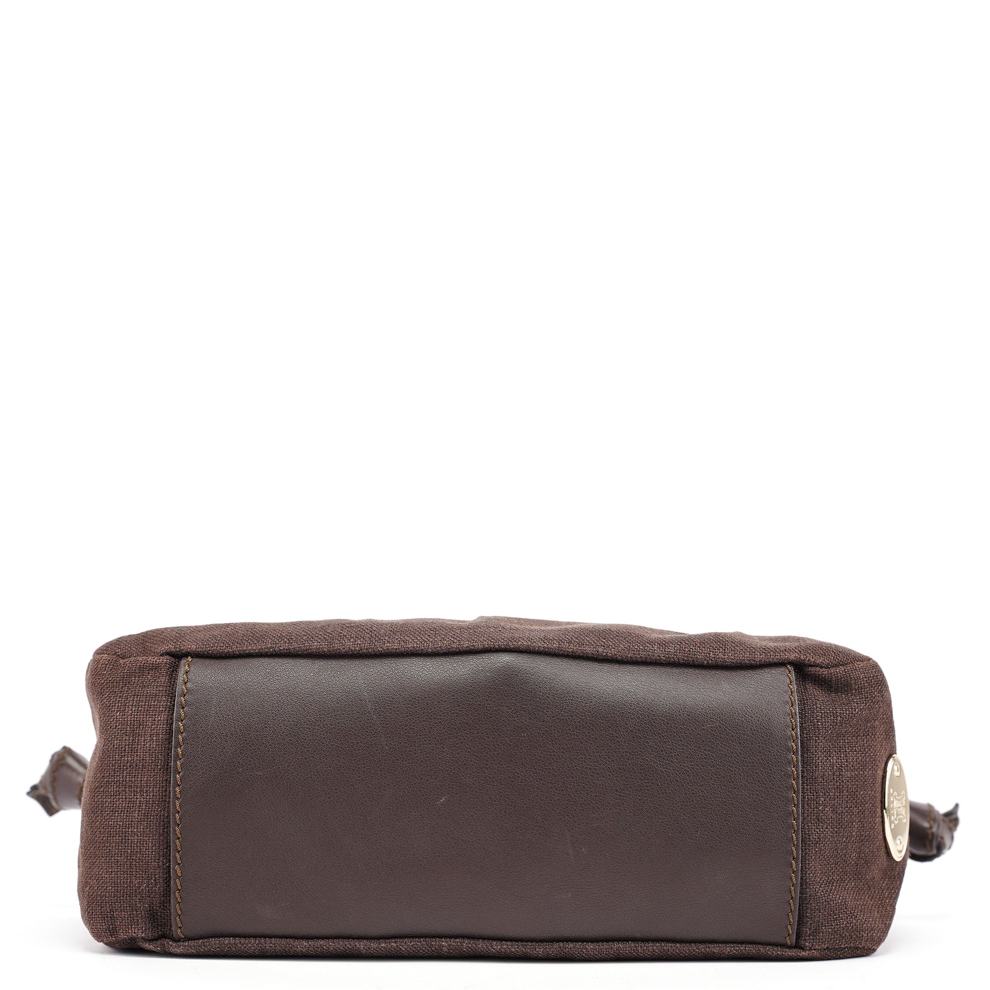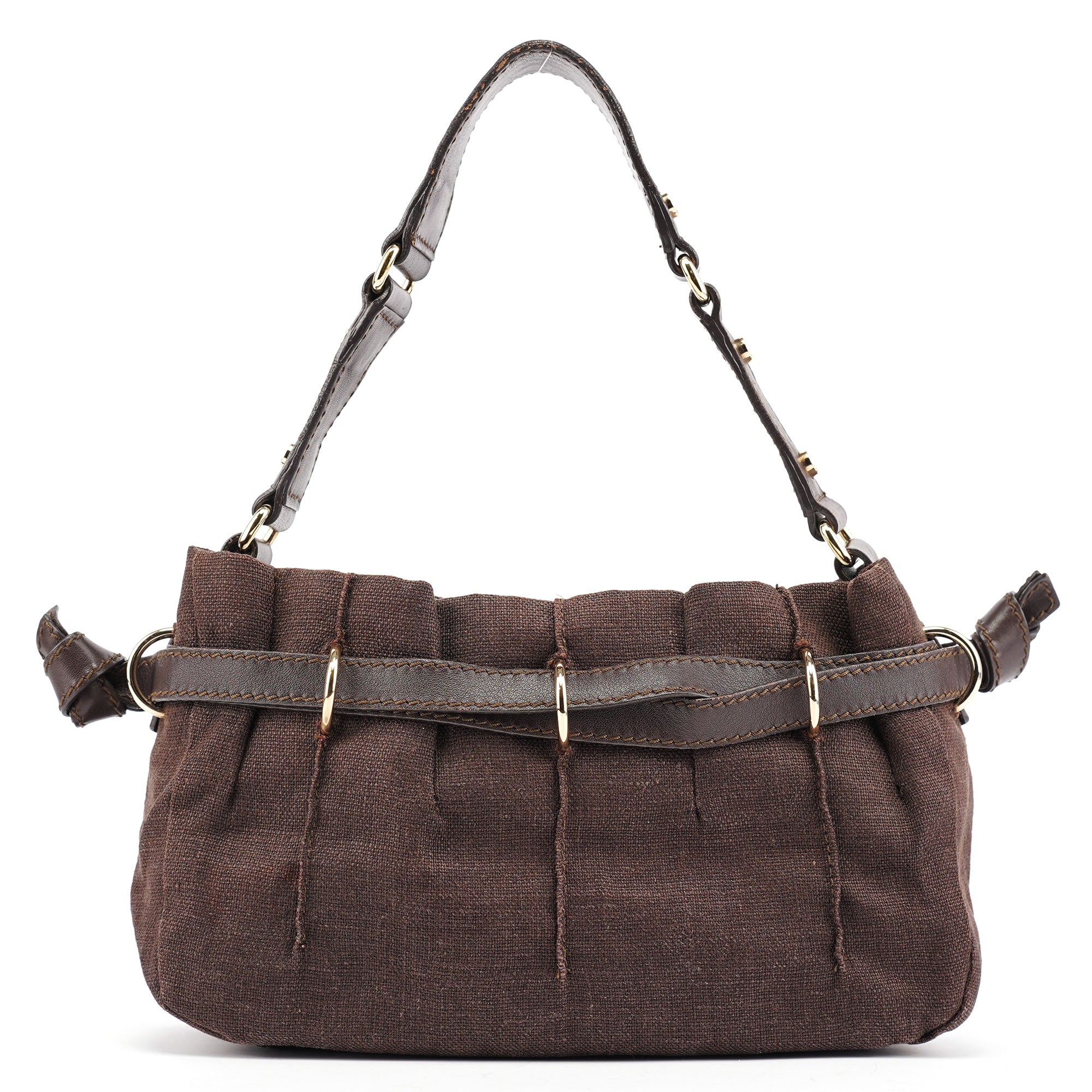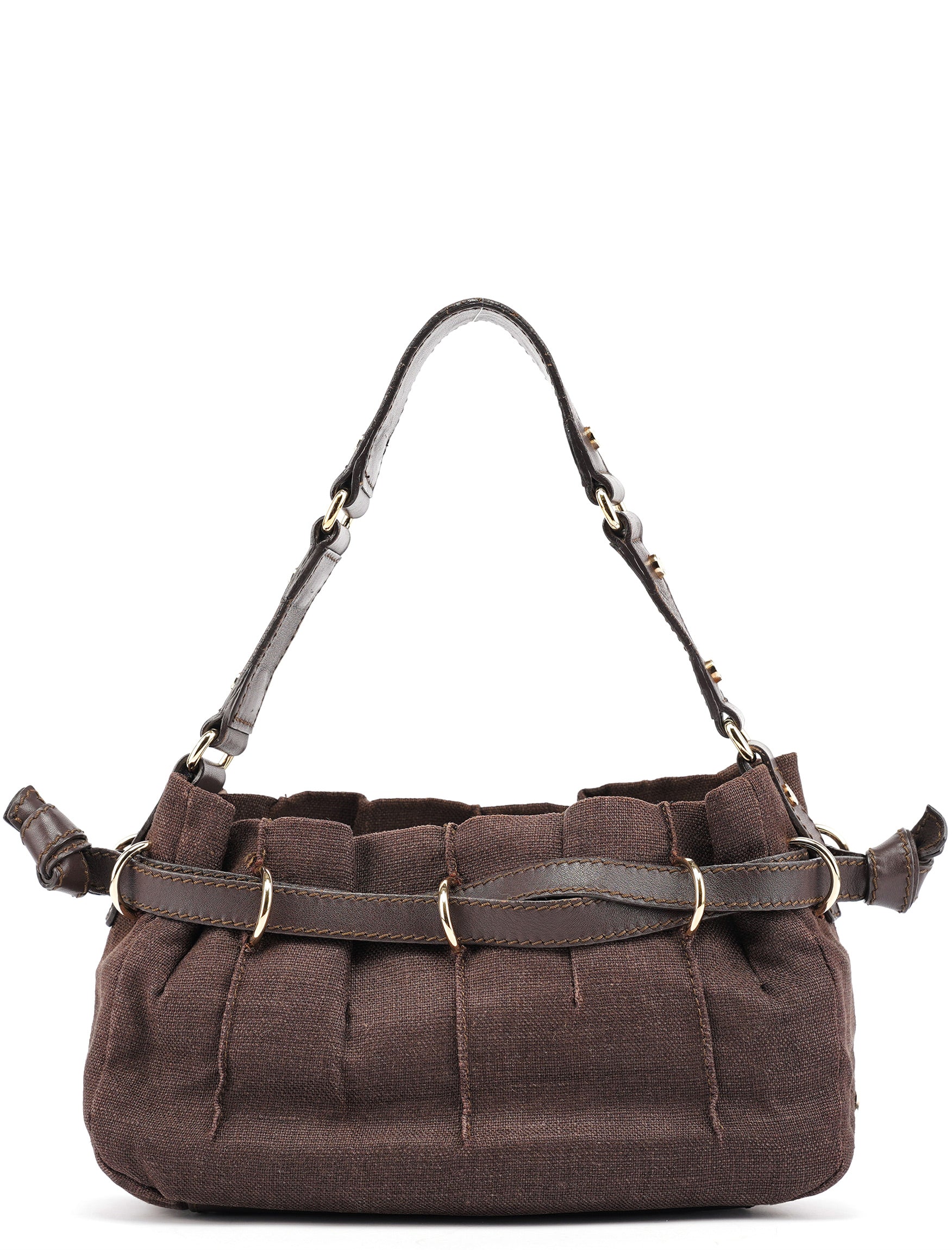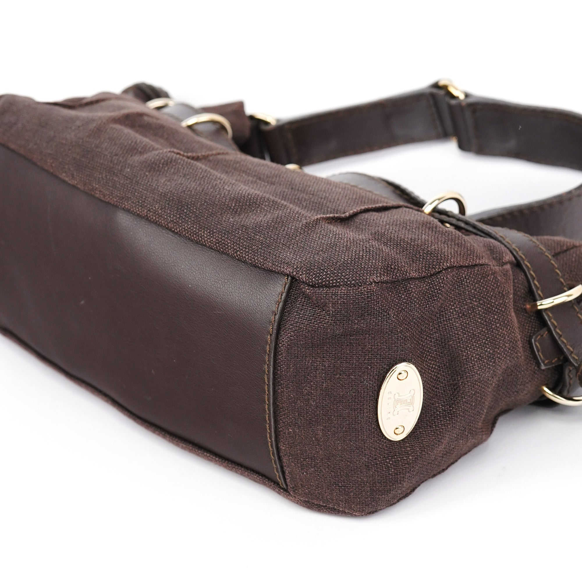 Designed in the early 2000s, this brown Celine shoulder bag is crafted from canvas with leather trim and features gold-tone Triomphe hardware. The structured silhouette is enhanced with pleated detailing, while the drawstring style closure opens to a satin-lined interior with a zip pocket.