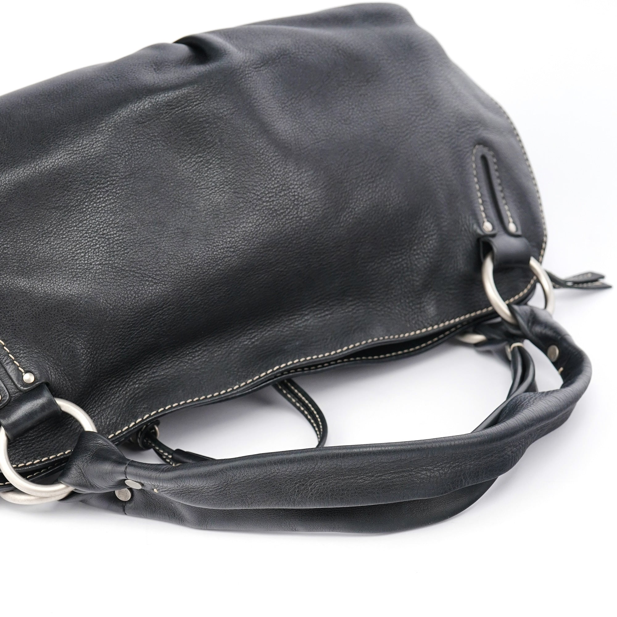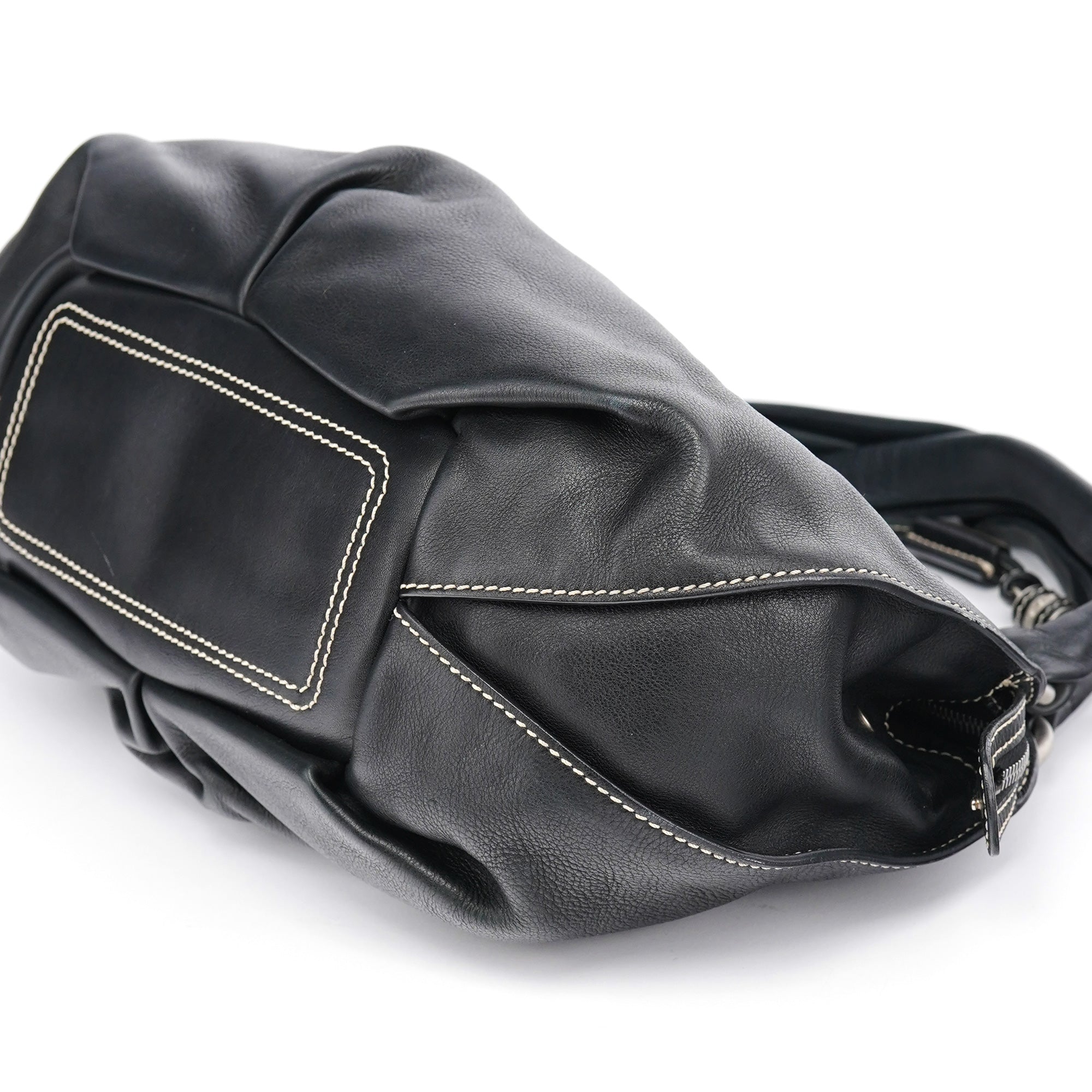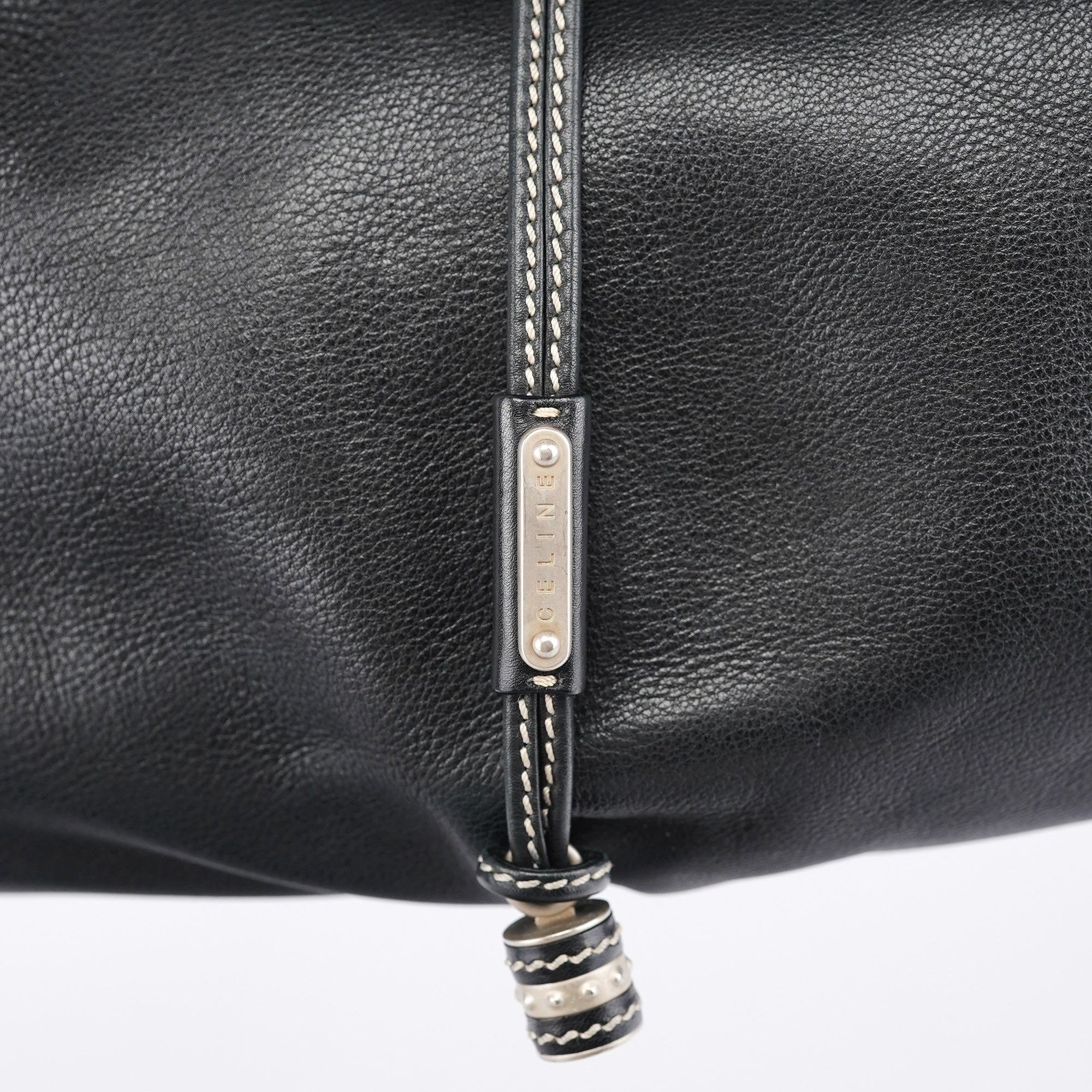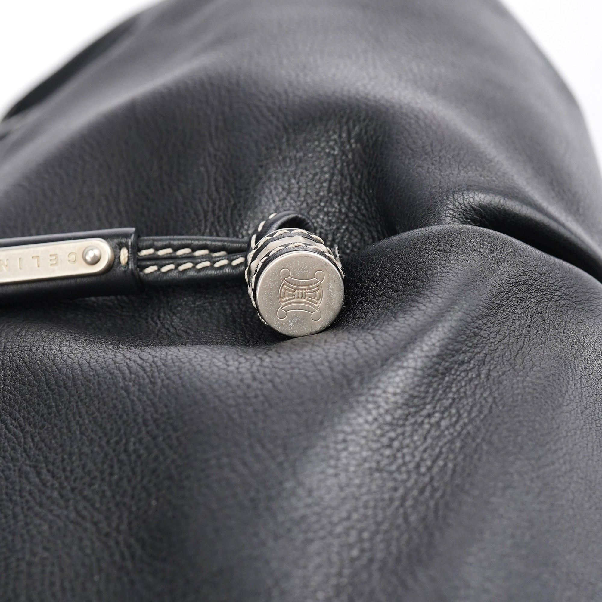 Designed in the early 2000s, this vintage Céline Bittersweet shoulder bag is crafted from supple black grained leather with contrast white topstitching. The sculptural silhouette features signature gathered pleats, complemented by silver-tone hardware and zip closure with a spacious multi-pocket interior.
