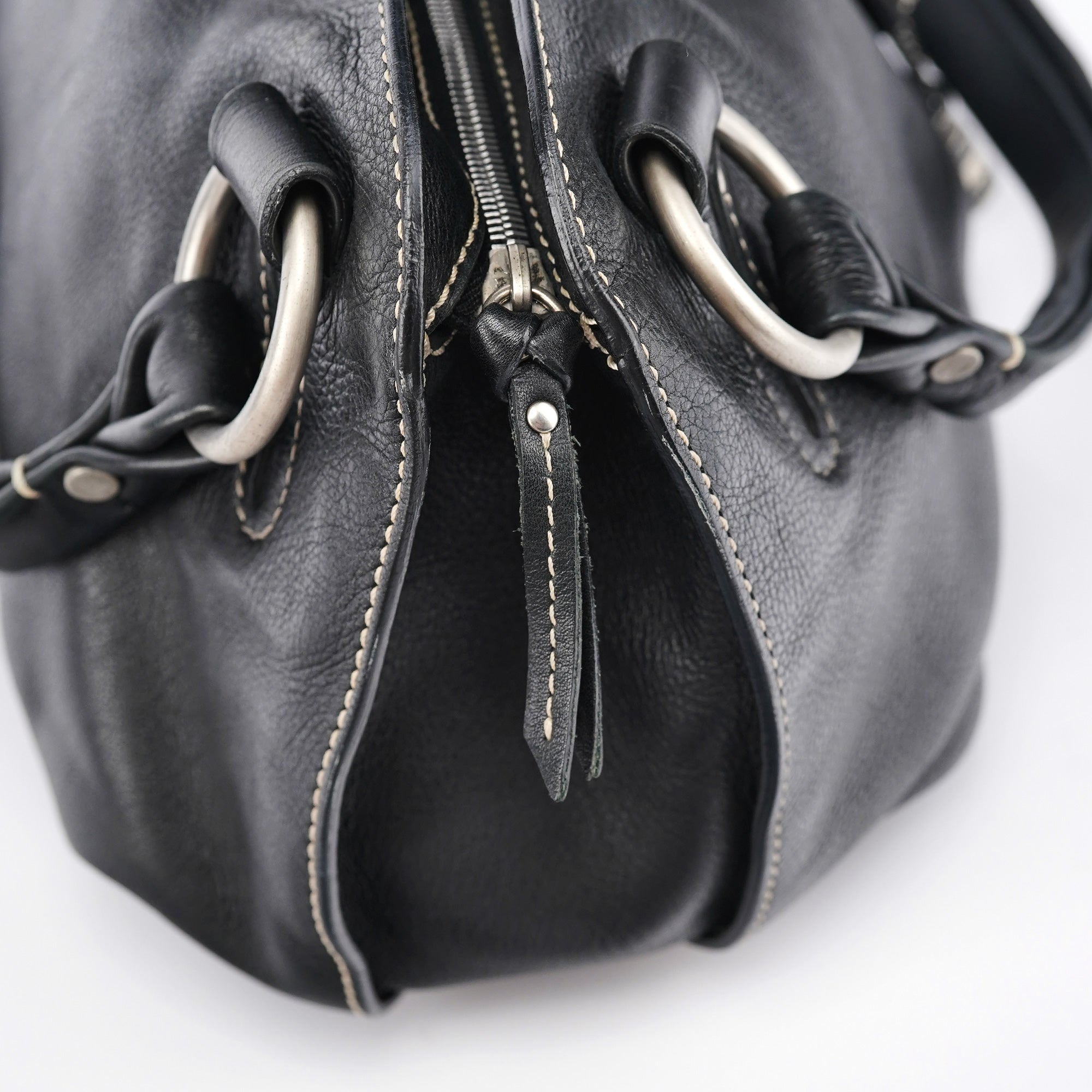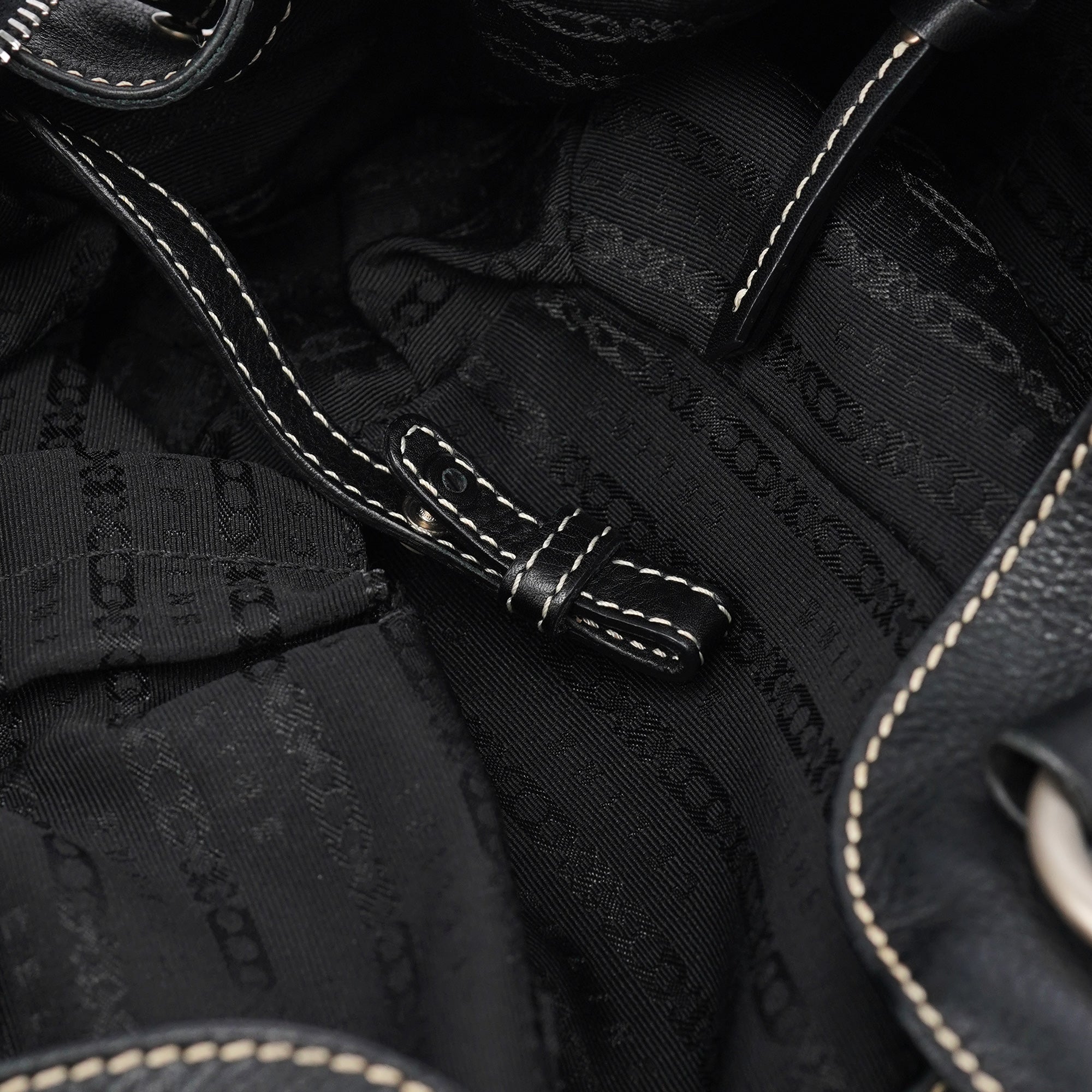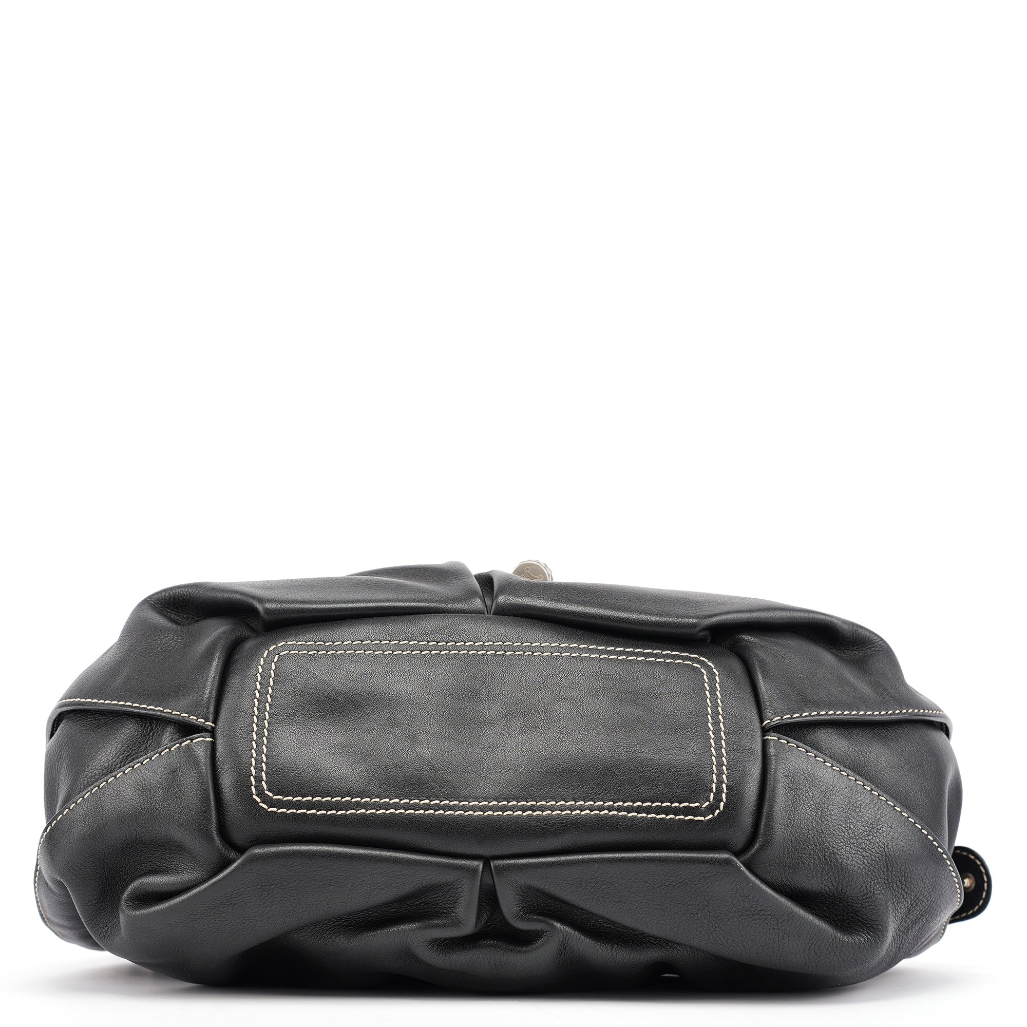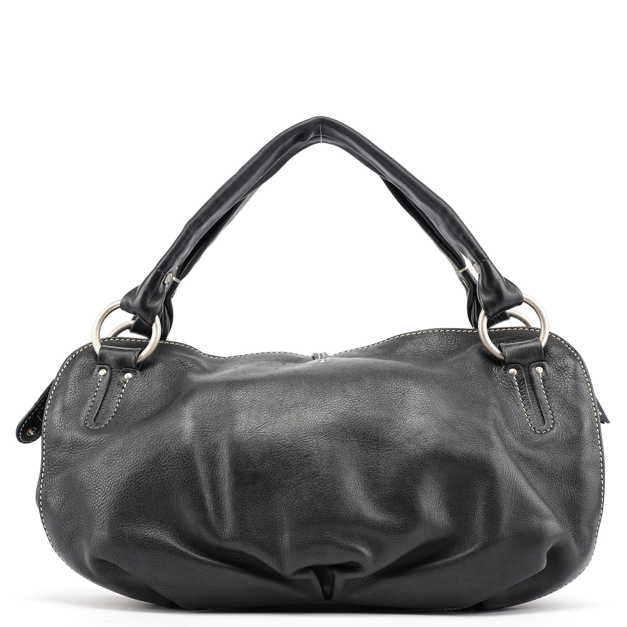Designed in the early 2000s, this vintage Céline Bittersweet shoulder bag is crafted from supple black grained leather with contrast white topstitching. The sculptural silhouette features signature gathered pleats, complemented by silver-tone hardware and zip closure with a spacious multi-pocket interior.