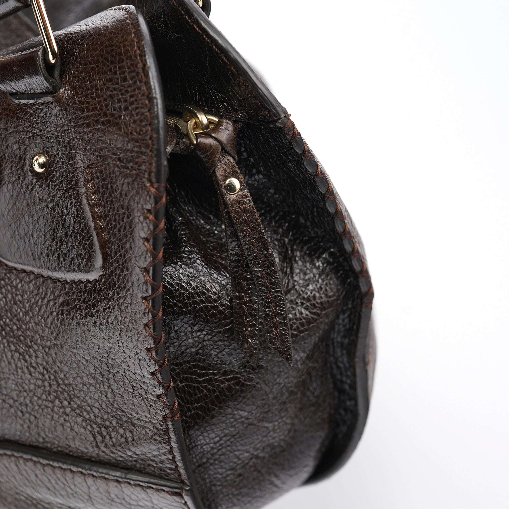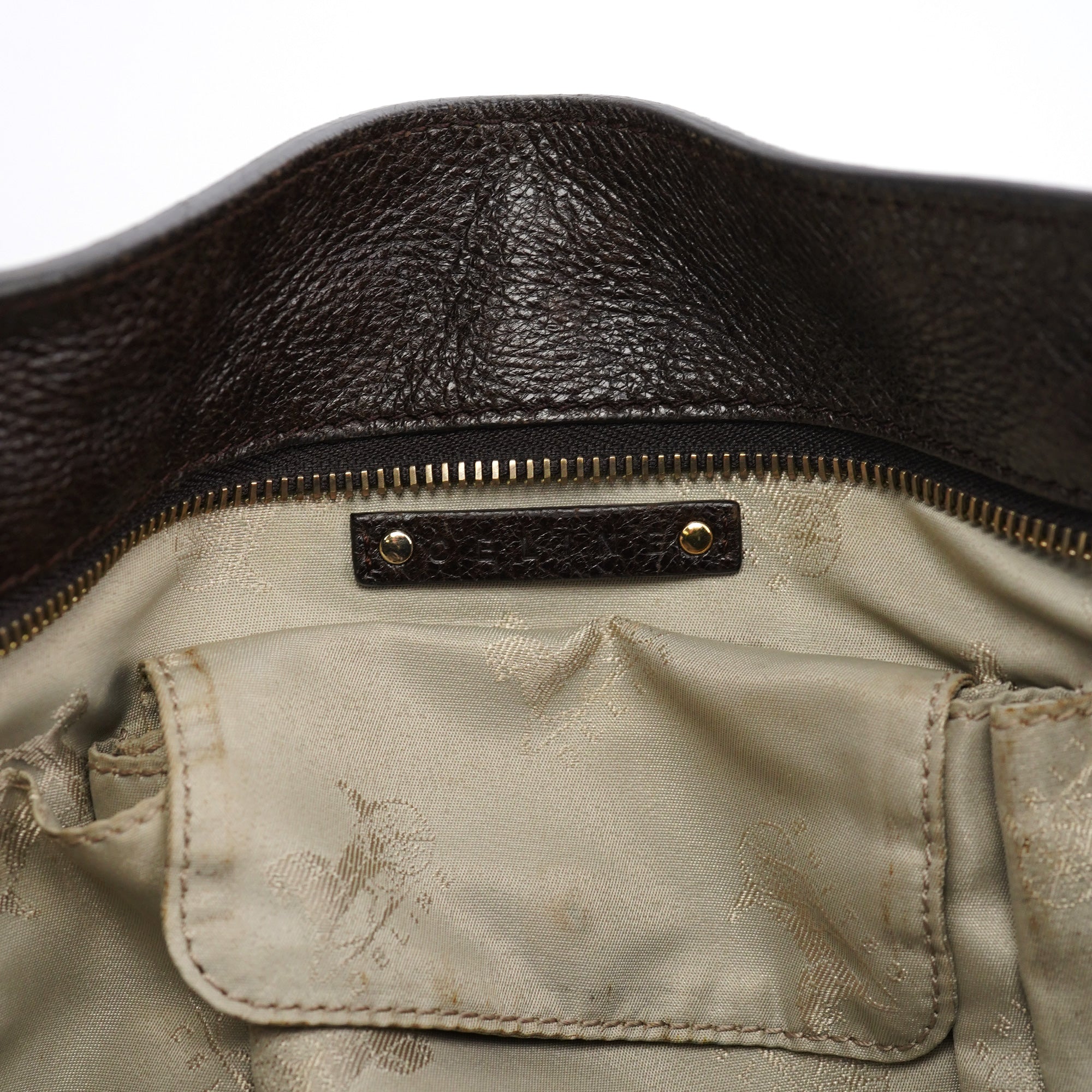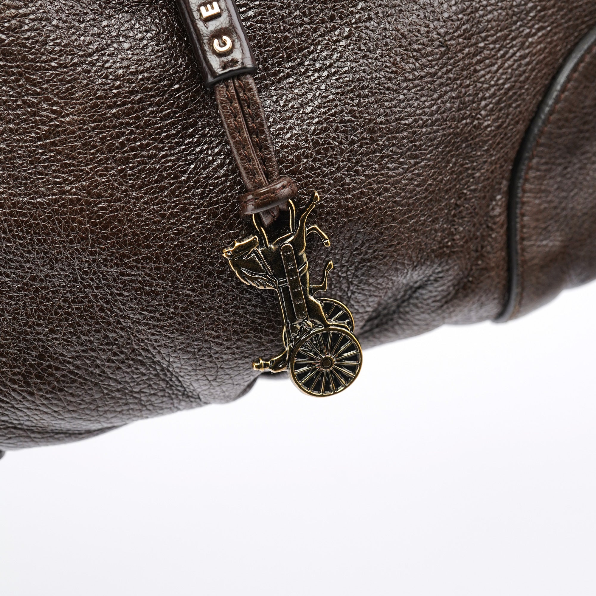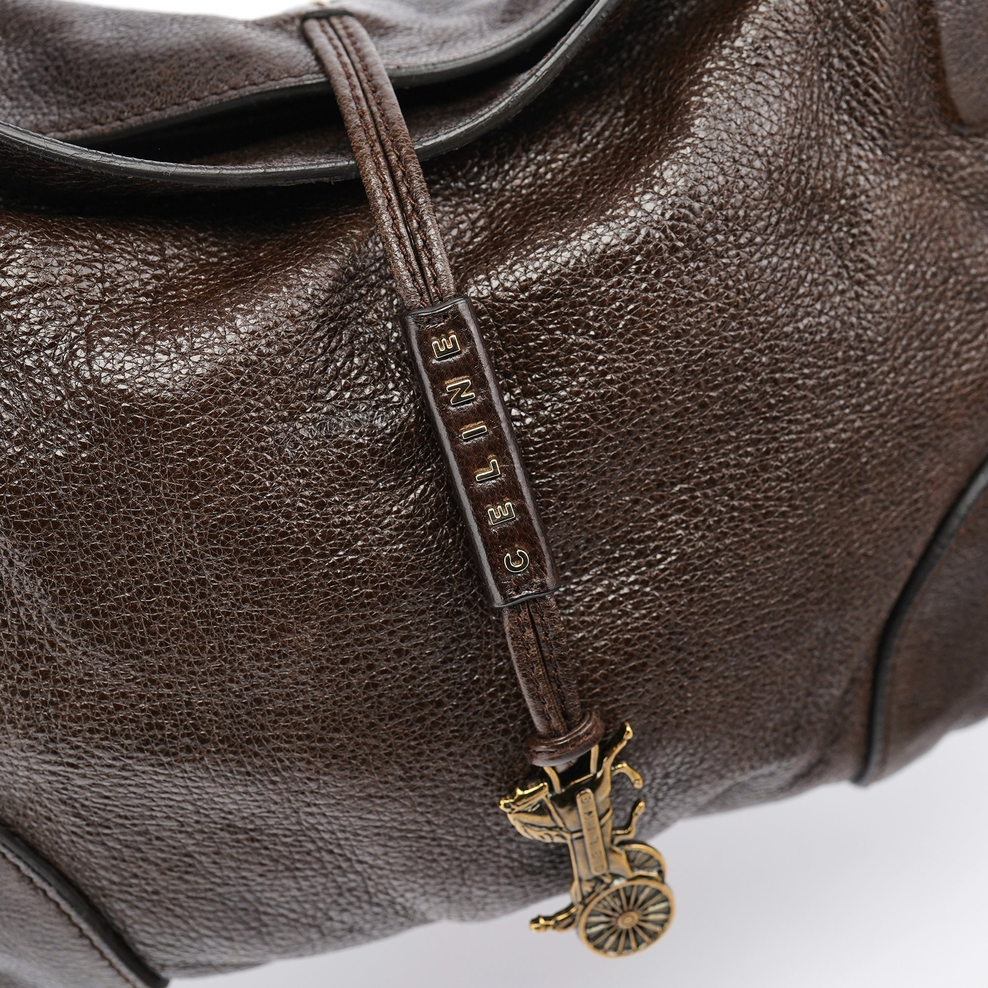Designed in the early 2000s, this vintage Céline Bittersweet shoulder bag features brown glossy leather with the model’s signature carriage hardware charm and gold-tone accents. The dual handles and relaxed hobo silhouette reflect the era’s shift toward understated yet distinctive everyday luxury.