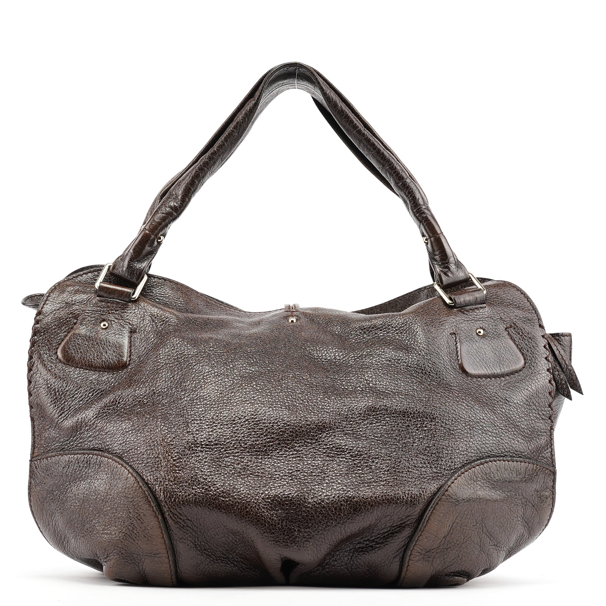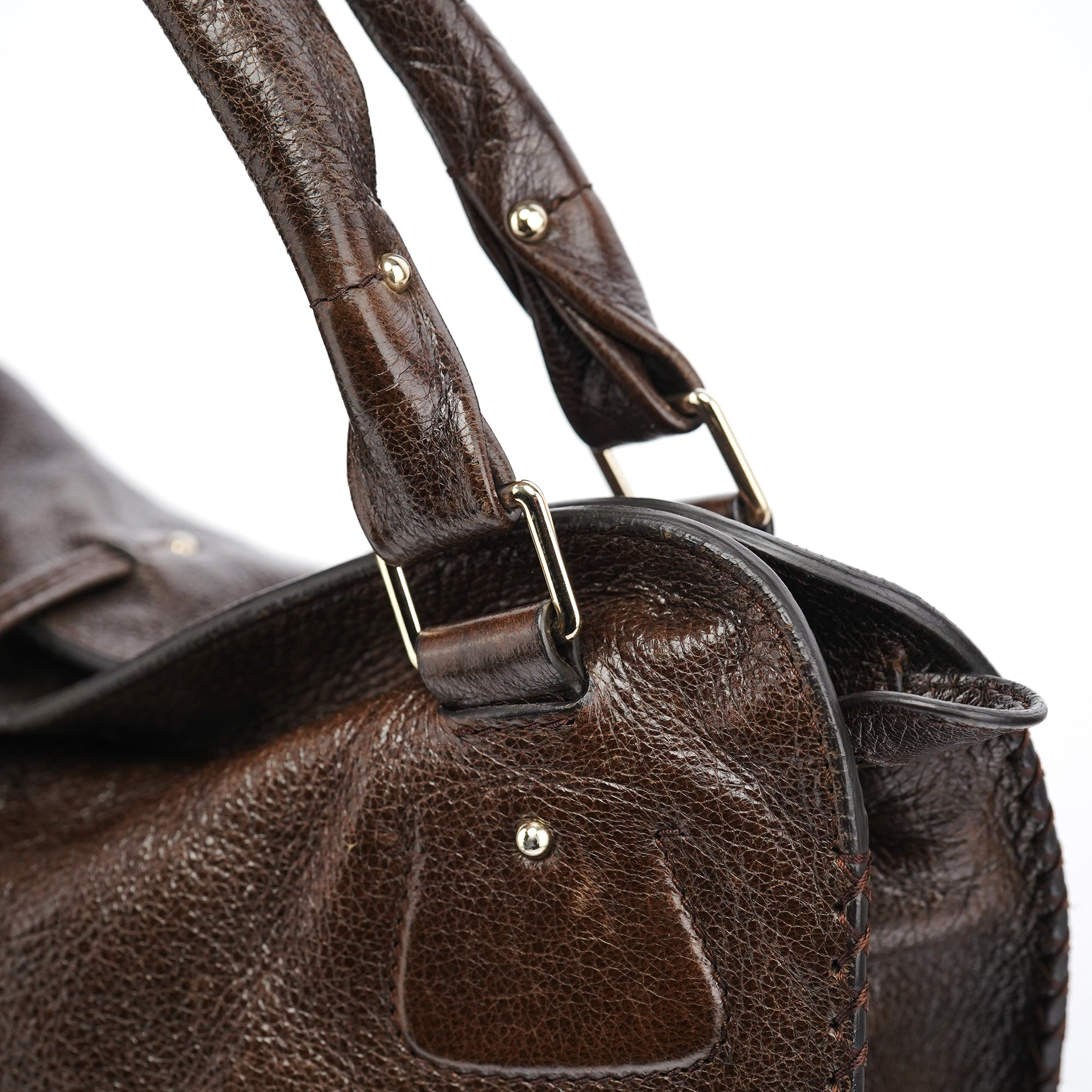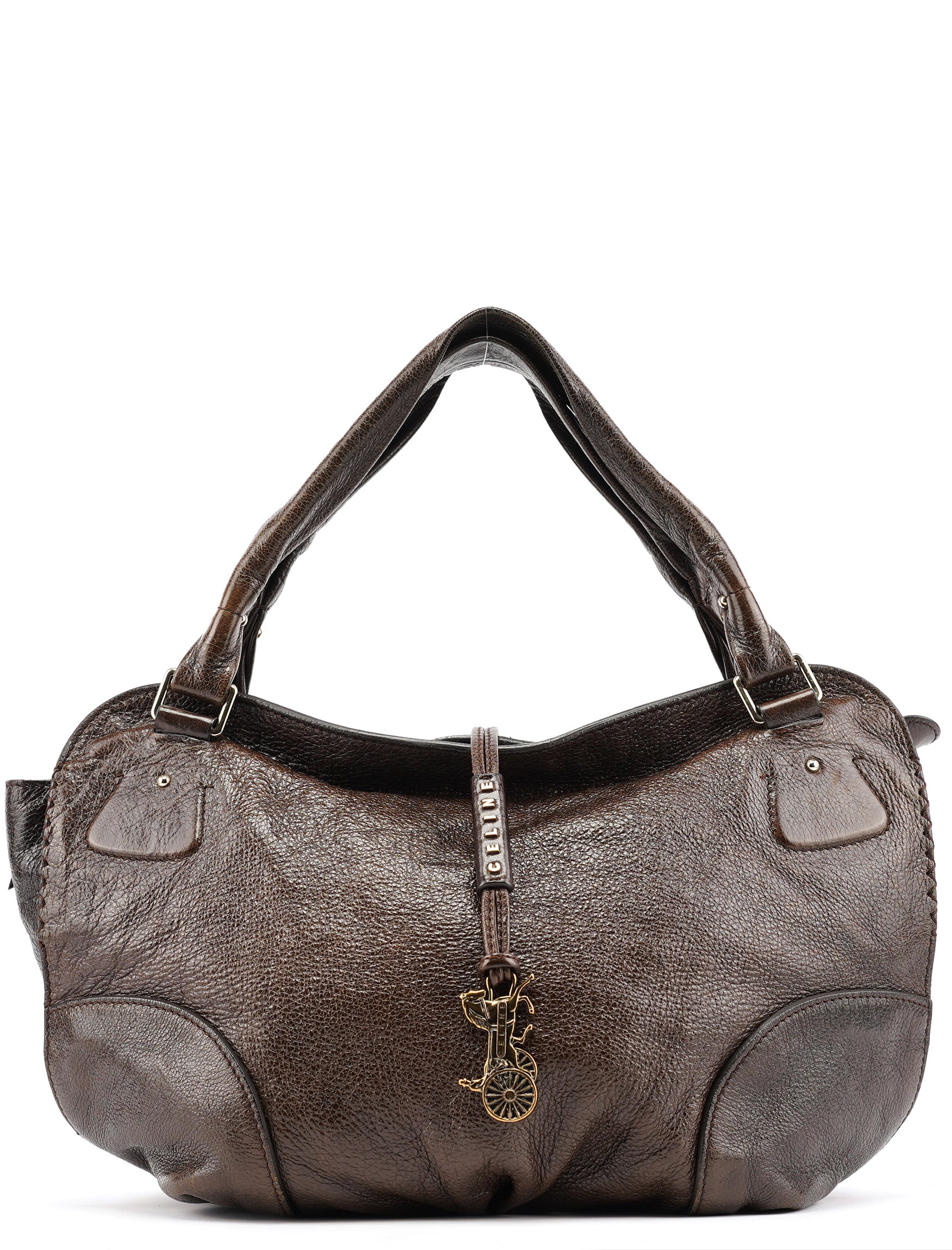 Designed in the early 2000s, this vintage Céline Bittersweet shoulder bag features brown glossy leather with the model’s signature carriage hardware charm and gold-tone accents. The dual handles and relaxed hobo silhouette reflect the era’s shift toward understated yet distinctive everyday luxury.