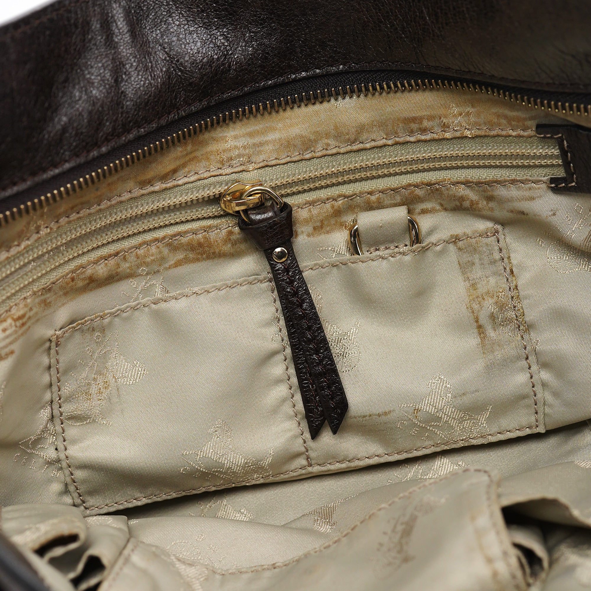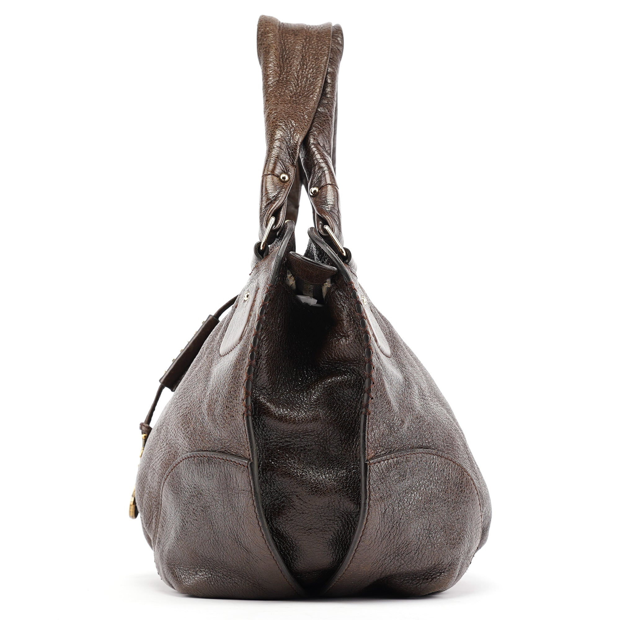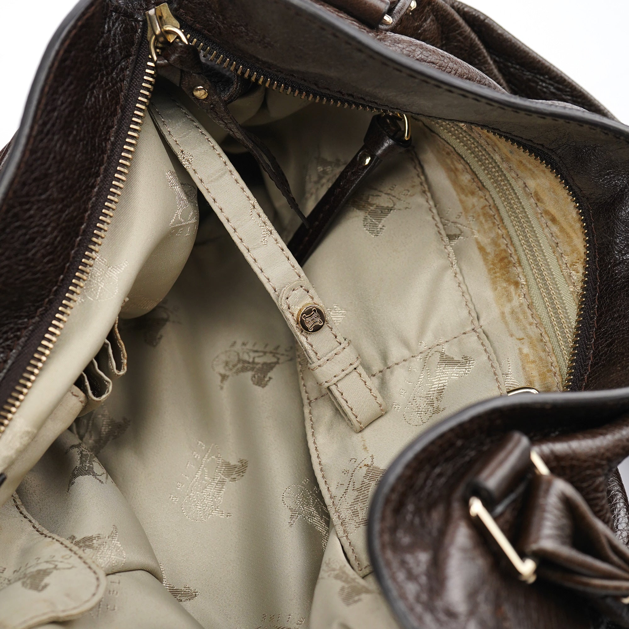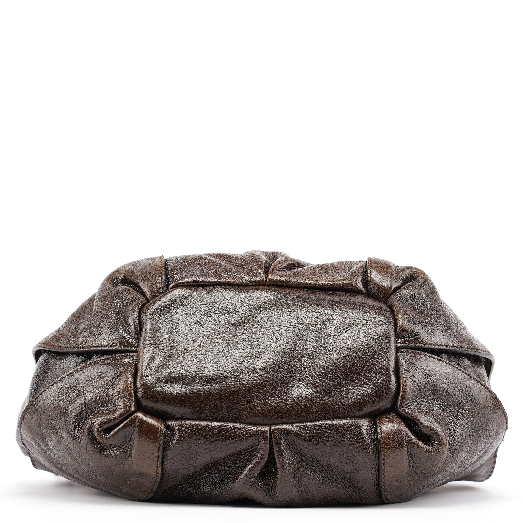 Designed in the early 2000s, this vintage Céline Bittersweet shoulder bag features brown glossy leather with the model’s signature carriage hardware charm and gold-tone accents. The dual handles and relaxed hobo silhouette reflect the era’s shift toward understated yet distinctive everyday luxury.