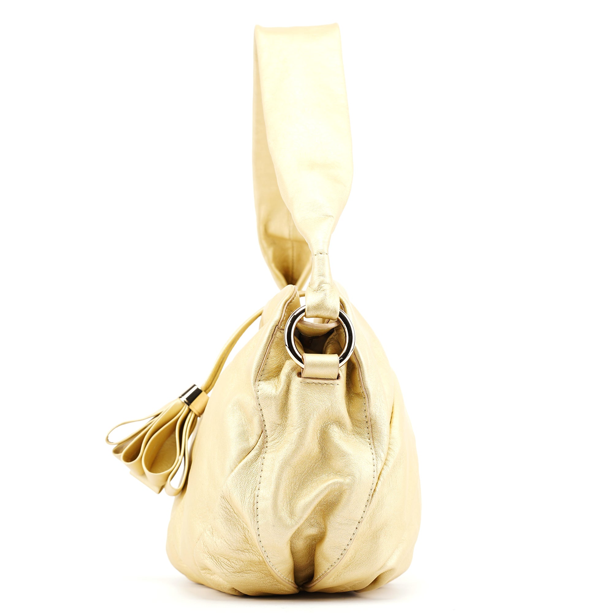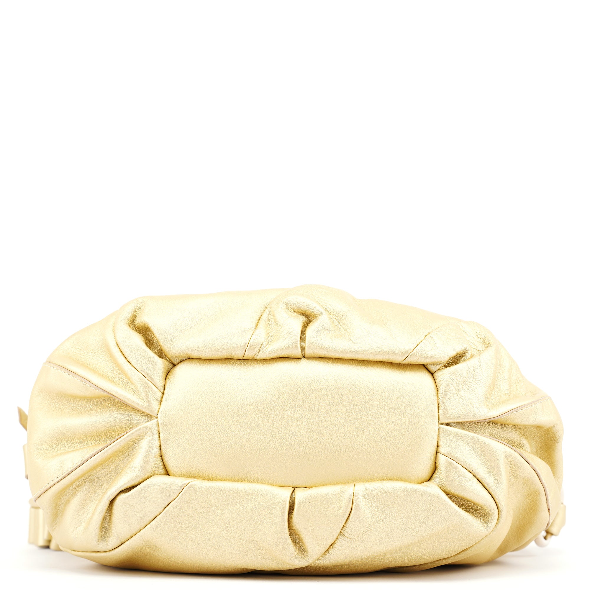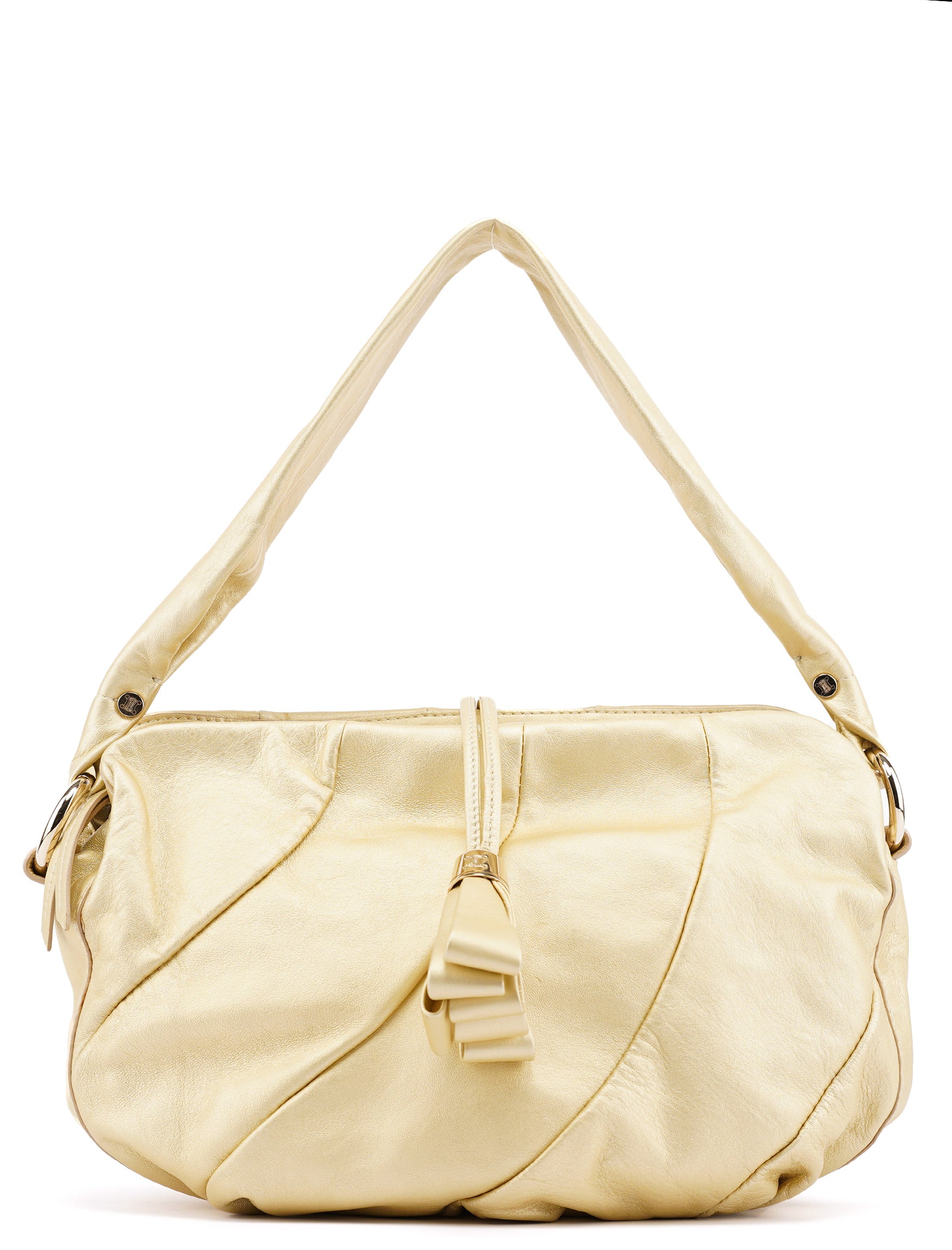 Designed in the early 2000s, this vintage Céline Bittersweet shoulder bag is crafted from buttery gold leather with a distinctive gathered silhouette. The sculptural design features radiating pleats that converge at the base with an elegant tassel detail, complemented by gold-tone hardware and a single shoulder strap. The organic, cloud-like form represents Céline's refined French craftsmanship and innovative approach to luxury leather goods during this pre-Phoebe Philo era.