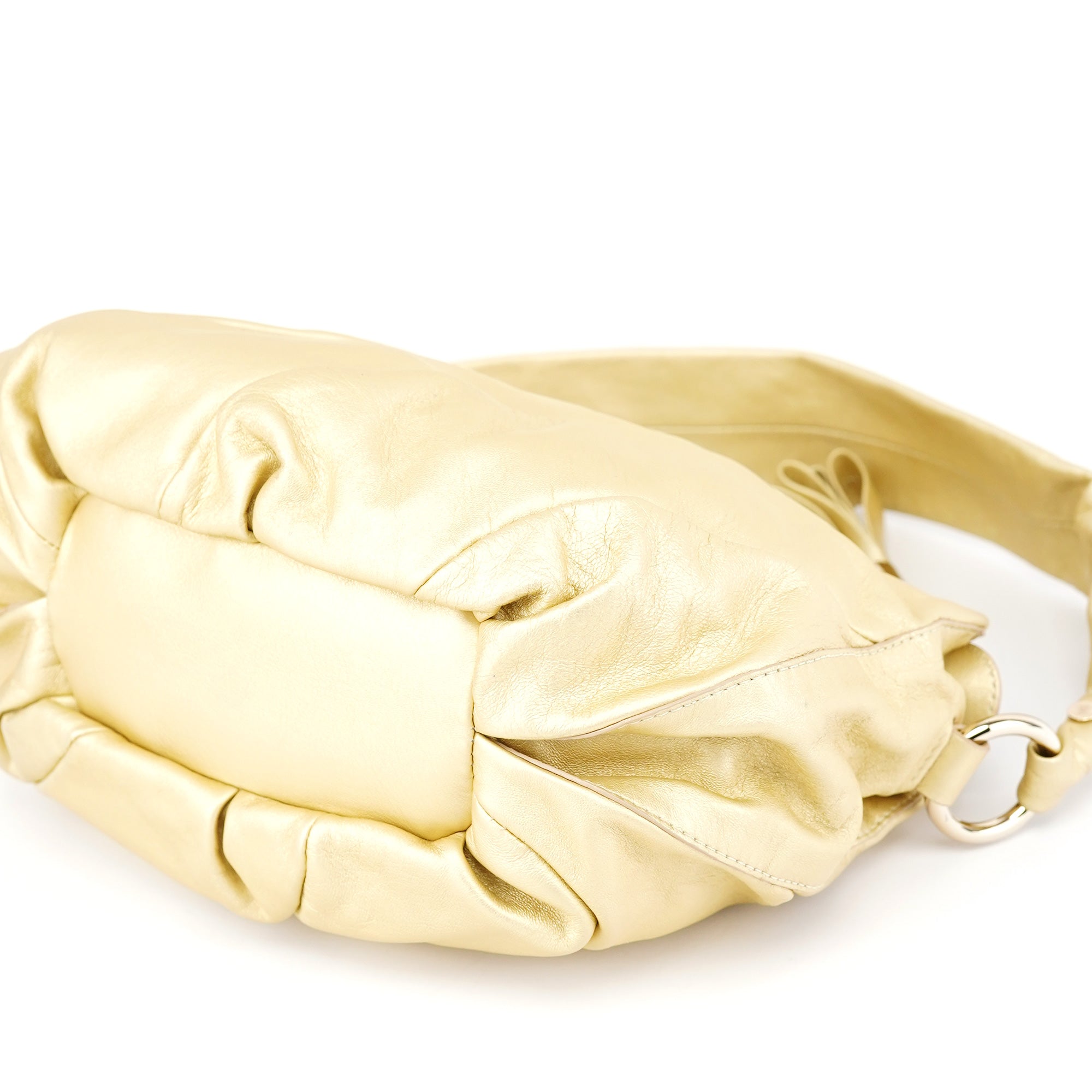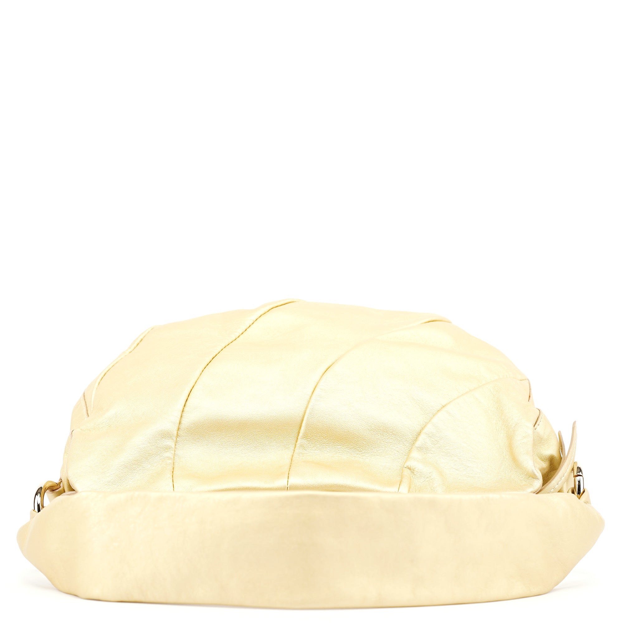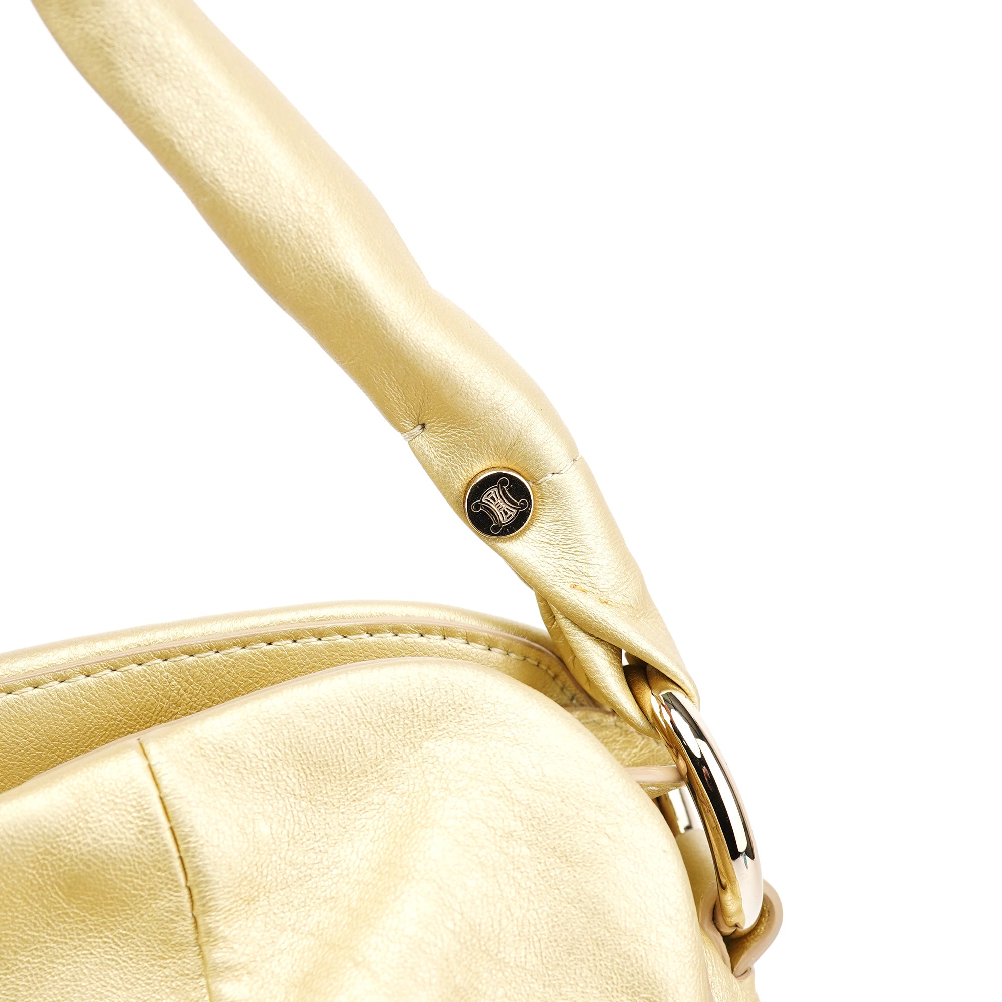 Designed in the early 2000s, this vintage Céline Bittersweet shoulder bag is crafted from buttery gold leather with a distinctive gathered silhouette. The sculptural design features radiating pleats that converge at the base with an elegant tassel detail, complemented by gold-tone hardware and a single shoulder strap. The organic, cloud-like form represents Céline's refined French craftsmanship and innovative approach to luxury leather goods during this pre-Phoebe Philo era.