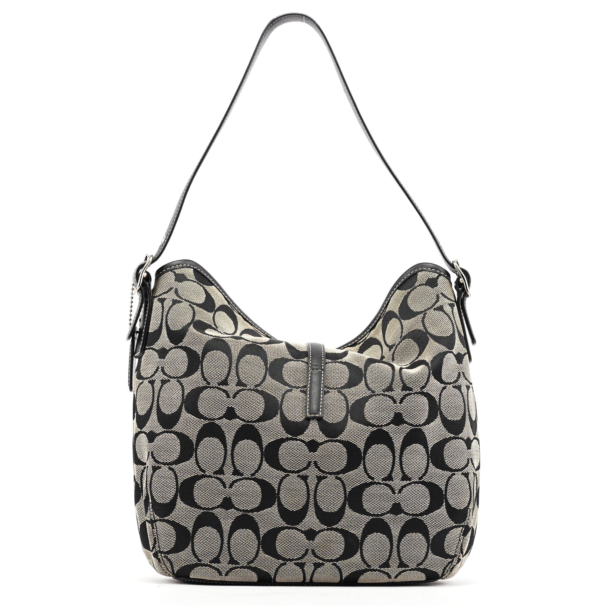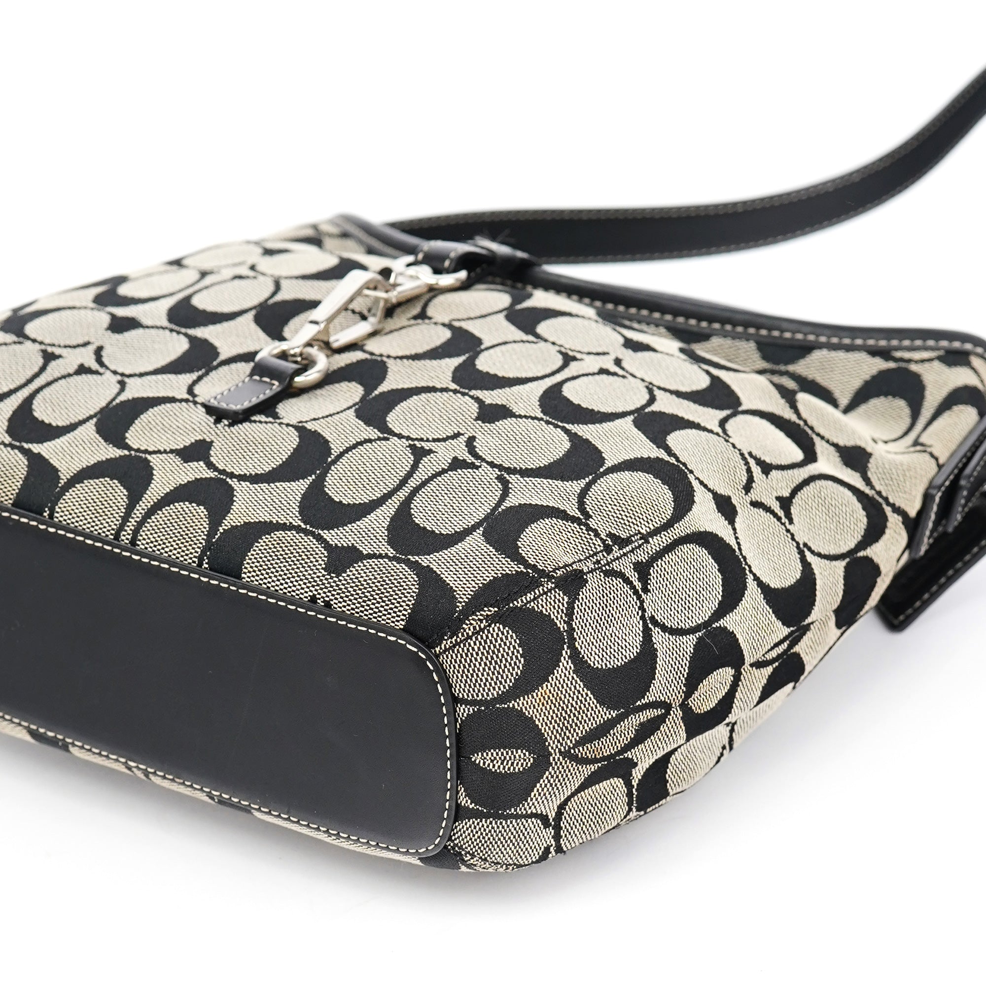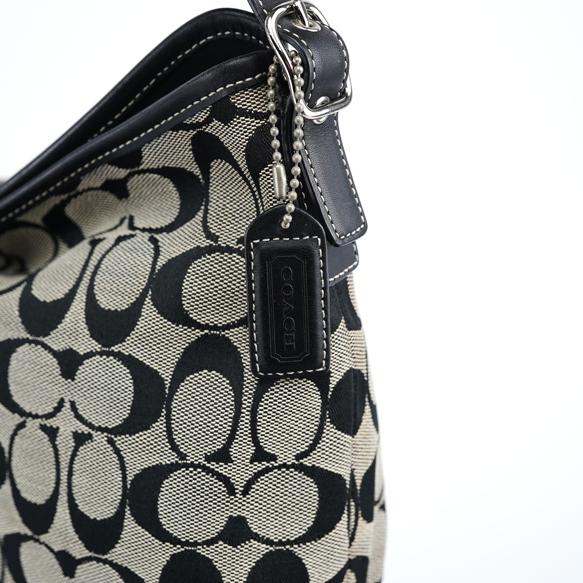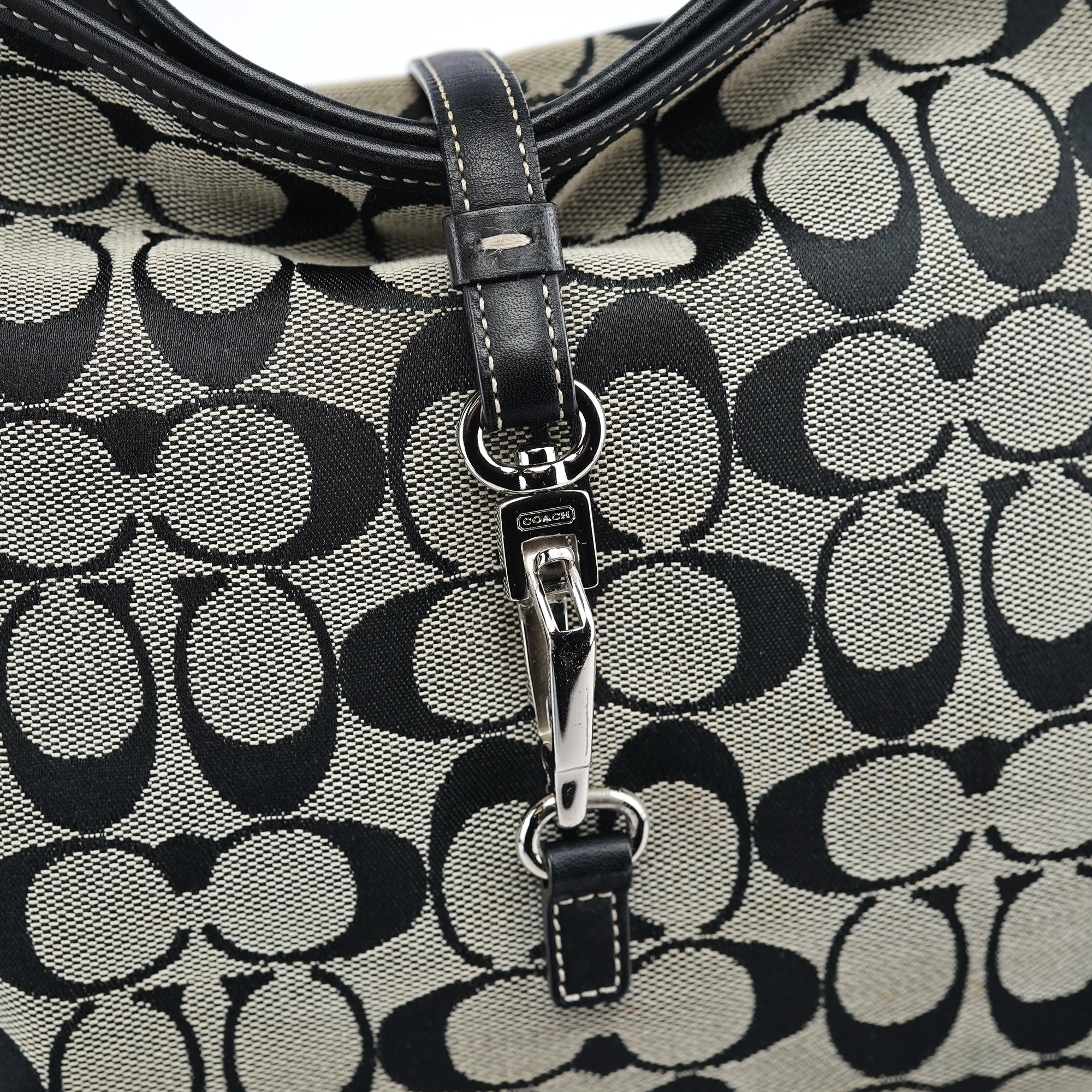 Designed in the early 2000's, this vintage Coach shoulder bag features the signature grey and black C monogram jacquard fabric with black leather trim. The hobo silhouette includes a single shoulder strap, front toggle closure with leather tassel detail, and zip-top opening. The fabric-lined interior is finished with contrast white topstitching throughout.