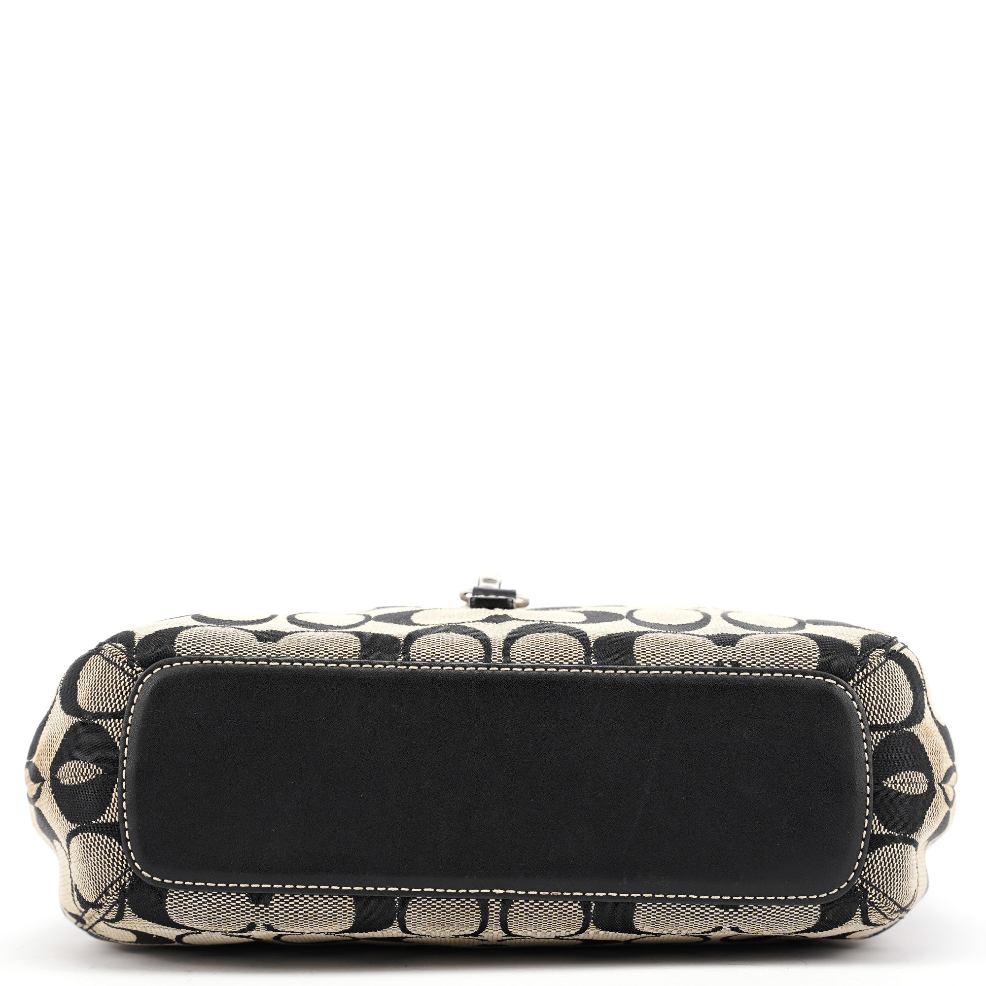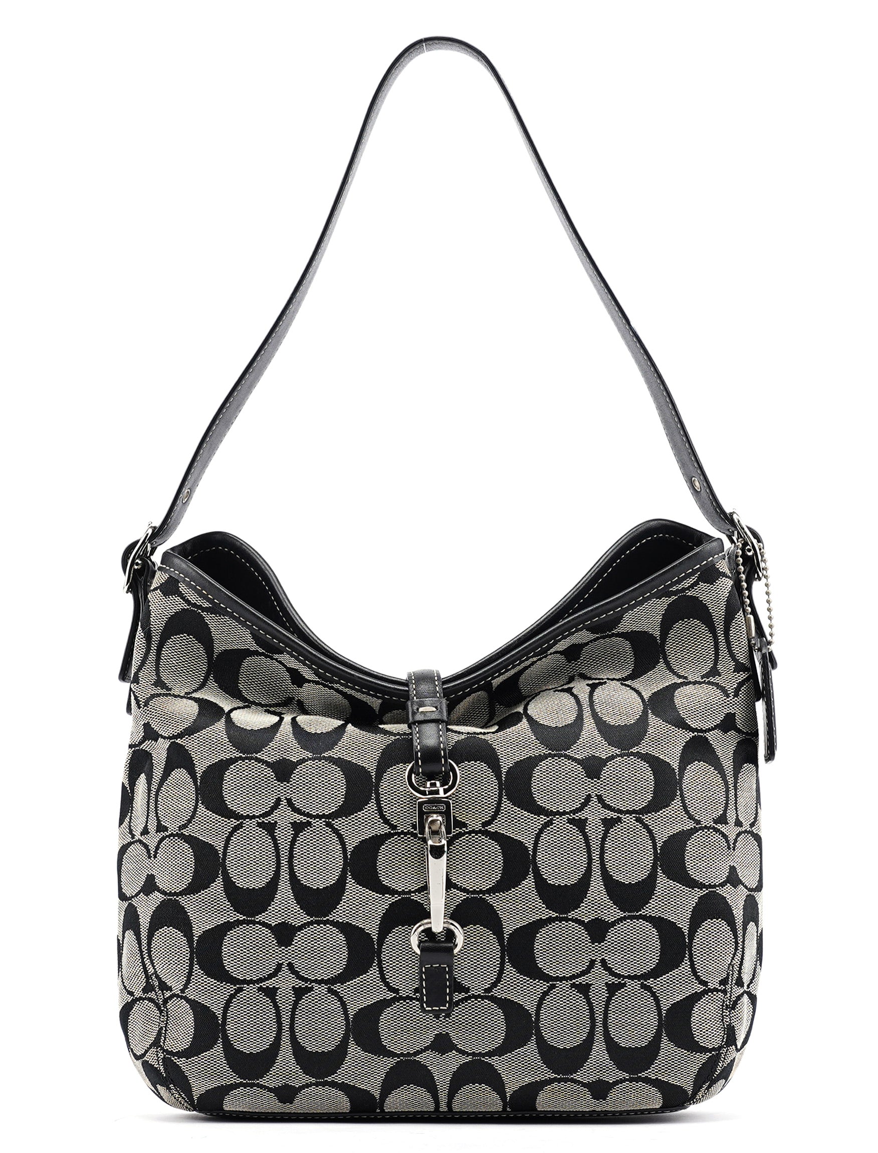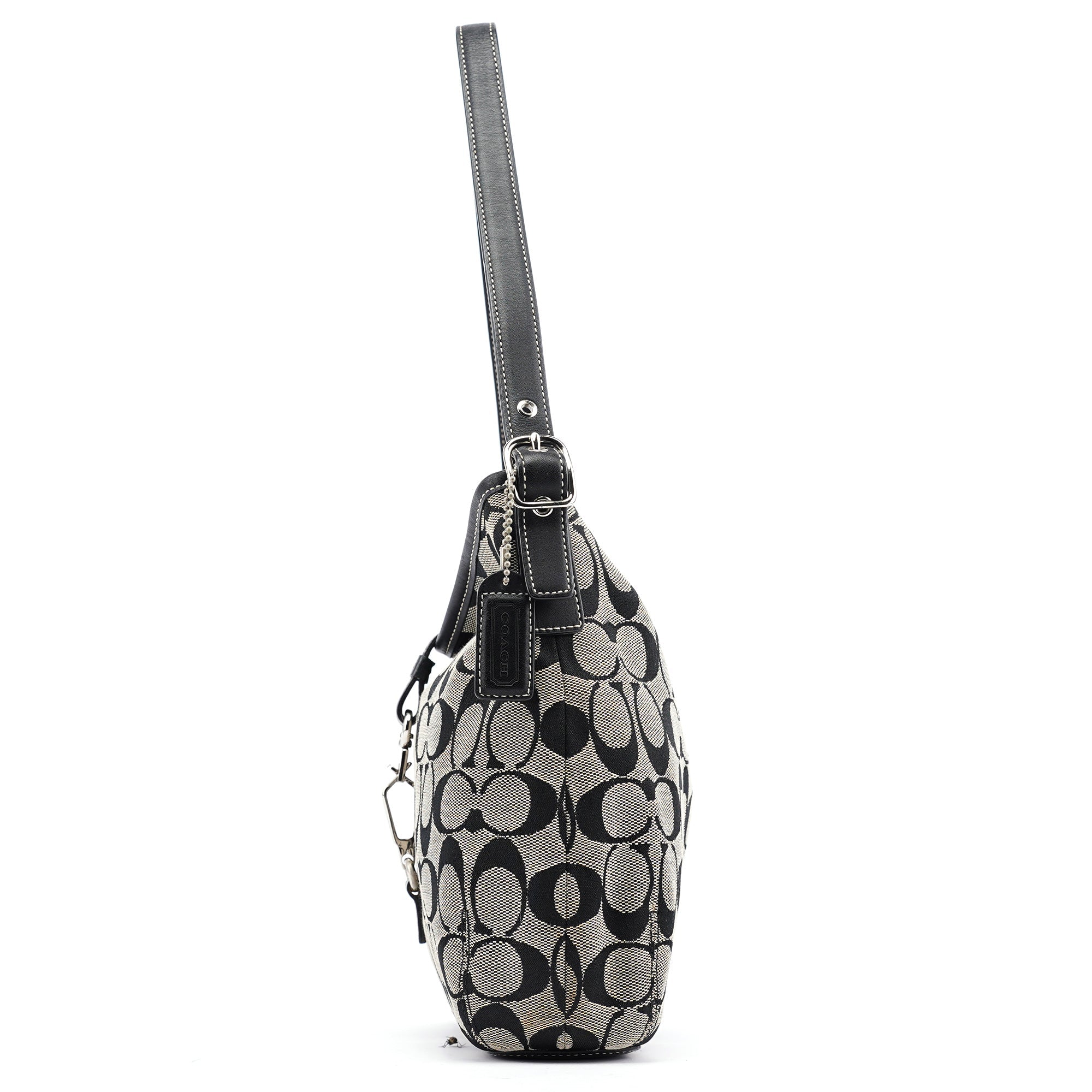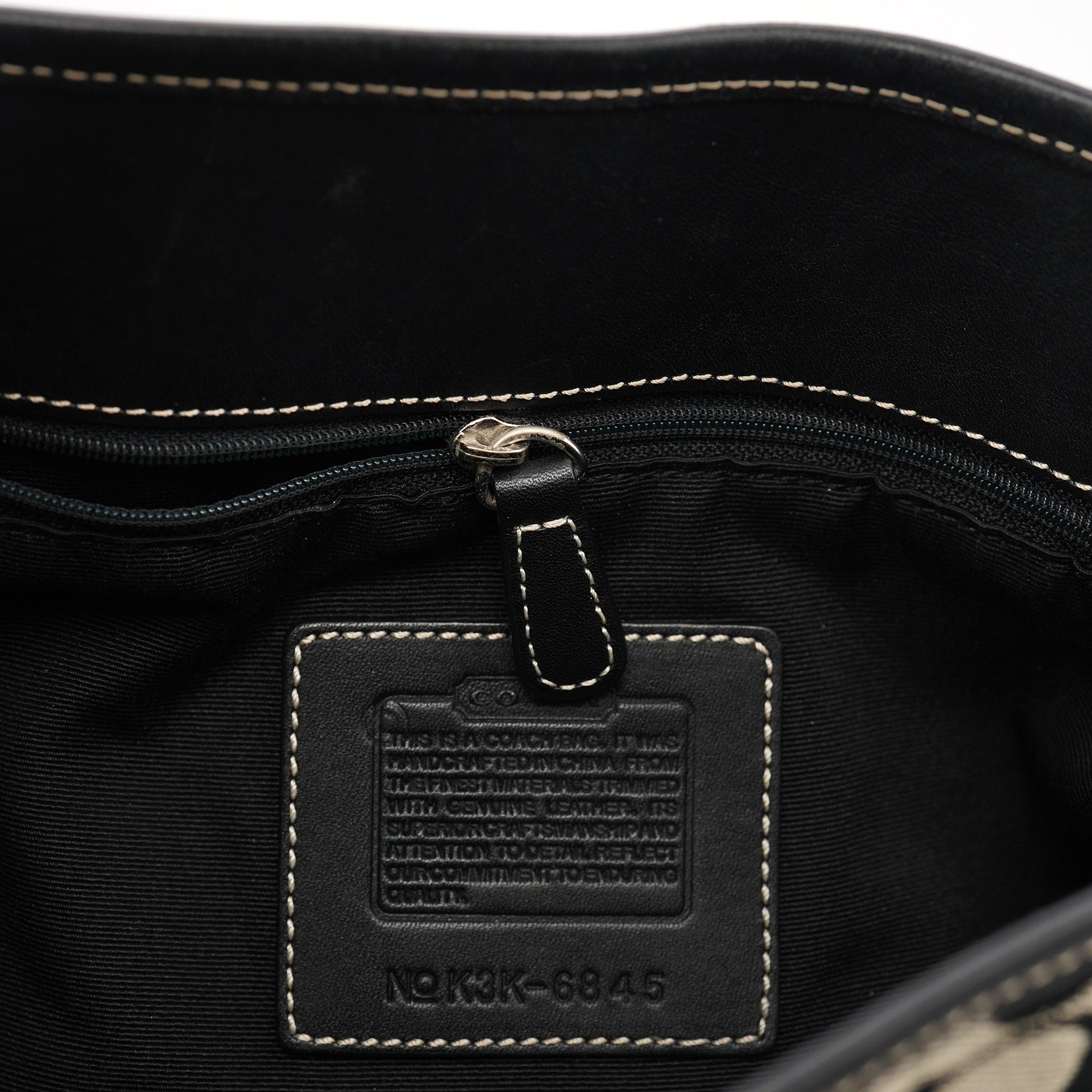 Designed in the early 2000's, this vintage Coach shoulder bag features the signature grey and black C monogram jacquard fabric with black leather trim. The hobo silhouette includes a single shoulder strap, front toggle closure with leather tassel detail, and zip-top opening. The fabric-lined interior is finished with contrast white topstitching throughout.